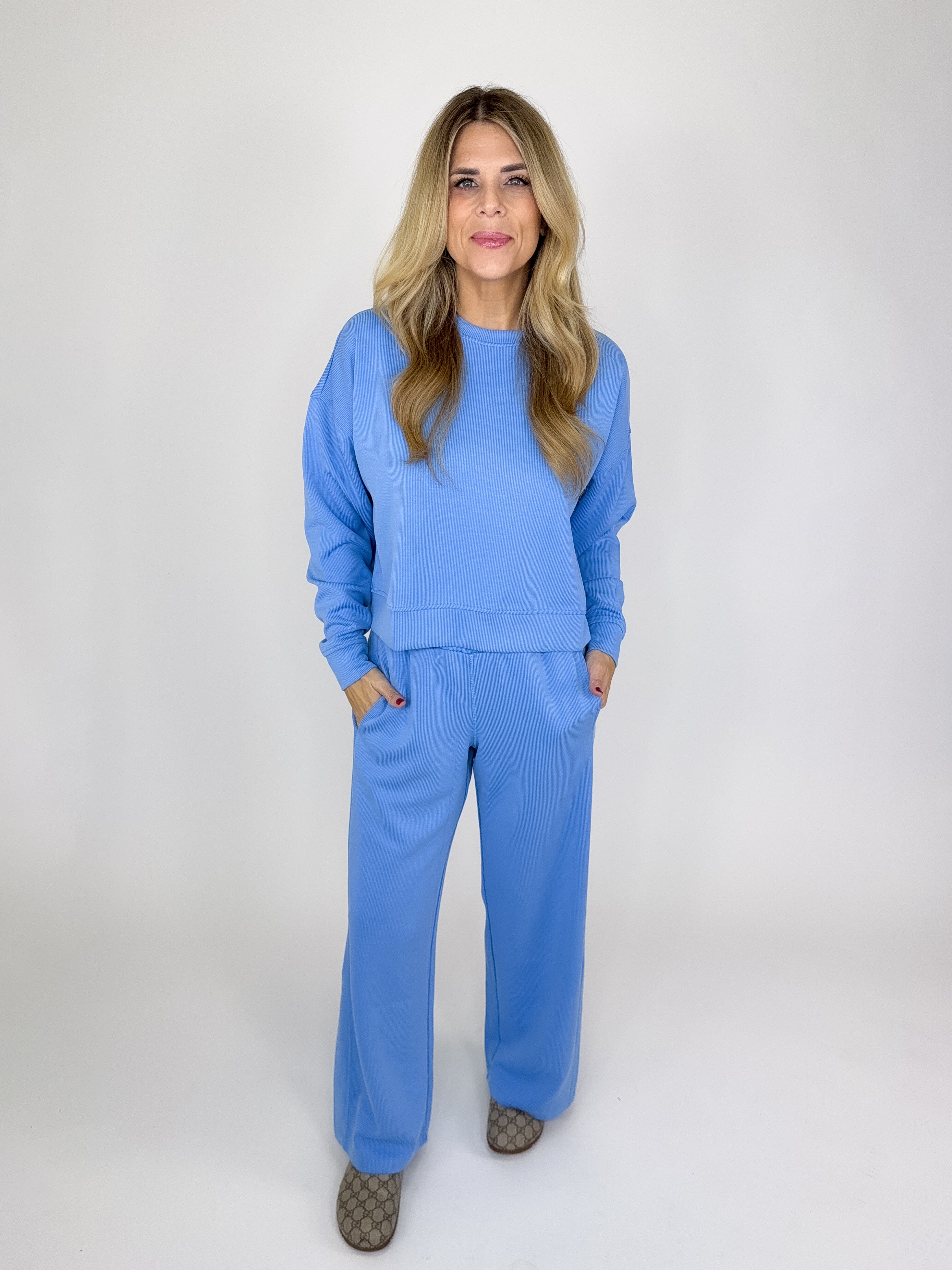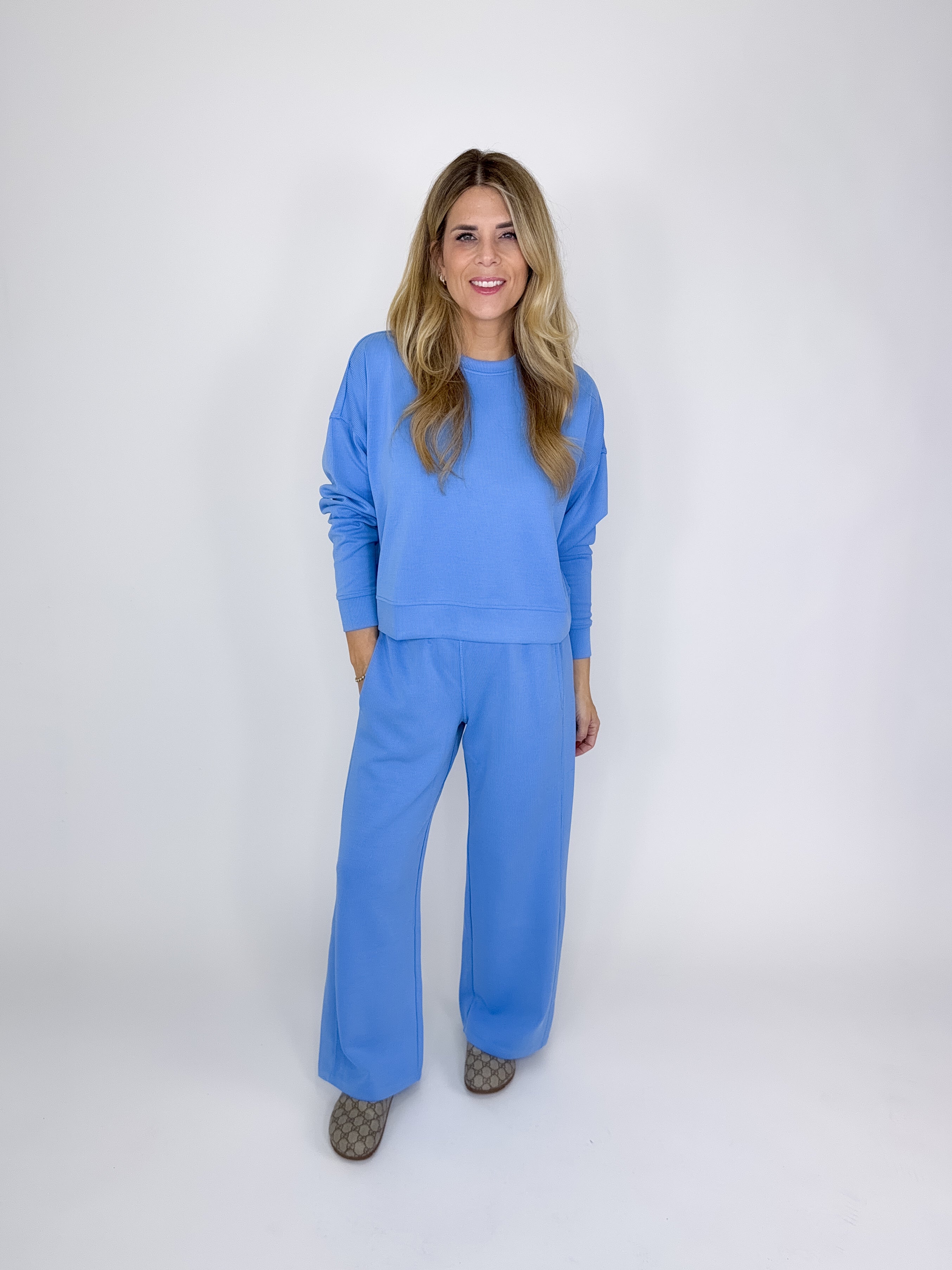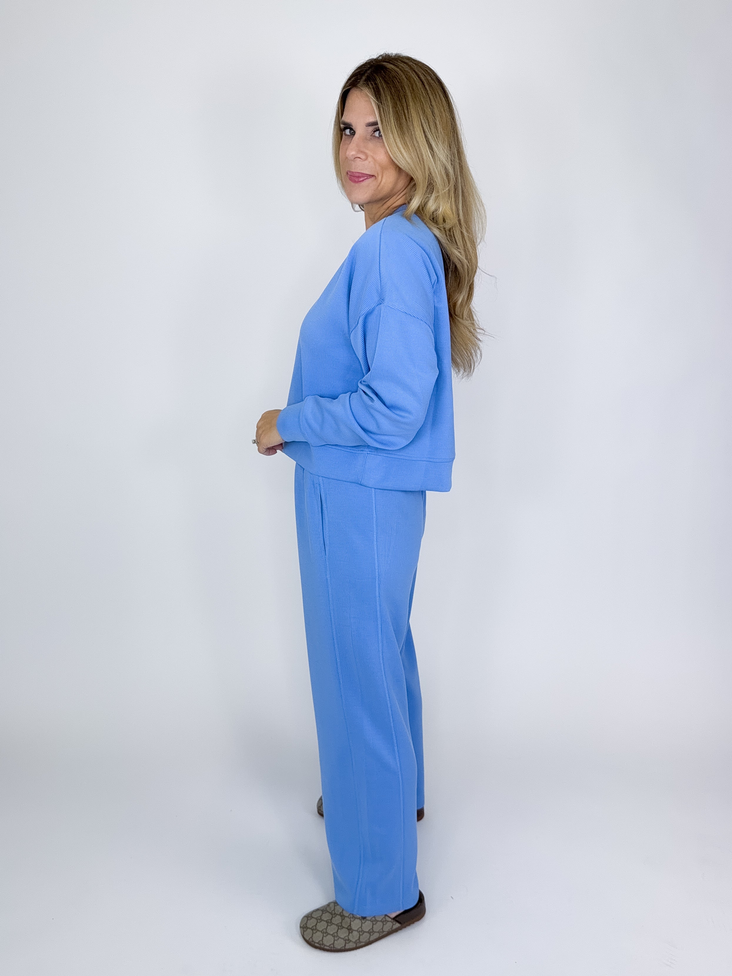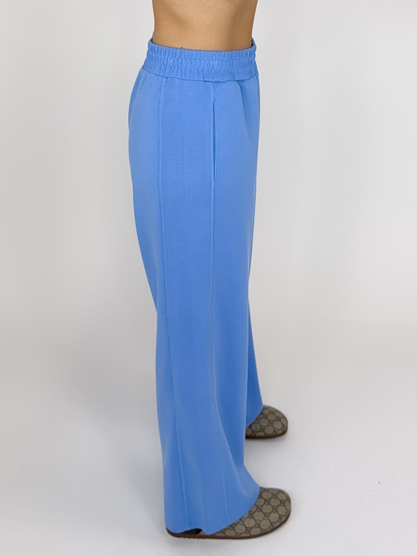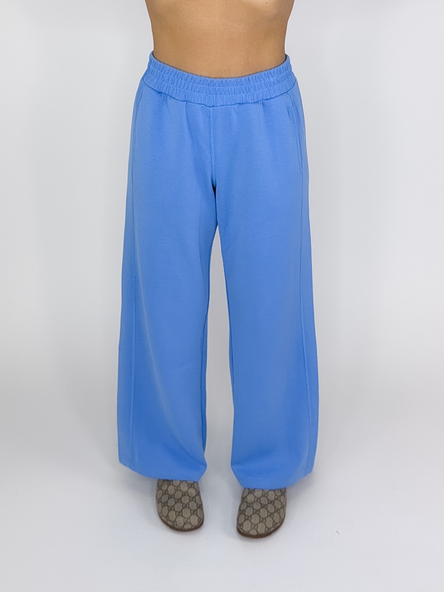 Our Jules Pants are a french blue mid rise, wide leg pull on ribbed pant with an elastic waist and an ankle length. Style with everything from your favorite tee and sneakers to or a sweater! We love them paired with our Jules Top.