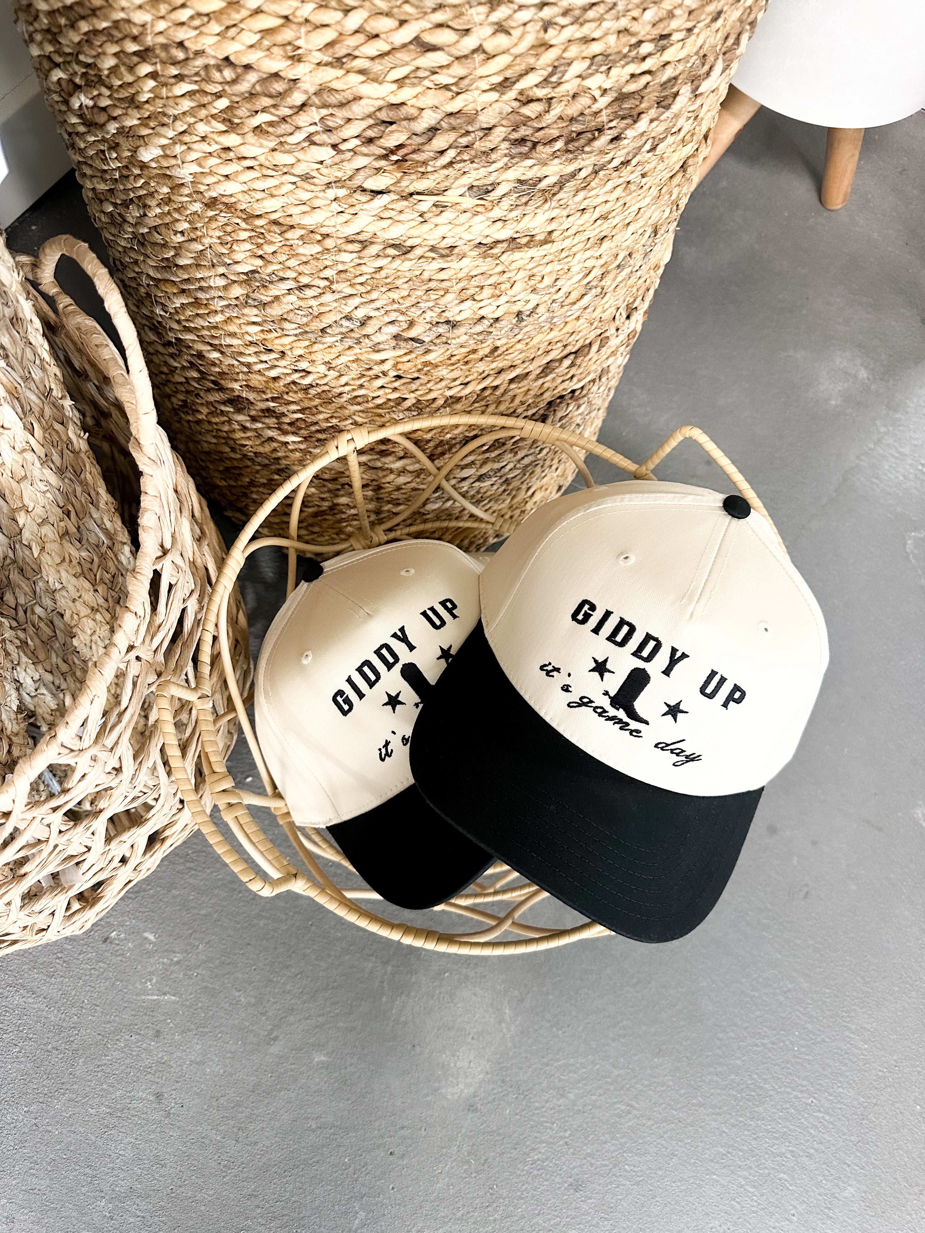 Our Giddy Up Hat is a must have for gameday! Black and cream canvas snapback hat with Black embroidery. Terrycloth lining for a comfort fit. Perfect for everyday!