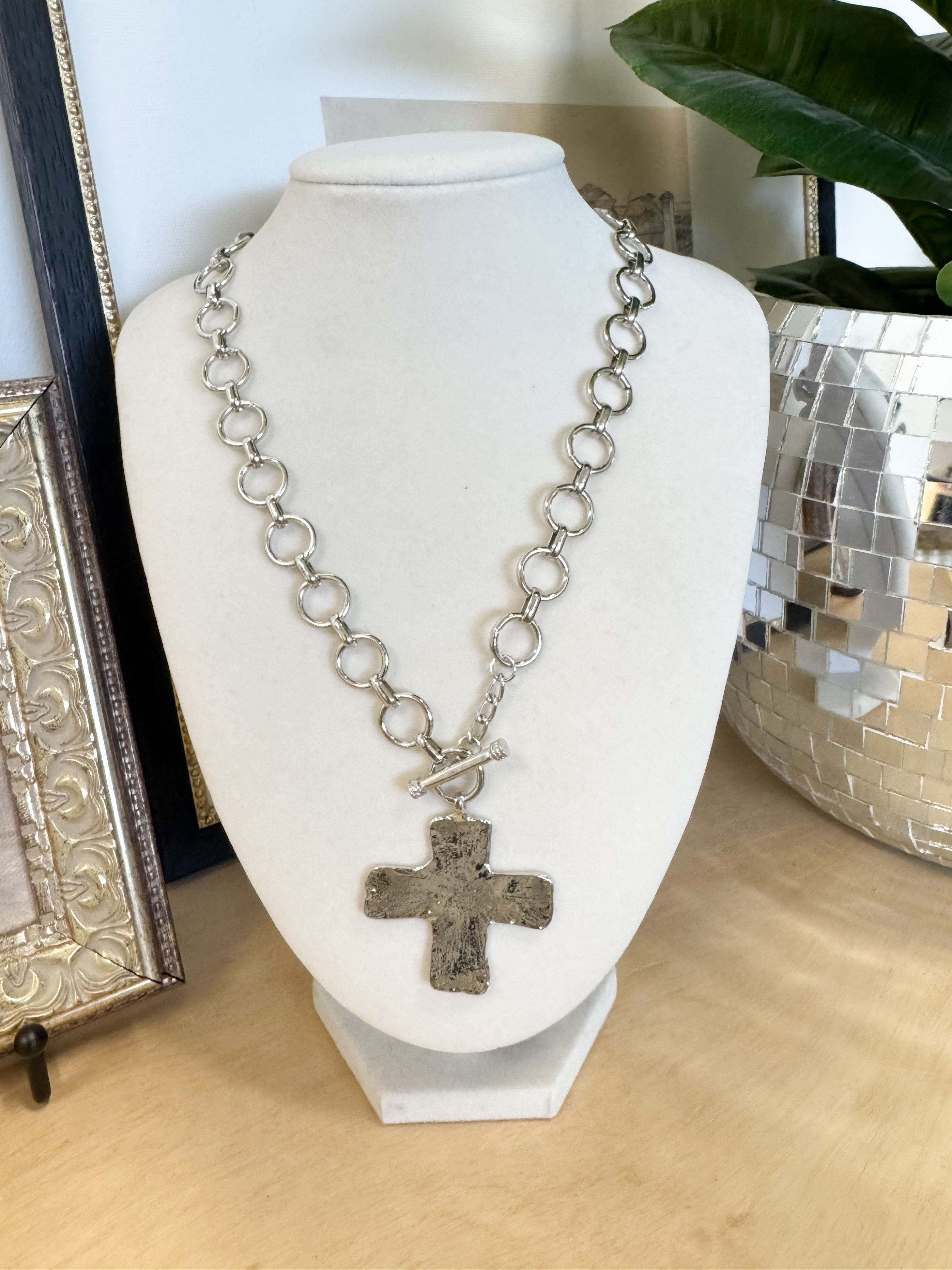 Hammered Cross Front Toggle Necklace is a bold and elegant statement piece with a touch of artisanal charm. The front toggle closure not only ensures easy wear but also enhances the design with a modern touch. Product details length: 18" clasp anti-tarnish