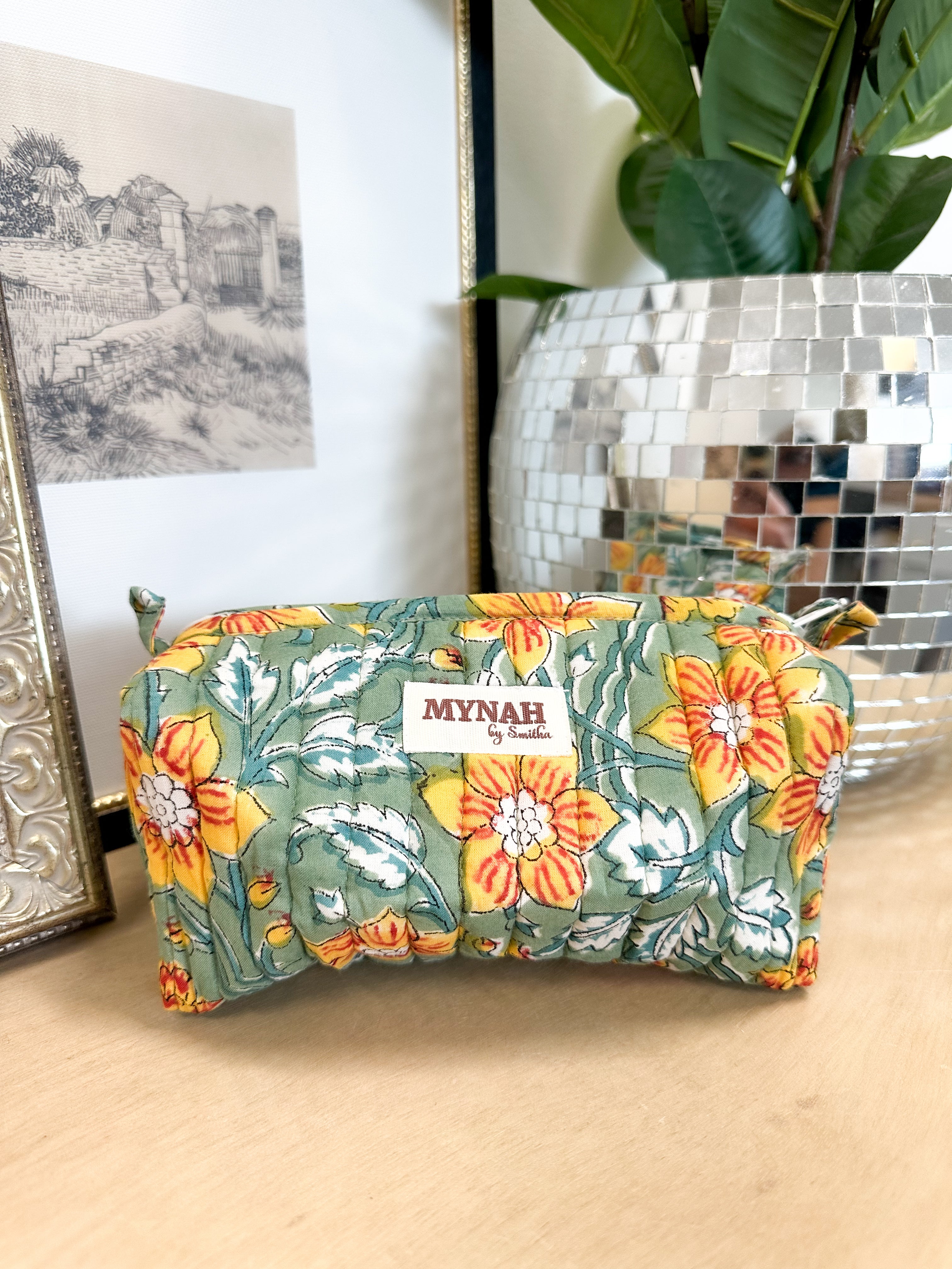 Our Sage Floral Quilted Pouf is perfect for storing makeup, stashing everyday essentials in a large tote bag or just a safe place for all your must haves! Machine washable and tumble dry. Gets softer with every wash! Zipper closure. Waterproof liner. 7”x 3”x3” This style is available in 3 sizes; small, medium and large.