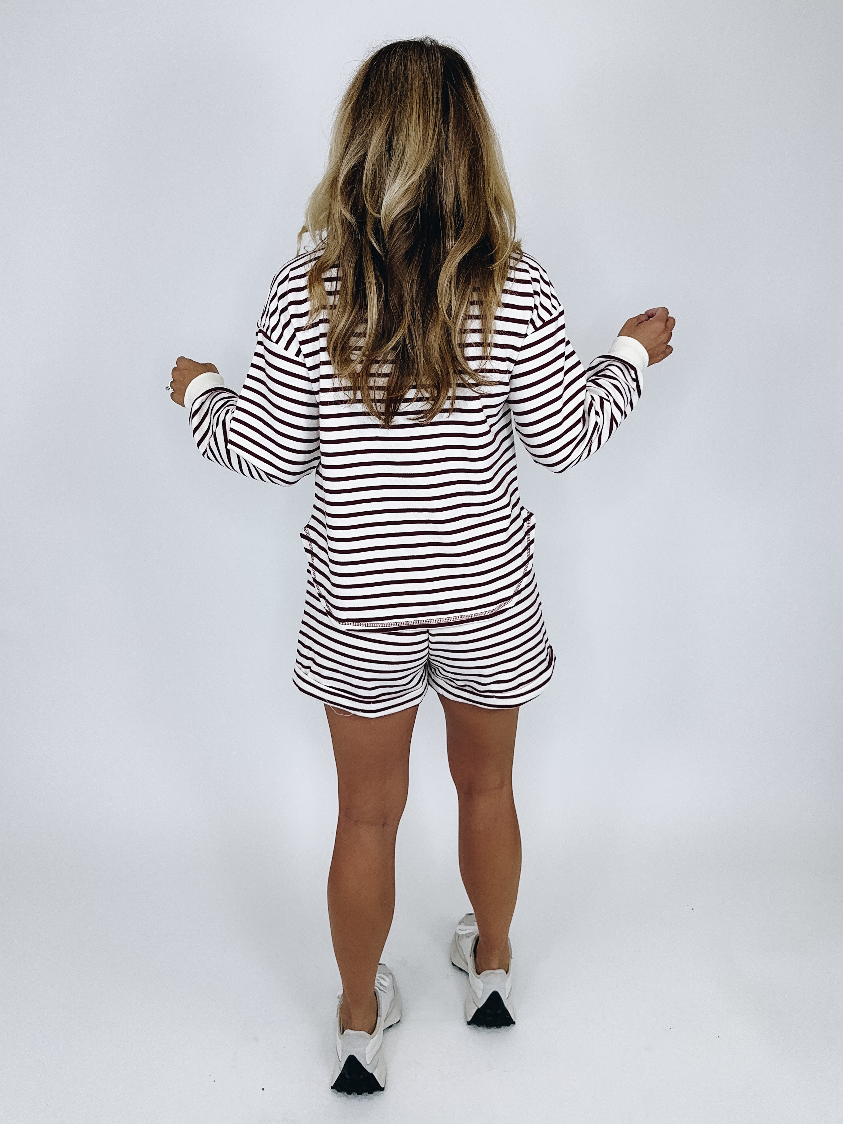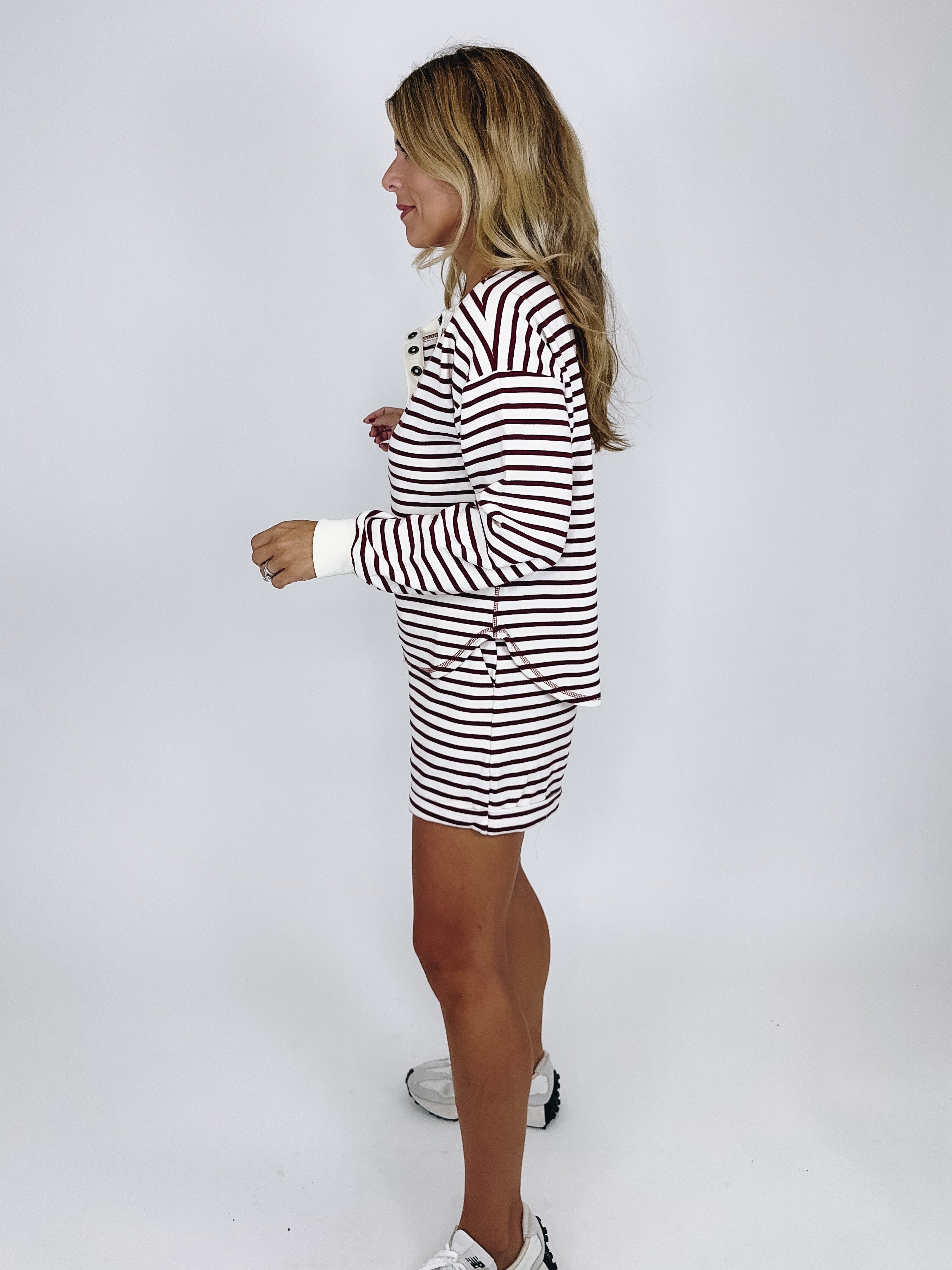 The Georgia Top in is the perfect top. This soft ribbed burgundy and cream stripe knit top features long sleeves, button front drop shoulder and a round hem. Pair with denim, flats, leggings and sneakers. We love it paired with our Georgia Shorts. Relaxed fit.