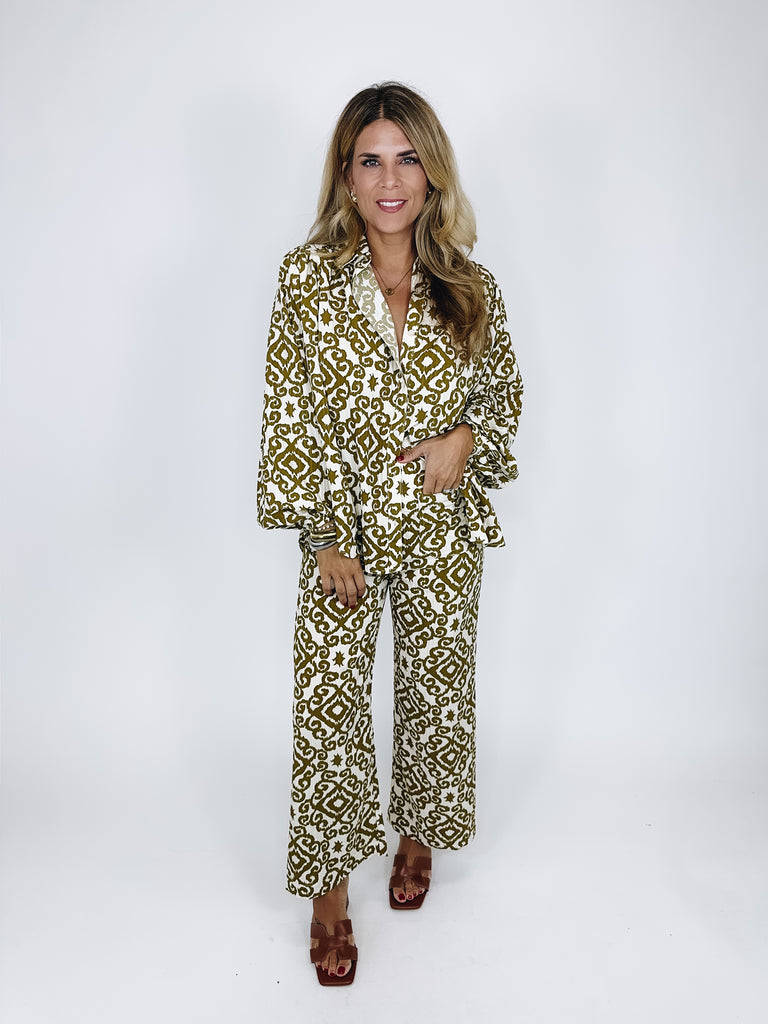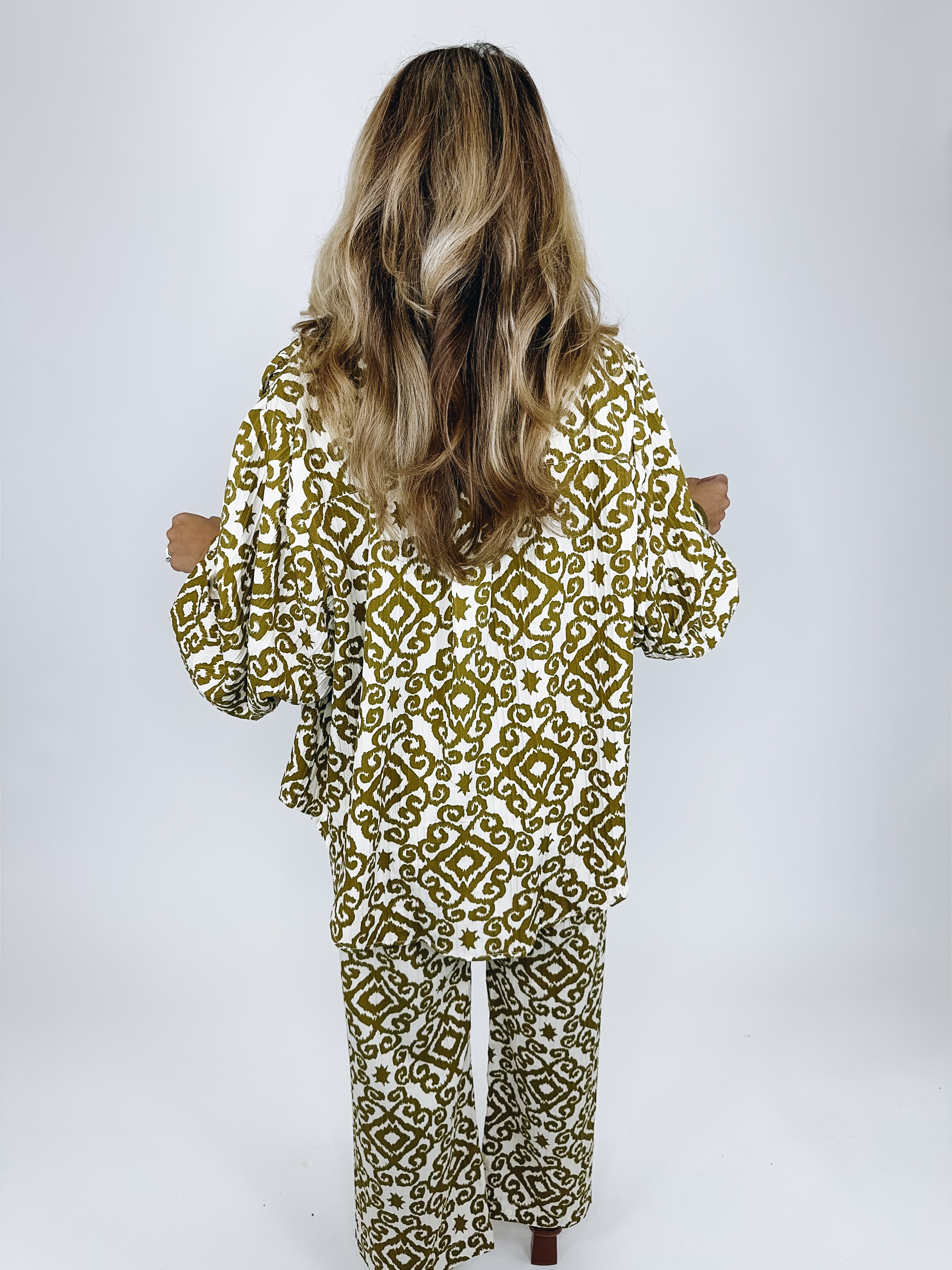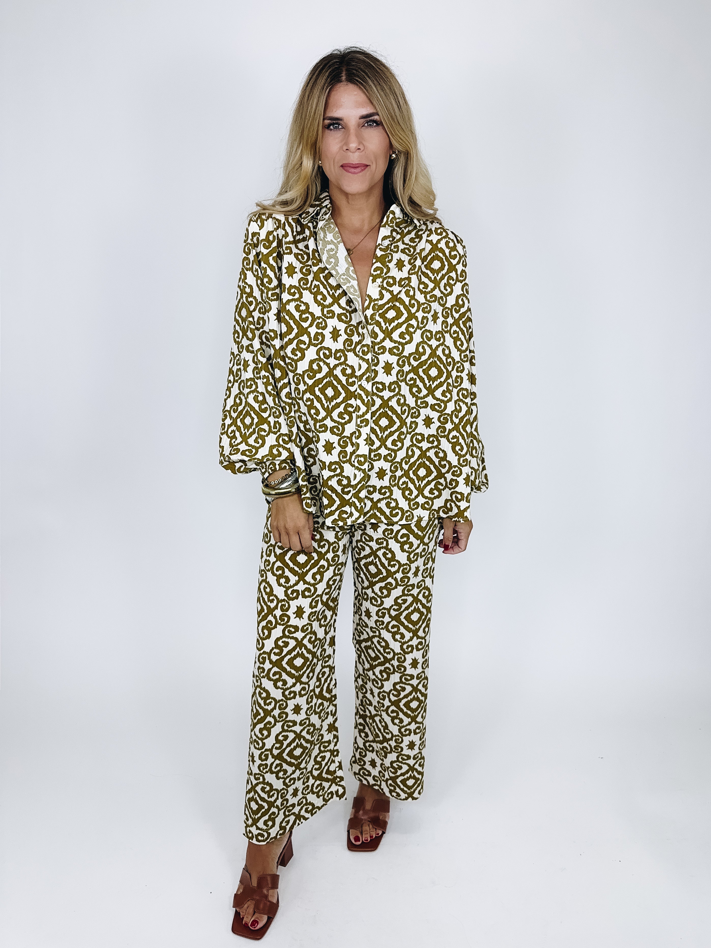 The Tinley Set is a showstopper. This beige and cream geometric print set feels so luxe and is one you will reach for over and over! Shirt style top with a button front, collar, high low hem. and long balloon sleeves. The pants offer a high waist, button and zipper closure, front facing pockets and back pockets and an ankle length. 26 inch inseam. 12" Rise. Pair with flats, wedges, heels or sneakers. Fits true to size.
