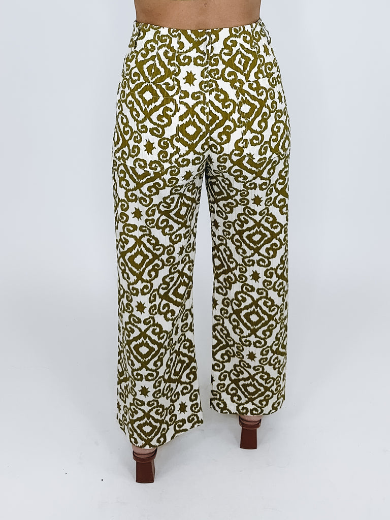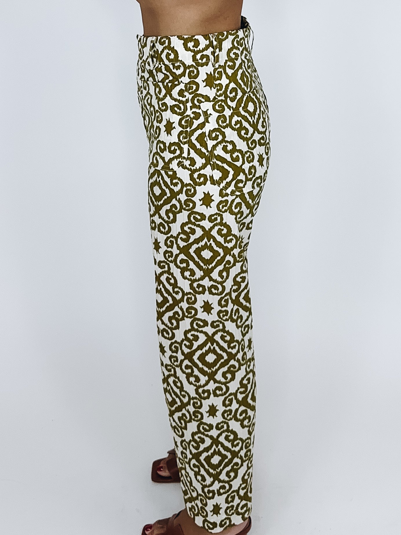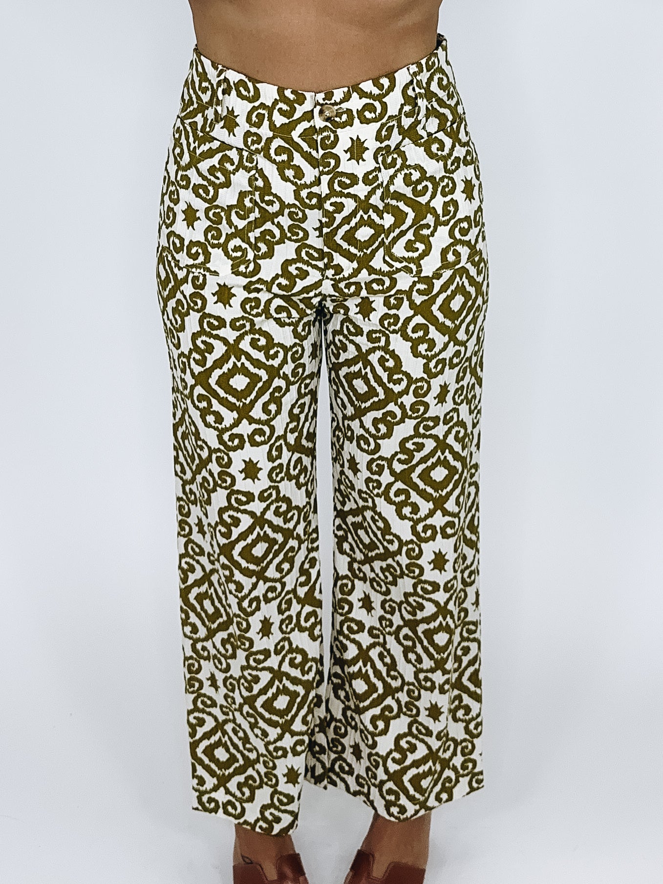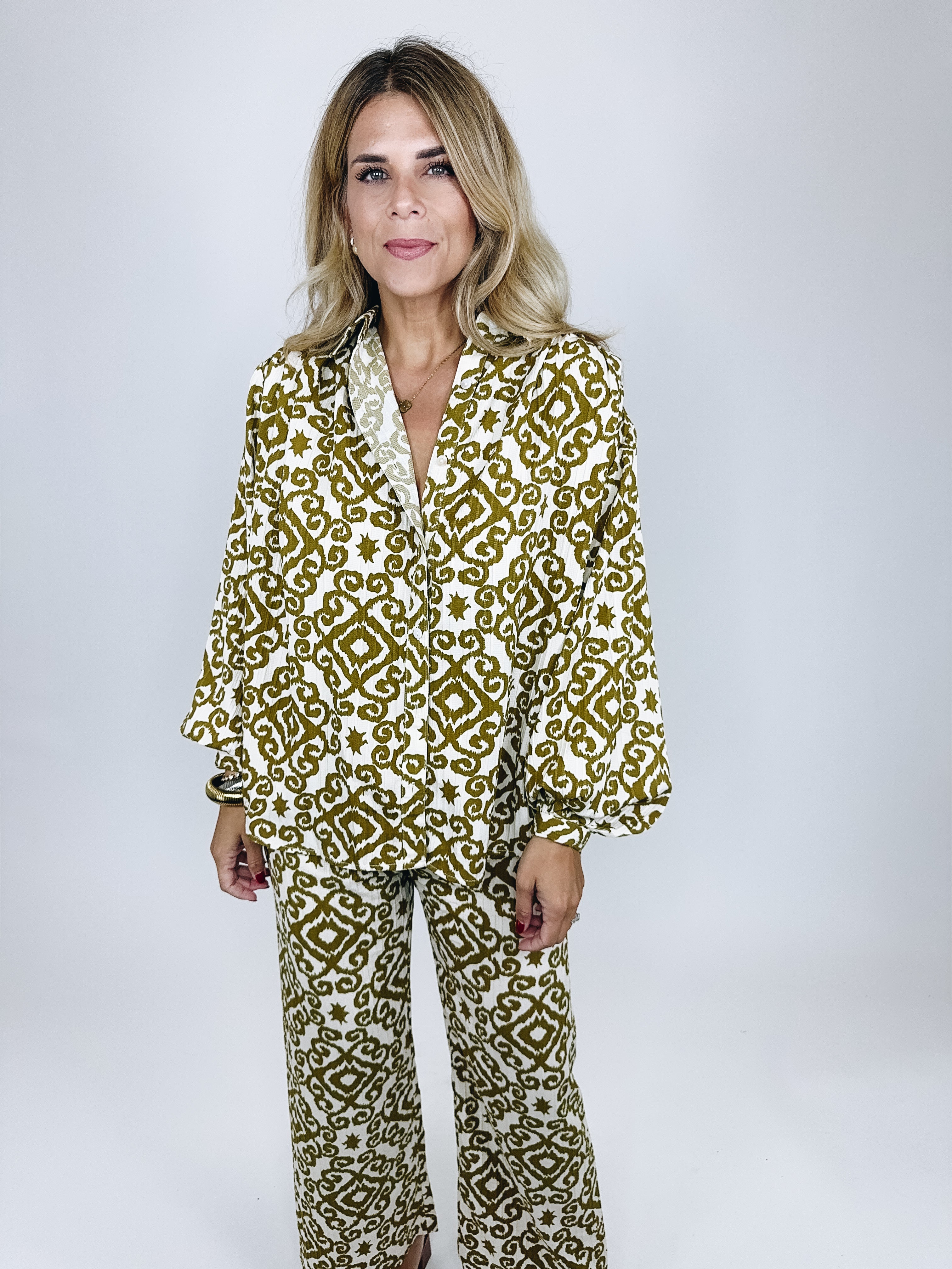 The Tinley Set is a showstopper. This beige and cream geometric print set feels so luxe and is one you will reach for over and over! Shirt style top with a button front, collar, high low hem. and long balloon sleeves. The pants offer a high waist, button and zipper closure, front facing pockets and back pockets and an ankle length. 26 inch inseam. 12" Rise. Pair with flats, wedges, heels or sneakers. Fits true to size.