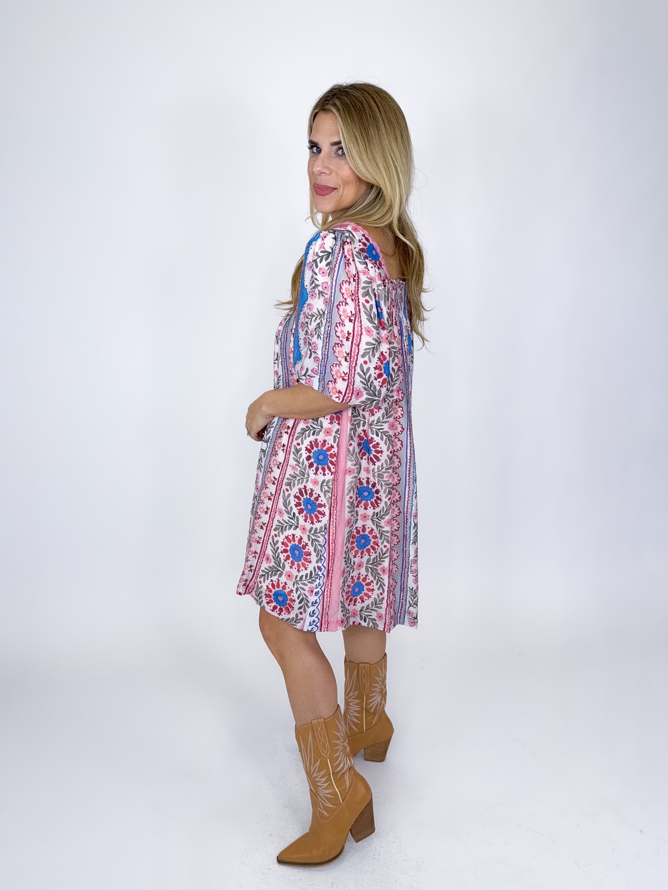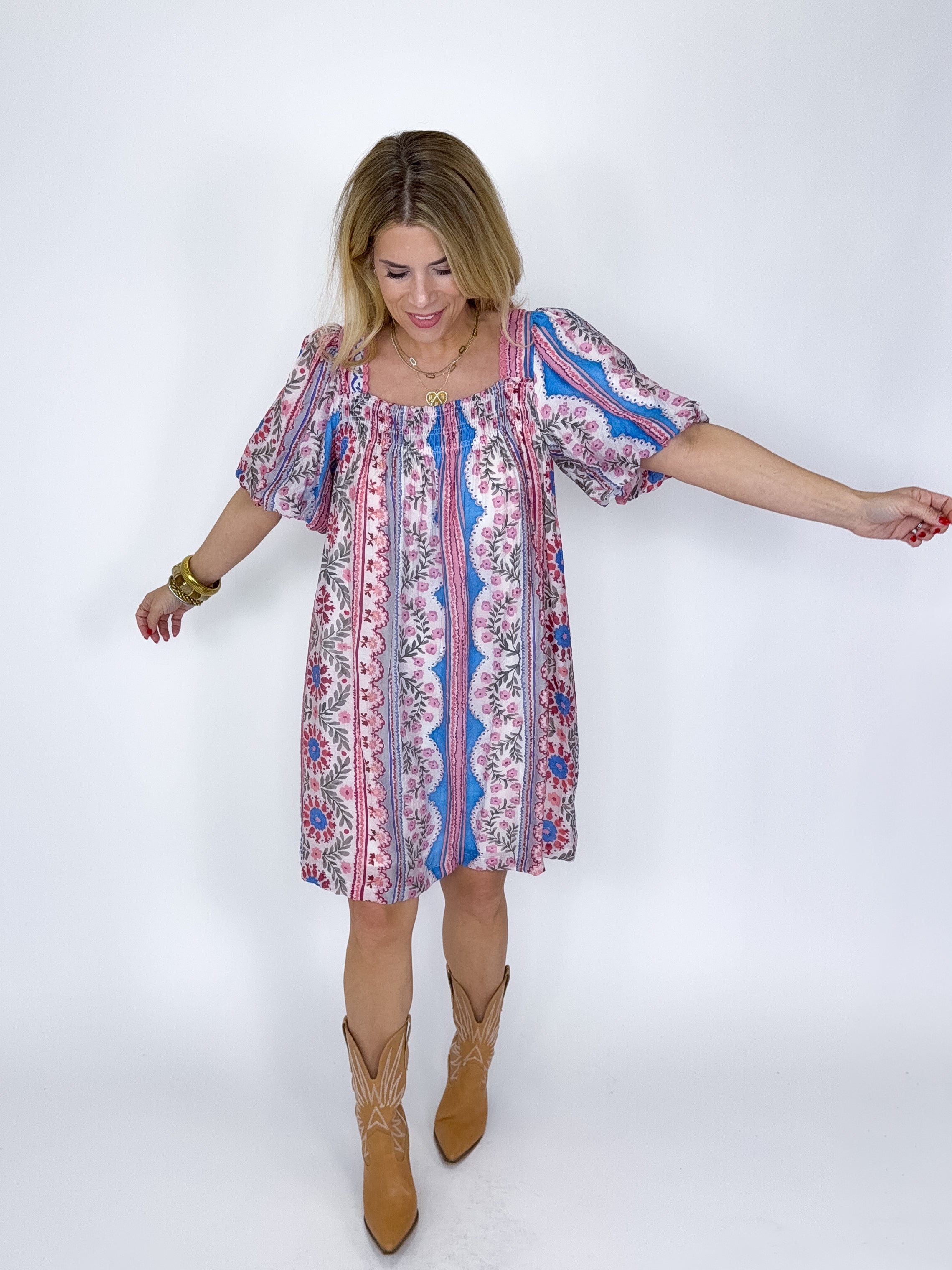 The Everett Dress is such a easy throw on dress! This pink and blue mixed pattern floral and stripe print dress featuring a square neck with smocking and a scallop trim, short puff sleeves and an easy fit. Lined. Style with flats, sneakers, or heels! Fits true to size.