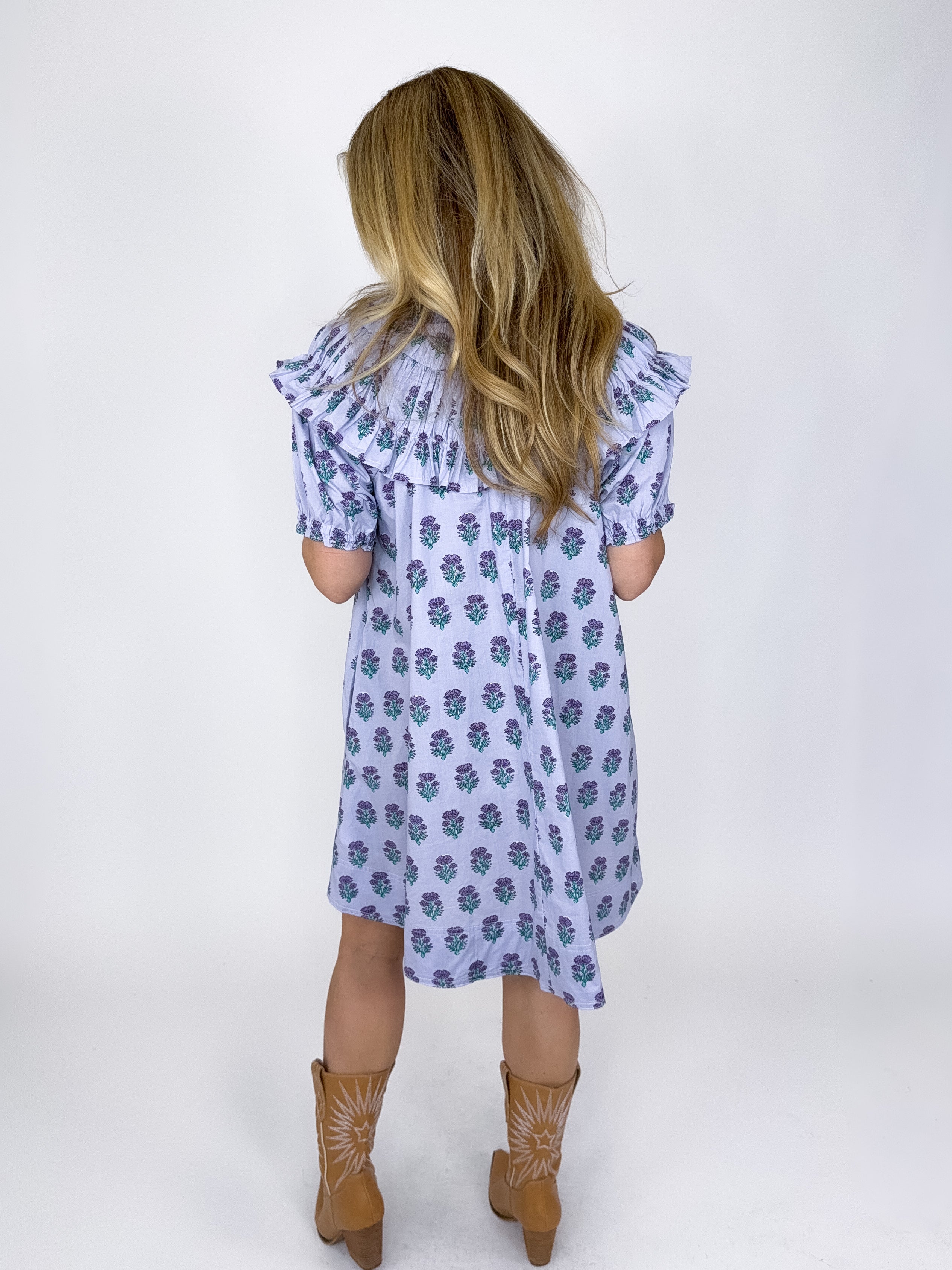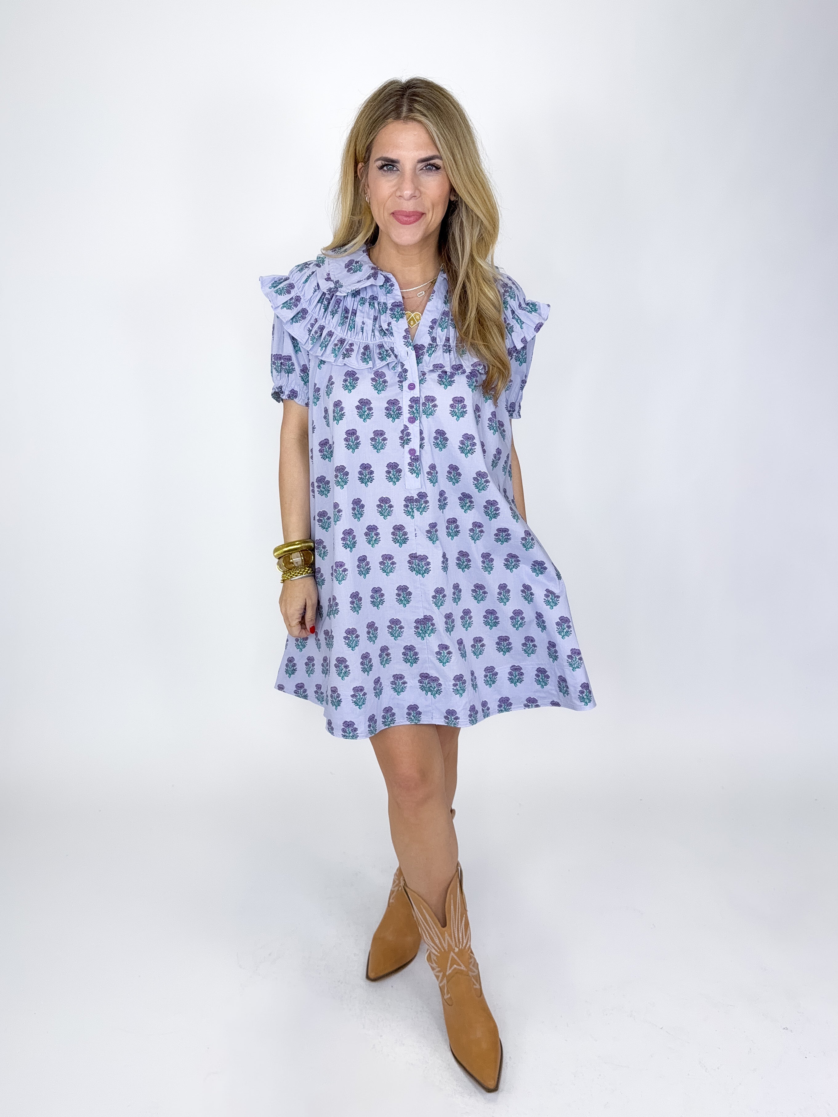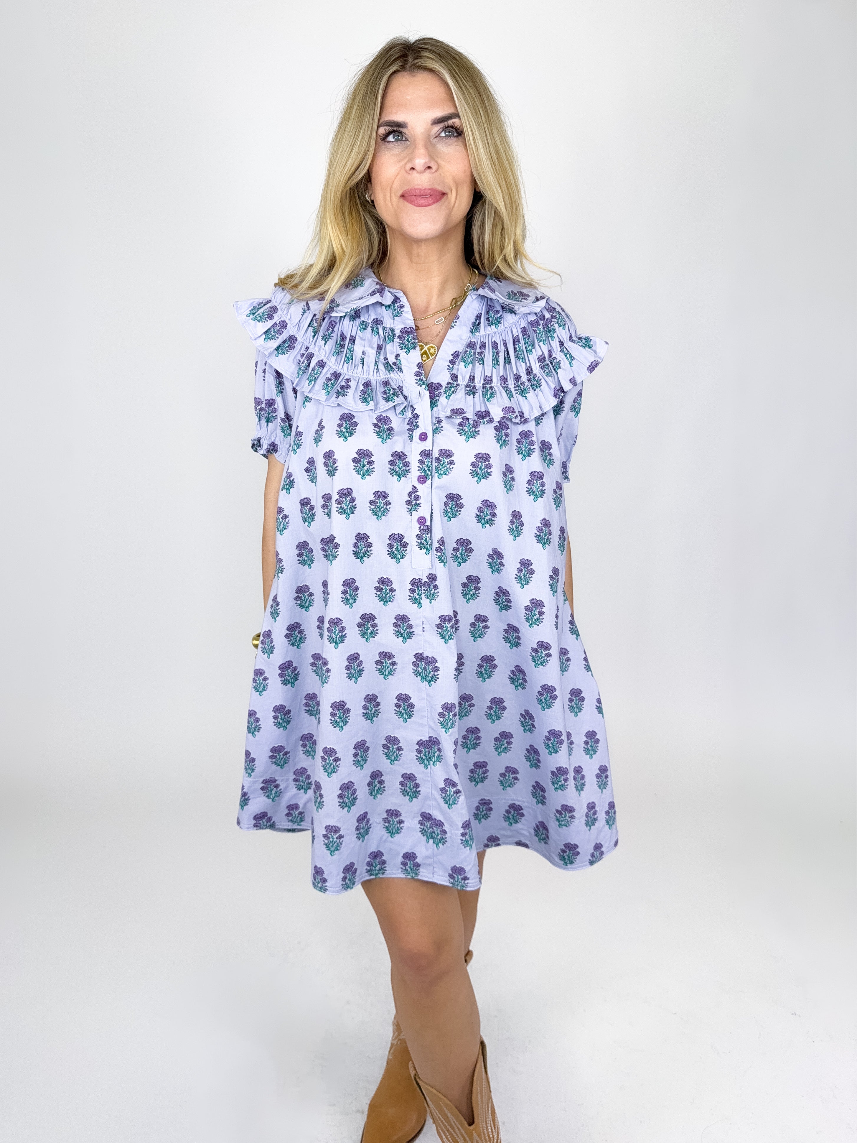 The Sage Dress is such a fun dress! This beautiful light purple floral block print mini dress features short puff sleeves, V-neck, half button front, ruffle collar and bodice and a great length. Pairs well with flats, heels and sneakers! Fits true to size.