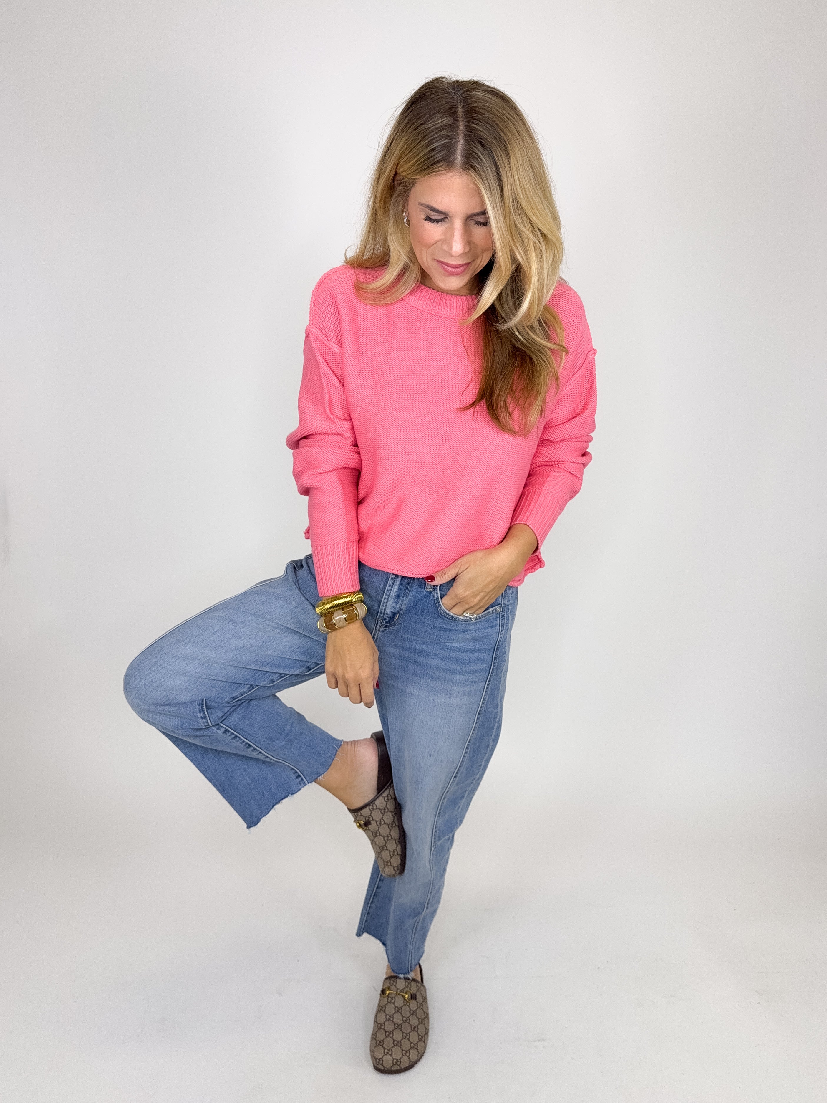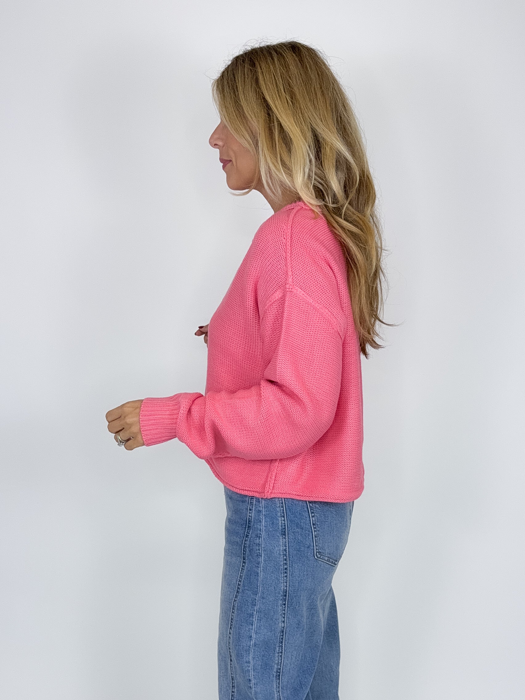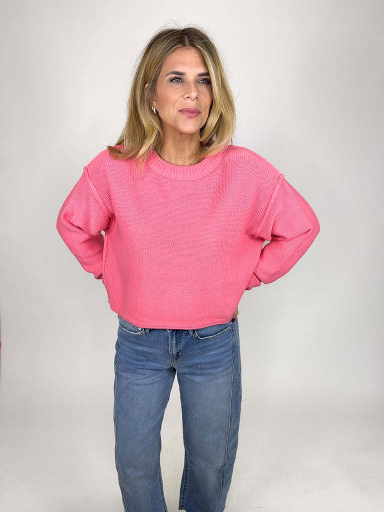 The Betsy Sweater is a perfect everyday sweater. This beautiful pink knit sweater features a crew neck, exposed seams, drop shoulder, long sleeves and skimmer fit. Pair with denim, boots, flats, skirts, dress pants and sneakers. Fits true to size.