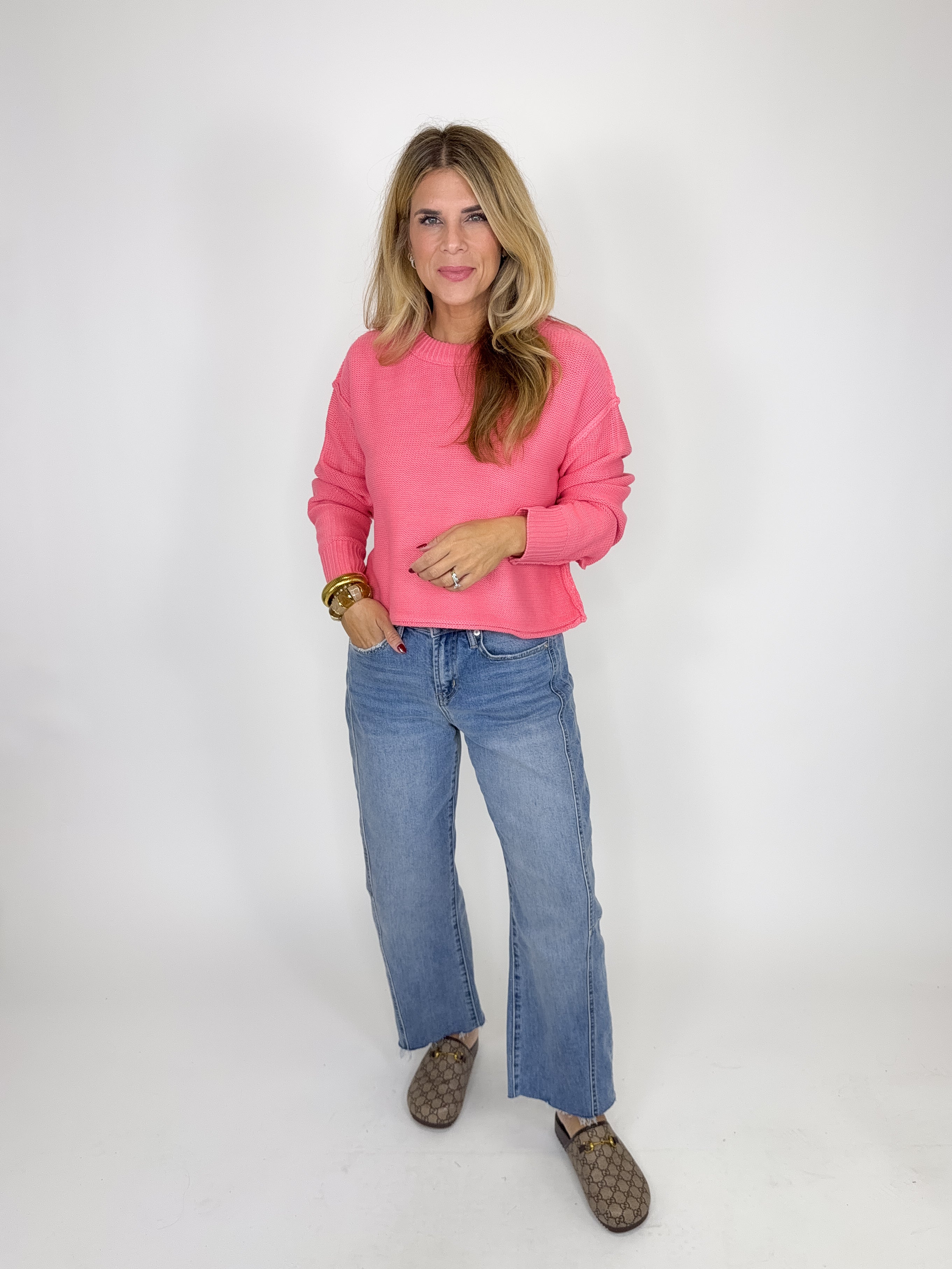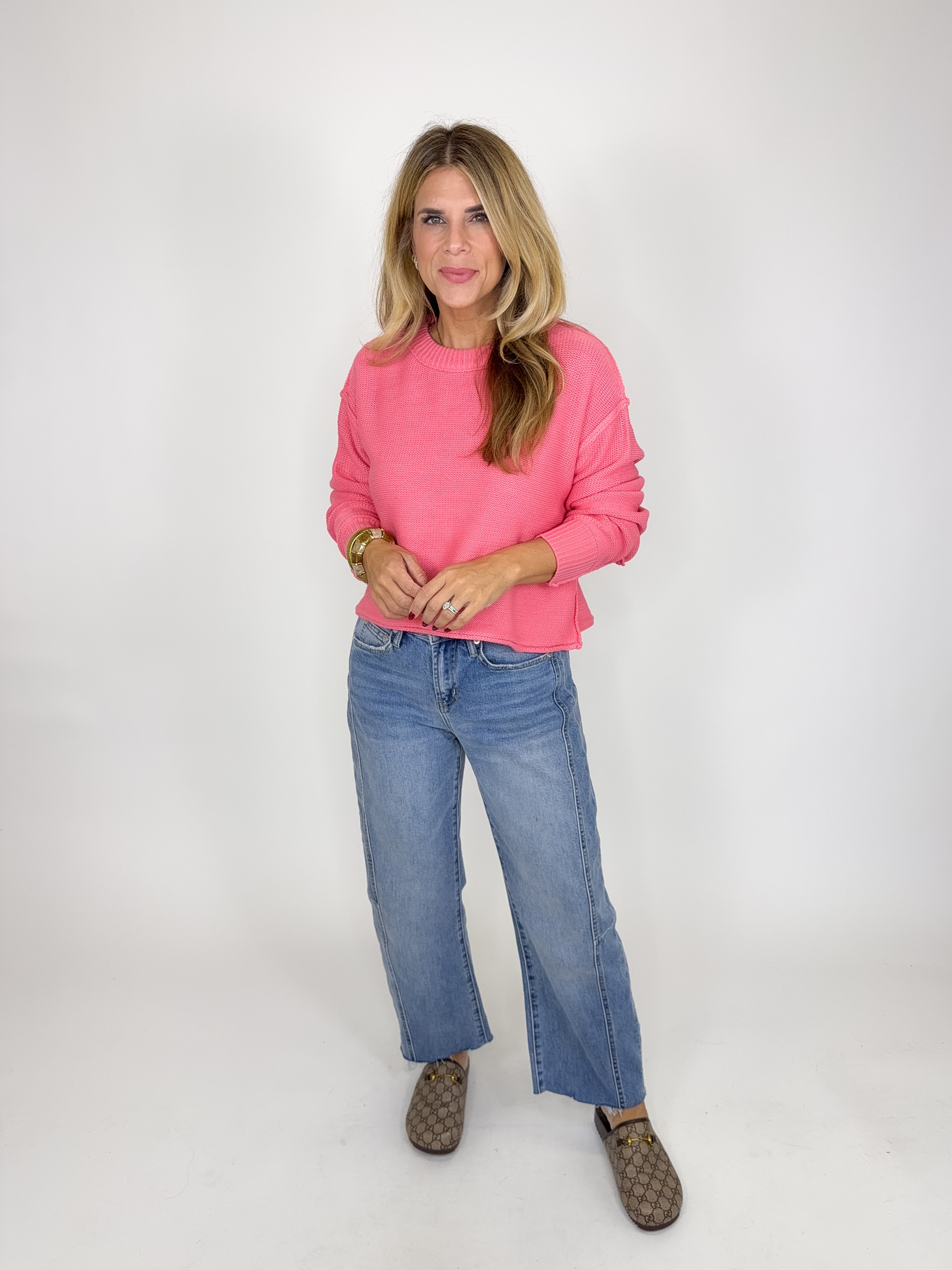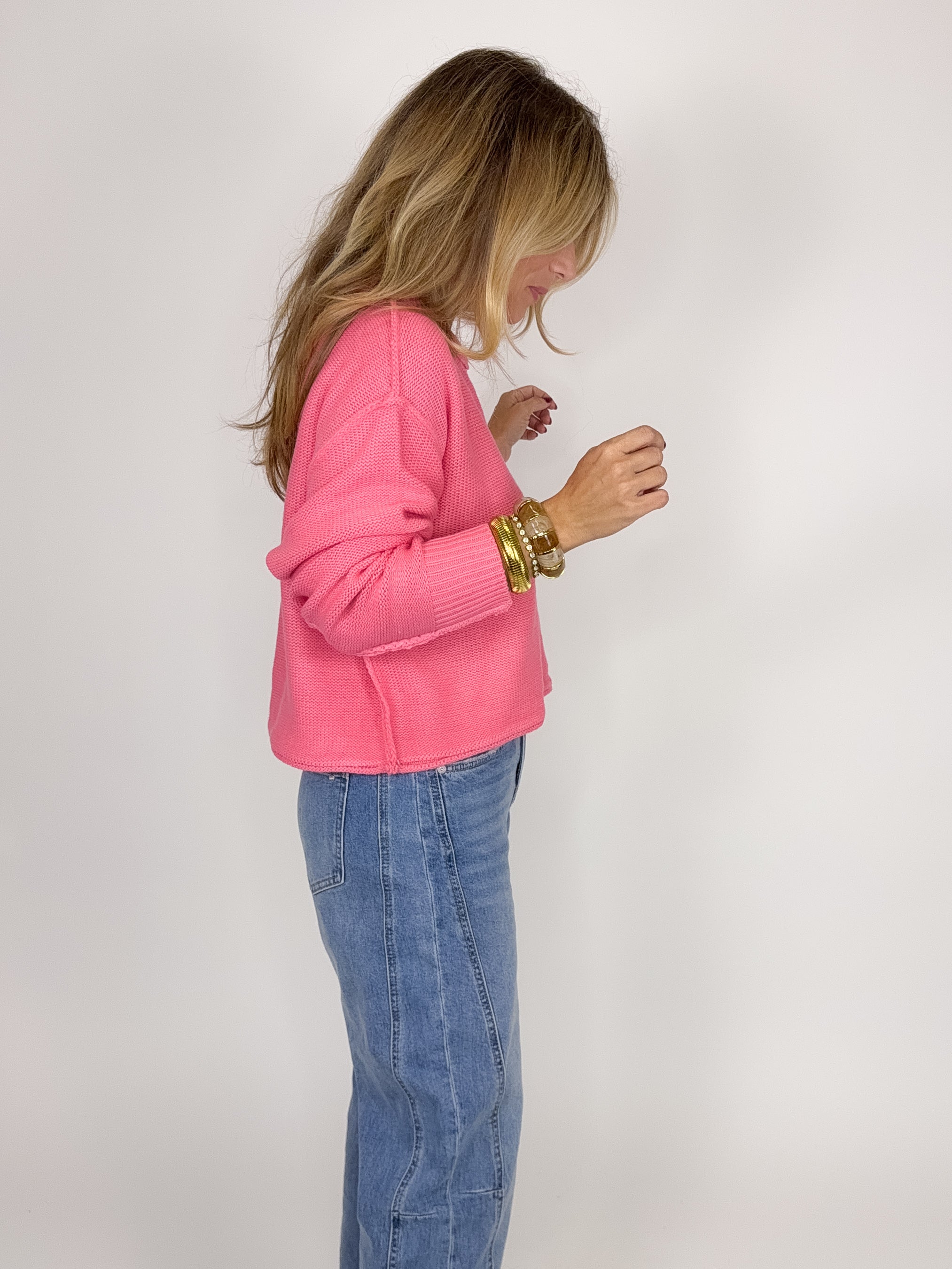 The Betsy Sweater is a perfect everyday sweater. This beautiful pink knit sweater features a crew neck, exposed seams, drop shoulder, long sleeves and skimmer fit. Pair with denim, boots, flats, skirts, dress pants and sneakers. Fits true to size.