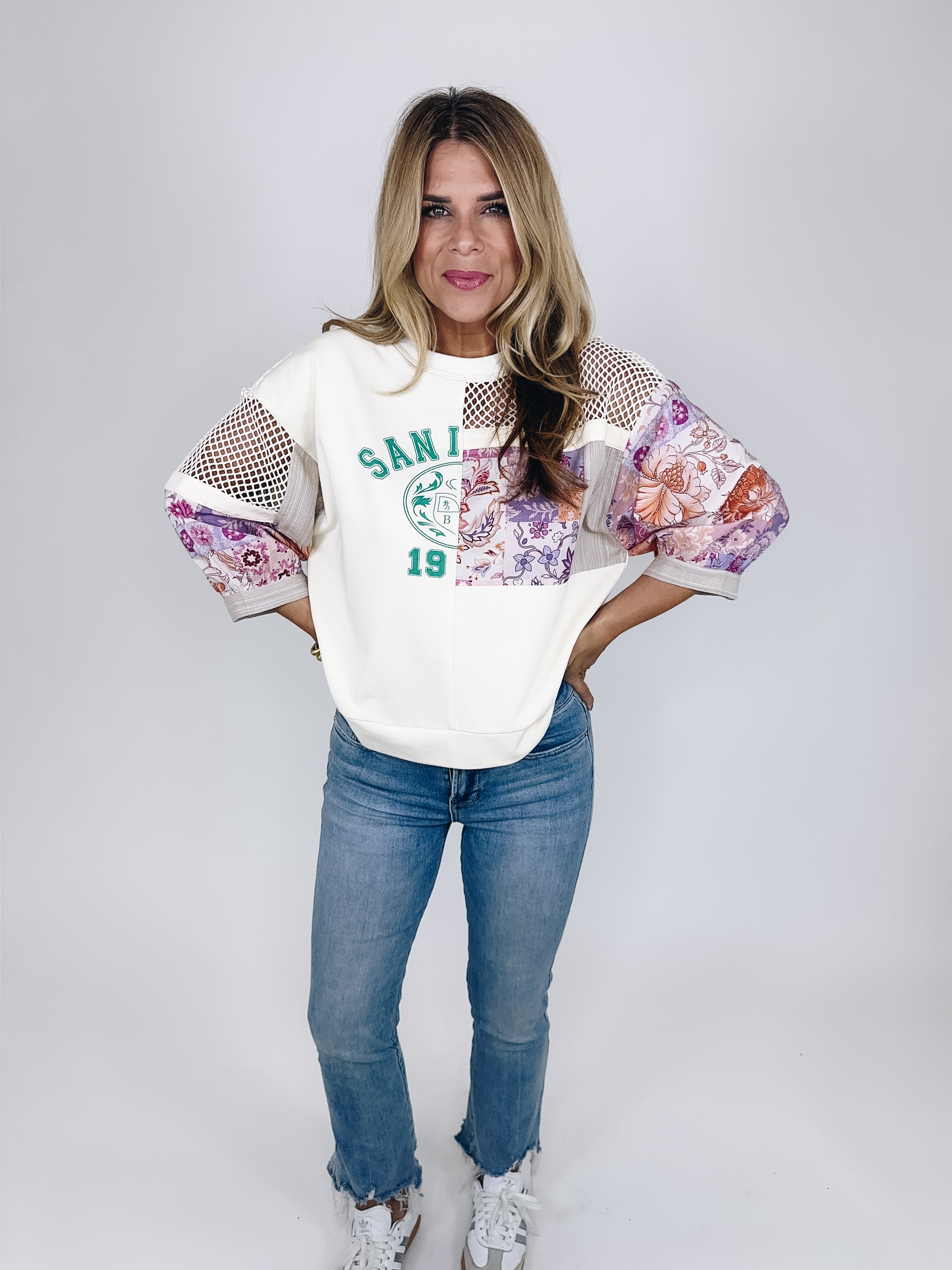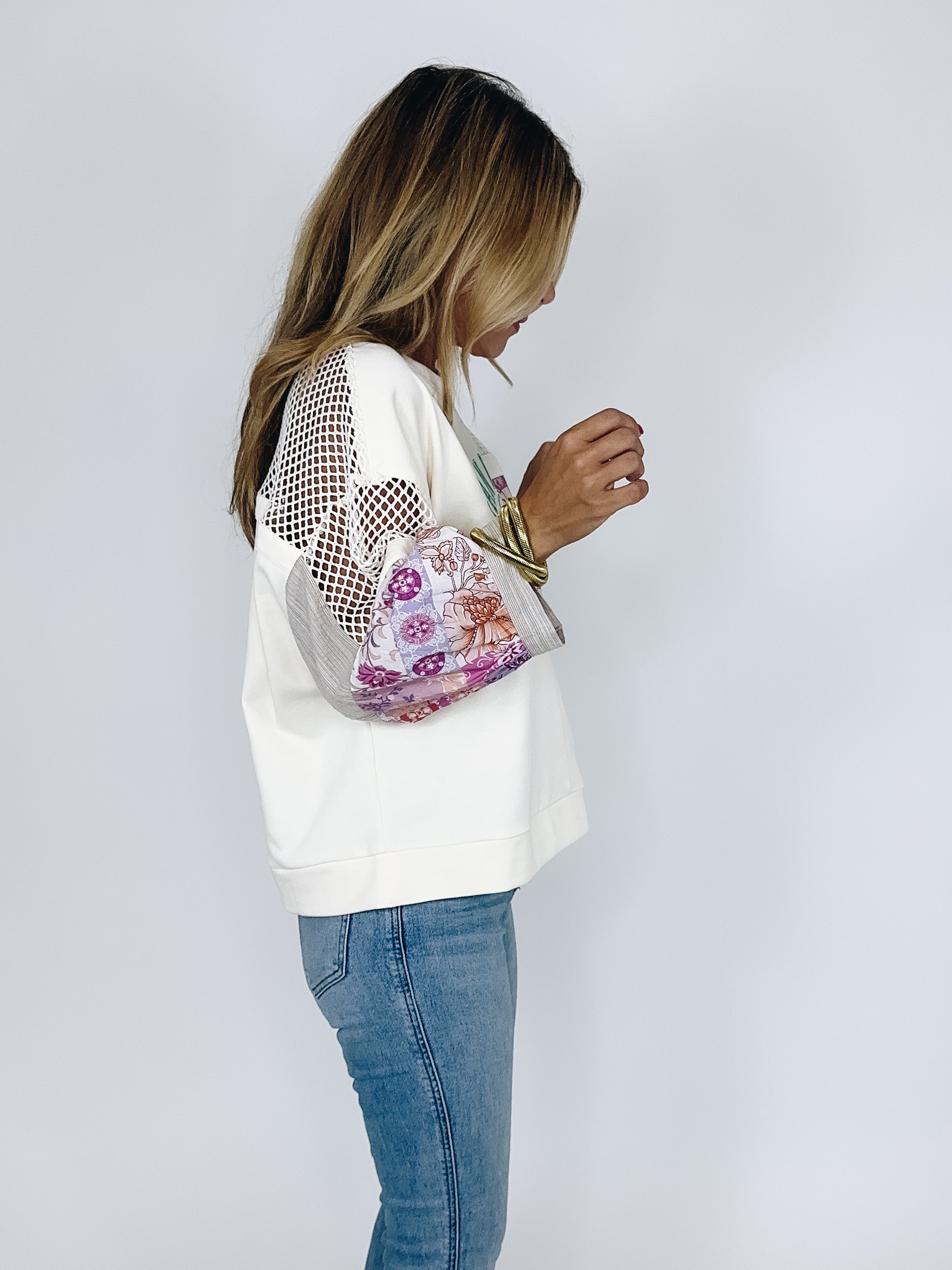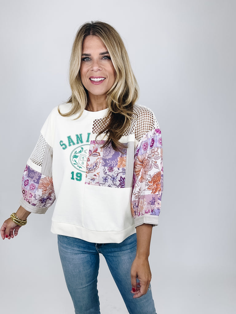 The Colby Top is the perfect everyday top. This super soft jersey knit mixed media cream top features a drop shoulder, 3/4 sleeves, boho graphic print and great length. Pair with denim, flats, leggings and sneakers. Relaxed fit.