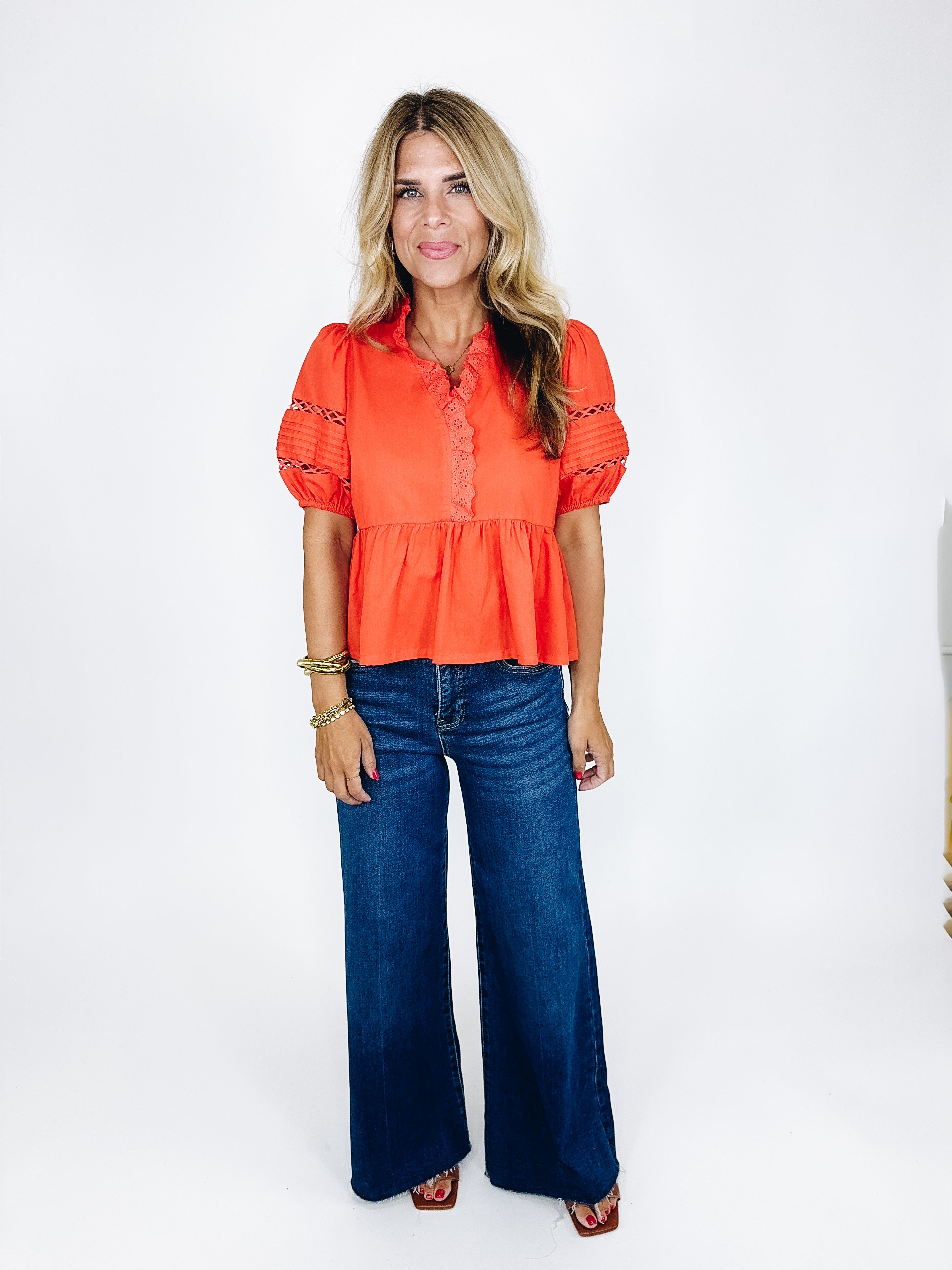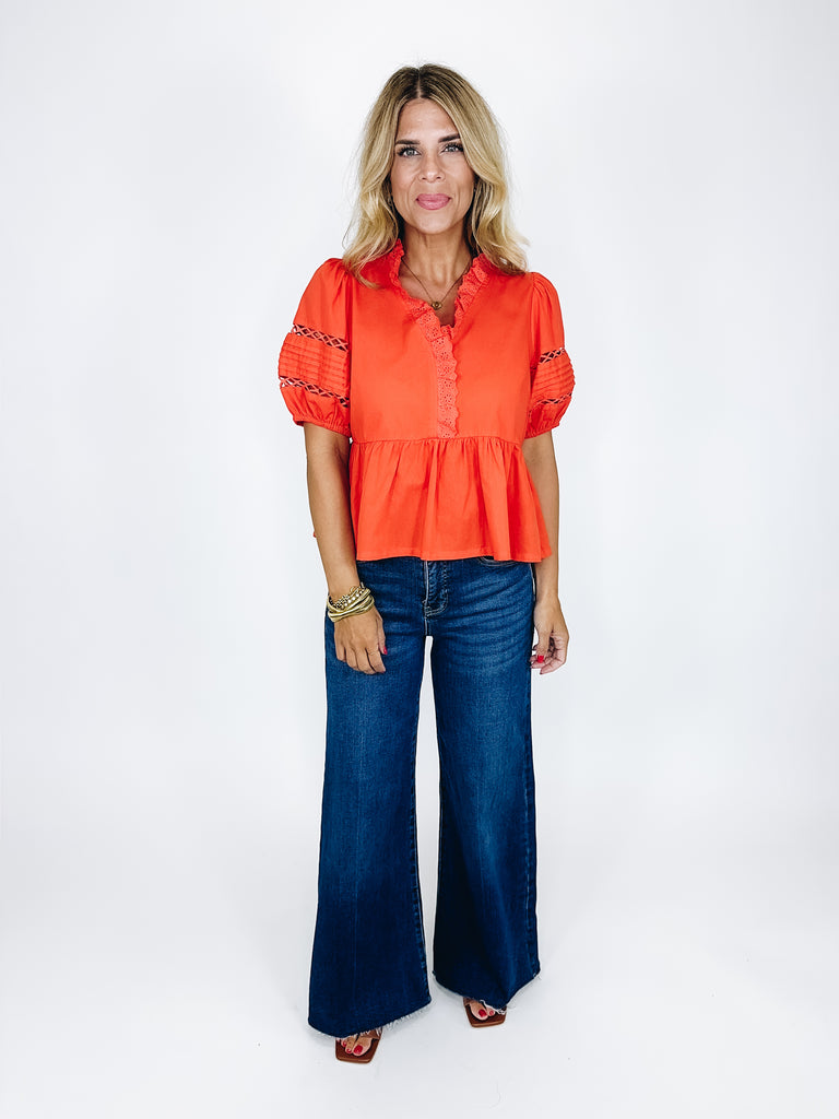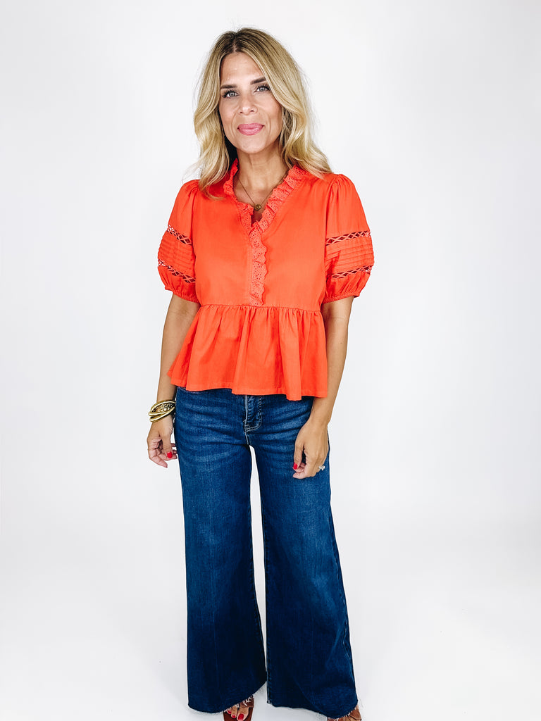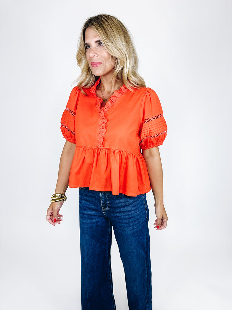 The Fisher Top is such a sweet top! This red blouse features a v-neckline with ruffle trim, short balloon sleeves with lace trim and a peplum hem. Pairs well with everything from denim, flats, heels, dress pants, skirts and more! Fits true to size.