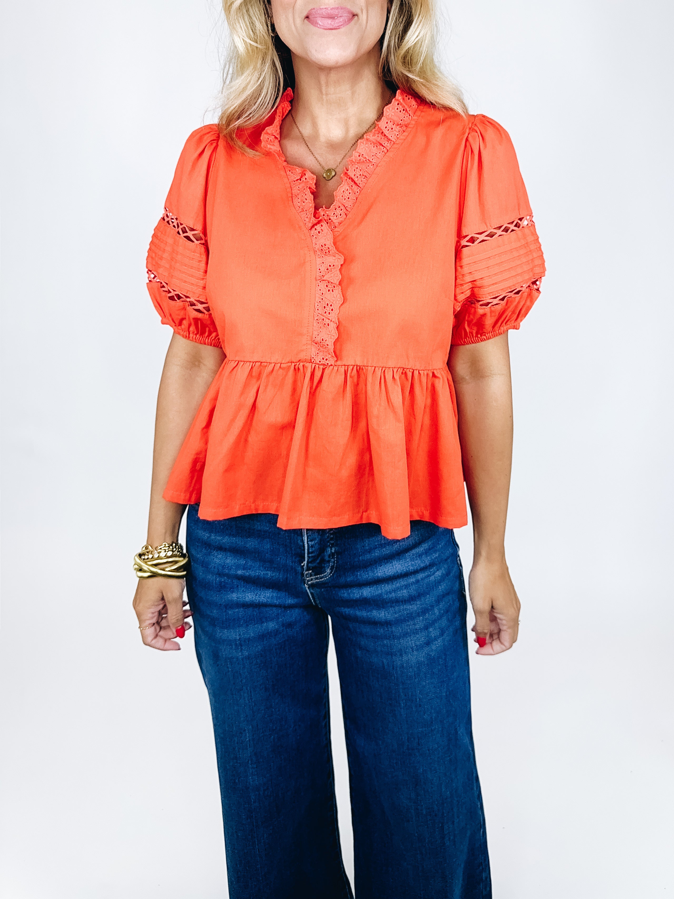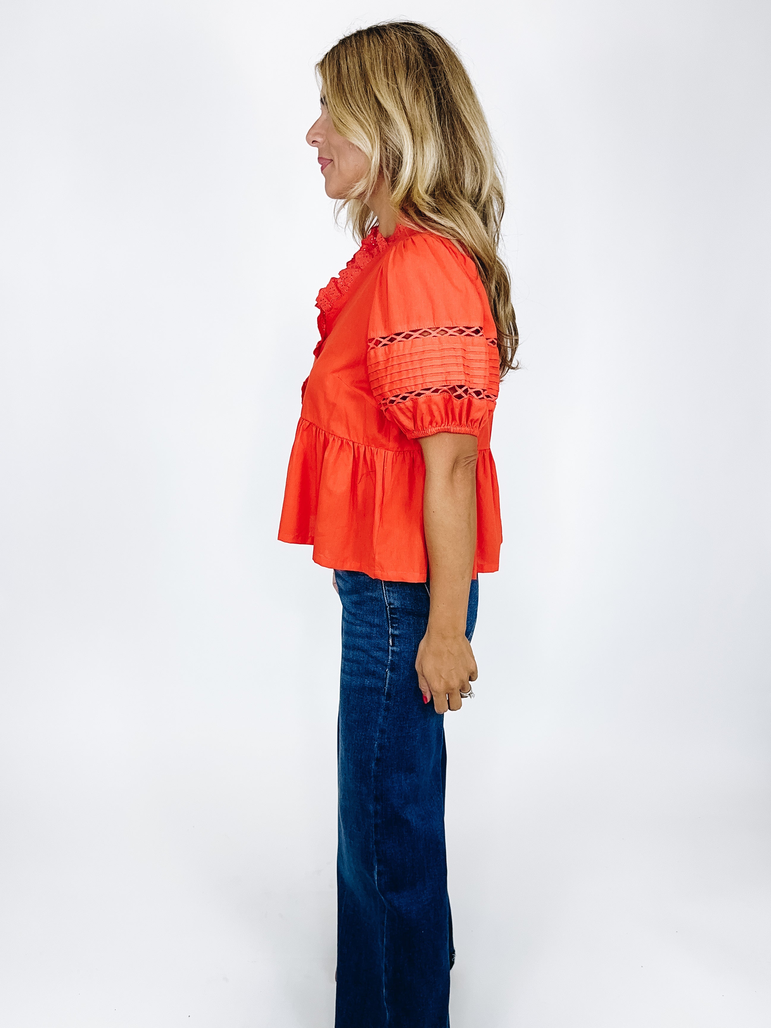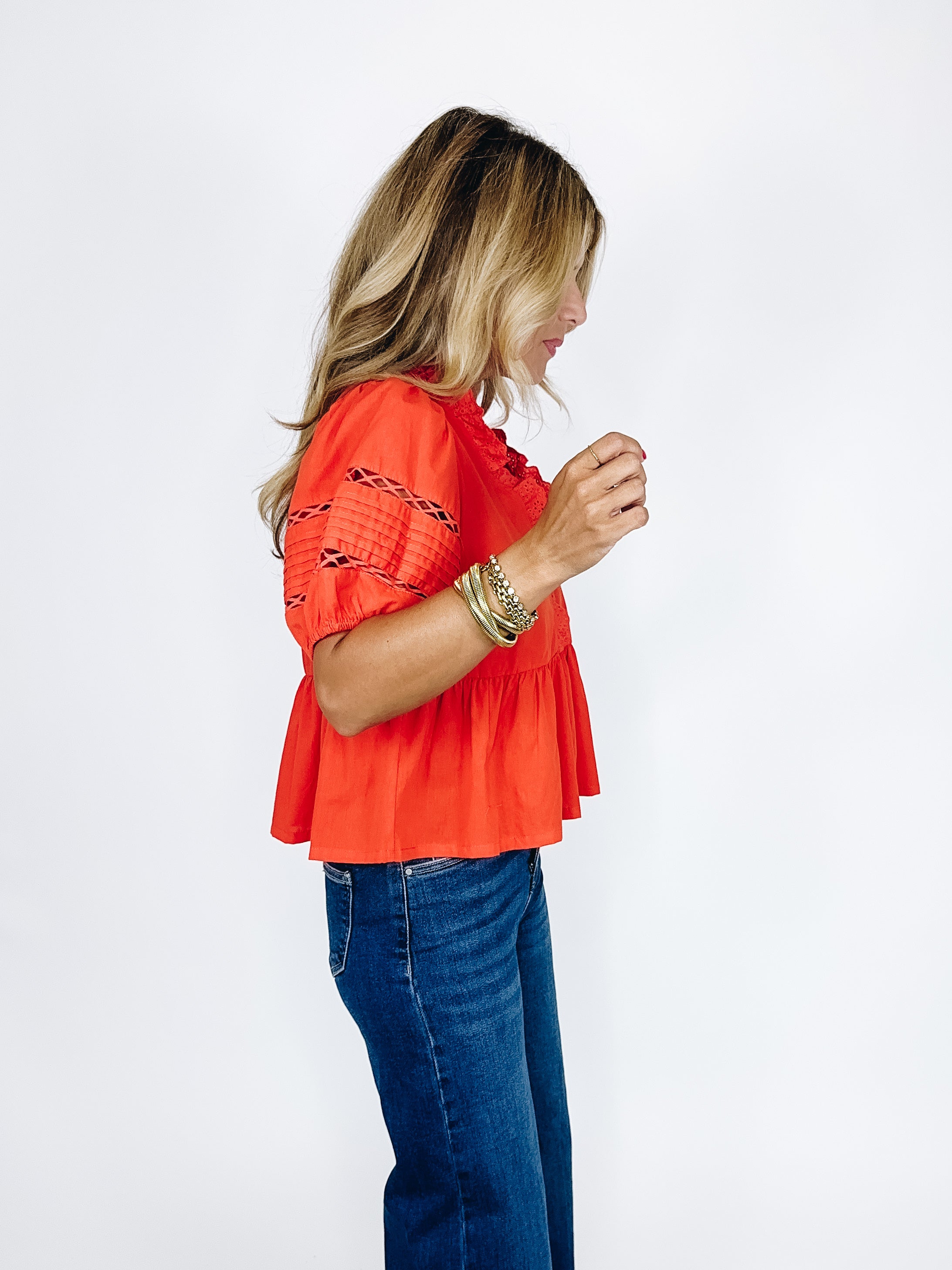 The Fisher Top is such a sweet top! This red blouse features a v-neckline with ruffle trim, short balloon sleeves with lace trim and a peplum hem. Pairs well with everything from denim, flats, heels, dress pants, skirts and more! Fits true to size.