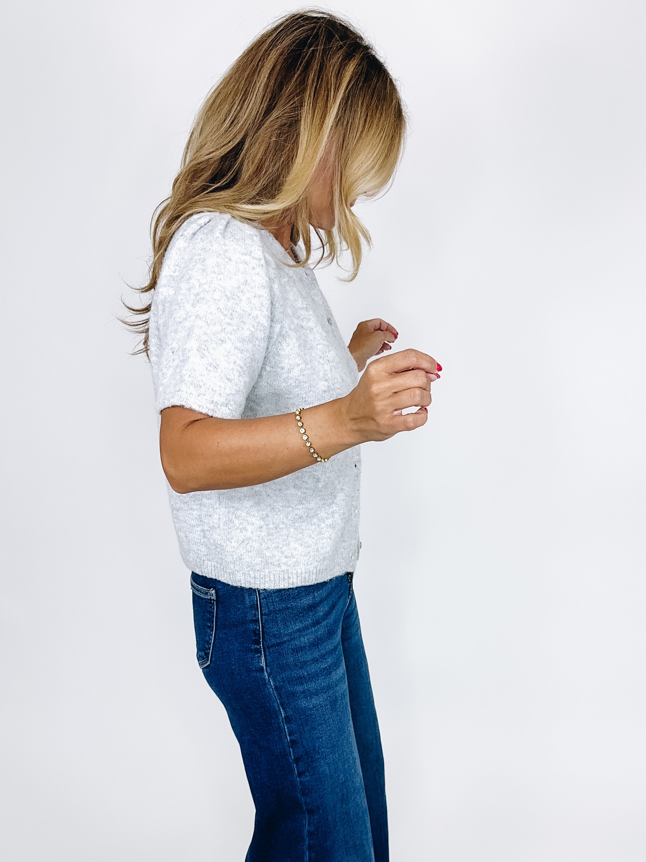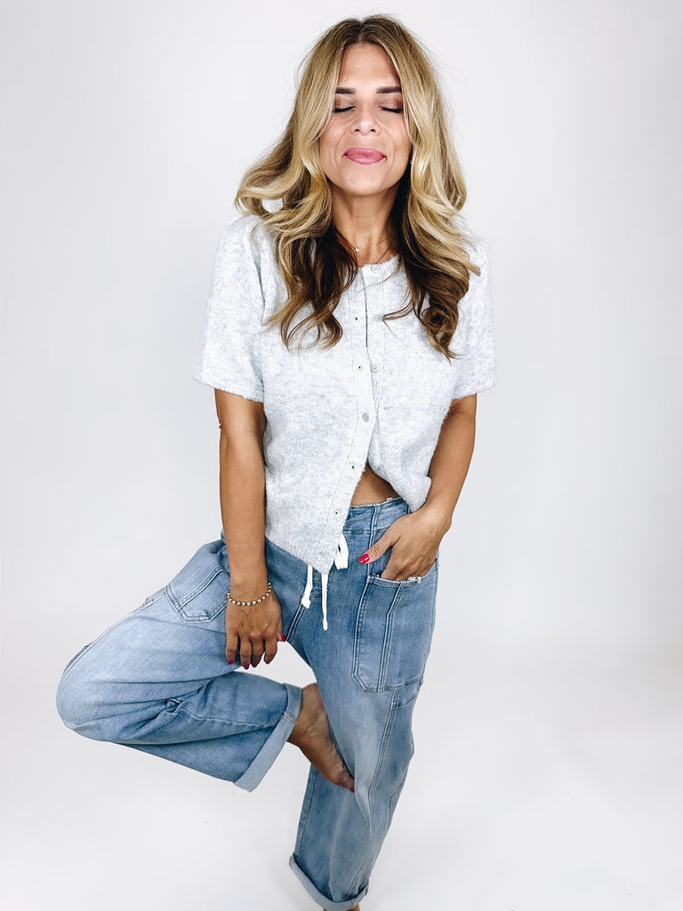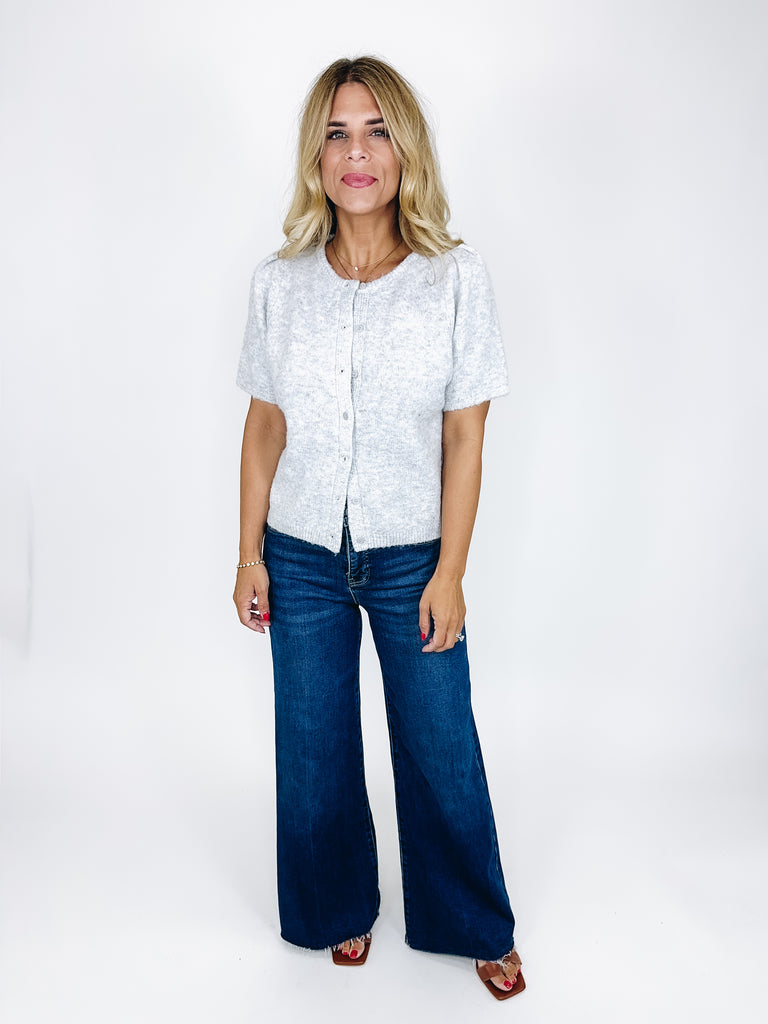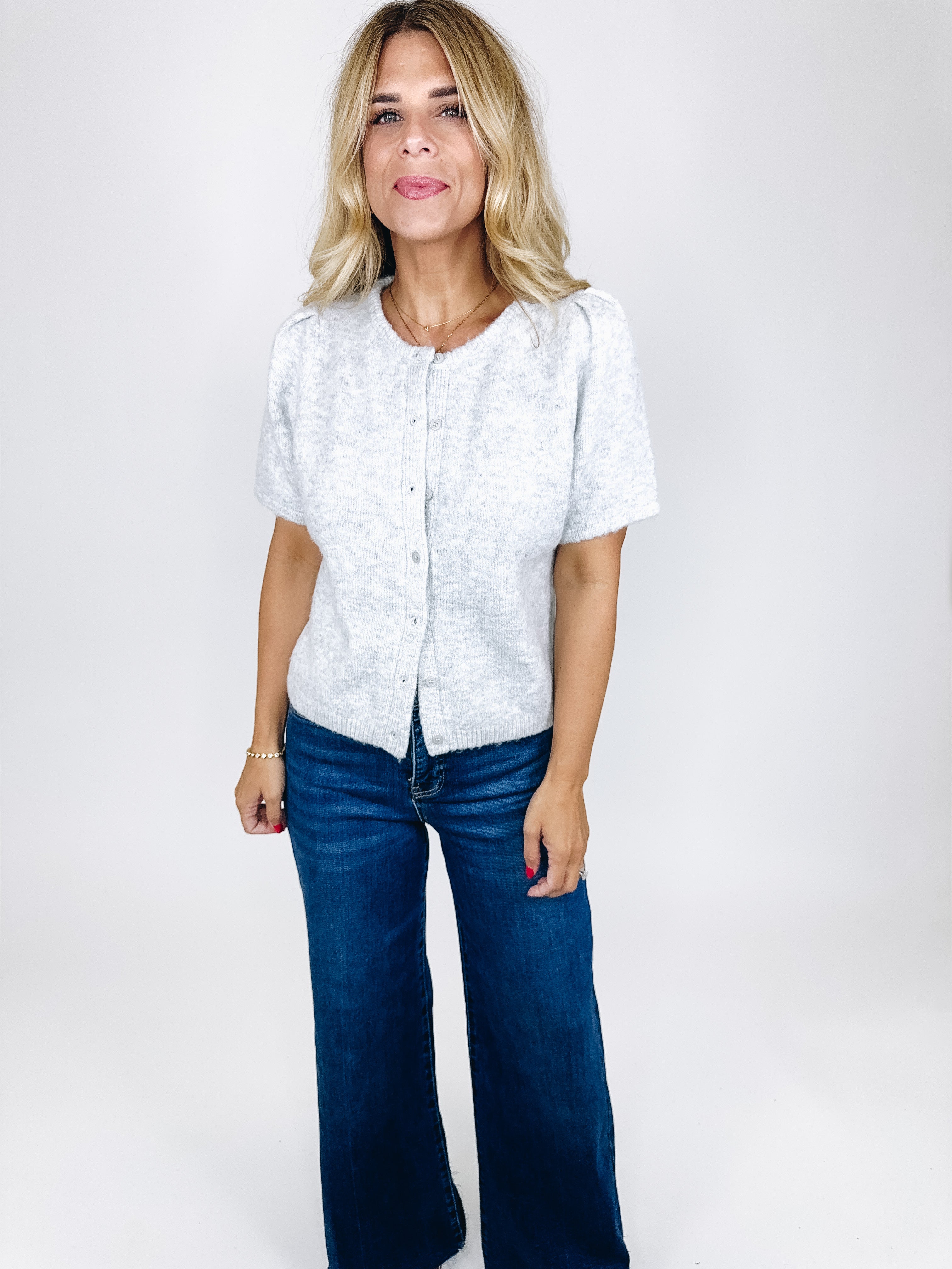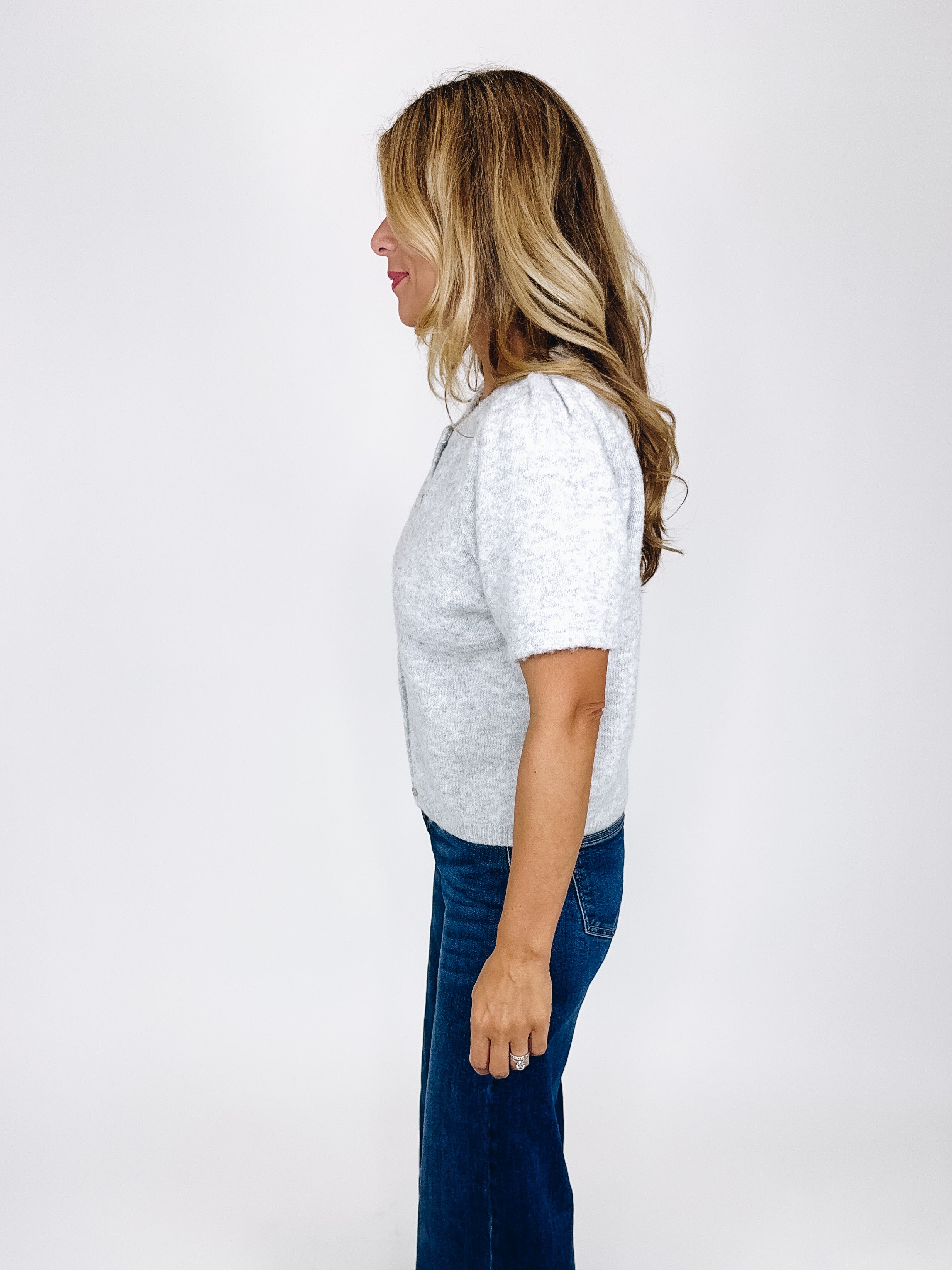 The Fitz cardigan is such a sweet top! This heather grey knit cardigan features a crew neckline, button front, short puff sleeves and a skimmer length. Pairs well with everything from denim, flats, heels, dress pants, skirts and more! Fits true to size.