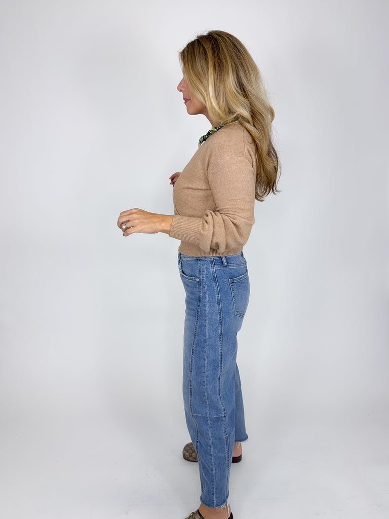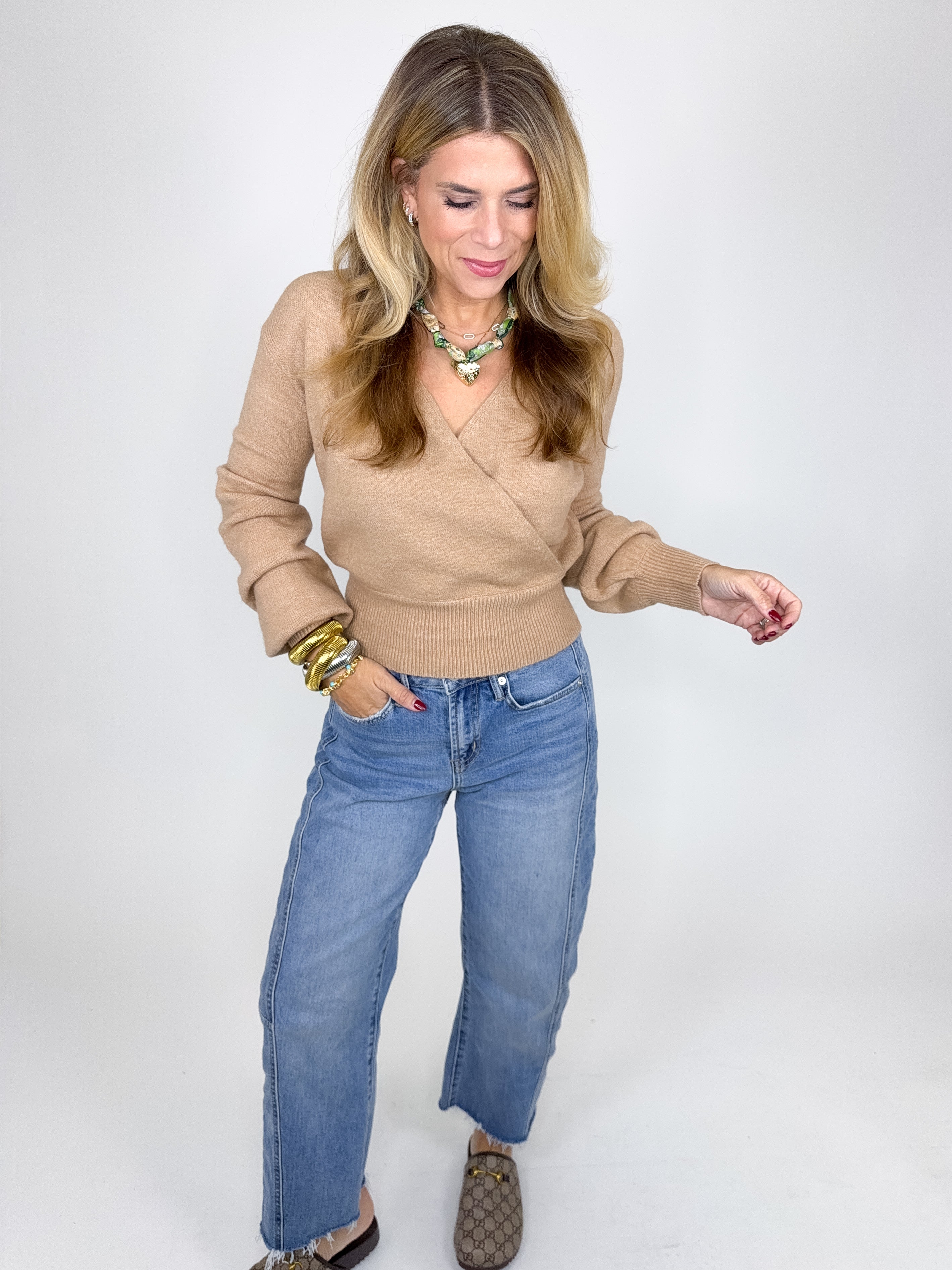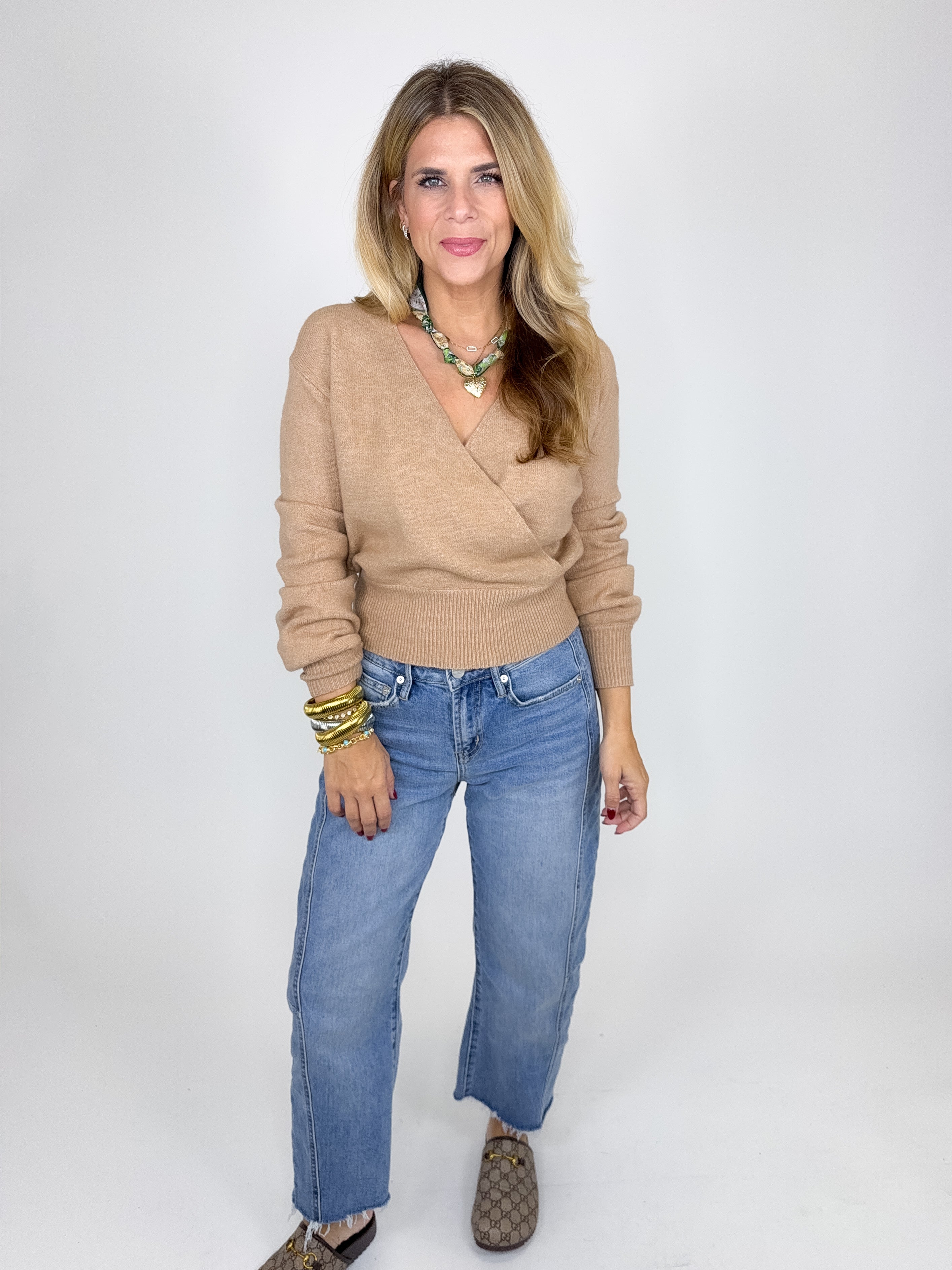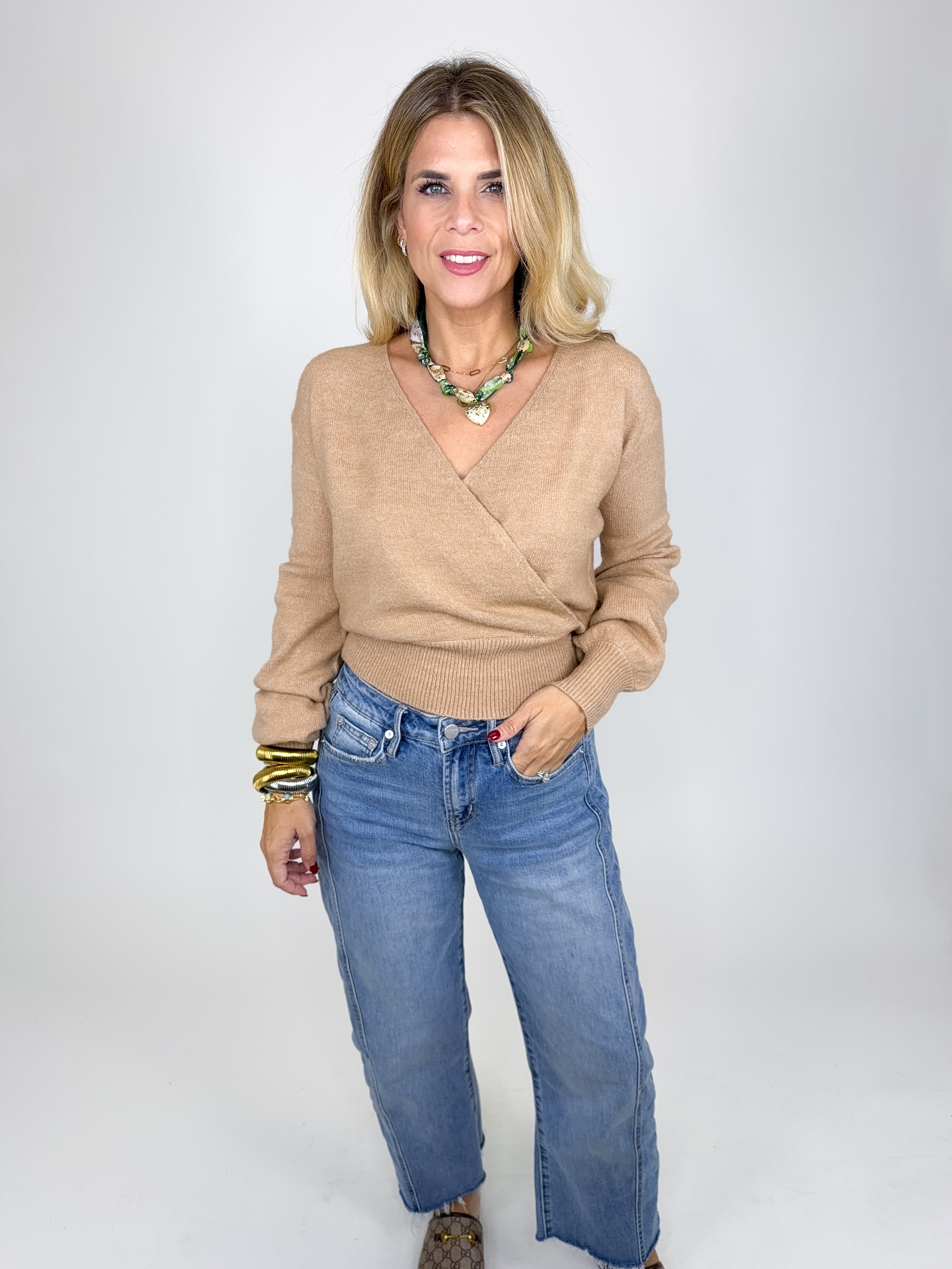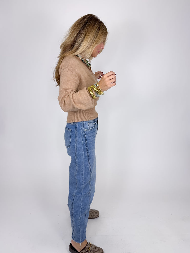 The Hannah Sweater is a beautiful camel colored knit sweater. This lightweight v-neck sweater features an overlapping front, long sleeves with a ribbed cuff and ribbed banded hem! Style it with denim, skirts and more! Dress it up or down. Fits true to size.