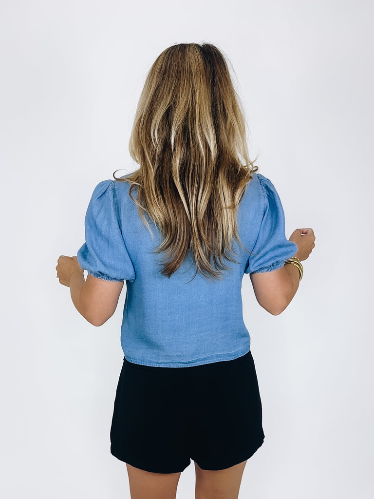 The Haven Top is the perfect everyday top. This chambray top features a scoop neckline, button front with floral tonal embroidery, short sleeves with an elastic cuff, and a skimmer length. Pair with denim, shorts, flats and sneakers. Relaxed fit.