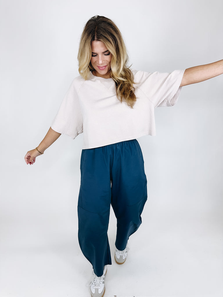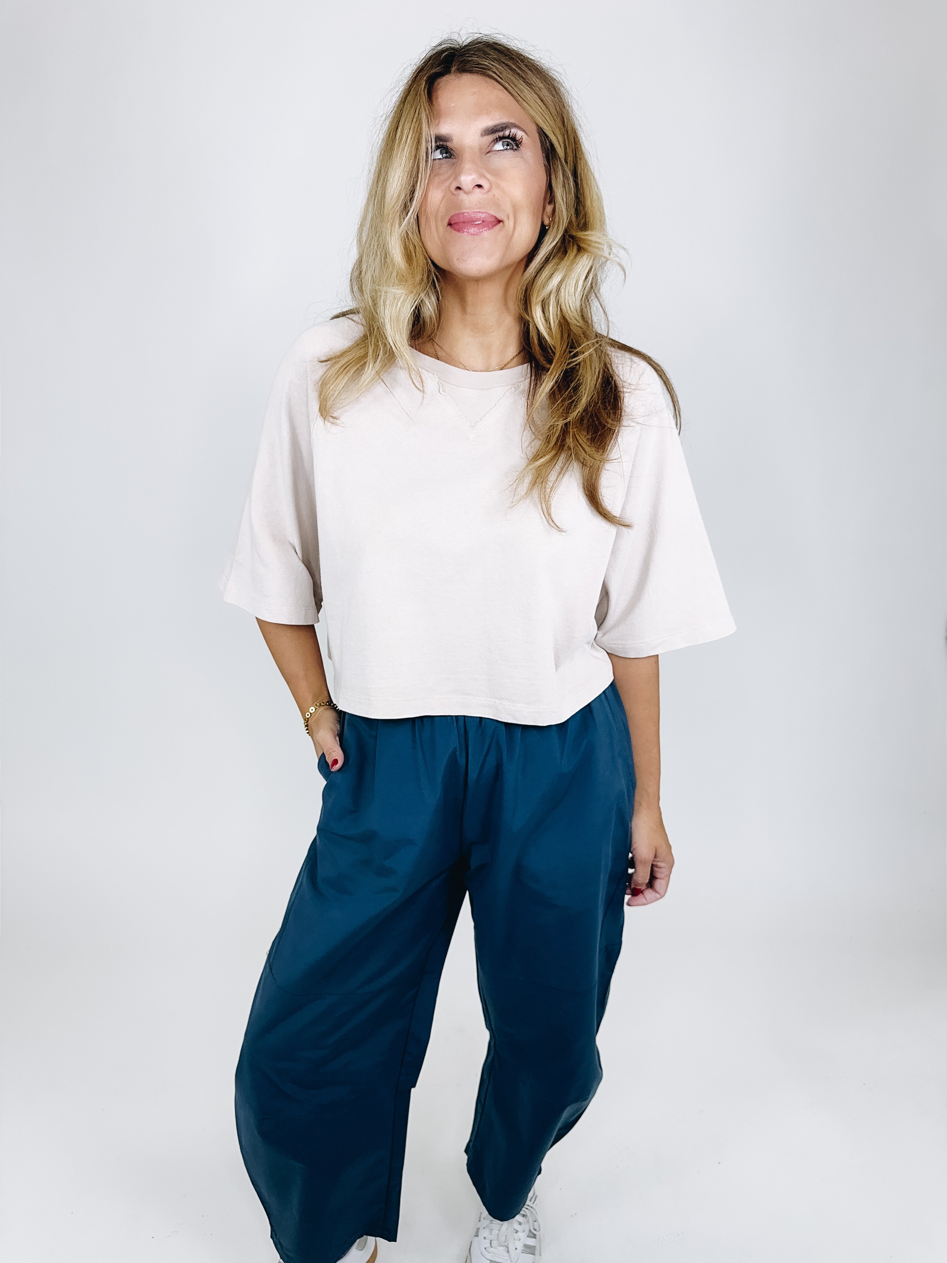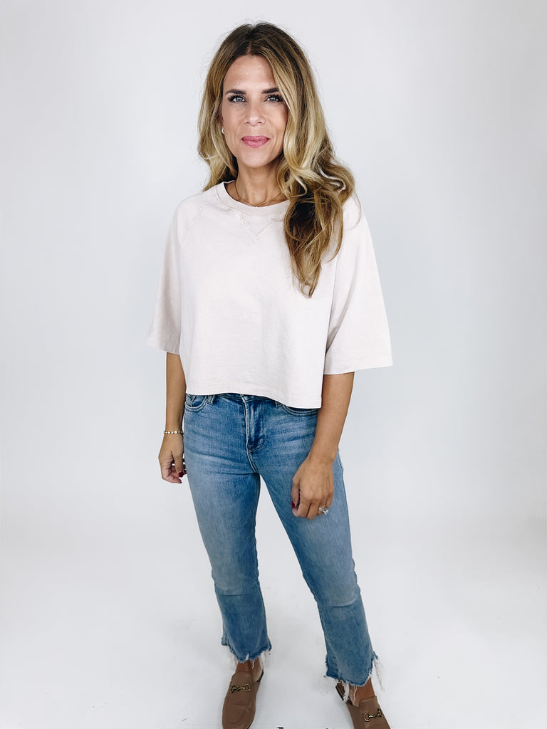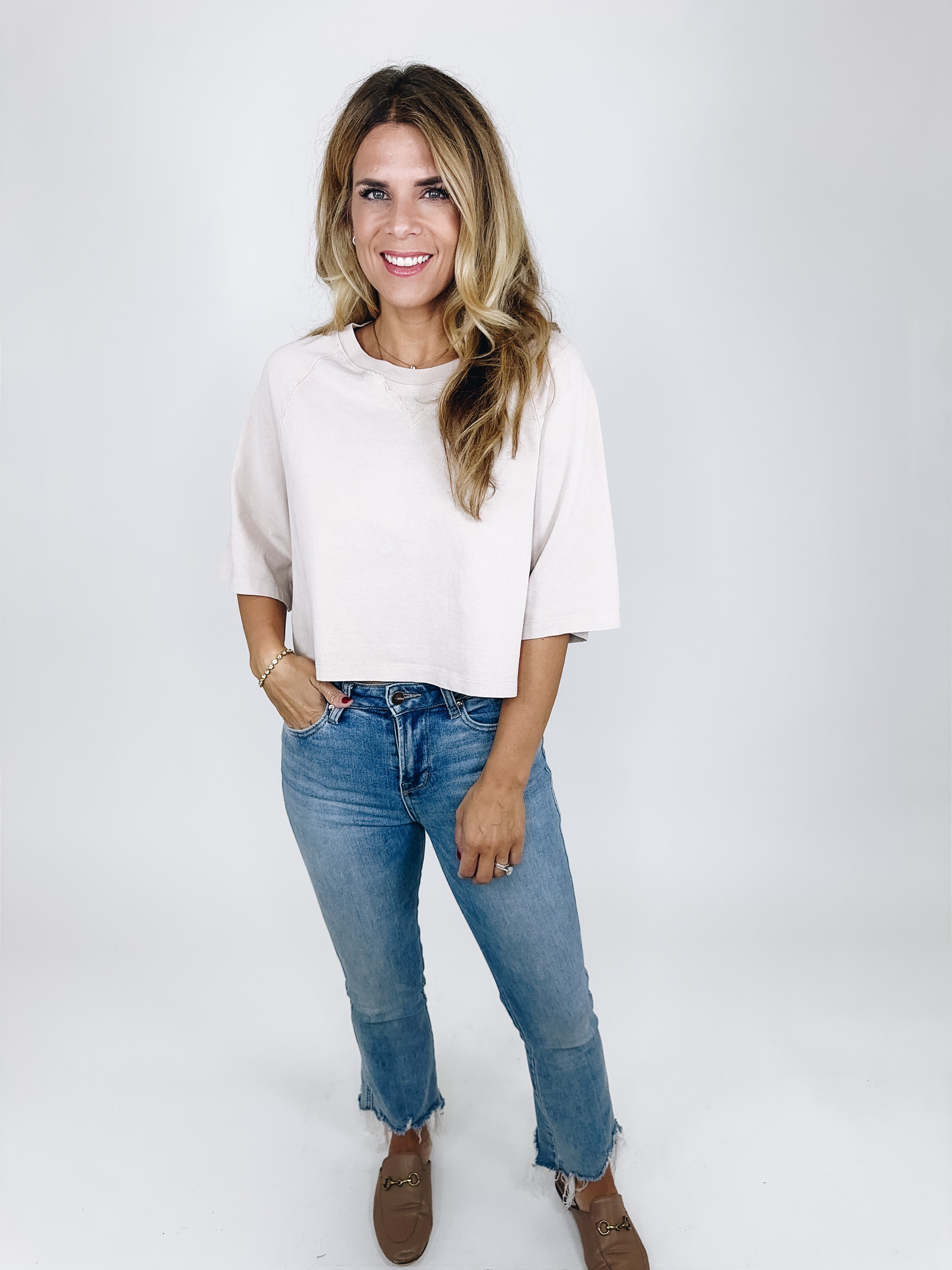 The Katie Tee in taupe is the perfect everyday top! This mineral washed tee features a crew neck, short sleeves and a boxy skimmer fit. A must have! Pairs well with everything from denim, flats, heels, skirts, leggings, sweatpants and more! Fits true to size.