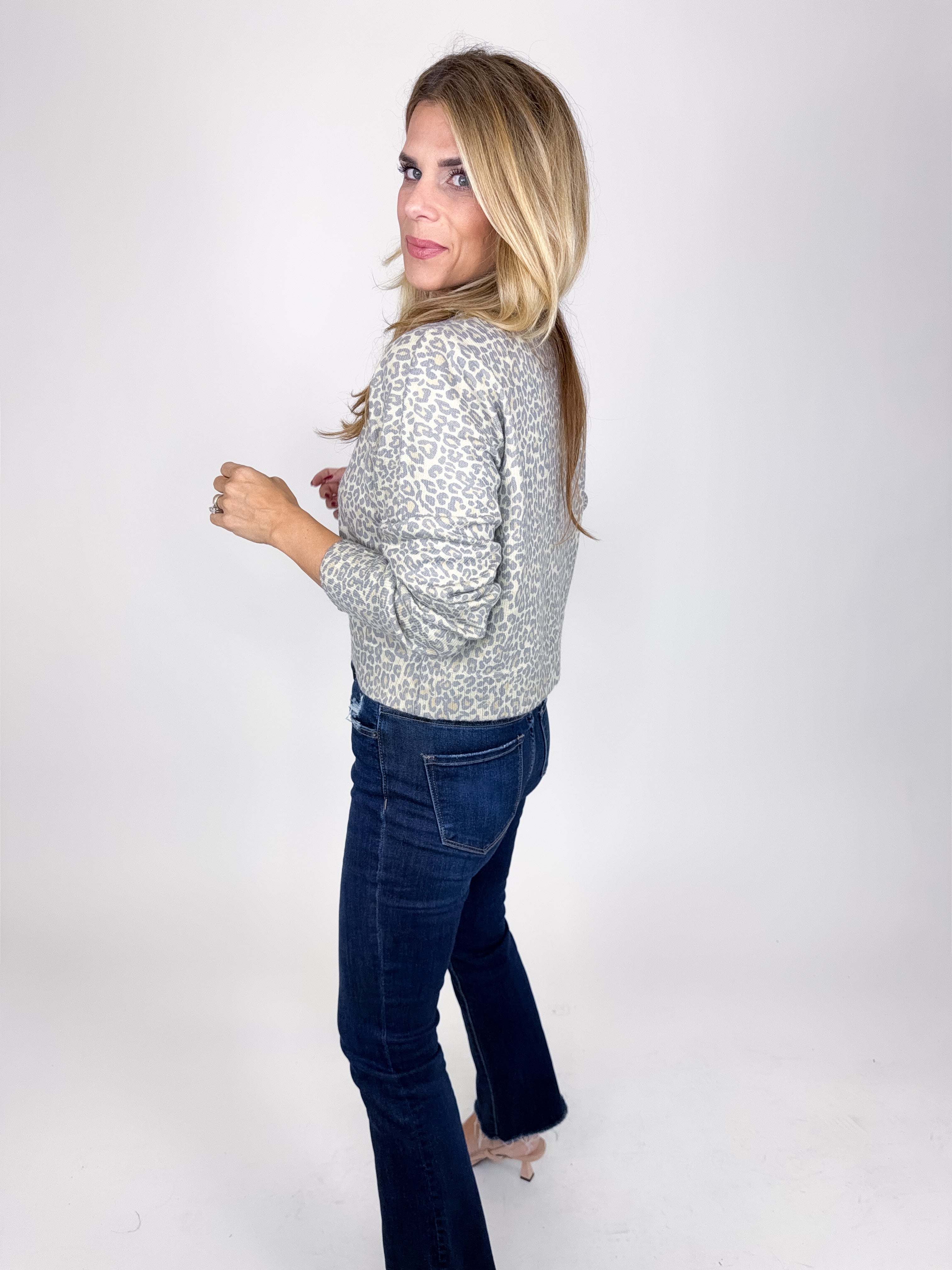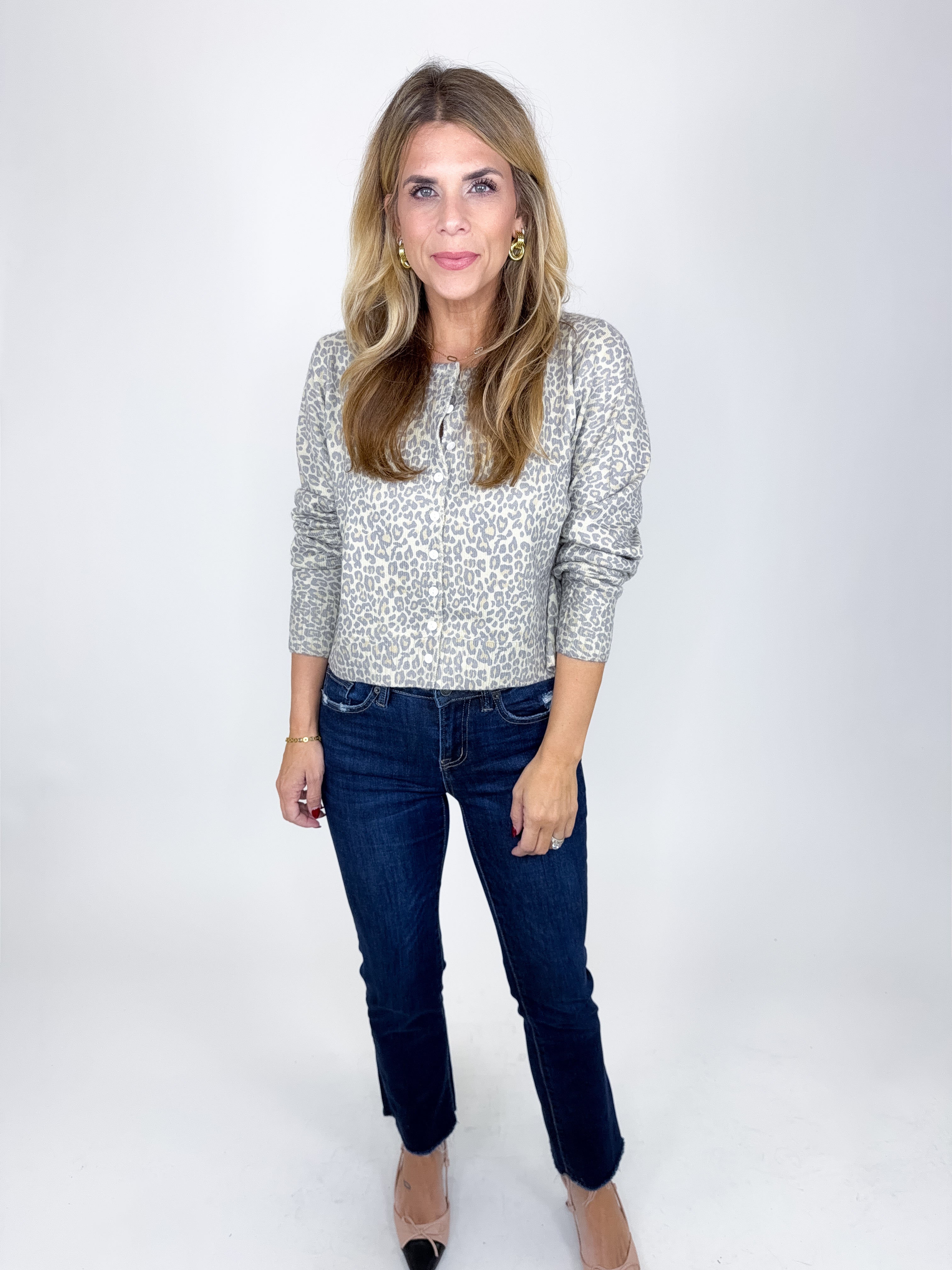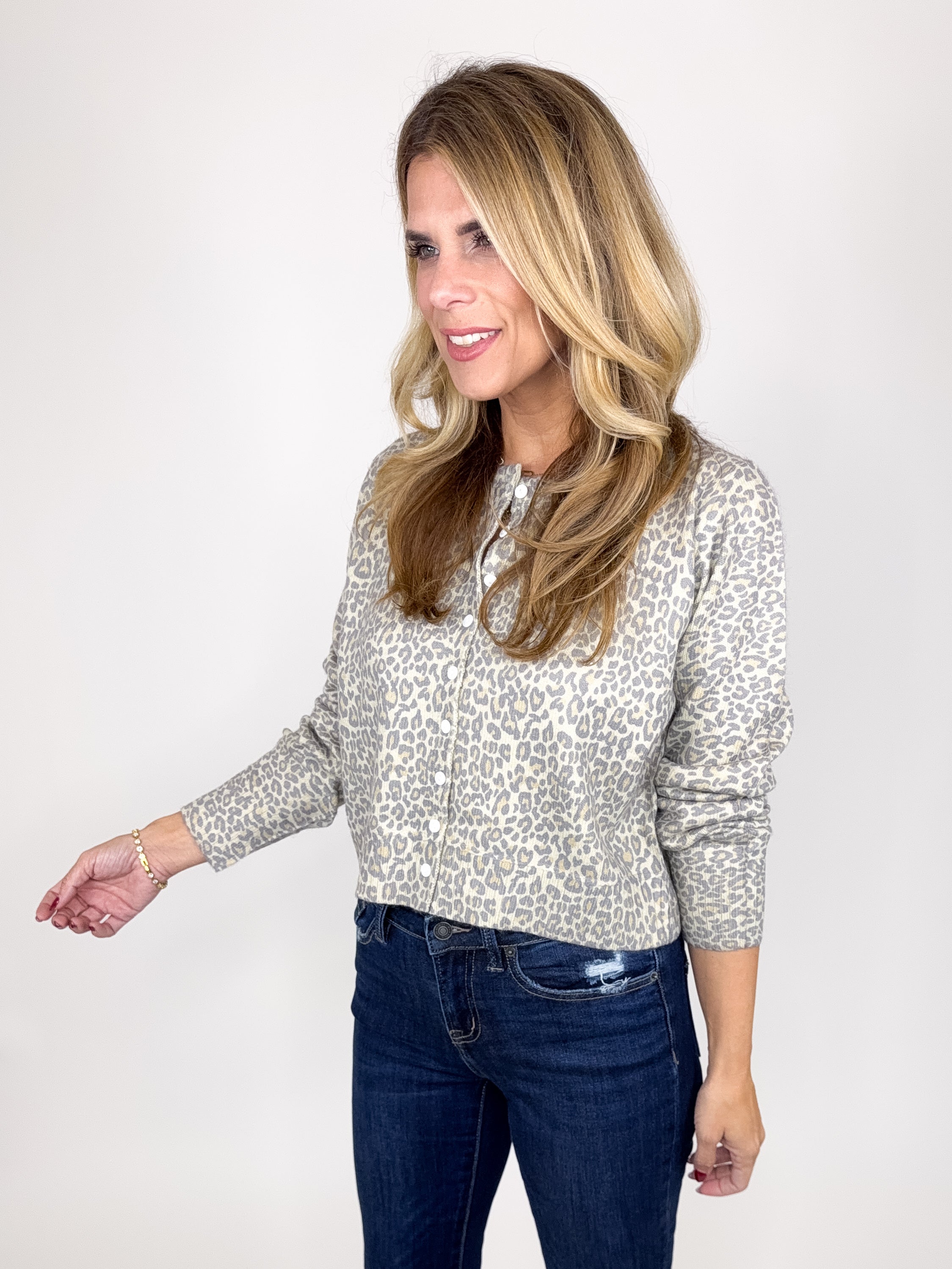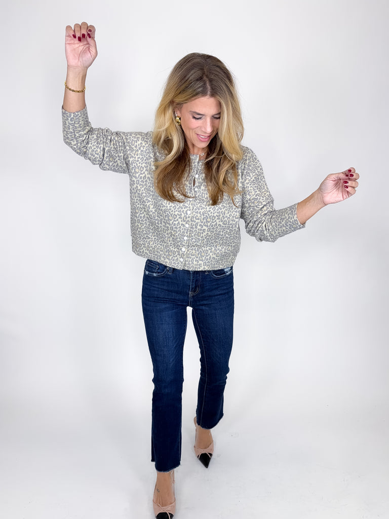 The Koda Cardigan is the perfect everyday top! This muted leopard print knit cardigan top features a crew neck, button front, long sleeves, fitted silhouette and a great length. This one feels so luxe! Pairs well with everything from denim, flats, heels, skirts and more! Offers some stretch. Fits true to size, if in between sizes, size up.