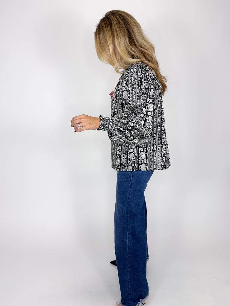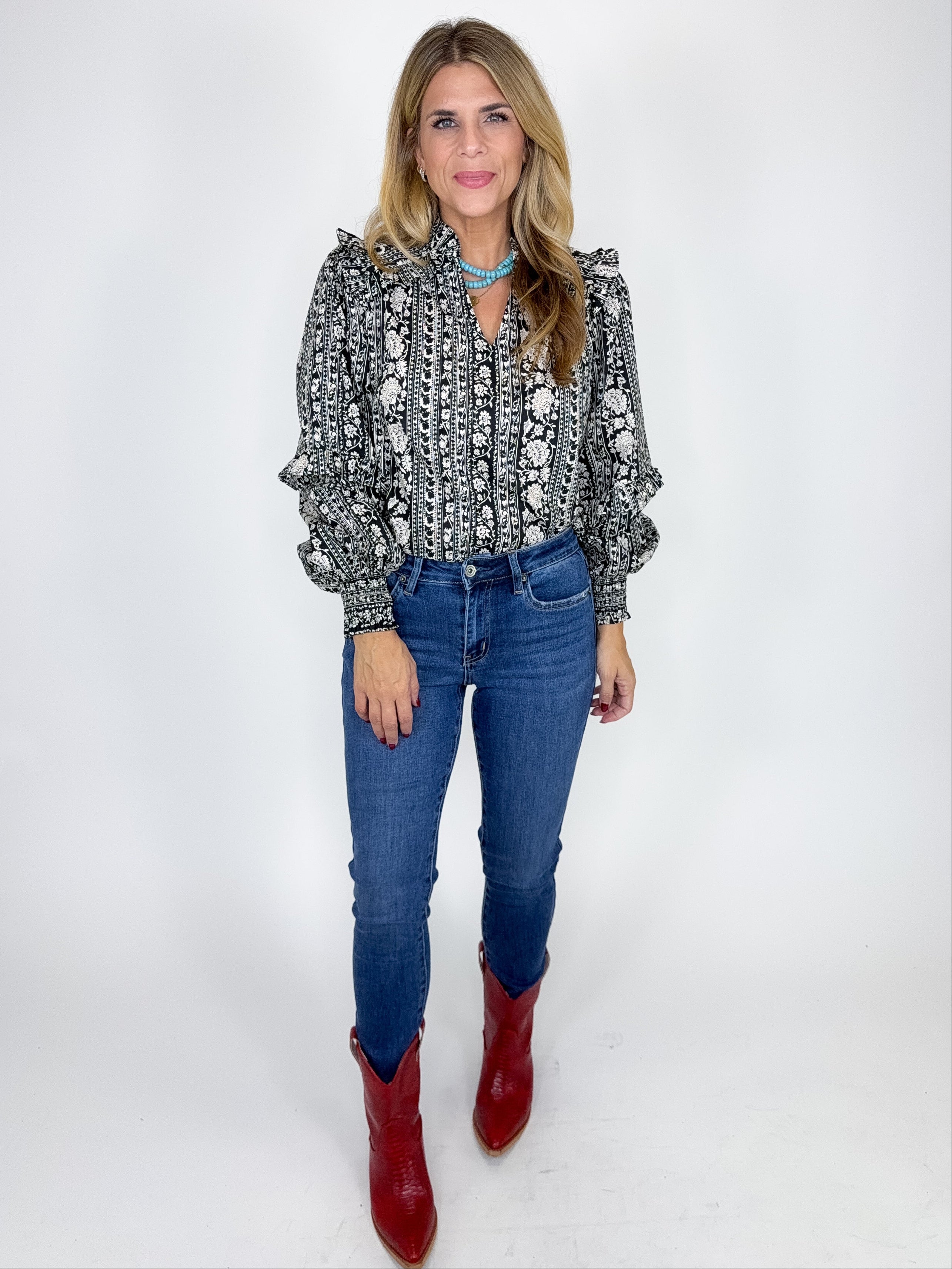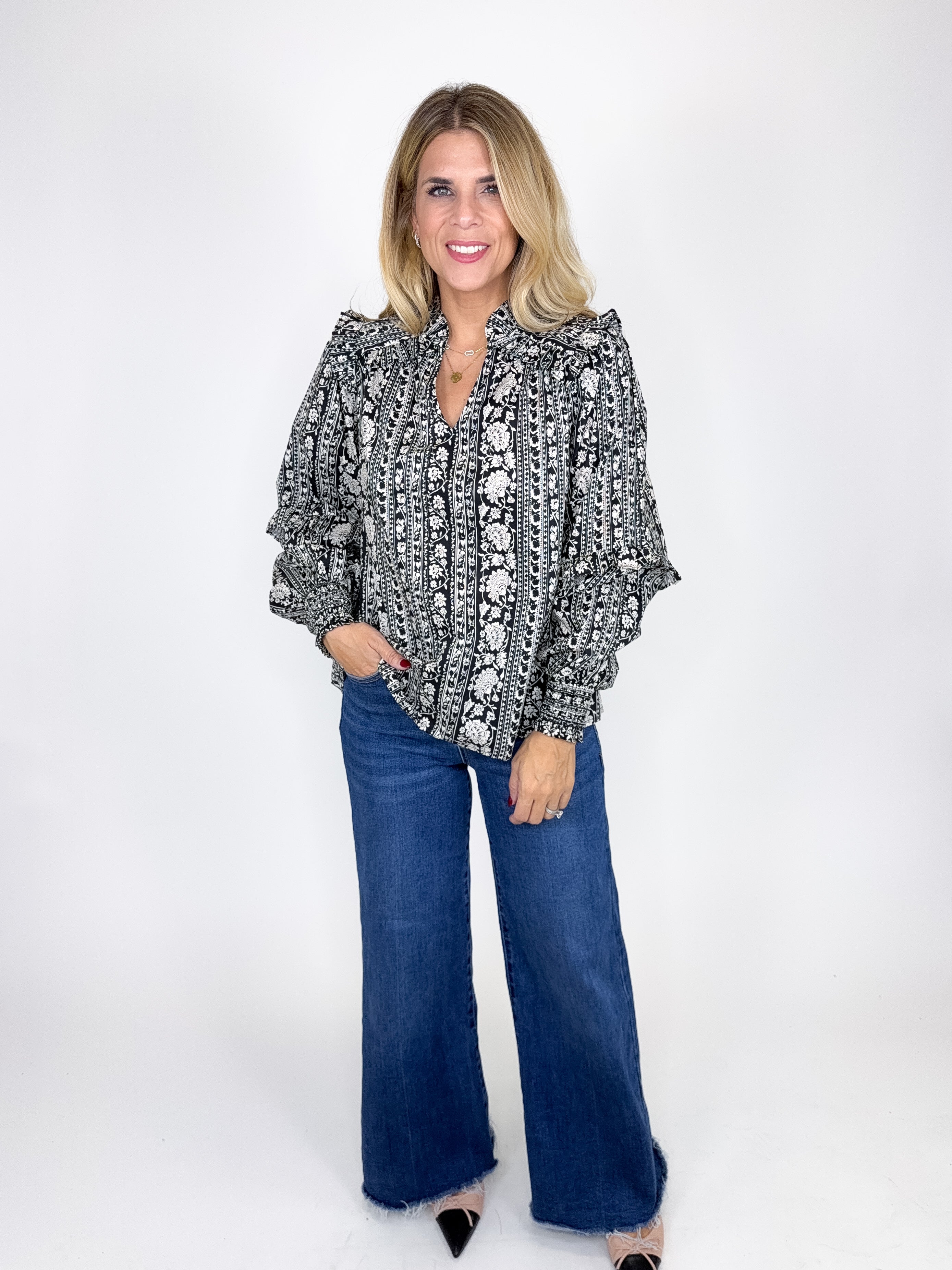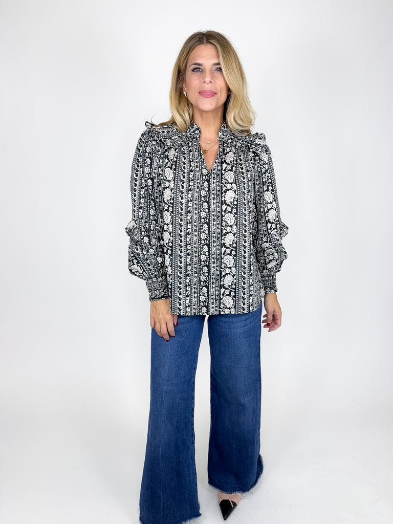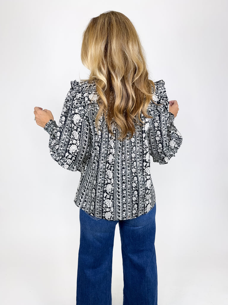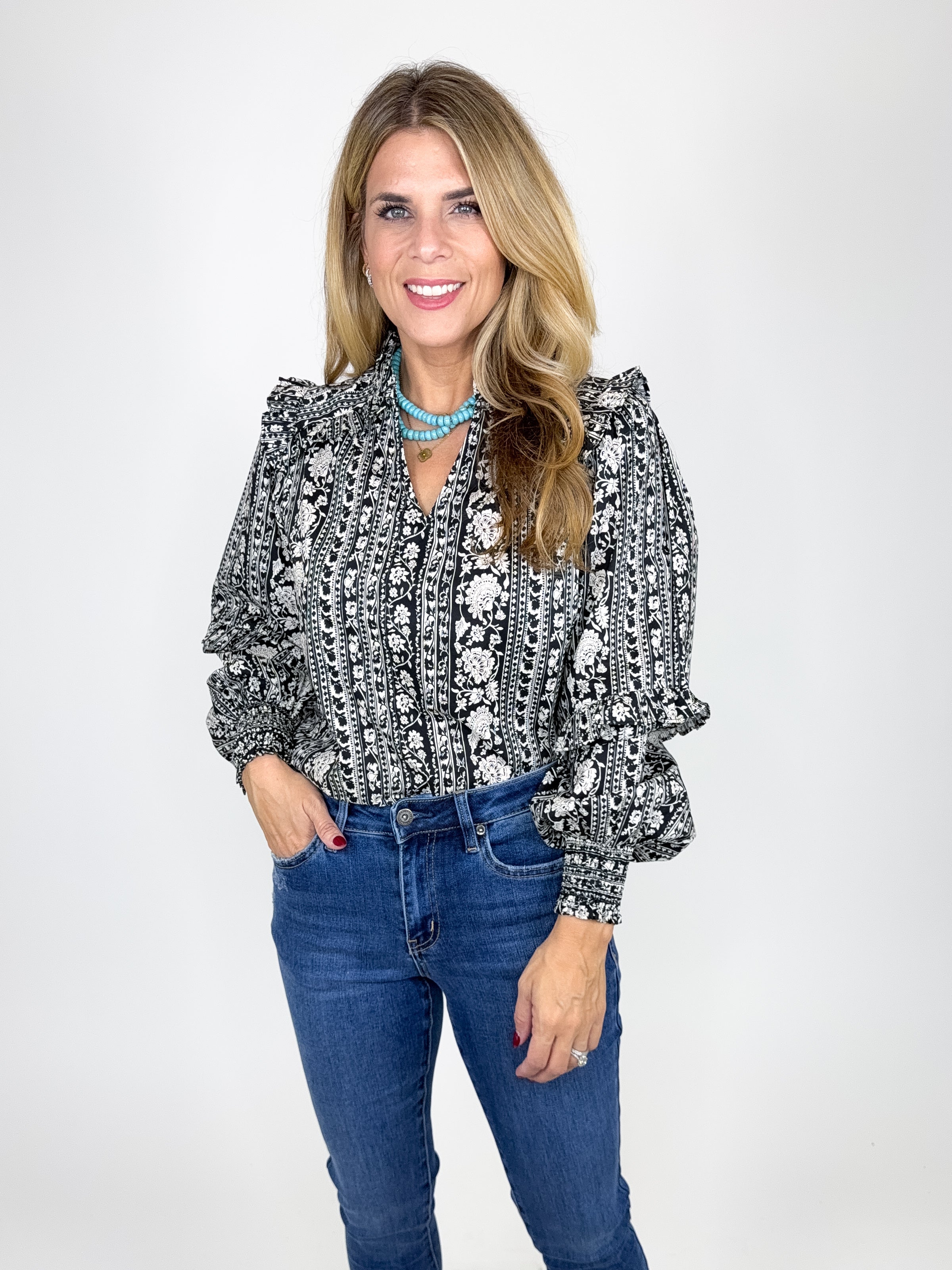 The Marcie Top is a must! This black and cream floral stripe print blouse features a v-neck, ruffle details on the shoulder and back, long sleeves and great length. Pairs well with everything from denim, flats, heels, dress pants and more! Fits true.