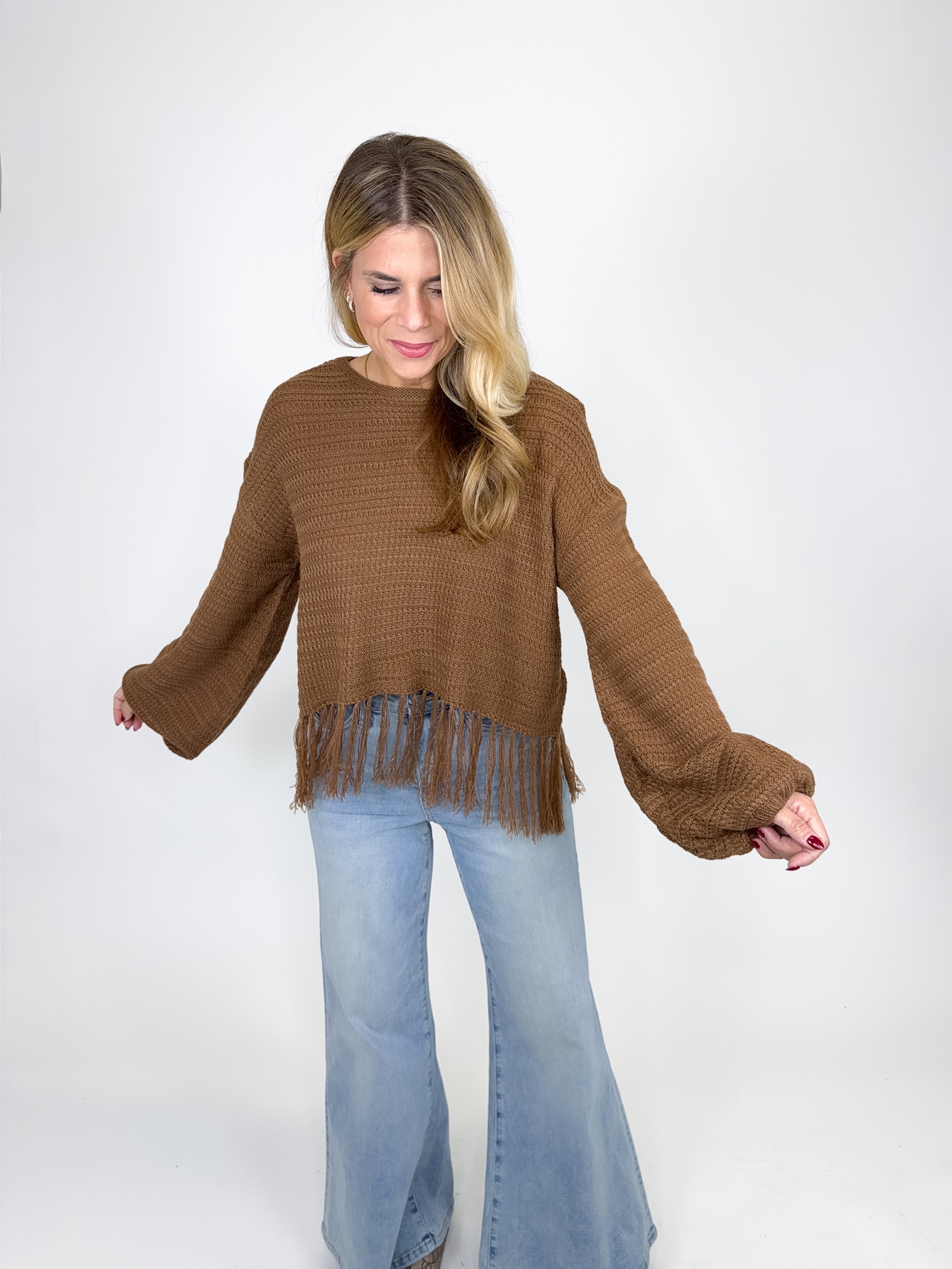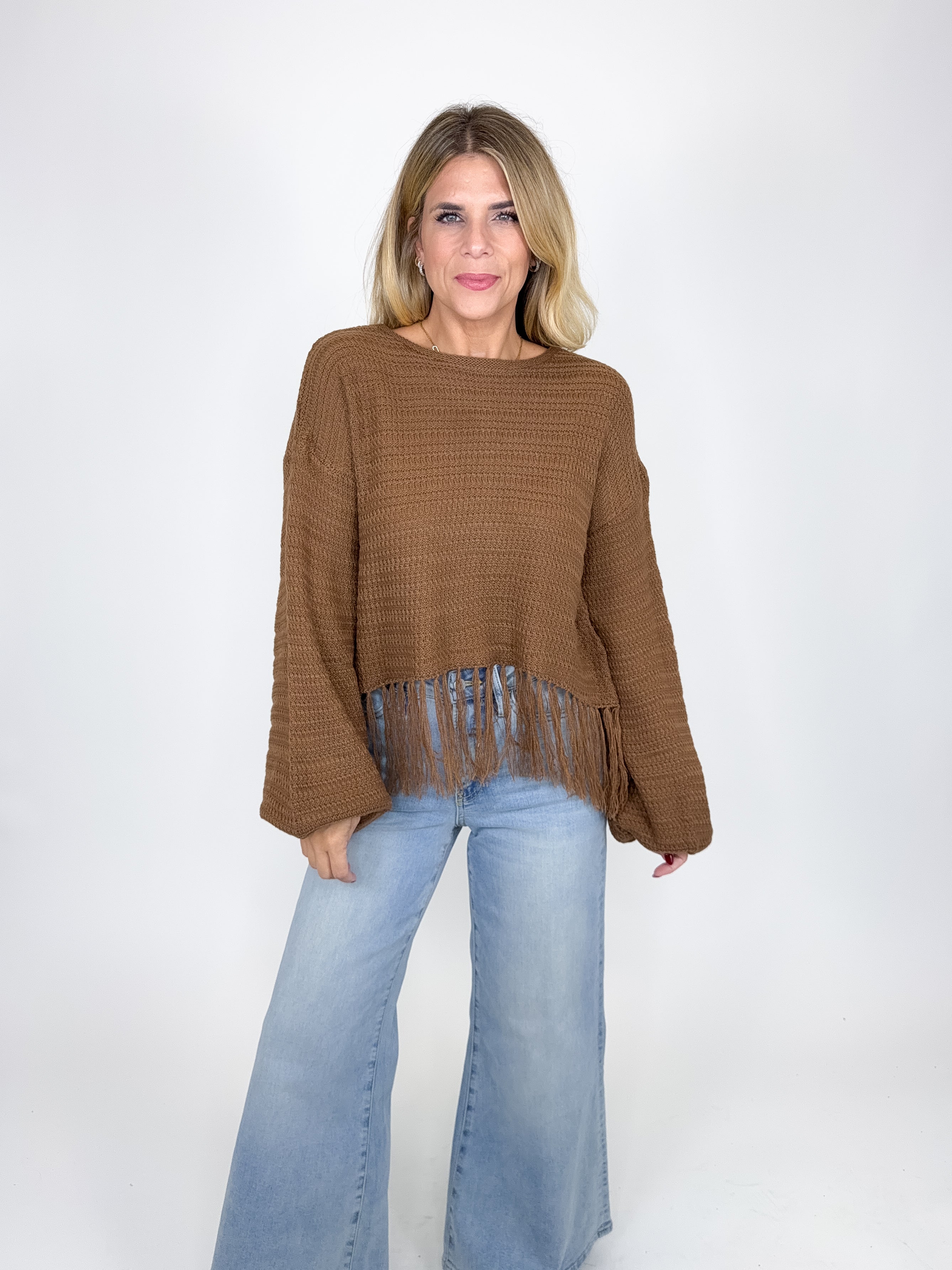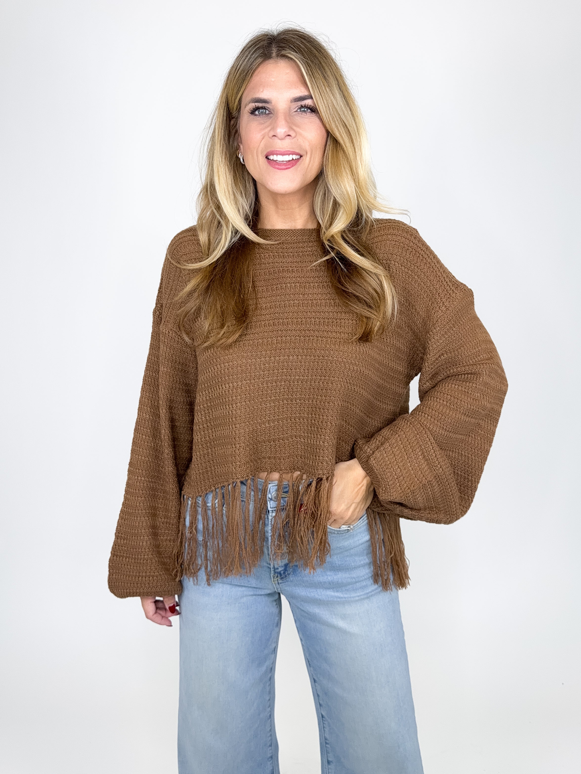 The Micah sweater is such a fun top! This brown knit top features a round neckline, long ballon sleeves and a cropped fringe hem. Pairs well with everything from denim, flats, heels, dress pants, skirts and more! Fits true to size.