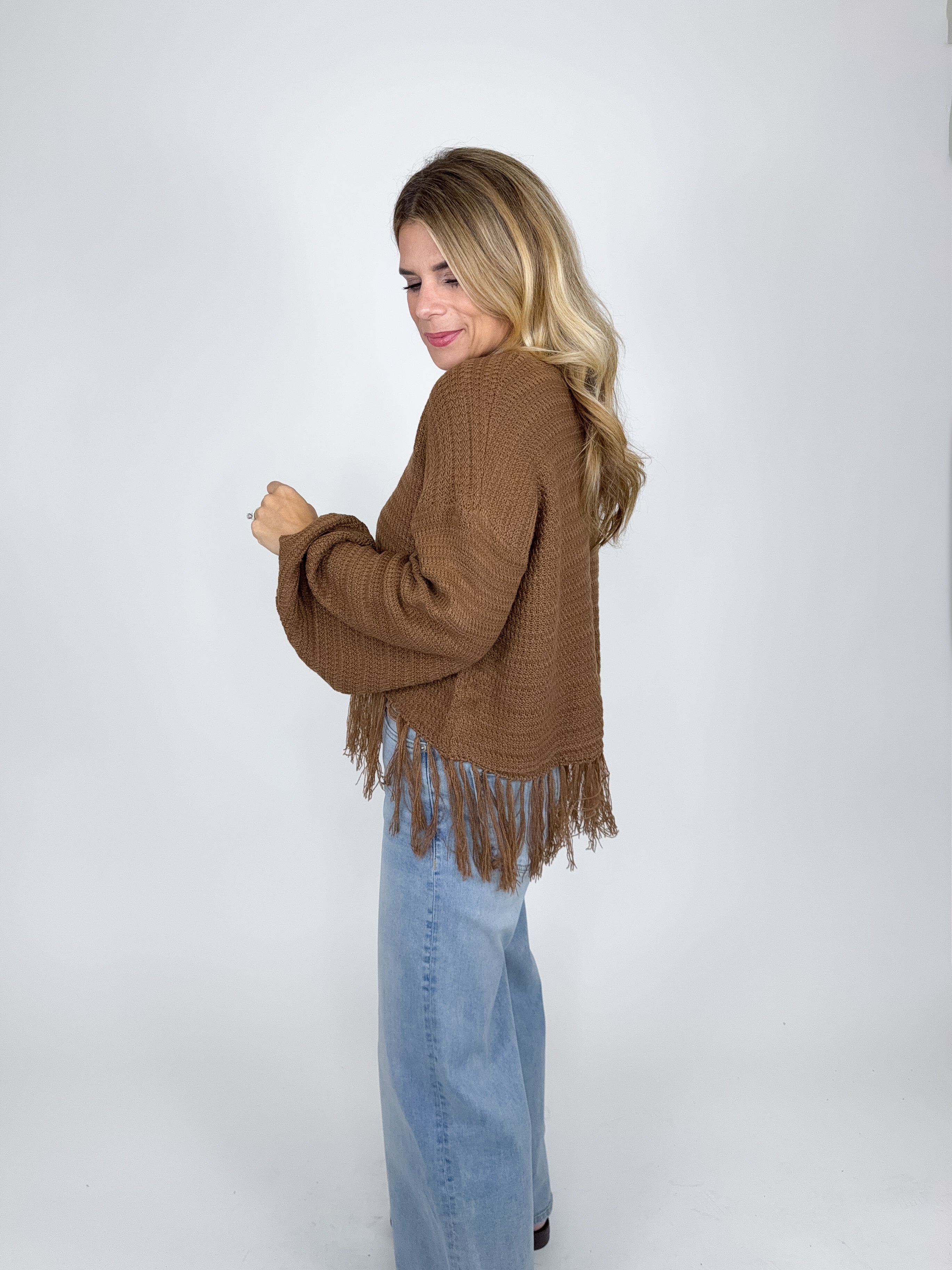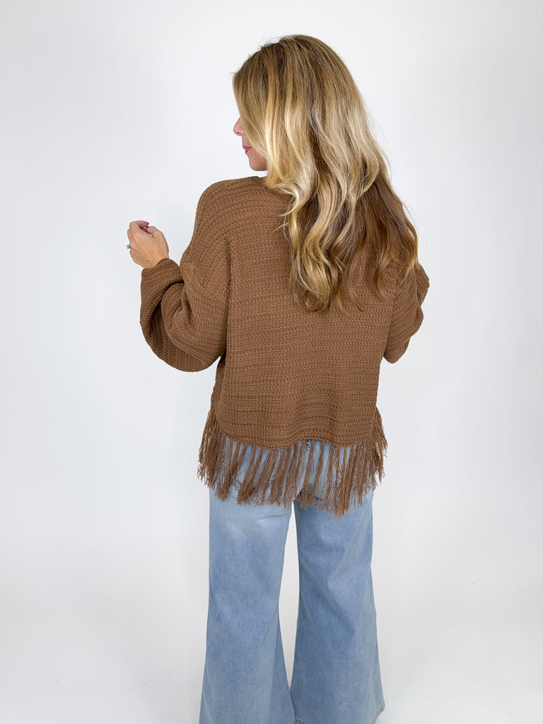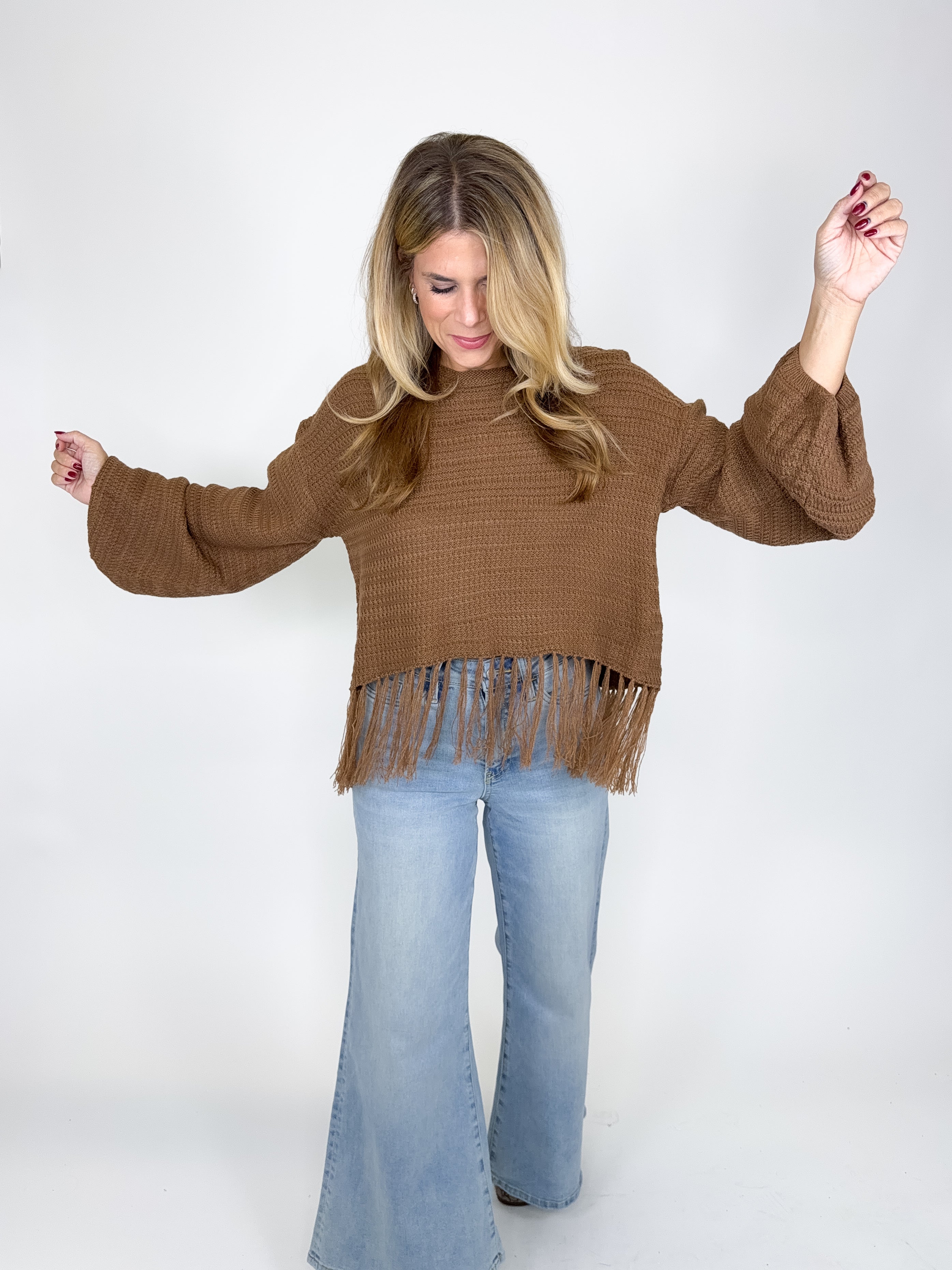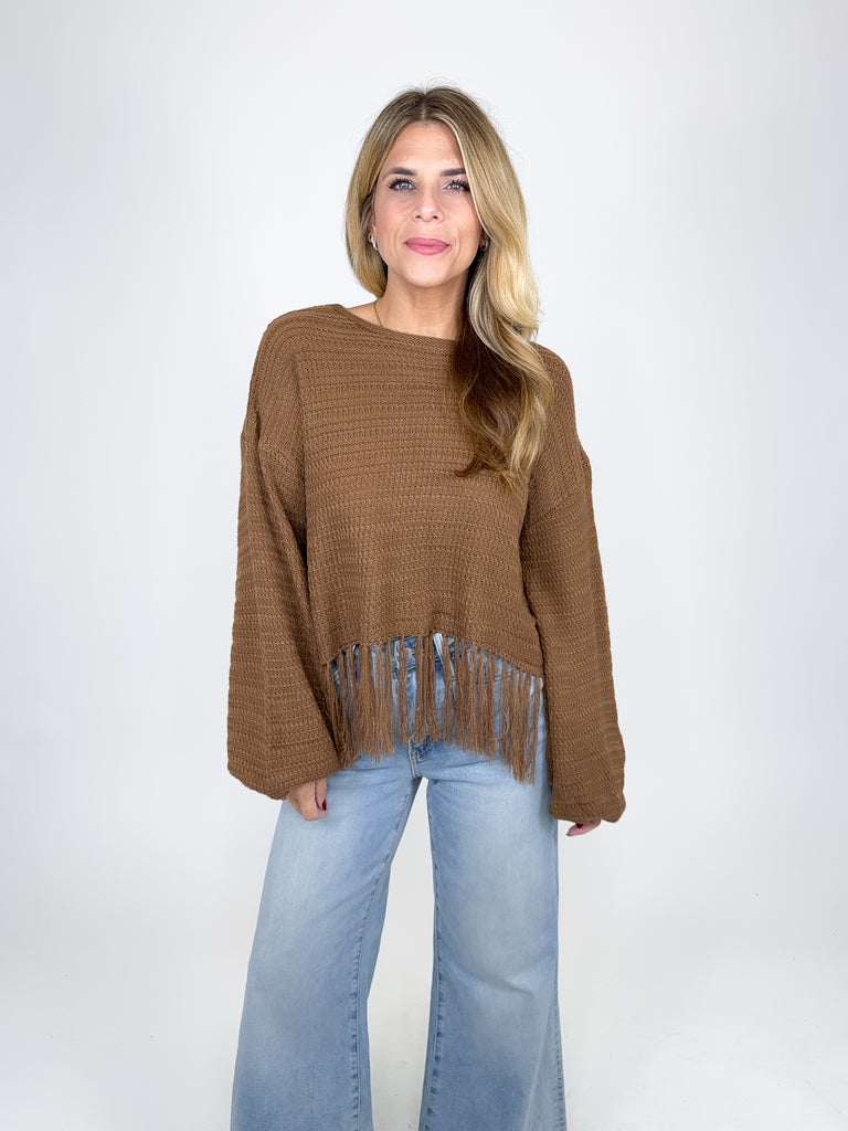 The Micah sweater is such a fun top! This brown knit top features a round neckline, long ballon sleeves and a cropped fringe hem. Pairs well with everything from denim, flats, heels, dress pants, skirts and more! Fits true to size.