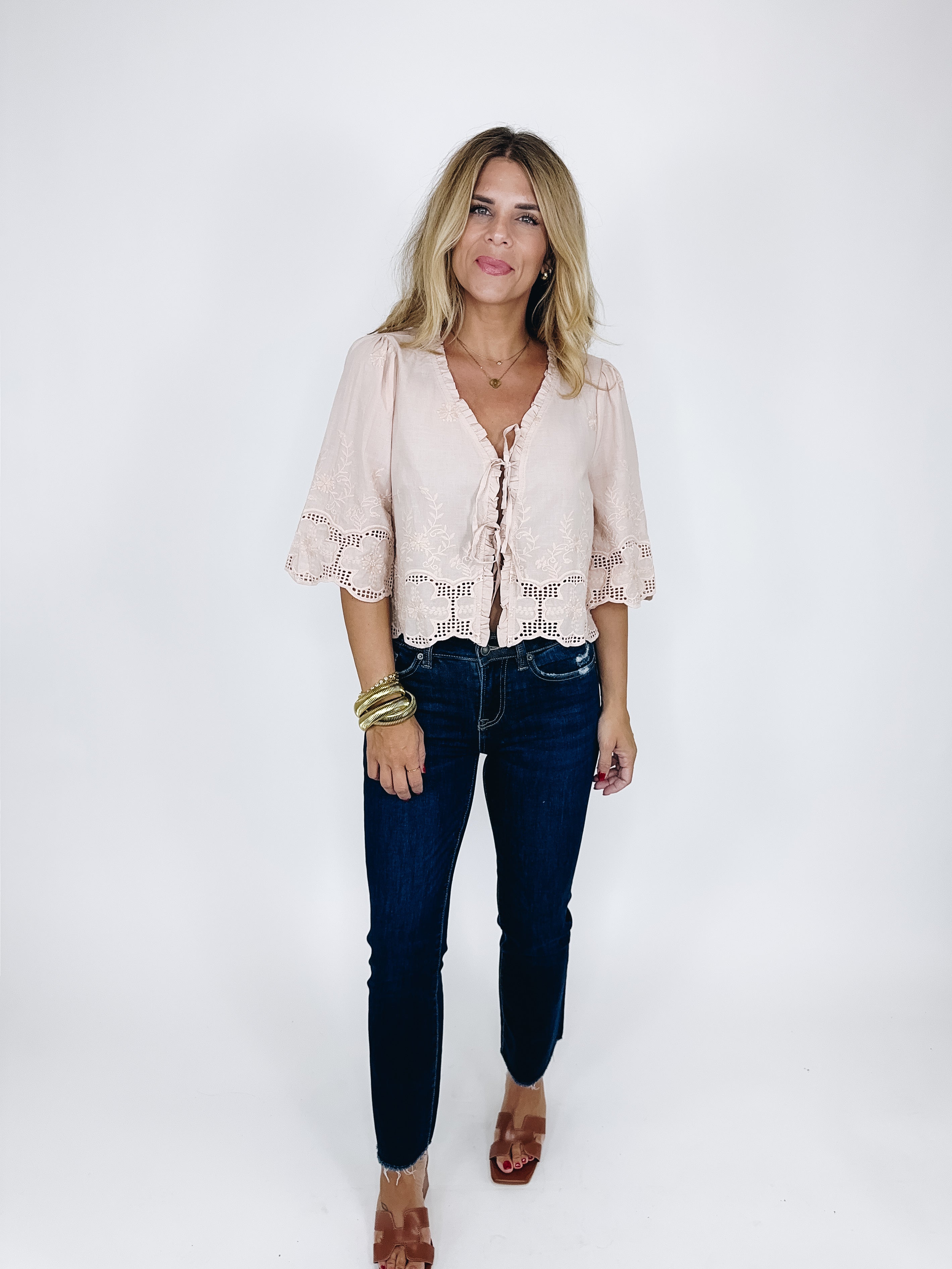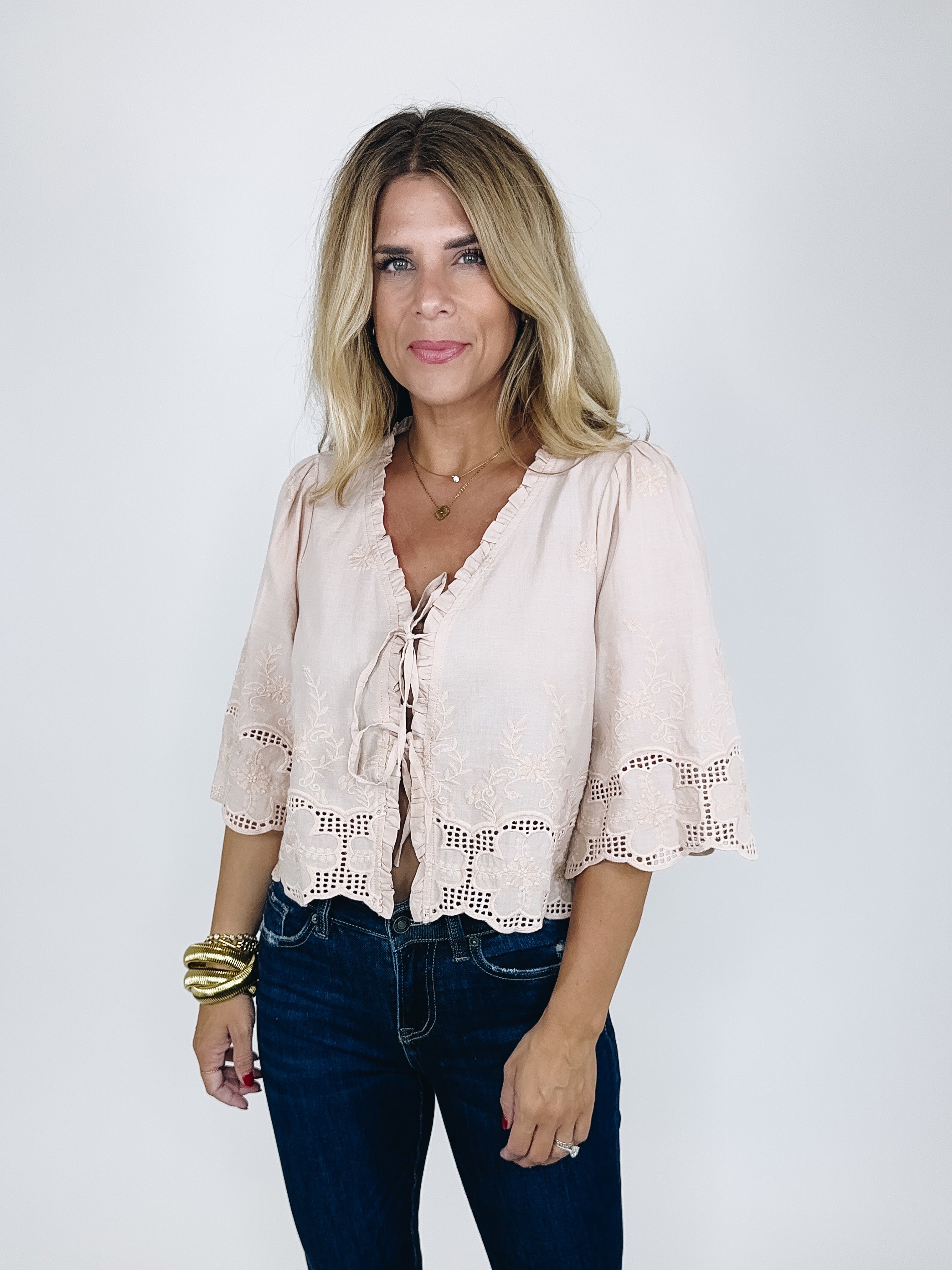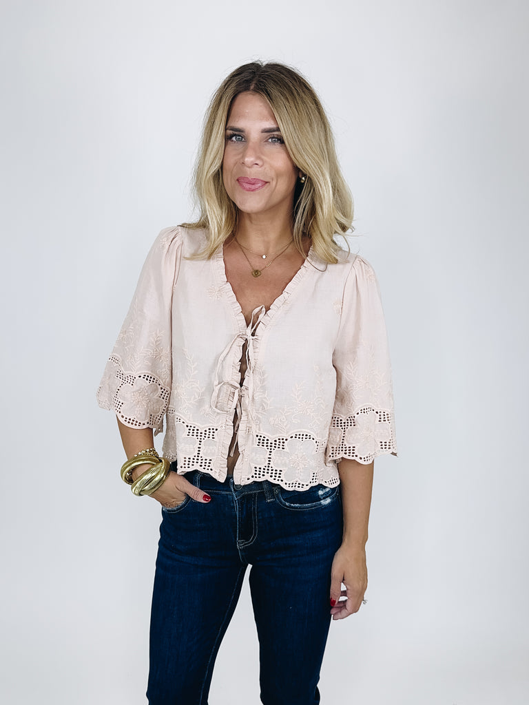 The Oakley Top is such a fun boho top! This beautiful beige colored blouse features tonal embroidery, bow front ties, 3/4 length sleeves and a scalloped hem. Pairs well with everything from denim, flats, heels, dress pants, skirts and more! Fits true to size.
