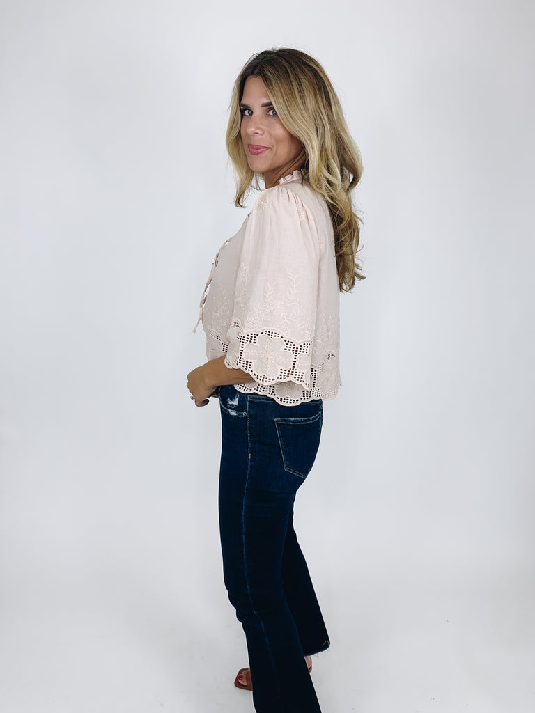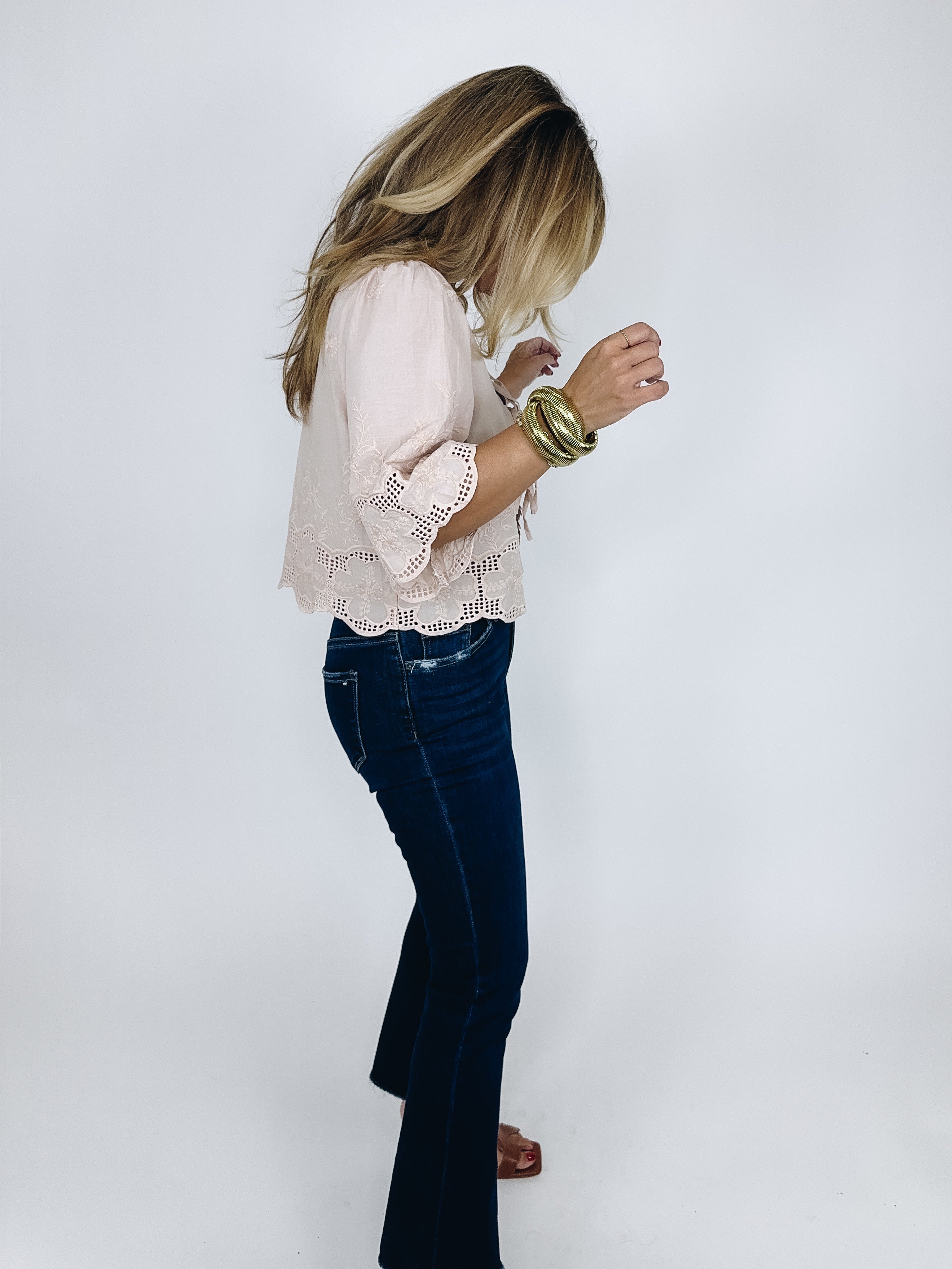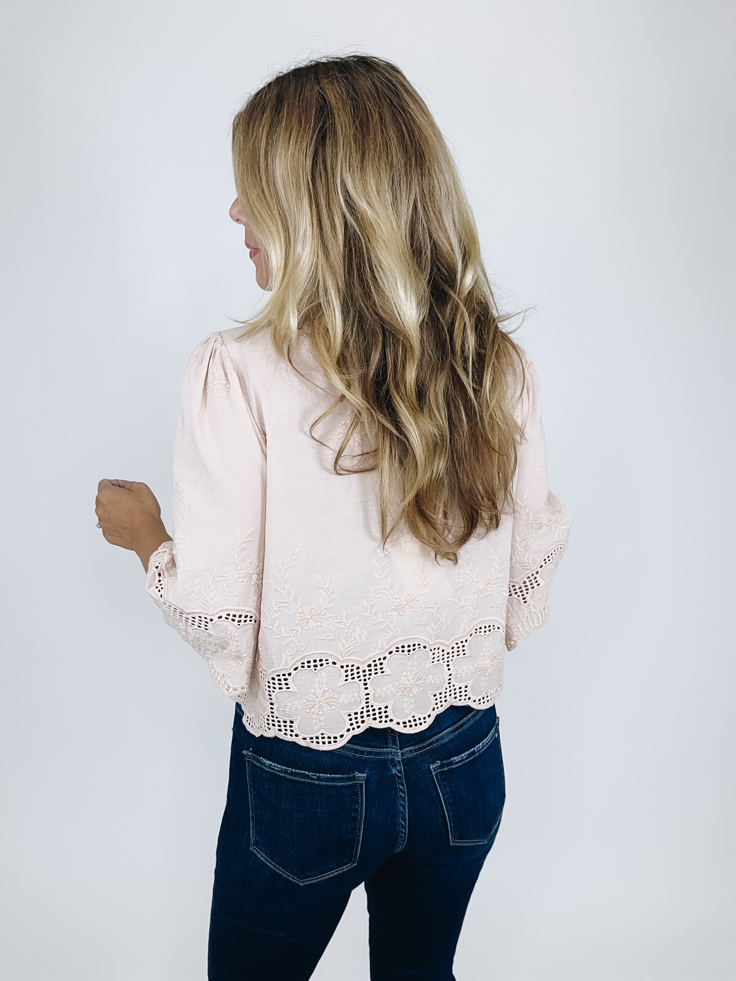 The Oakley Top is such a fun boho top! This beautiful beige colored blouse features tonal embroidery, bow front ties, 3/4 length sleeves and a scalloped hem. Pairs well with everything from denim, flats, heels, dress pants, skirts and more! Fits true to size.