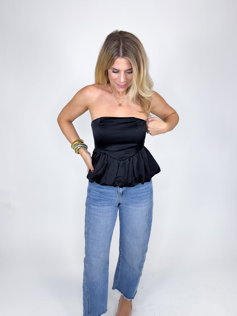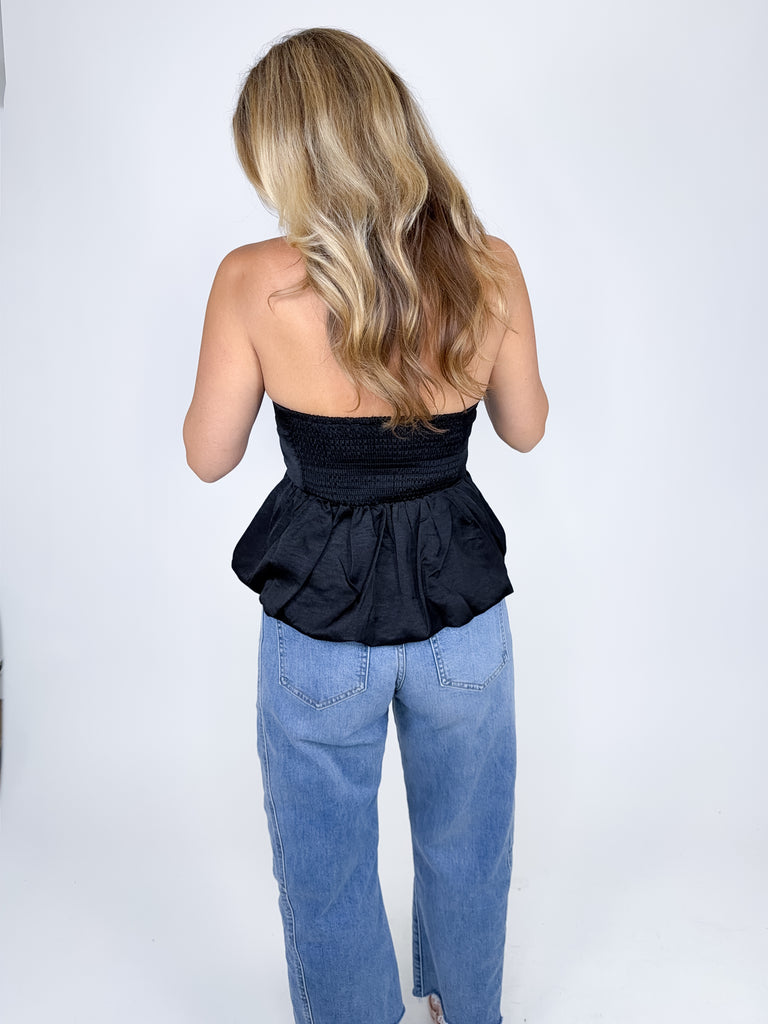 The Sloane Top is the perfect black top! This blouse features a strapless silhouette, side zipper closure with a smocked back and a skimmer length with a peplum bubble hem. Pairs well with everything from denim, flats, heels, dress pants, skirts and more!  Fits true to size.