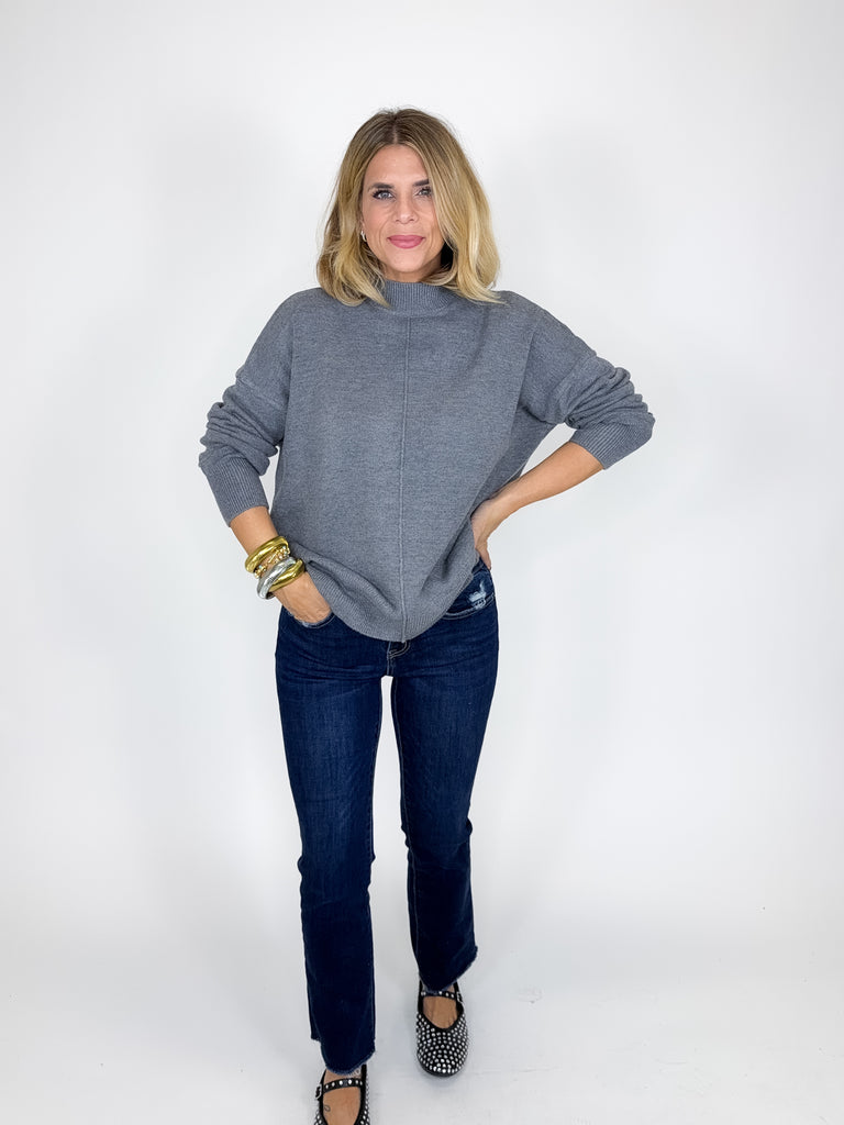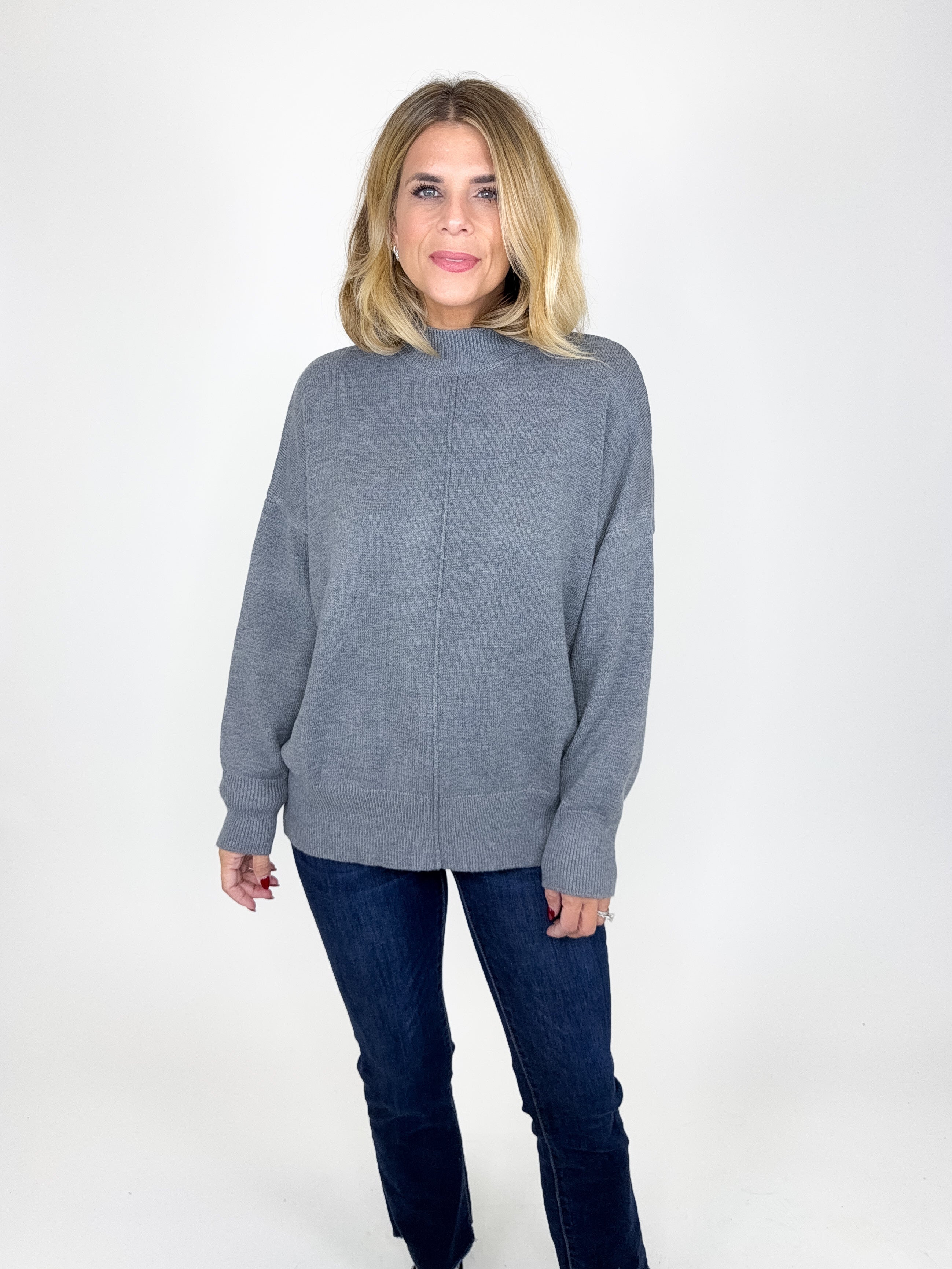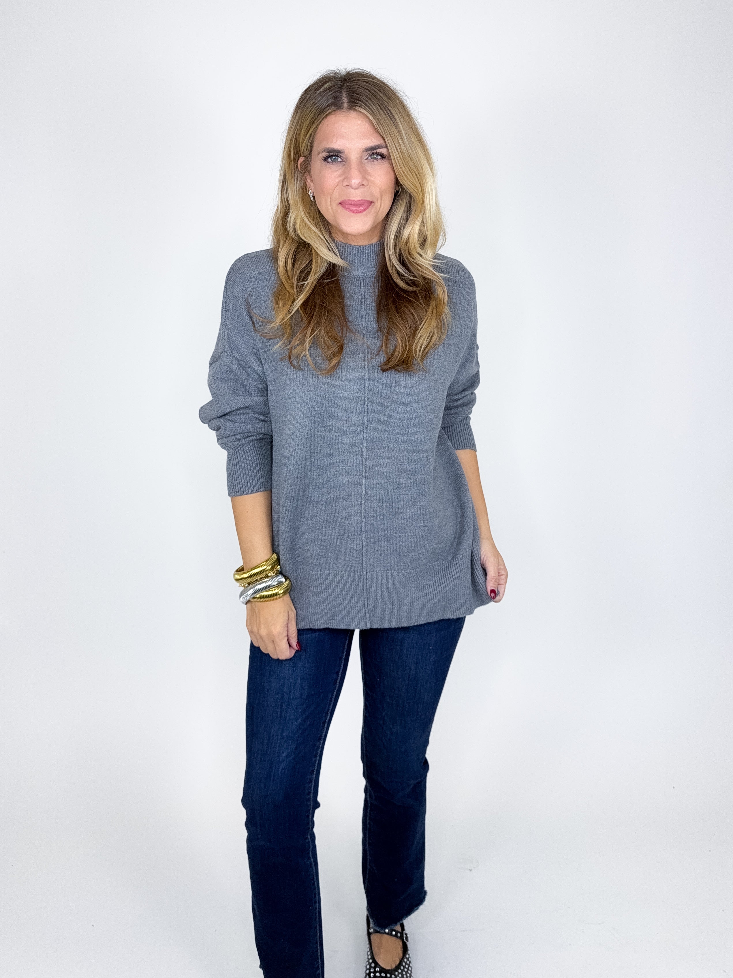 The Anderson Sweater is a perfect everyday sweater. This super soft heather grey knit sweater features a mock neck, drop shoulder, front seam down the center and a wide banded hem. Pair with denim, boots, flats, skirts, dress pants and sneakers. Fits true to size.