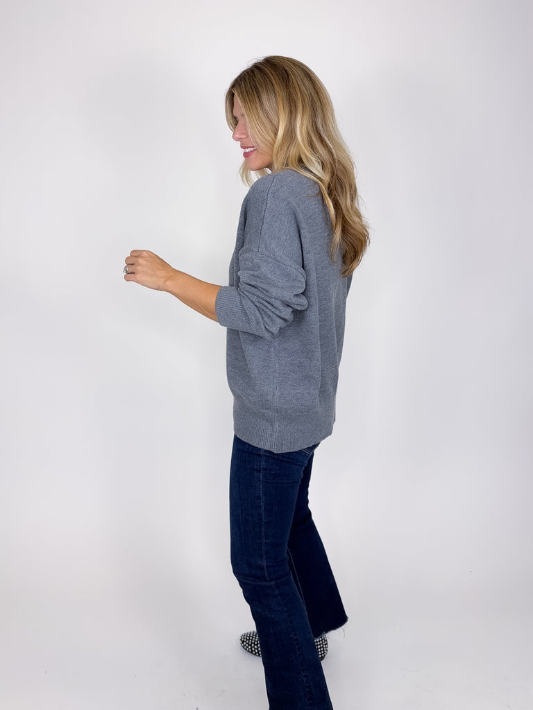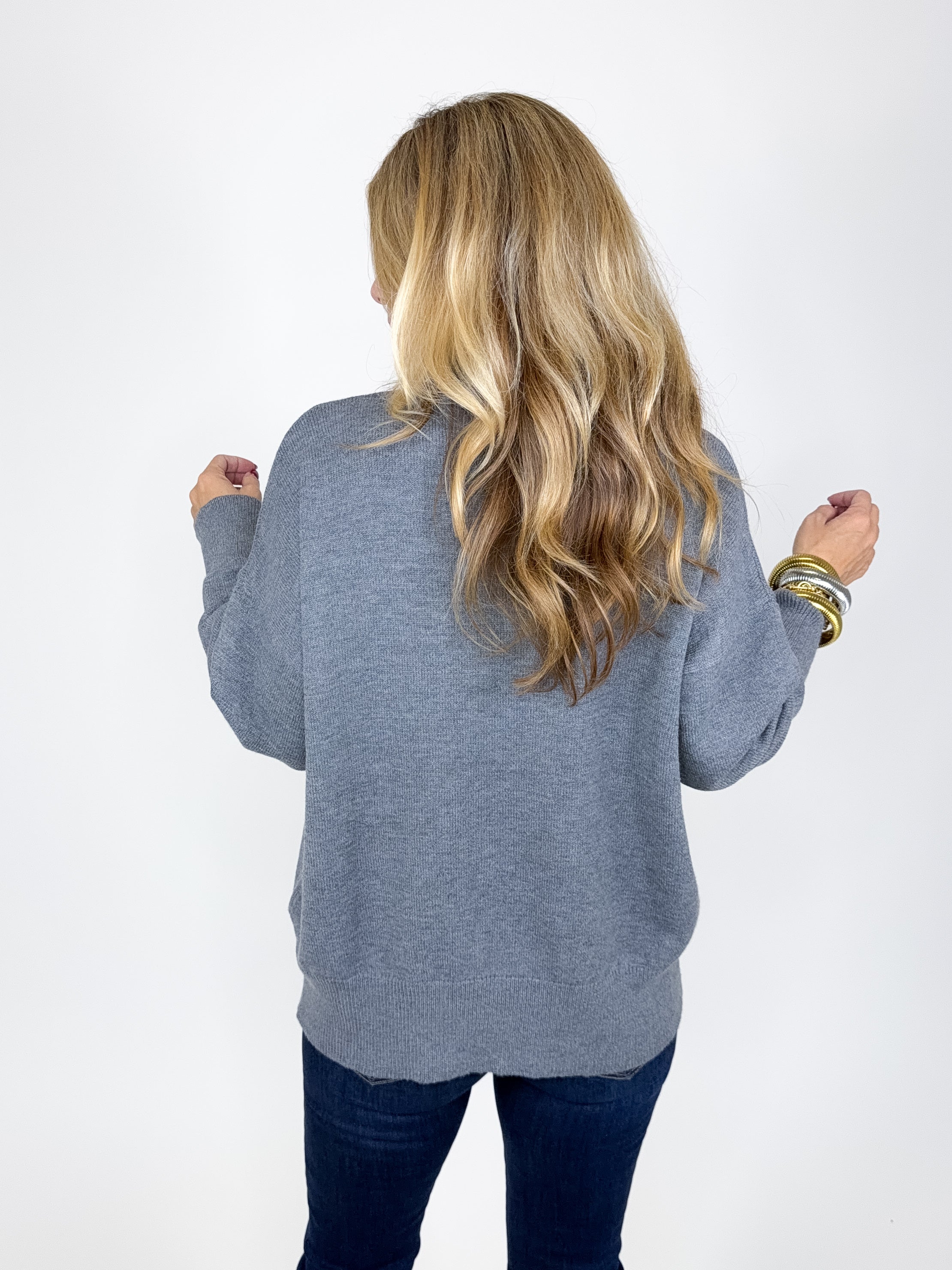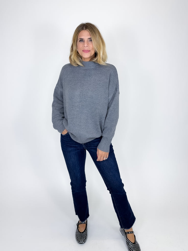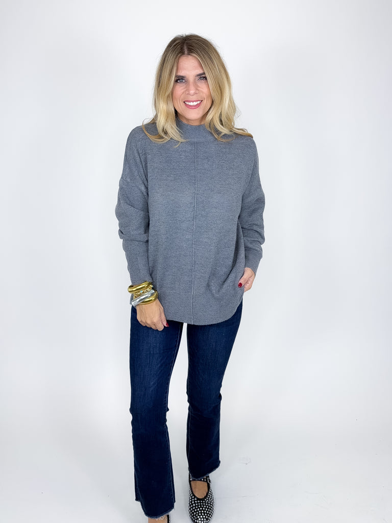 The Anderson Sweater is a perfect everyday sweater. This super soft heather grey knit sweater features a mock neck, drop shoulder, front seam down the center and a wide banded hem. Pair with denim, boots, flats, skirts, dress pants and sneakers. Fits true to size.