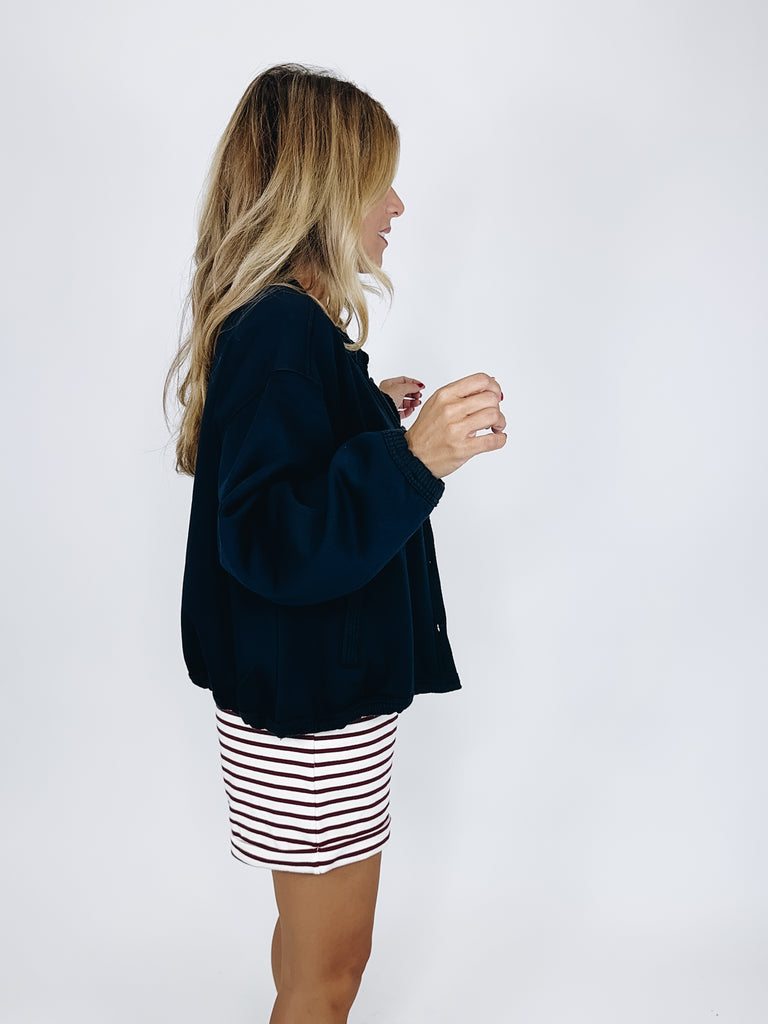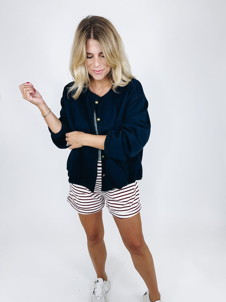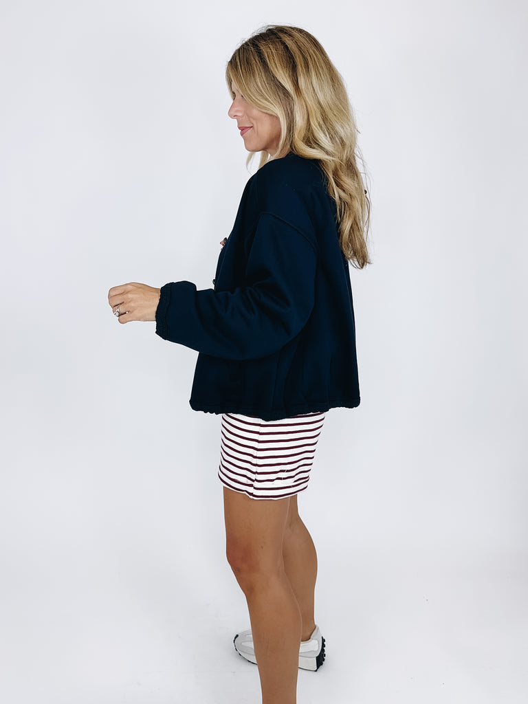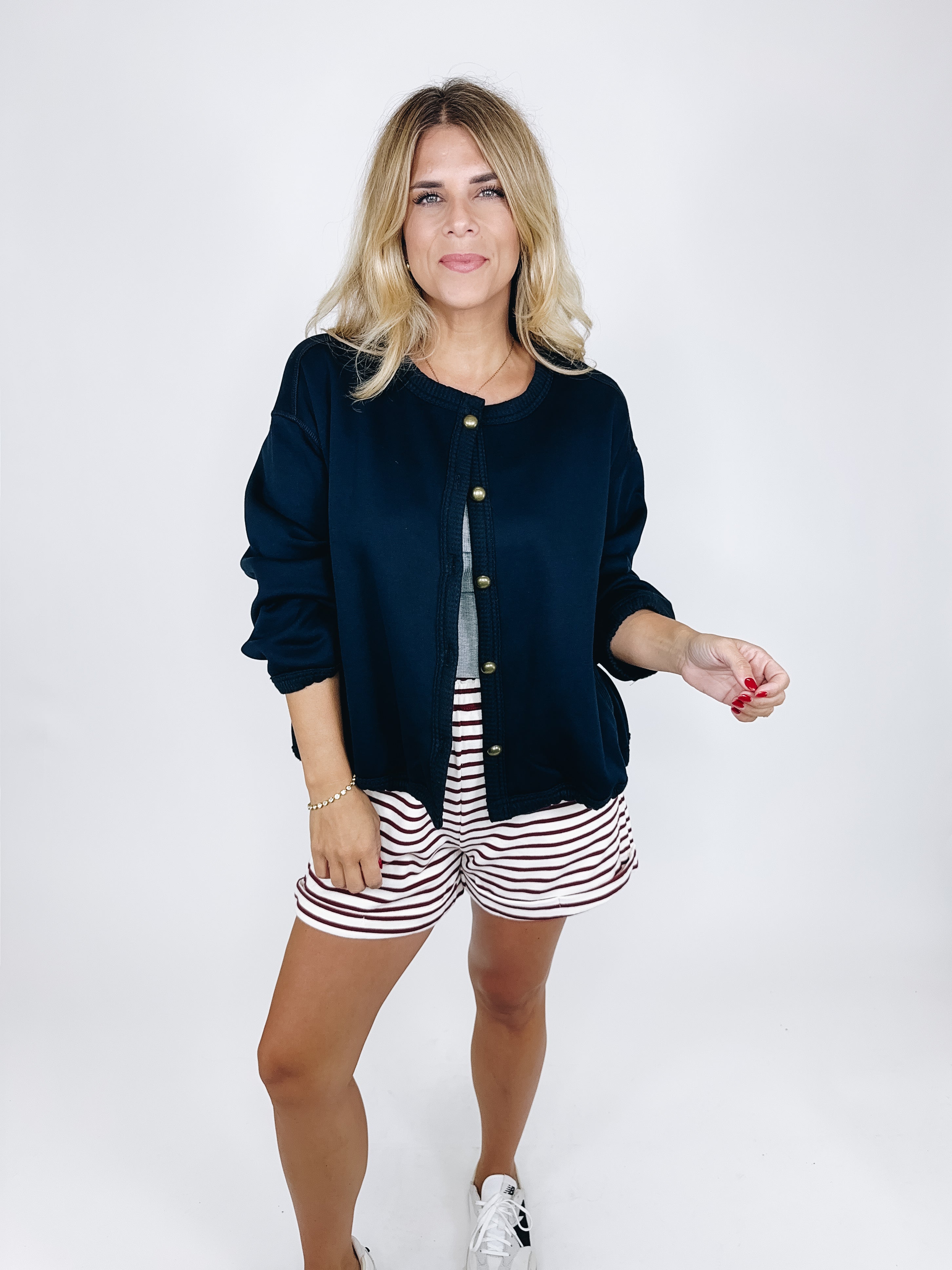 The Belle Cardigan will be the one you reach for over and over! This navy blue sweatshirt cardigan features an oversized fit, waffle knit contrasting trim, matte gold buttons and front pockets. Pairs well with everything from denim, flats, heels, dress pants, boots and more! Great fit! Fits true to size.
