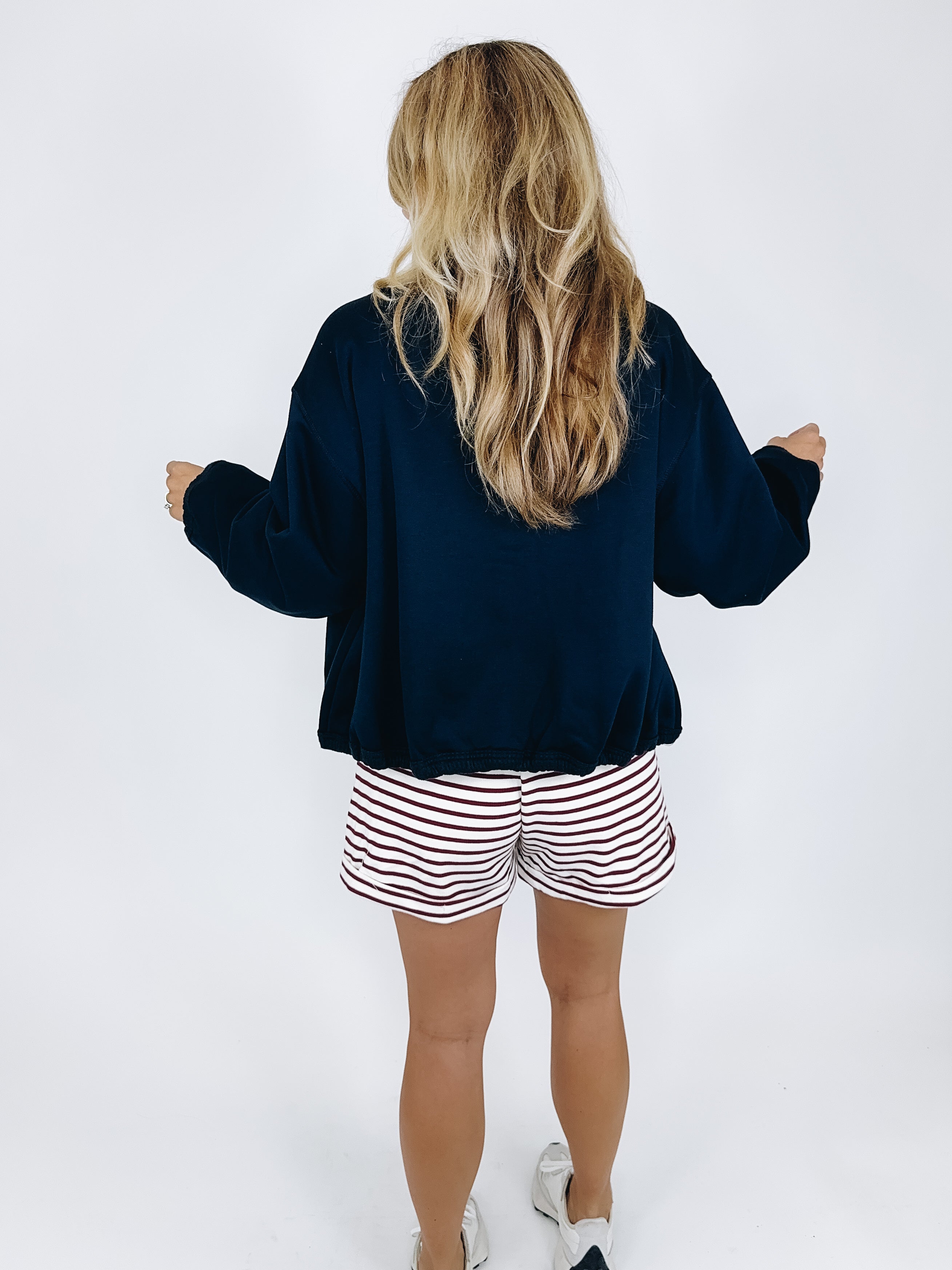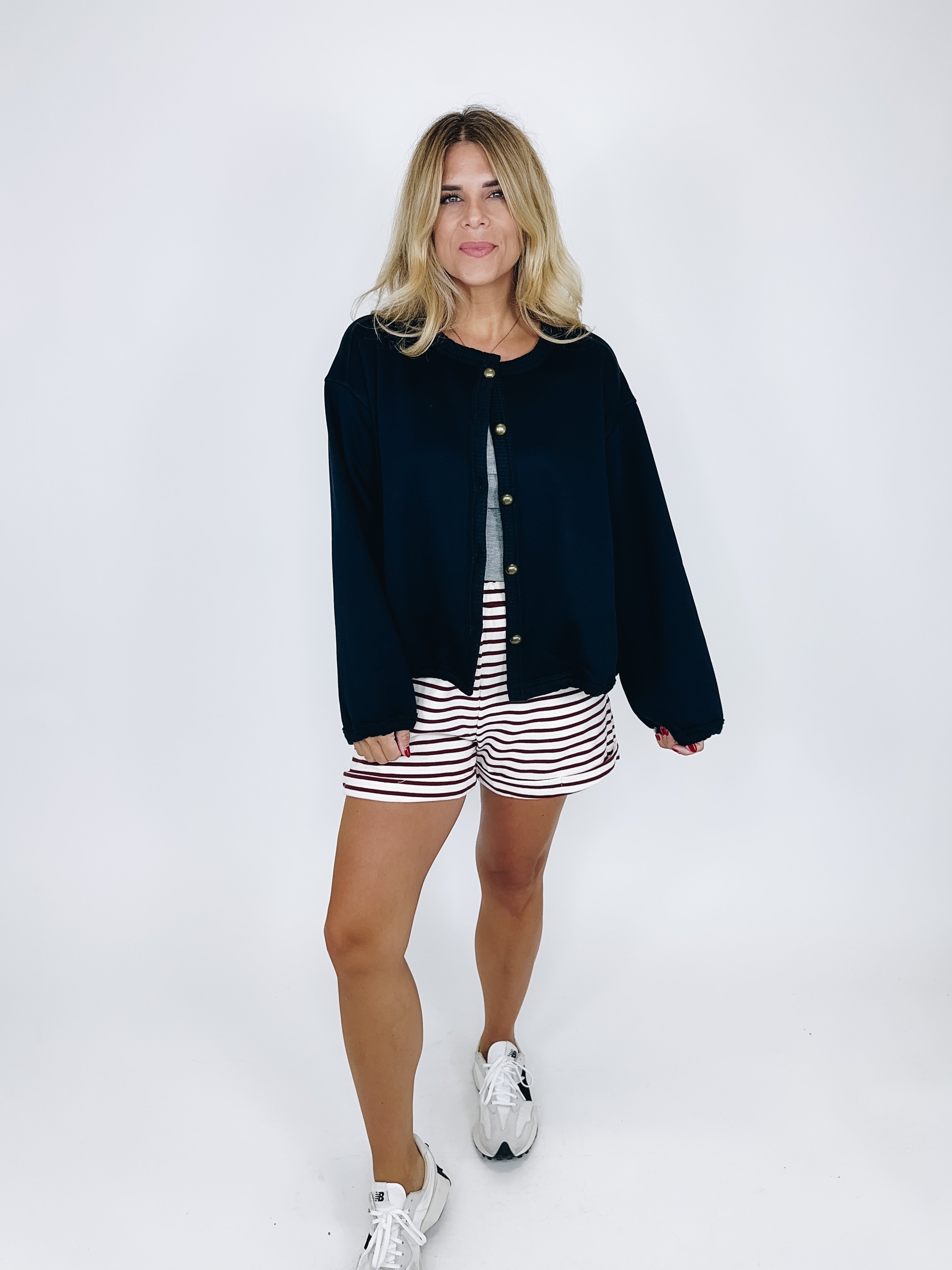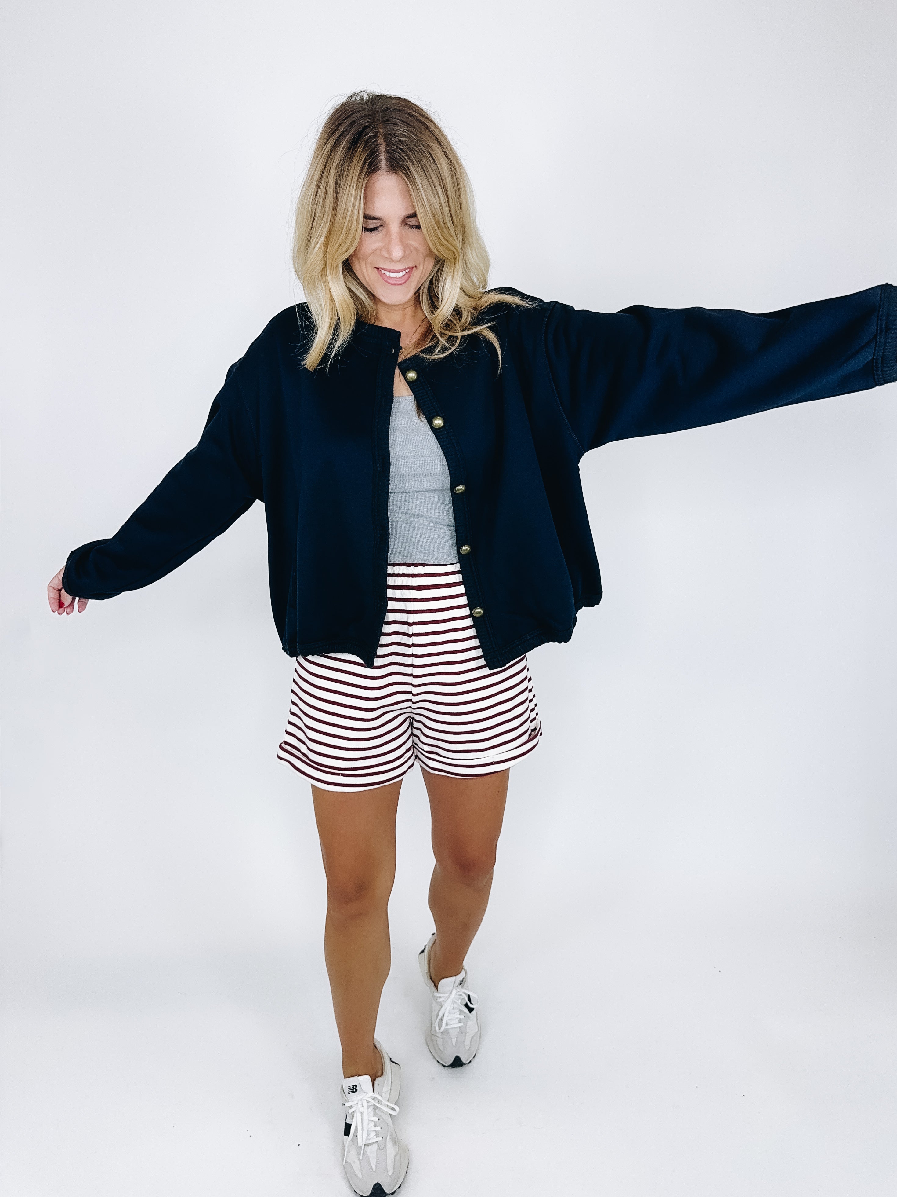 The Belle Cardigan will be the one you reach for over and over! This navy blue sweatshirt cardigan features an oversized fit, waffle knit contrasting trim, matte gold buttons and front pockets. Pairs well with everything from denim, flats, heels, dress pants, boots and more! Great fit! Fits true to size.