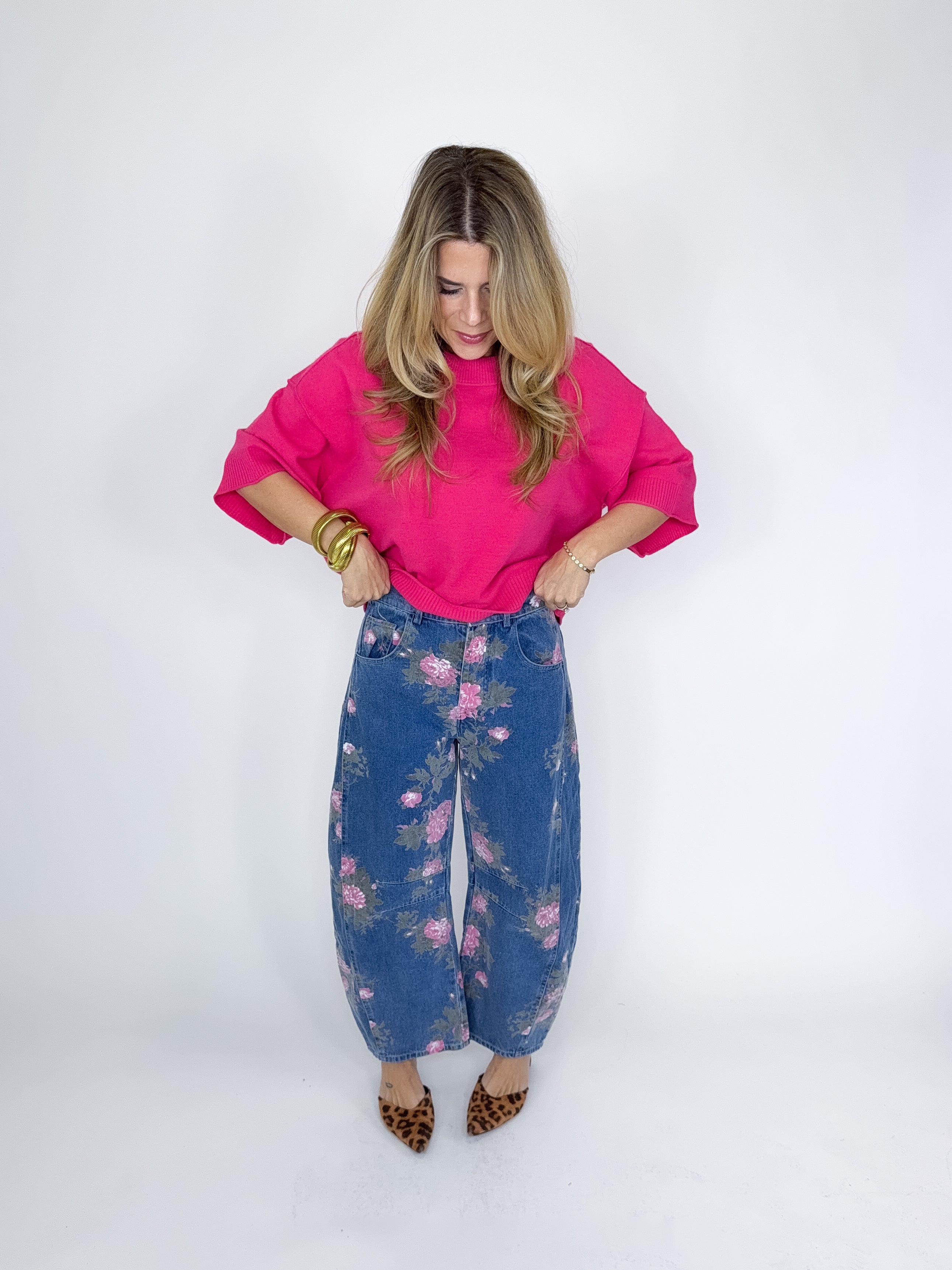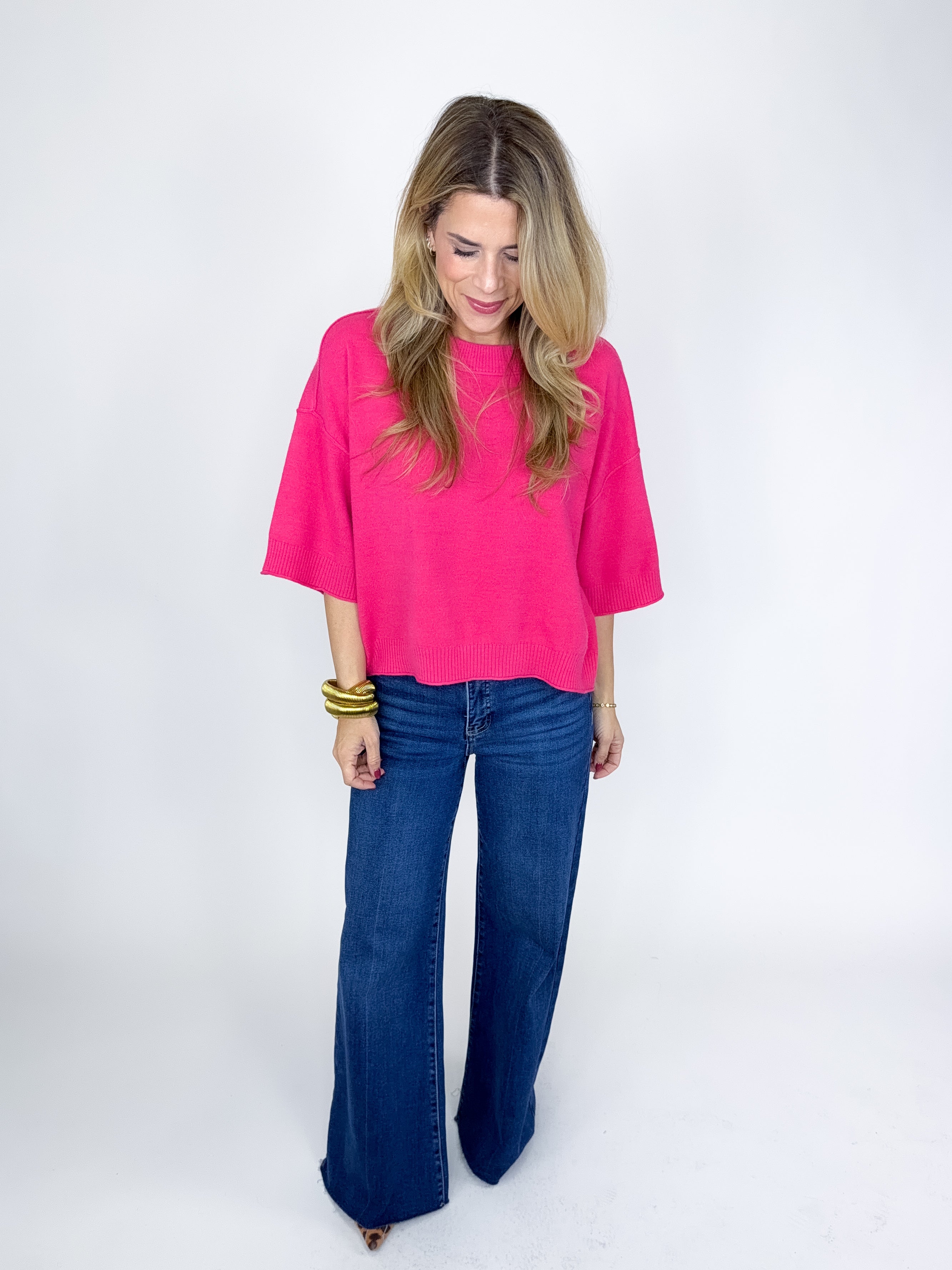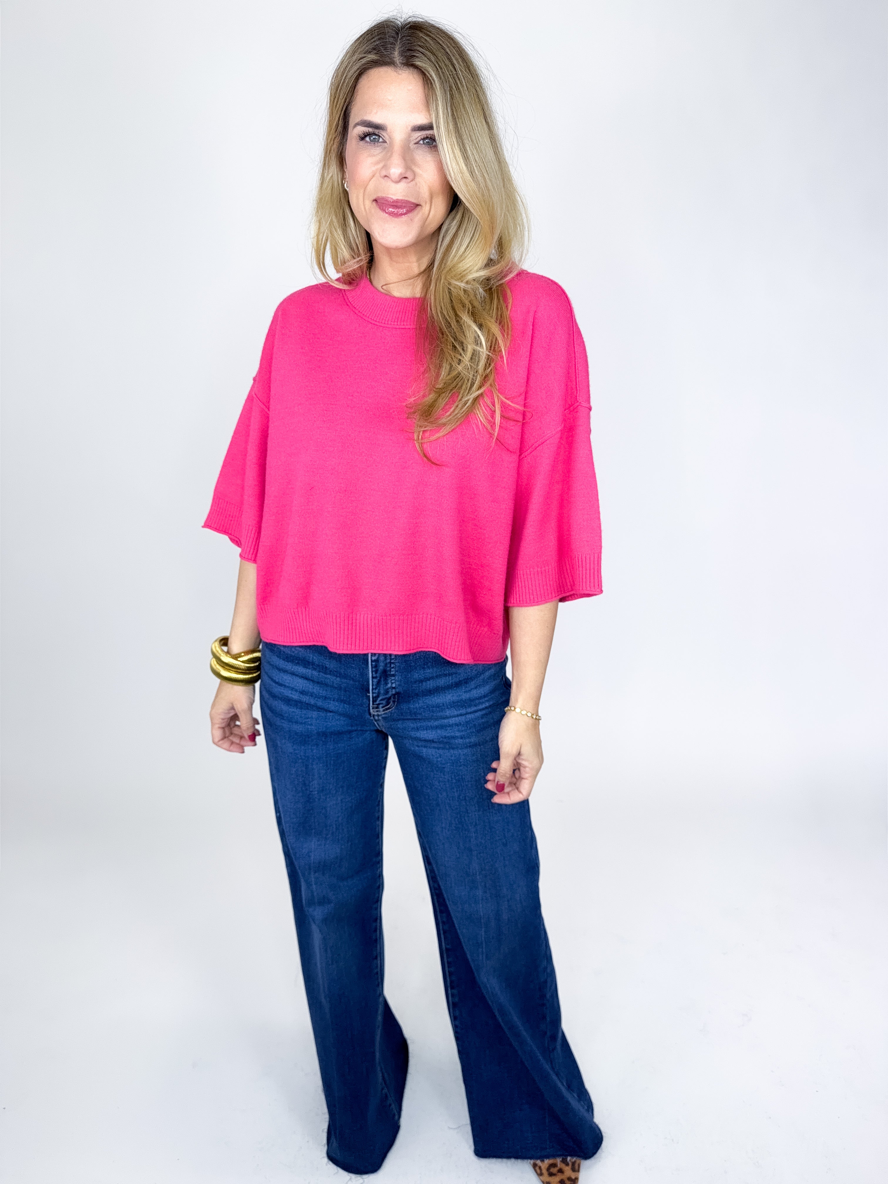 The Blythe Top is such a sweet sweater! This hot pink knit top features a crew neckline, ribbed hem, drop shoulder short sleeves and a skimmer boxy length. Pairs well with everything from denim, flats, heels, dress pants, skirts and more! Fits true to size.