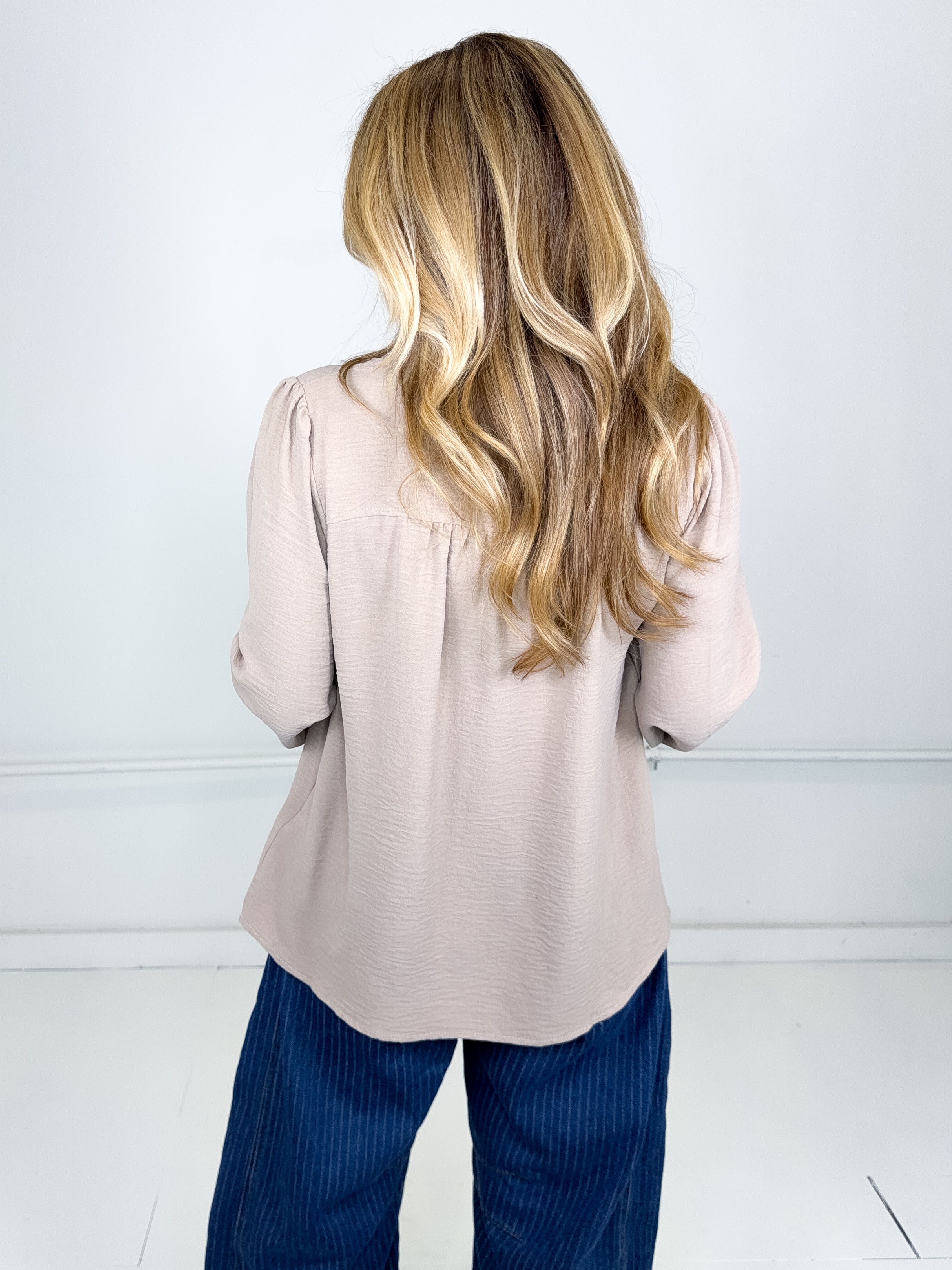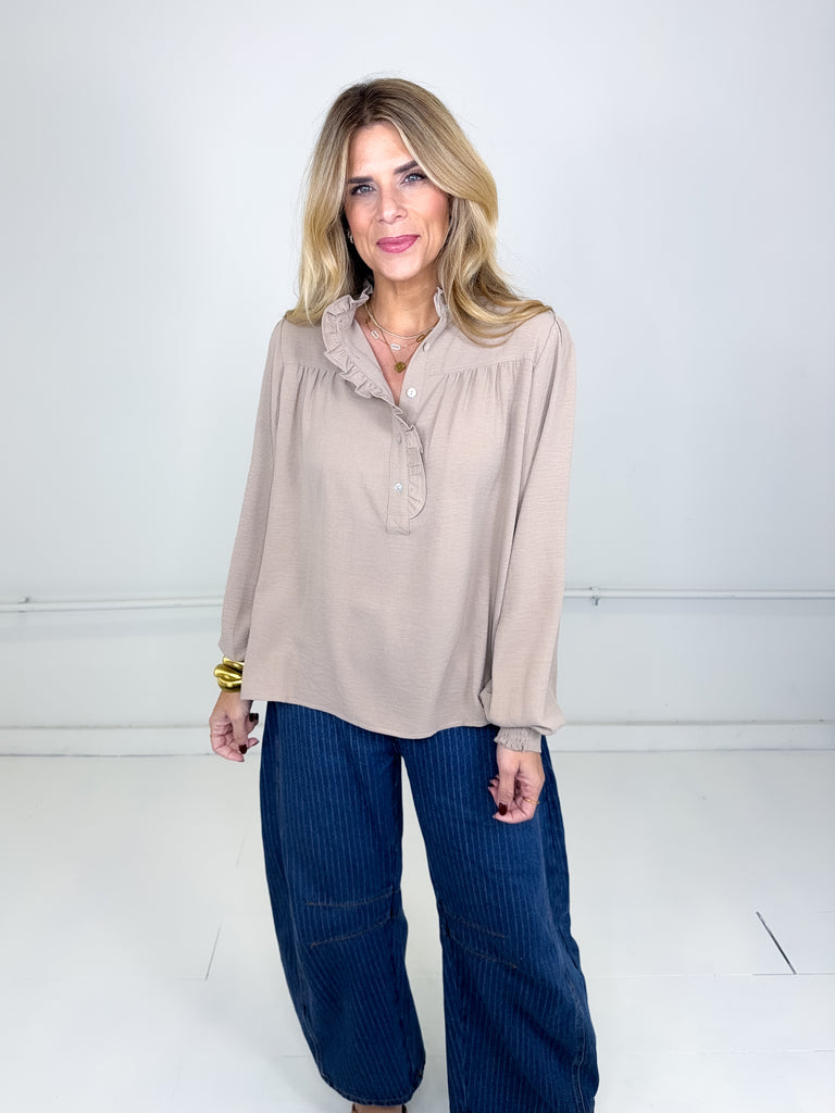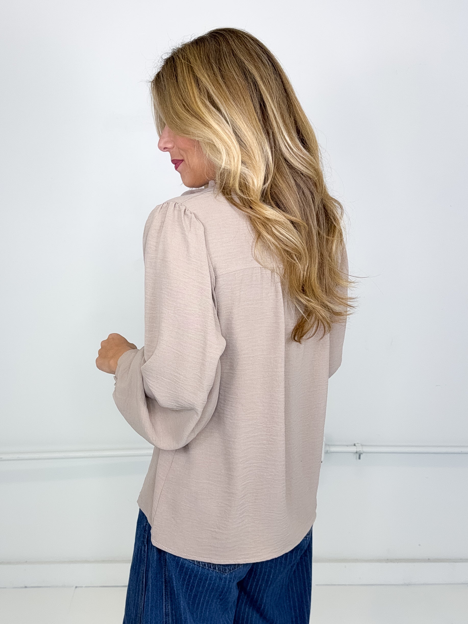 The Bonnie Top is such a fun top! This taupe blouse features a button front, ruffle trim, long balloon sleeves with elastic cuffs and pin tuck details on bodice. Pairs well with everything from denim, flats, heels, boots, skirts and more! Fits true to size.