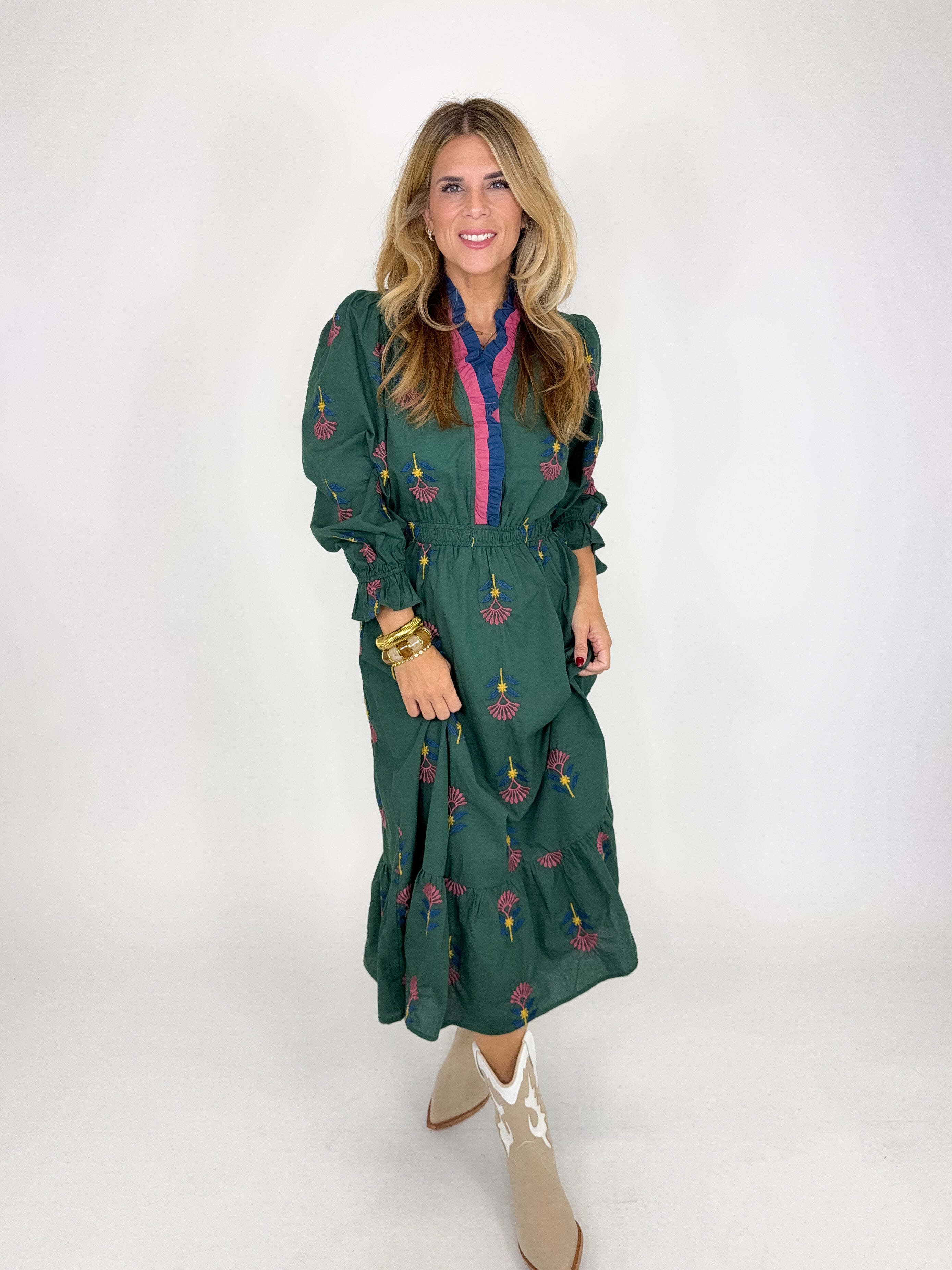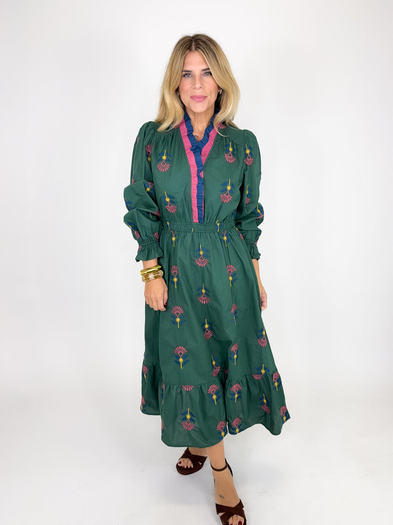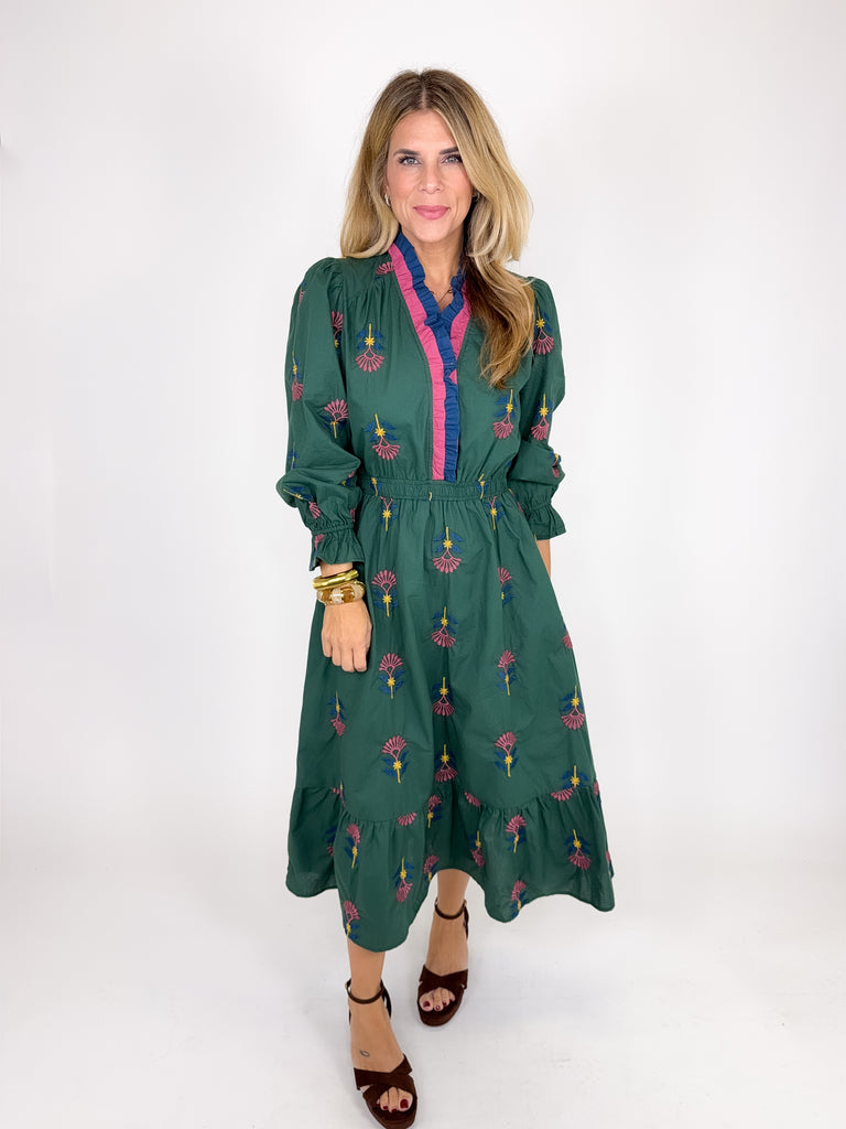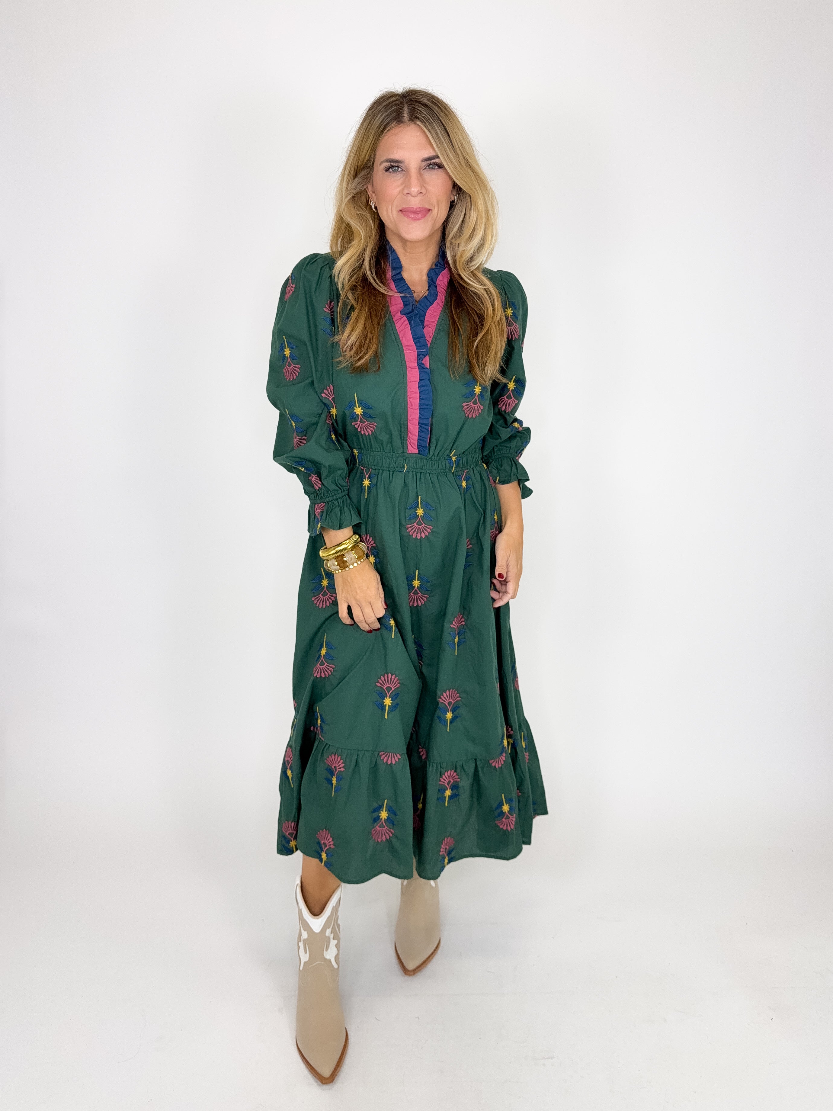 The Bridger Dress is a must have. This hunter green maxi dress features V-neck with navy and pink ruffle trim, floral block print, banded waist, long sleeves with an elastic cuff and a peplum ruffle hem. Style with flats, heels, wedges, boots and sneakers! Fits true to size.