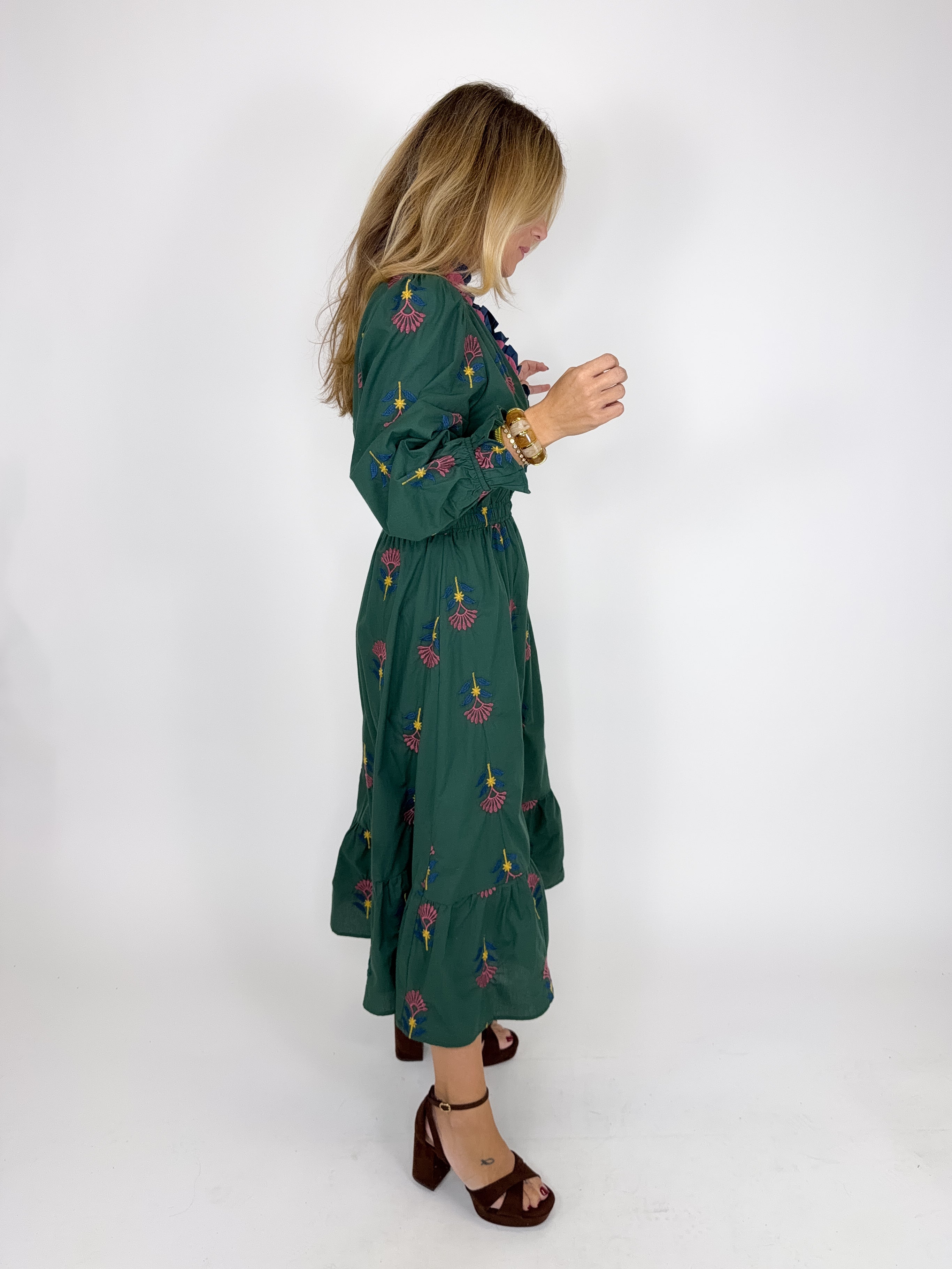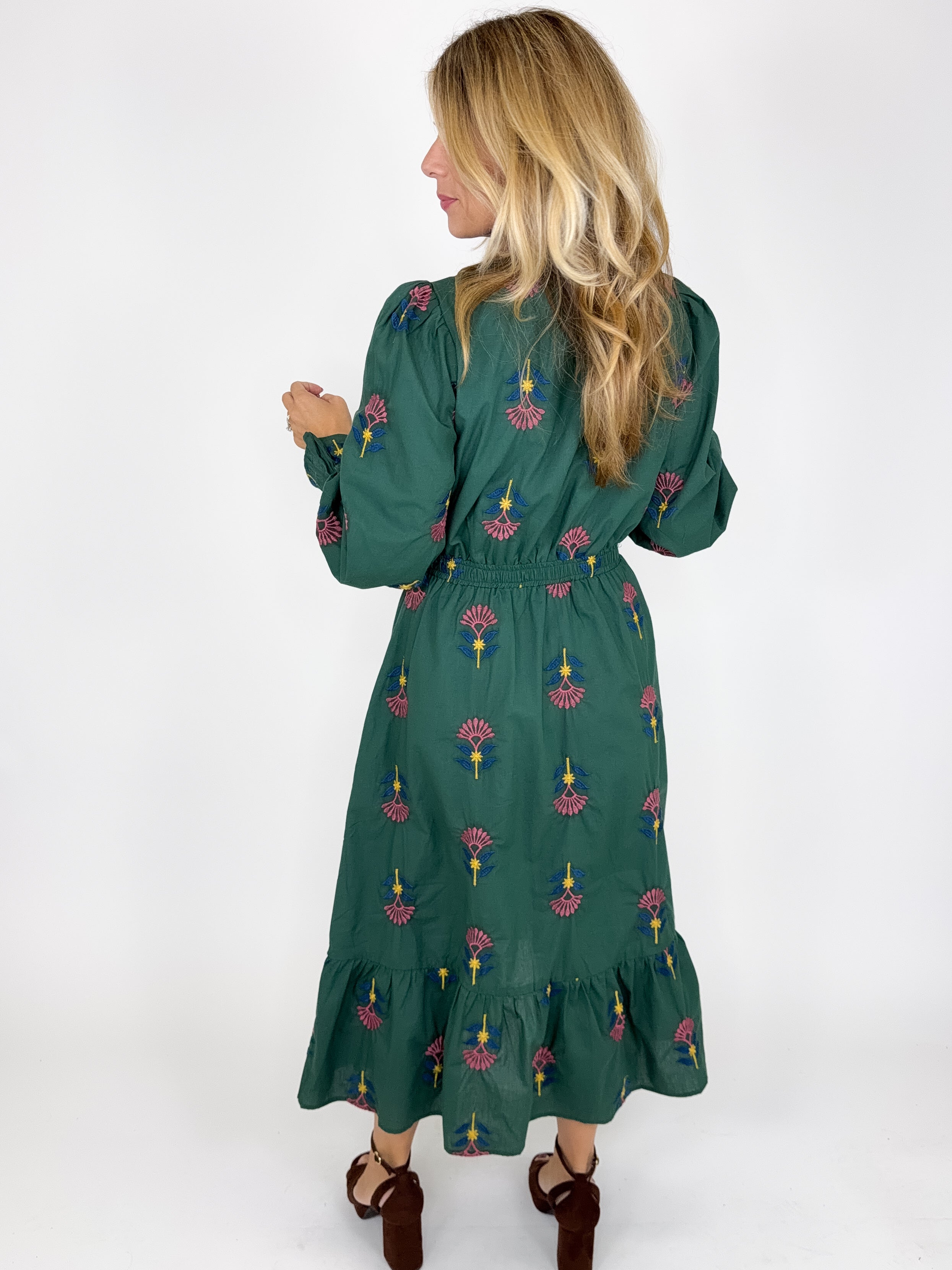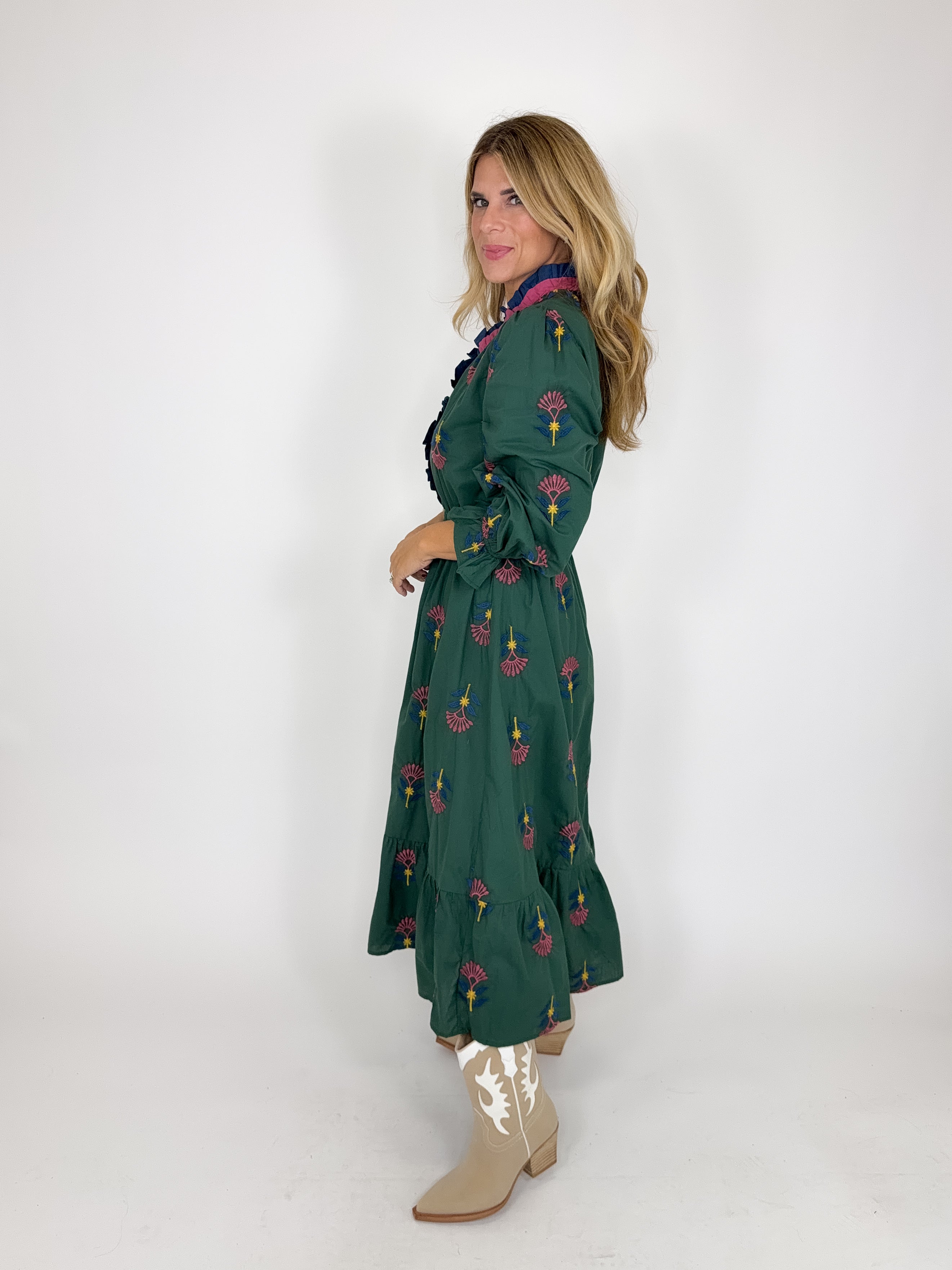 The Bridger Dress is a must have. This hunter green maxi dress features V-neck with navy and pink ruffle trim, floral block print, banded waist, long sleeves with an elastic cuff and a peplum ruffle hem. Style with flats, heels, wedges, boots and sneakers! Fits true to size.
