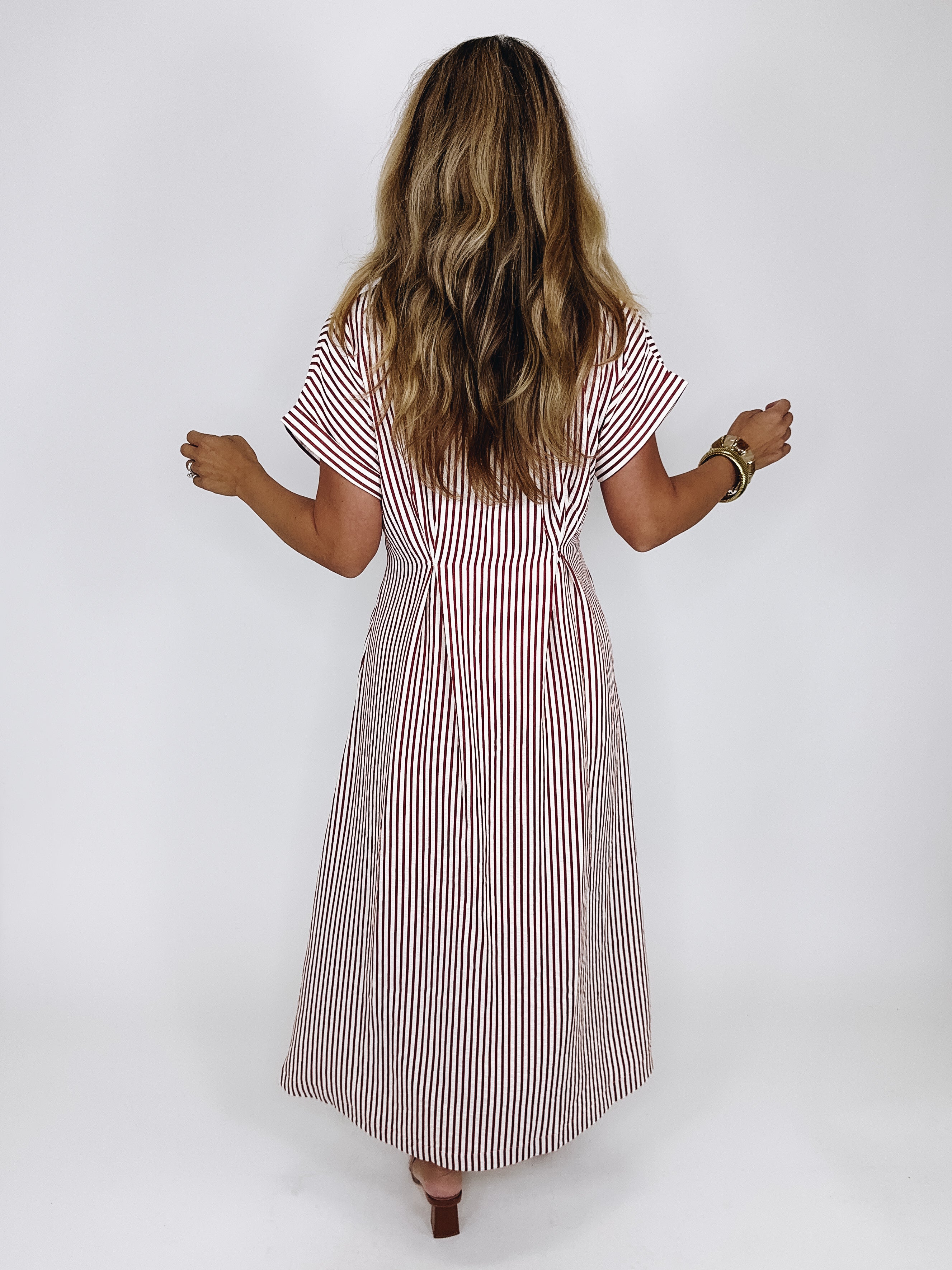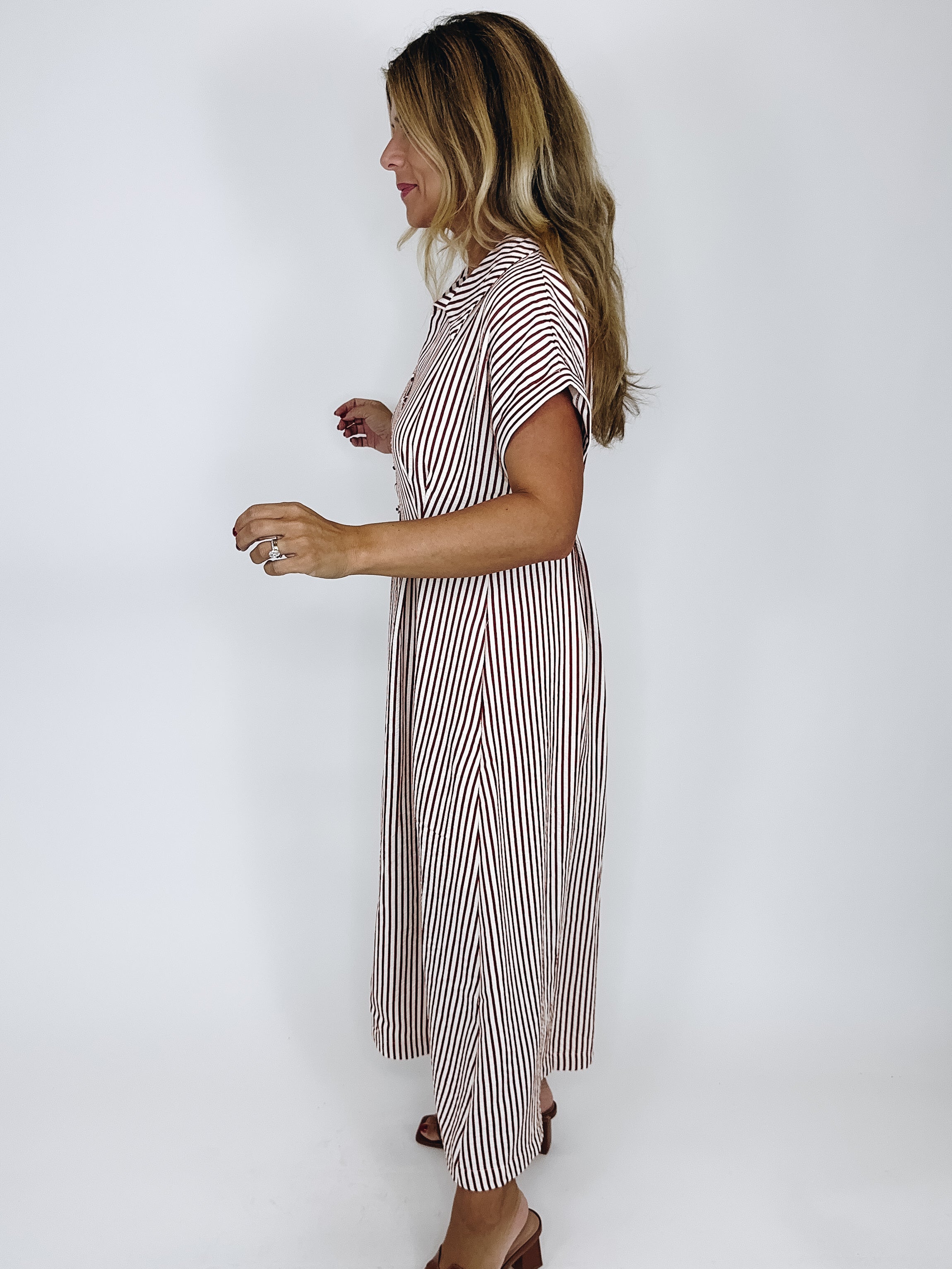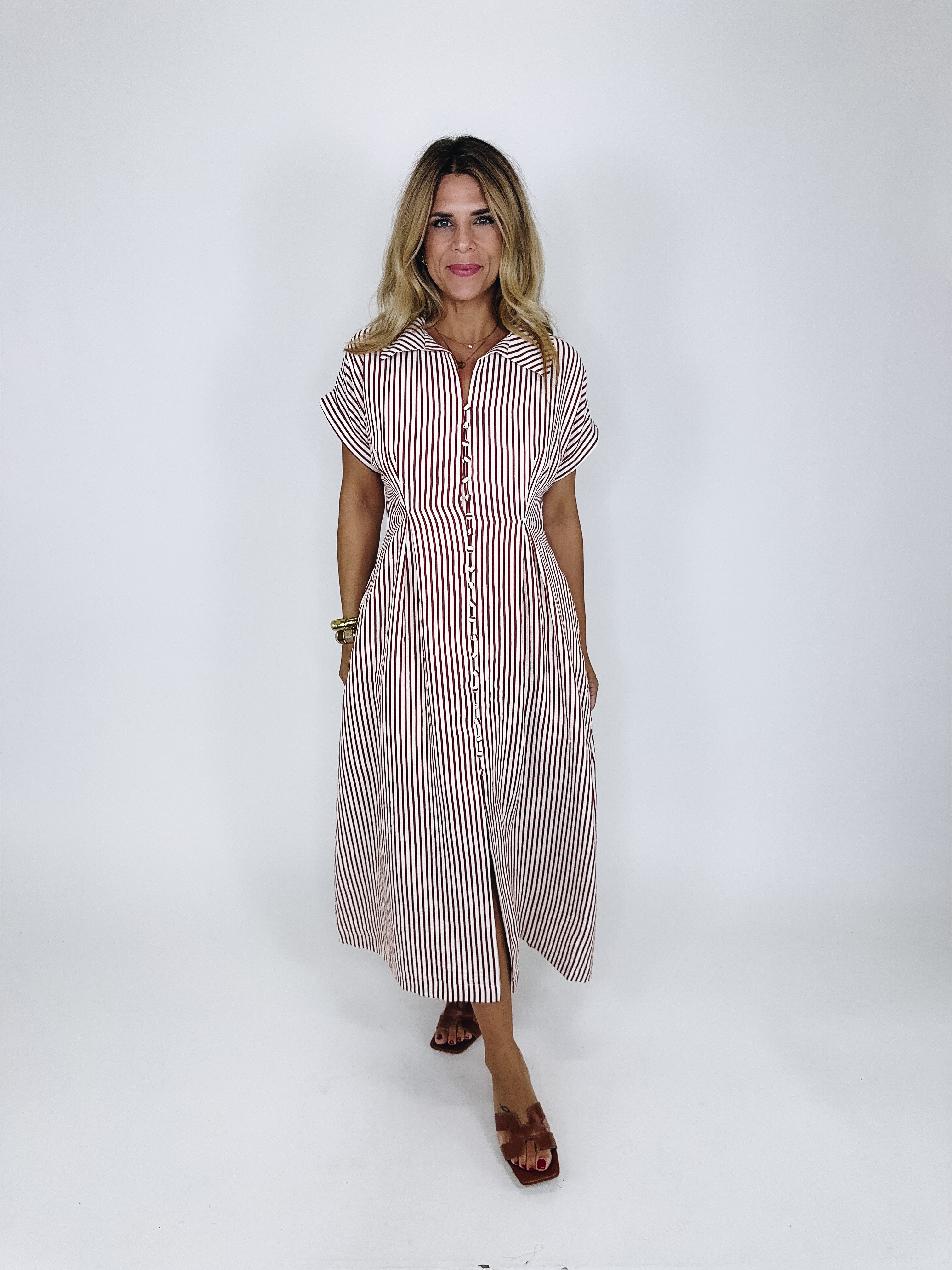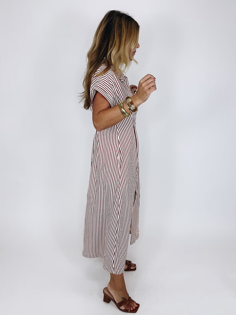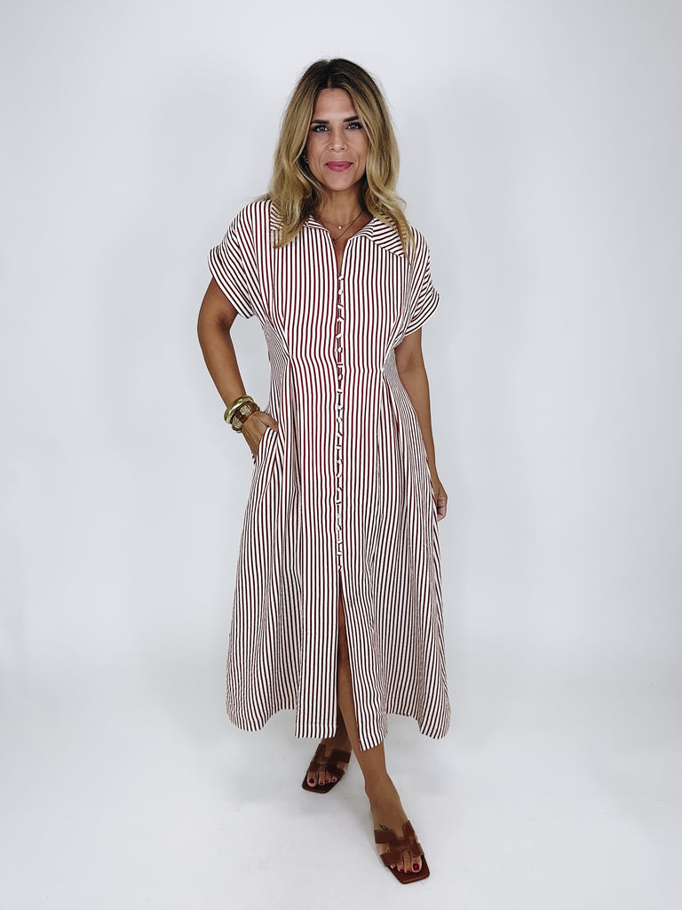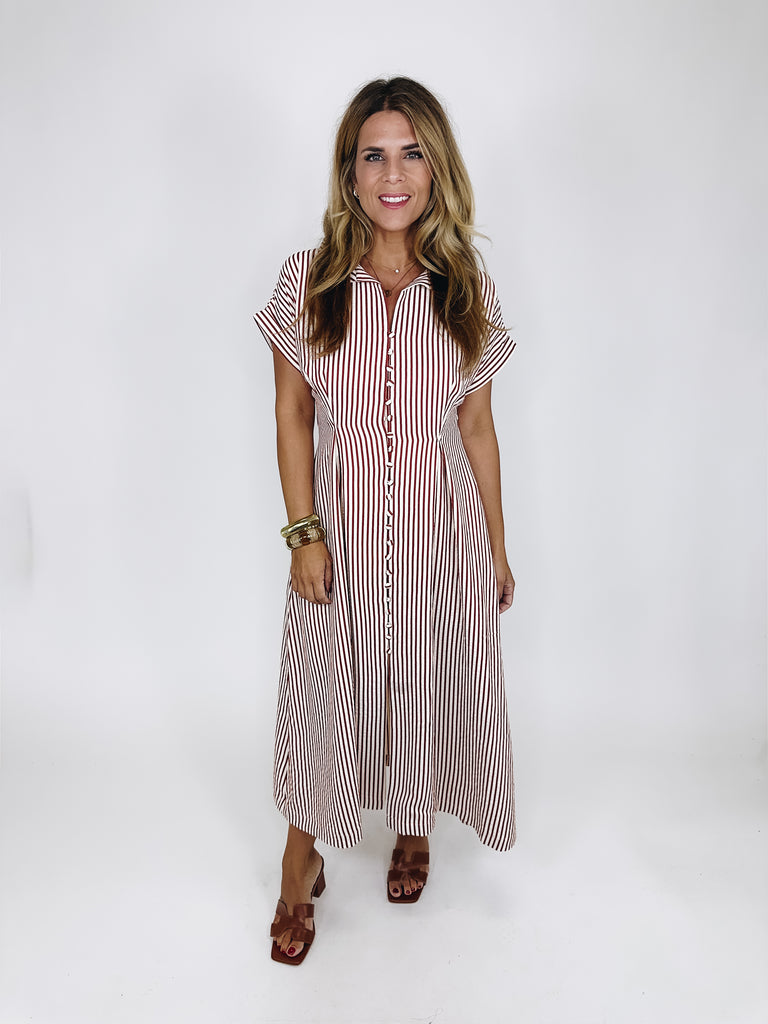 The Brooks Dress is a total classic! This brick red and white striped maxi shirt dress features a collar, v-neck, button front, short balloon sleeves and lined skirt. Pockets. Style with flats, wedges and heels. Fits true to size.