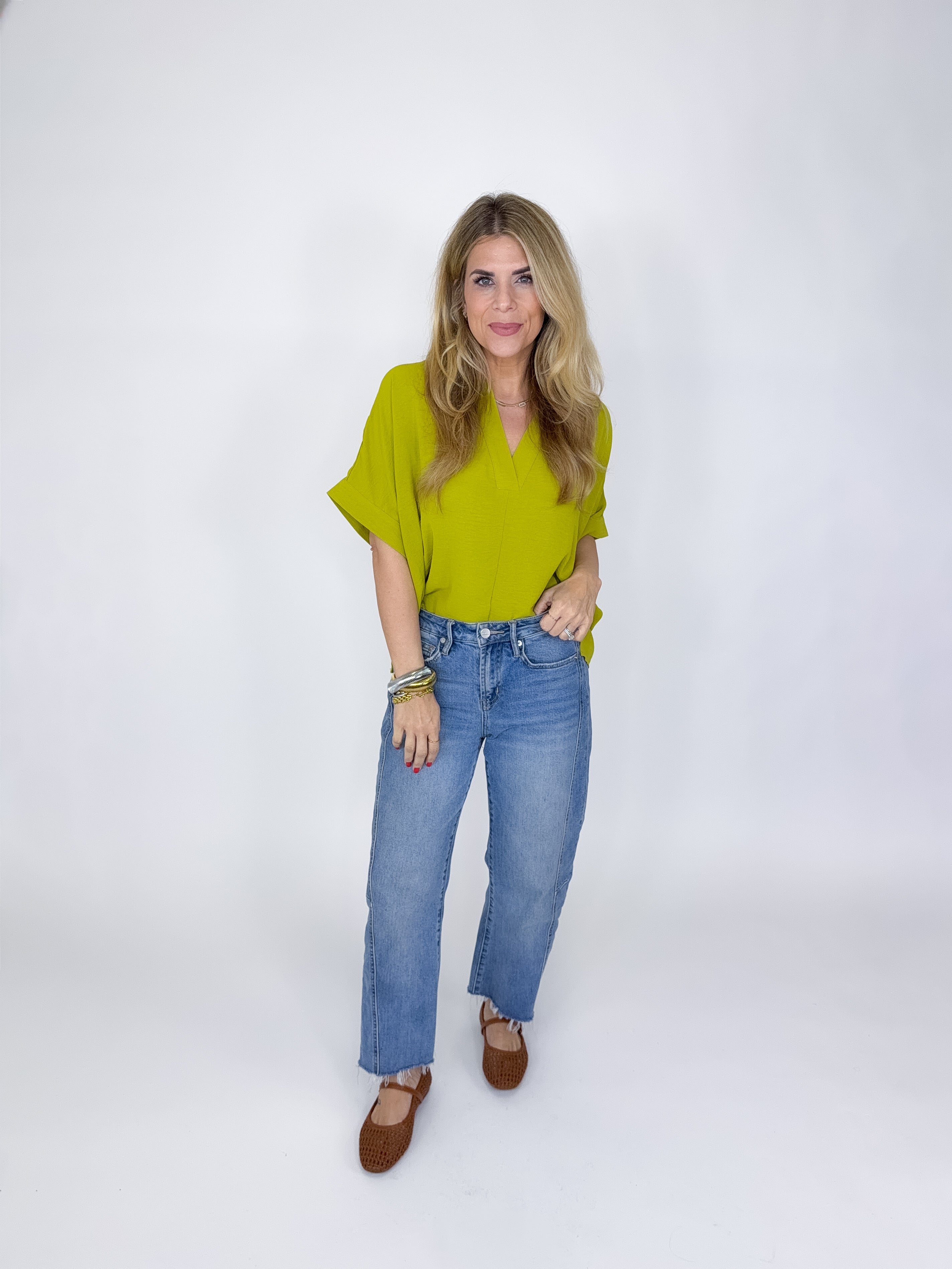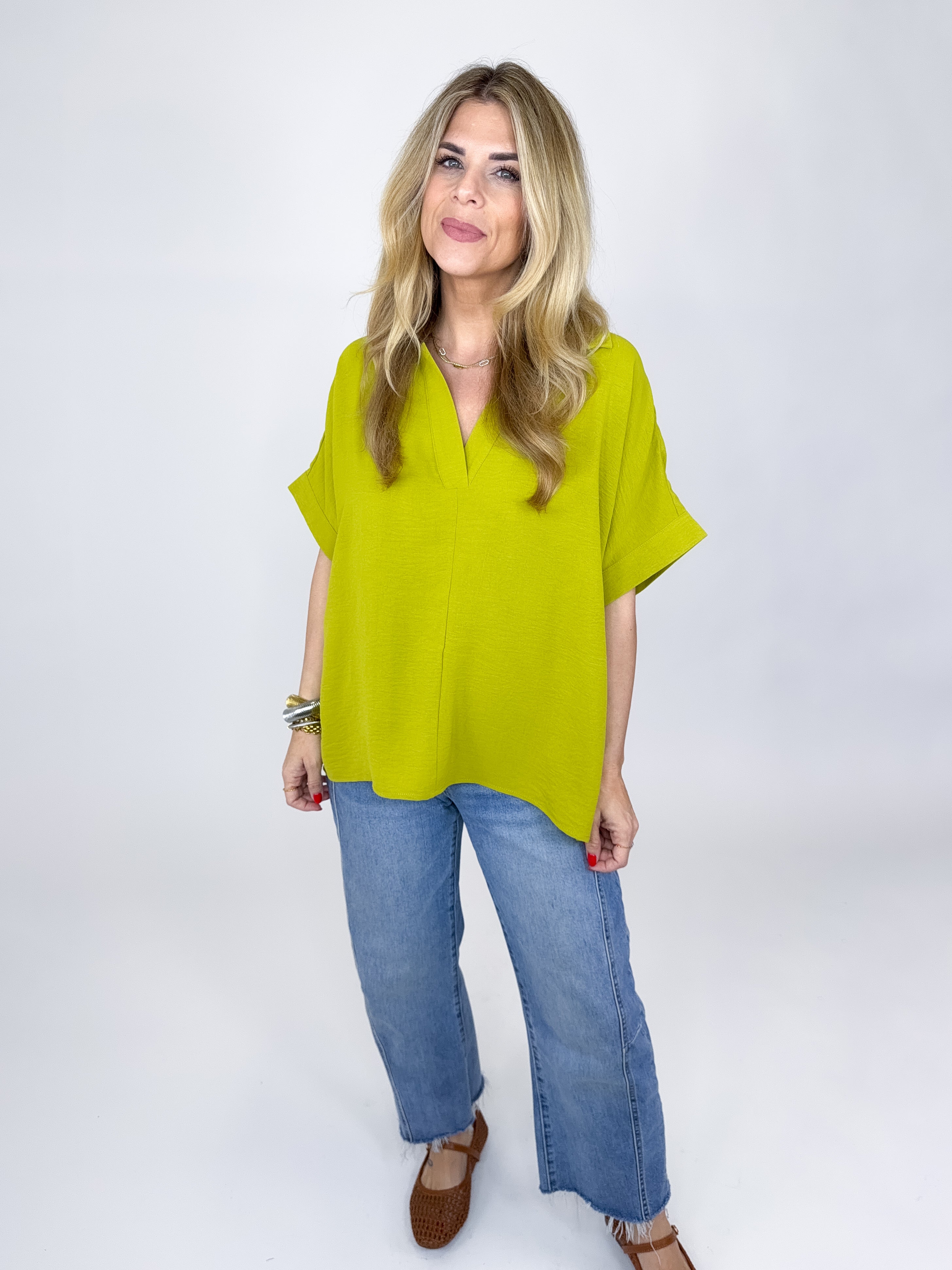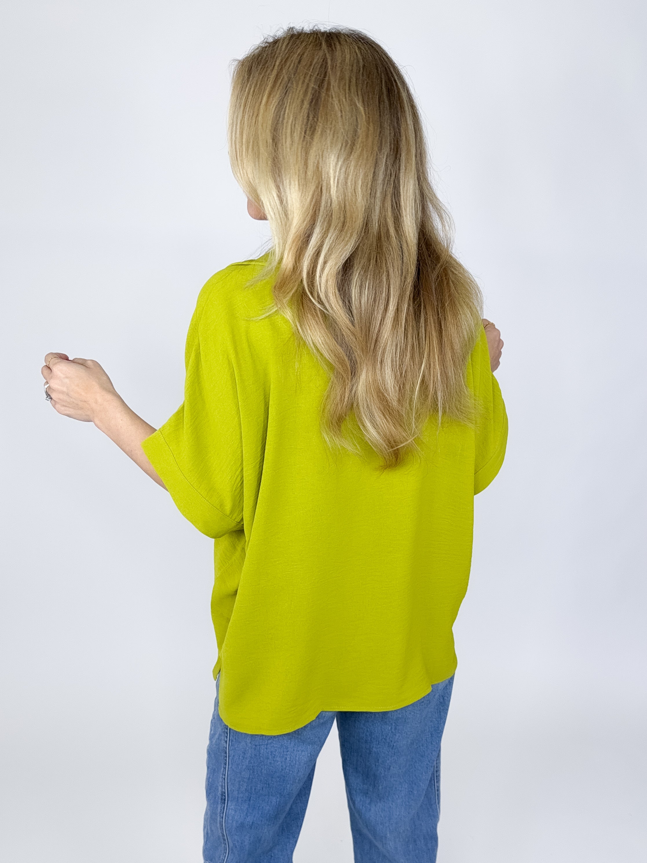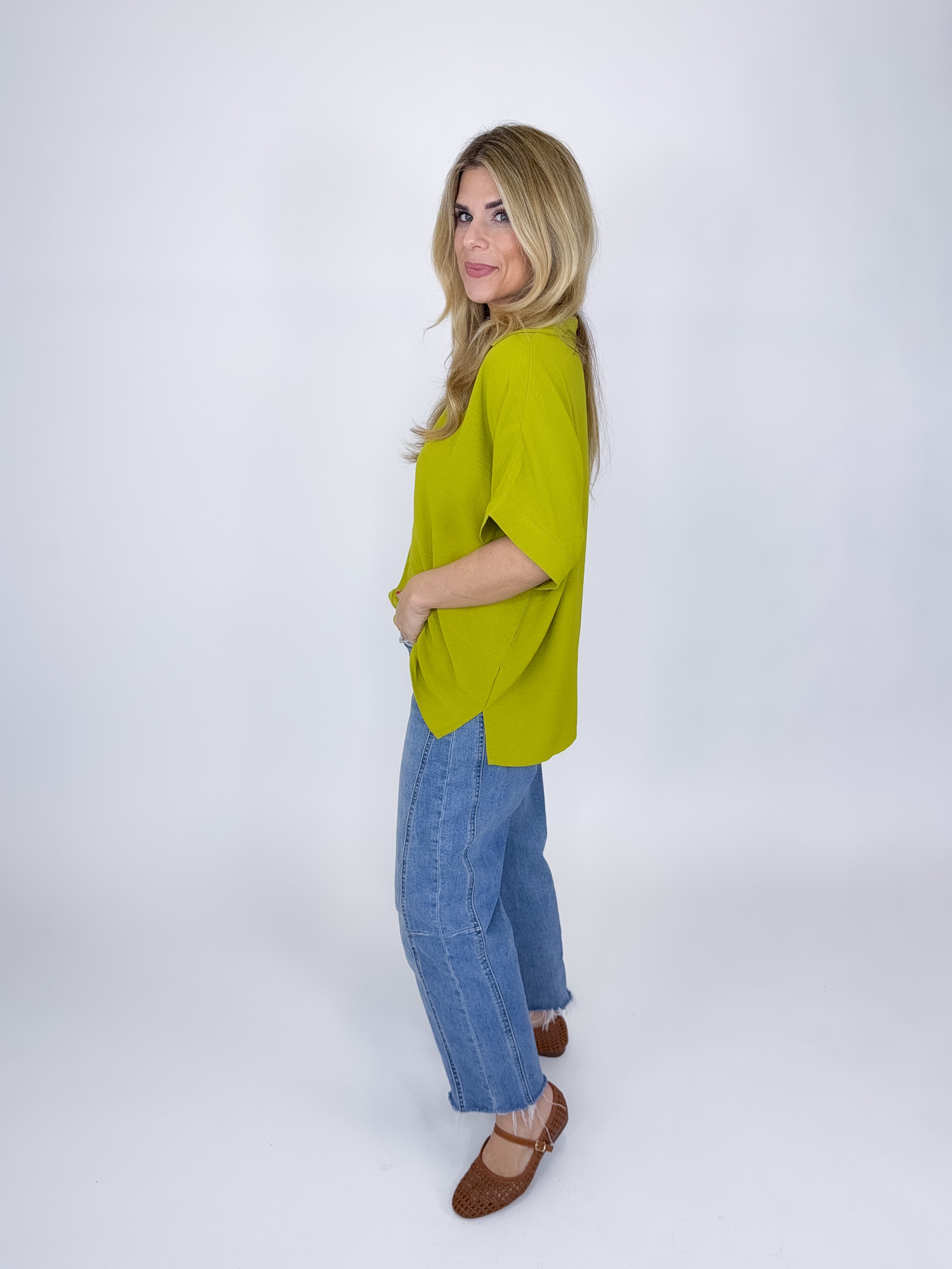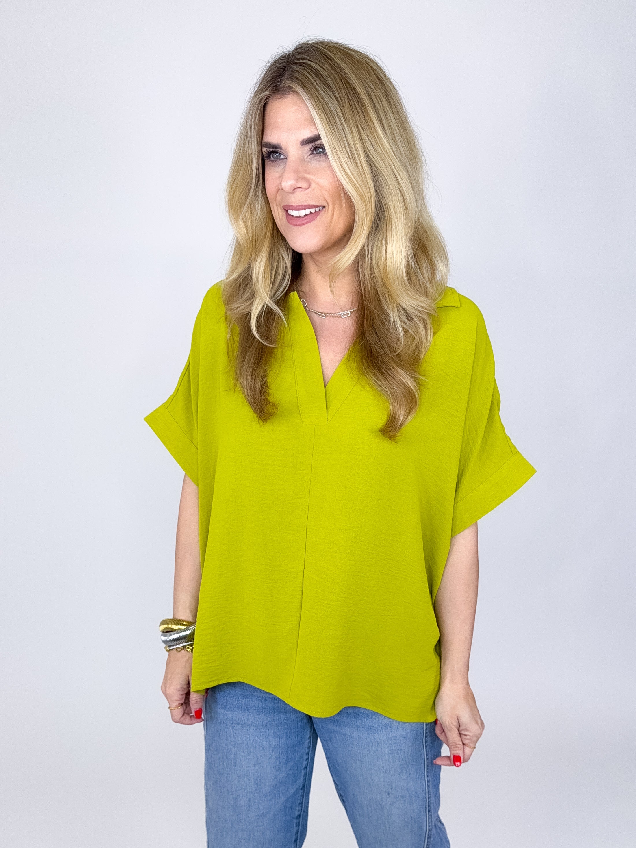 The Ellie Top is such a sweet top! This chartreuse green top features a v- neckline with a collar, short dolman sleeves, split hemline and an oversized fit. Pairs well with everything from denim, flats, heels, dress pants, skirts and more! Fits true to size.