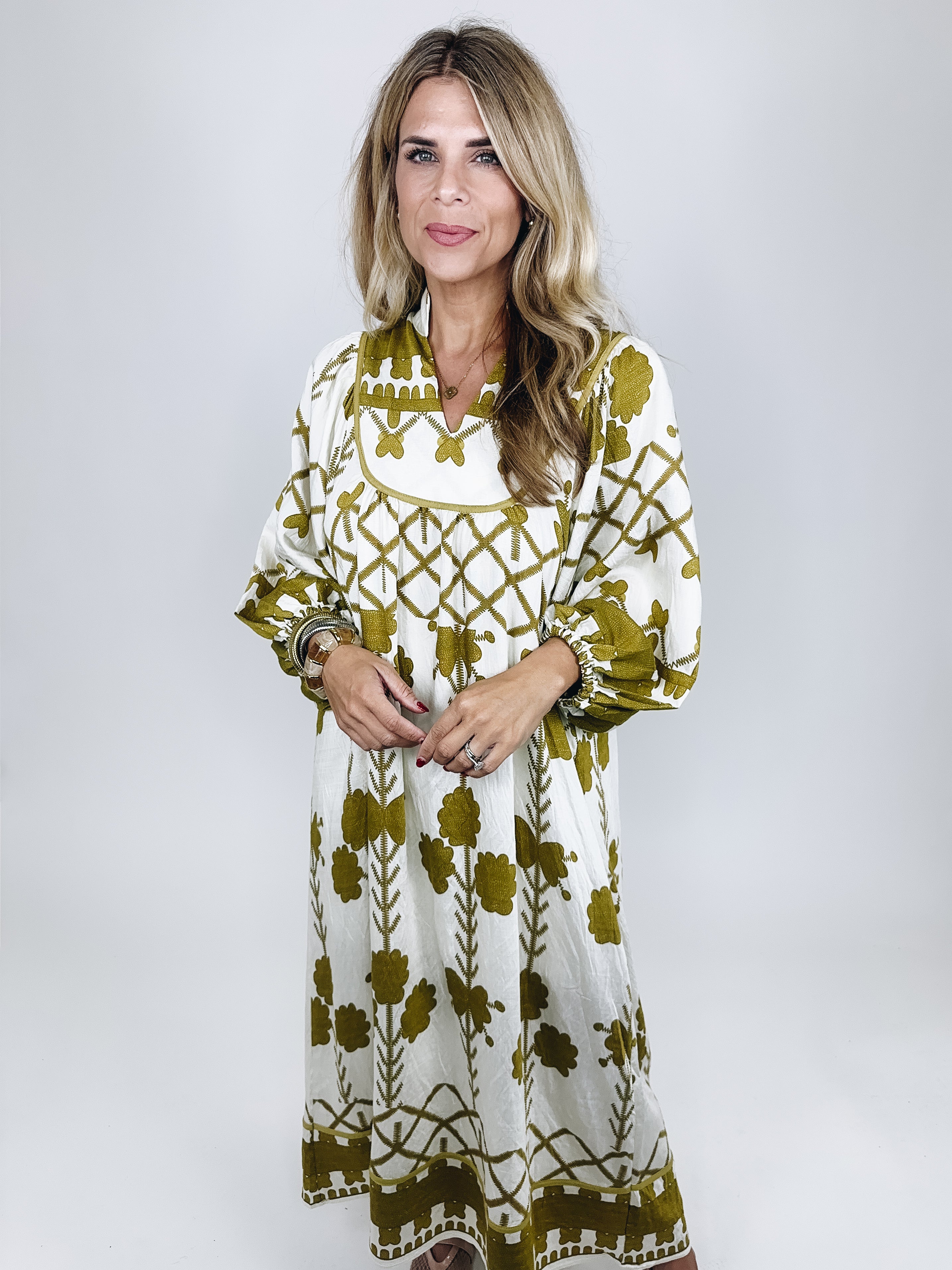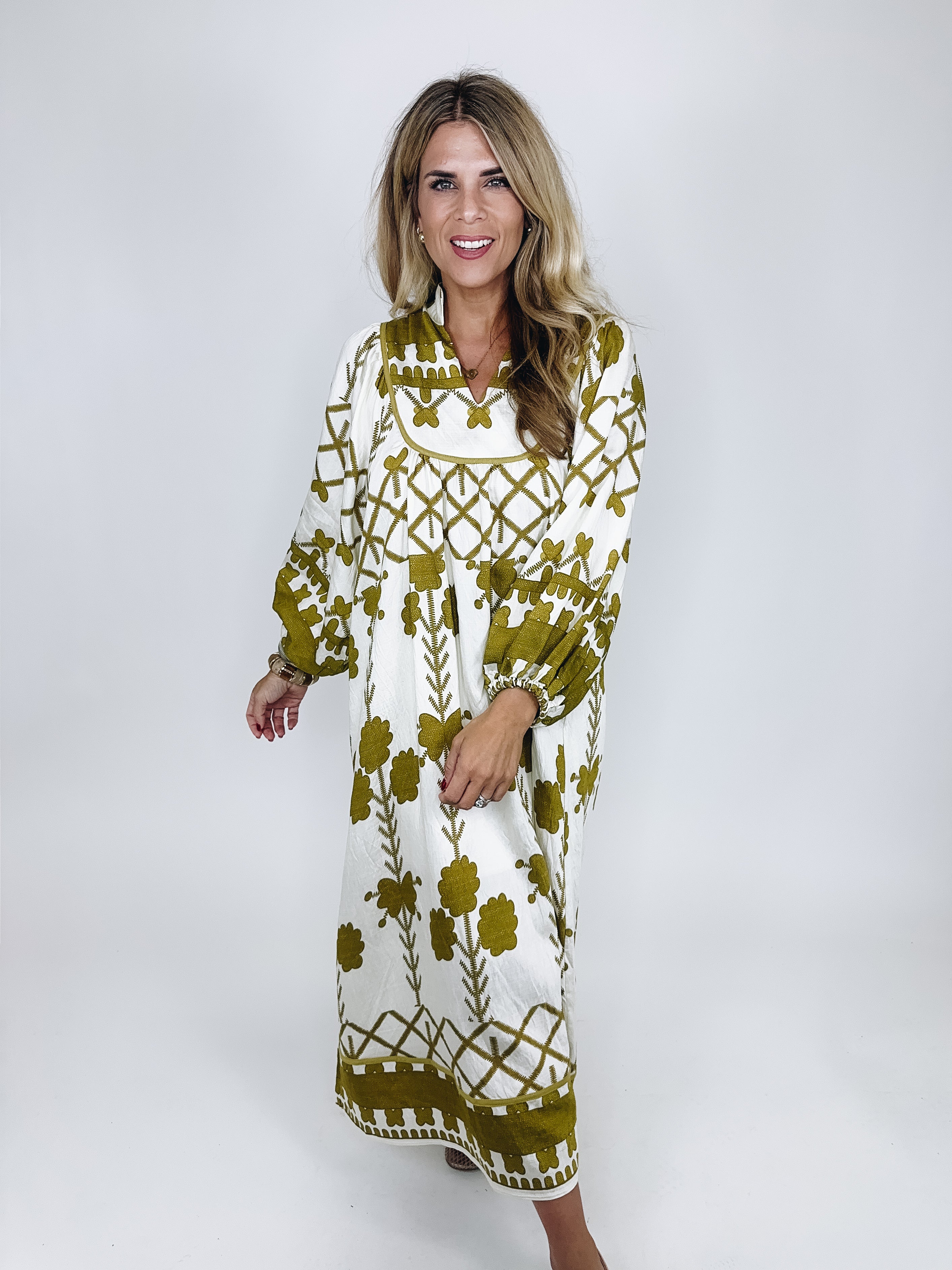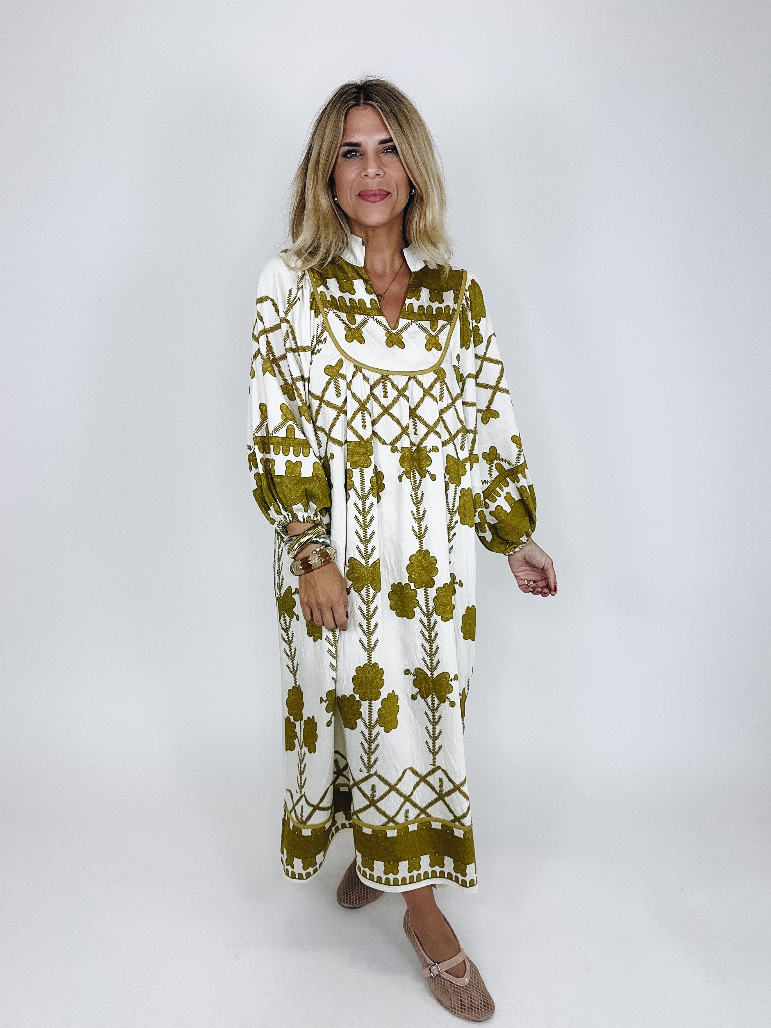 The Essie Dress is a perfect easy to wear dress. This mustard boho print maxi dress features a v-neckline and long balloon sleeves . Style with flats, wedges, heels and sneakers. Fits true to size.