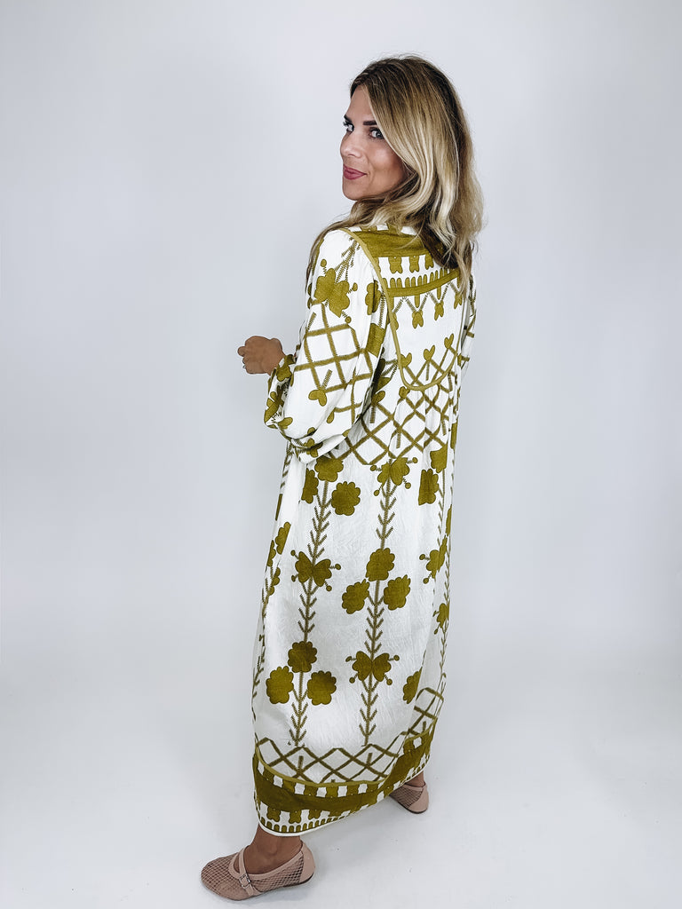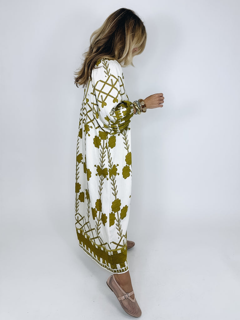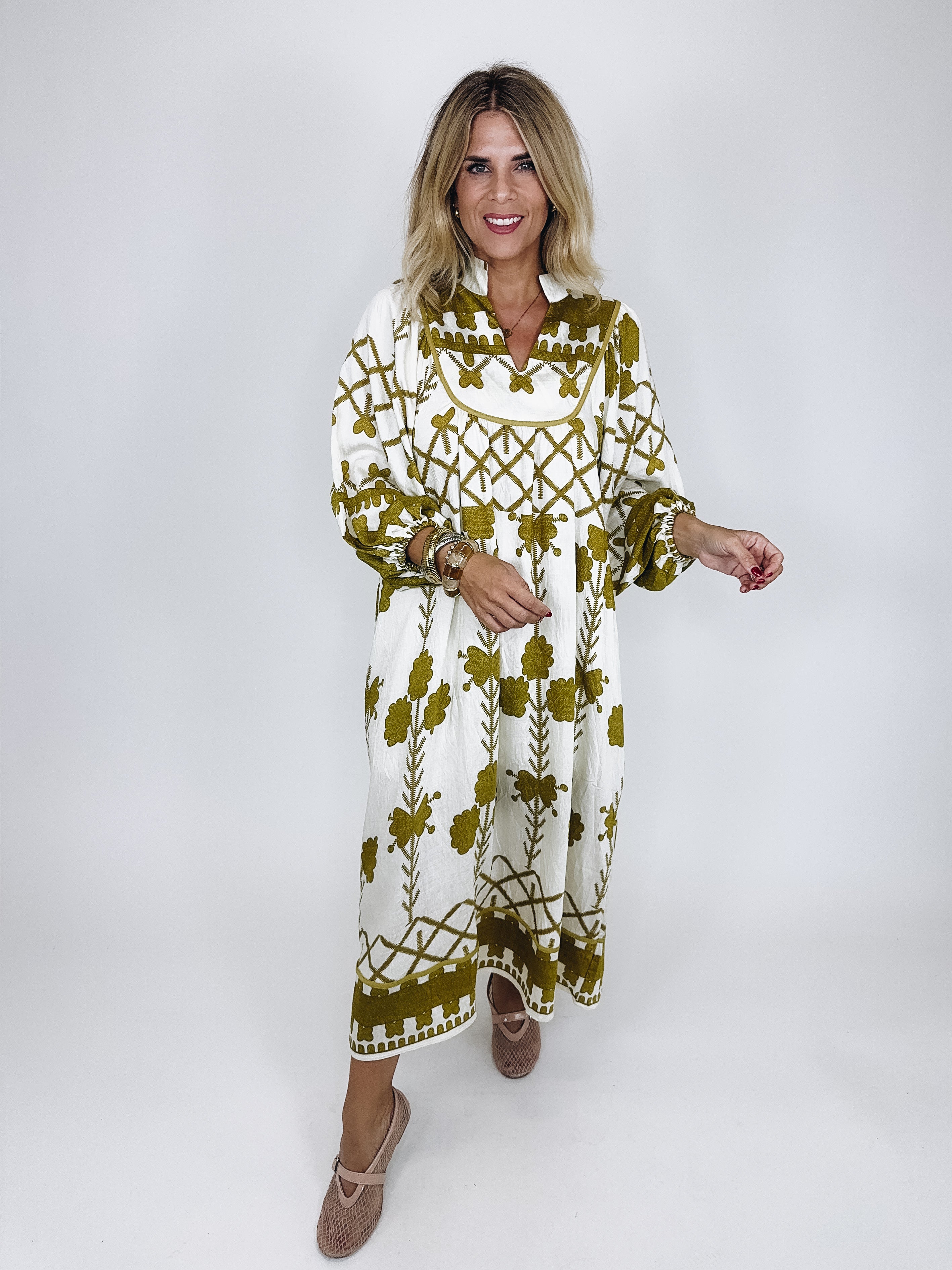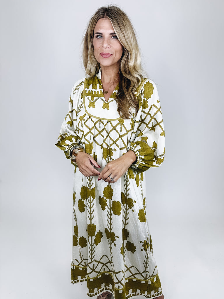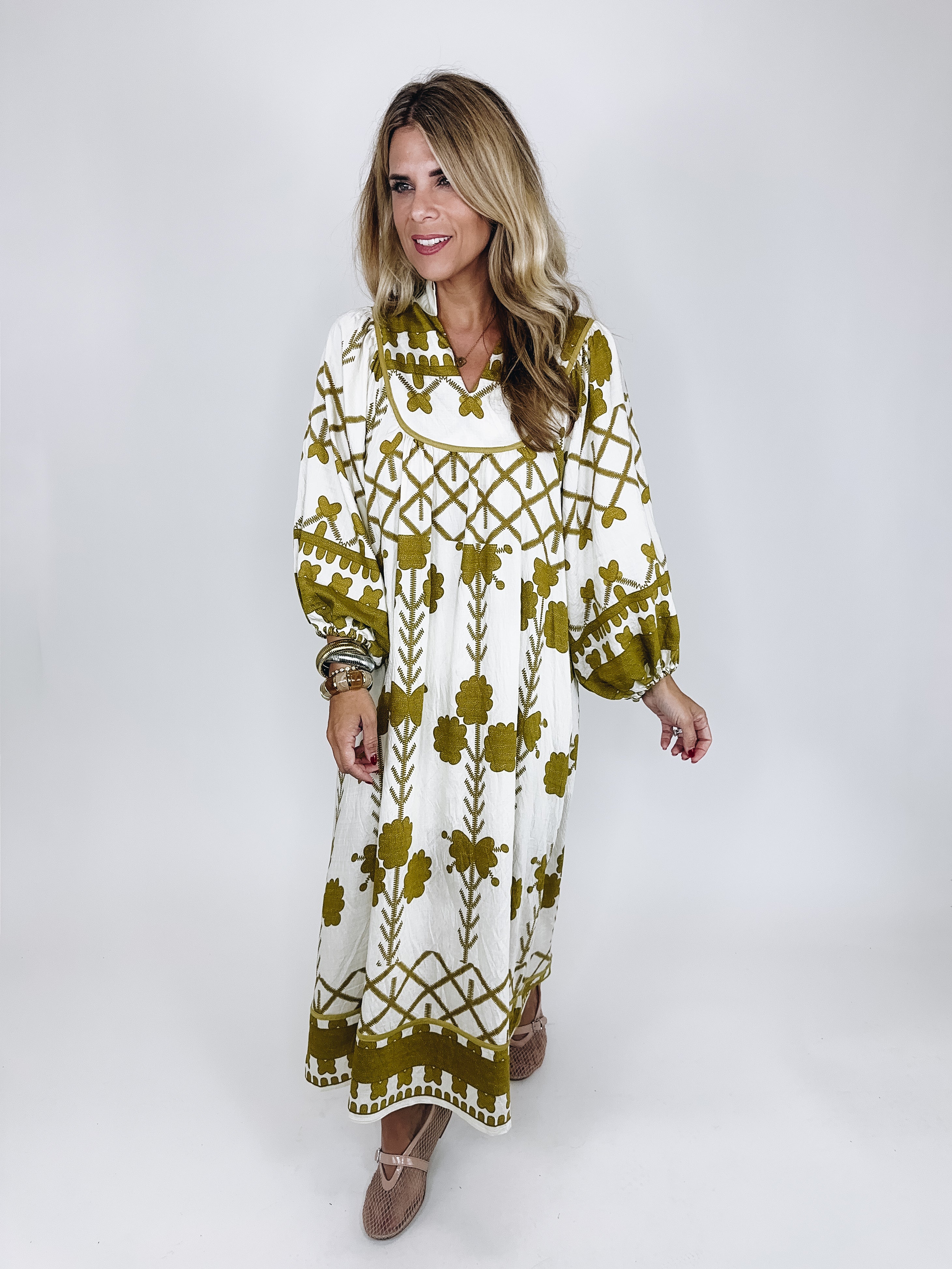 The Essie Dress is a perfect easy to wear dress. This mustard boho print maxi dress features a v-neckline and long balloon sleeves . Style with flats, wedges, heels and sneakers. Fits true to size.