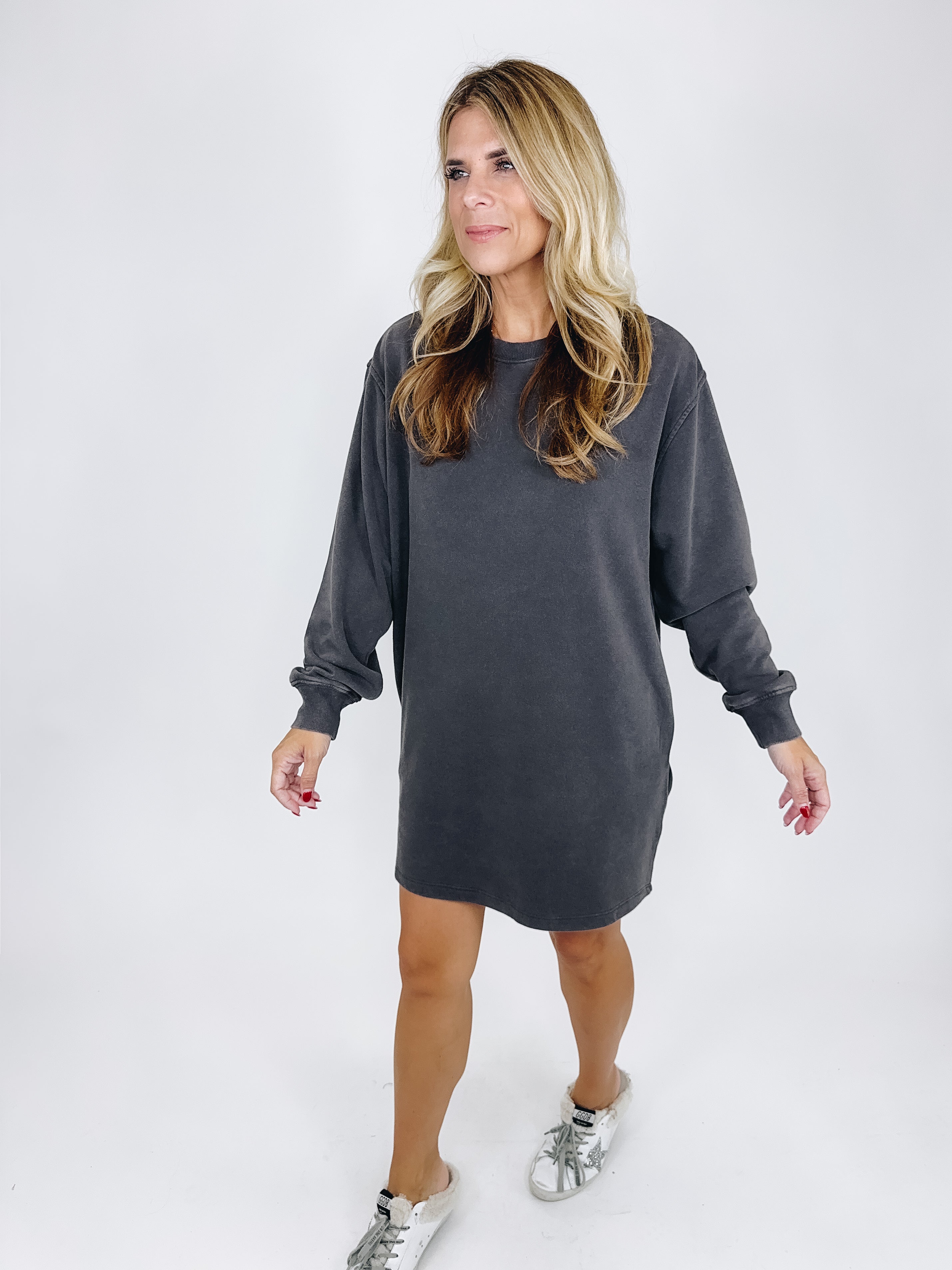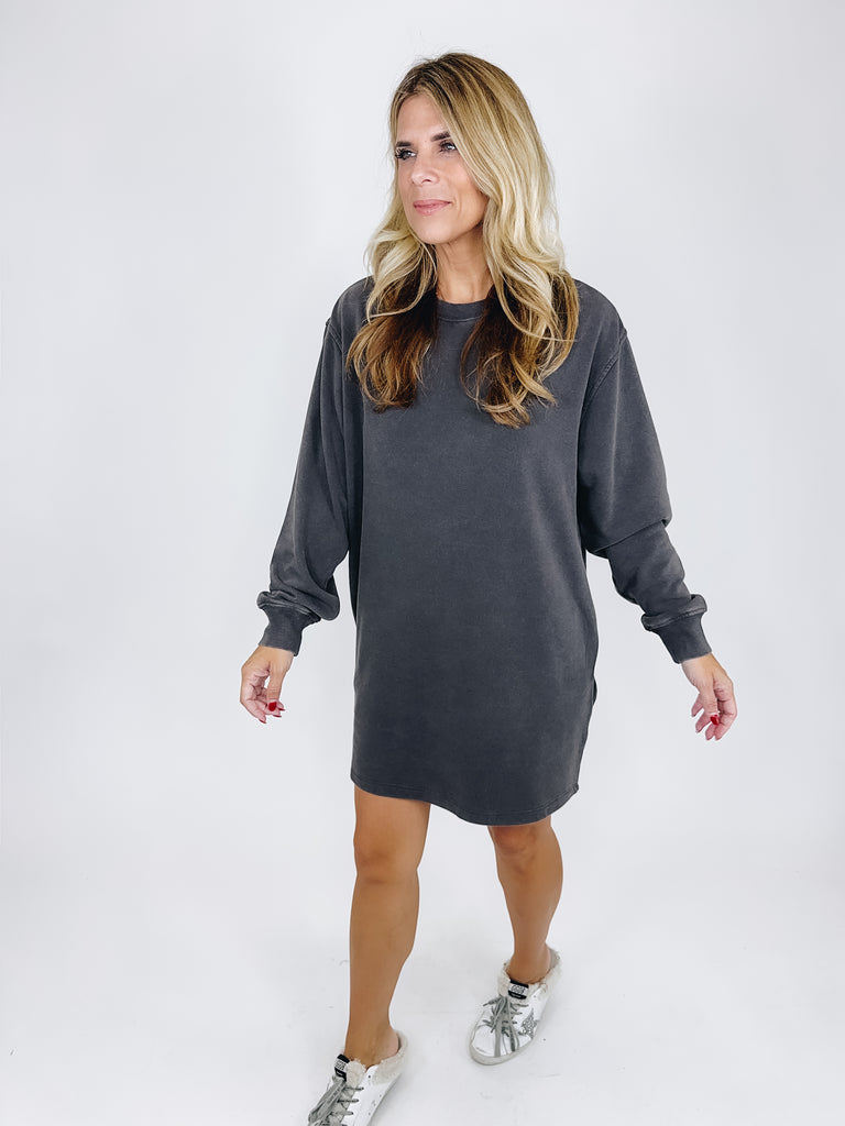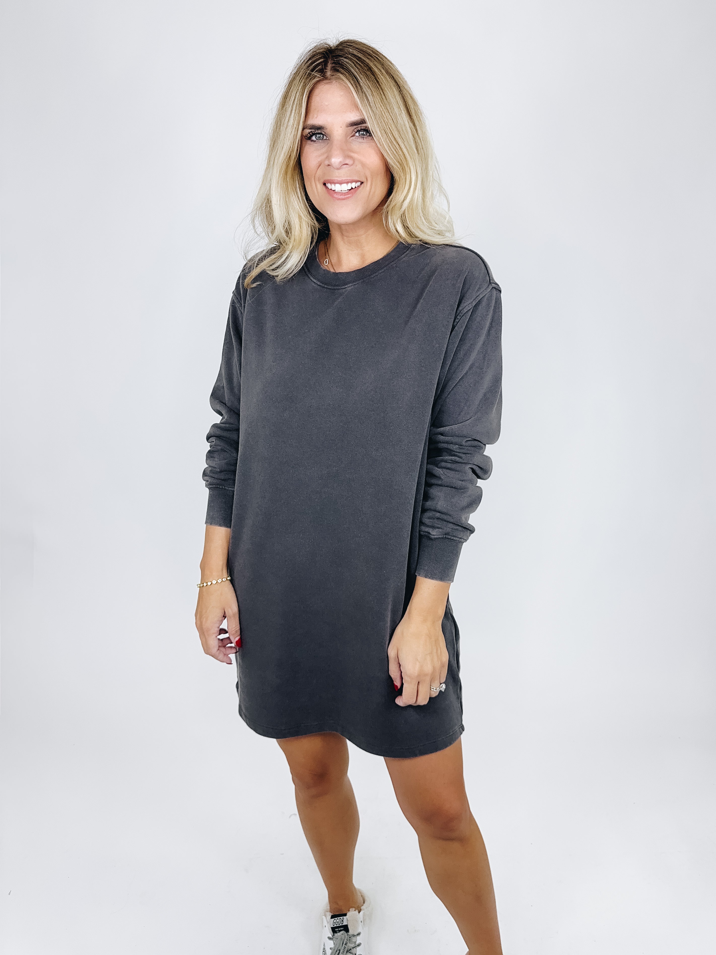 The Ezra Dress is your perfect everyday dress! This mineral wash dusty chocolate lightweight sweatshirt dress features a crew neckline, long drop sleeves, and a long mini length. Style with flats, sneakers or boots. Fits true to size.