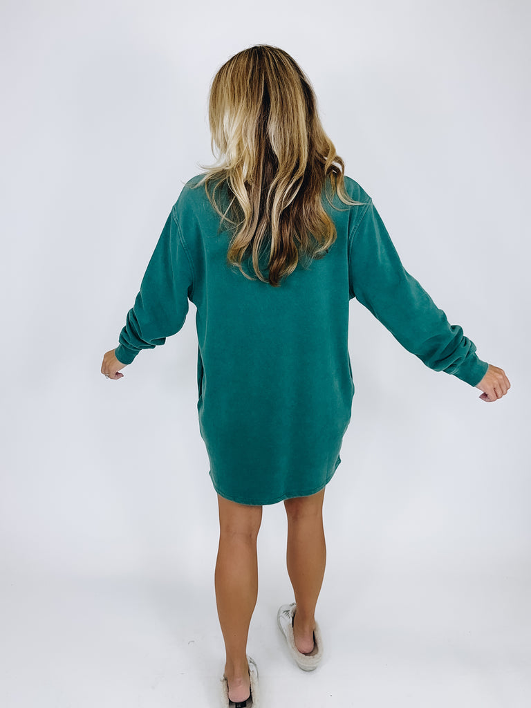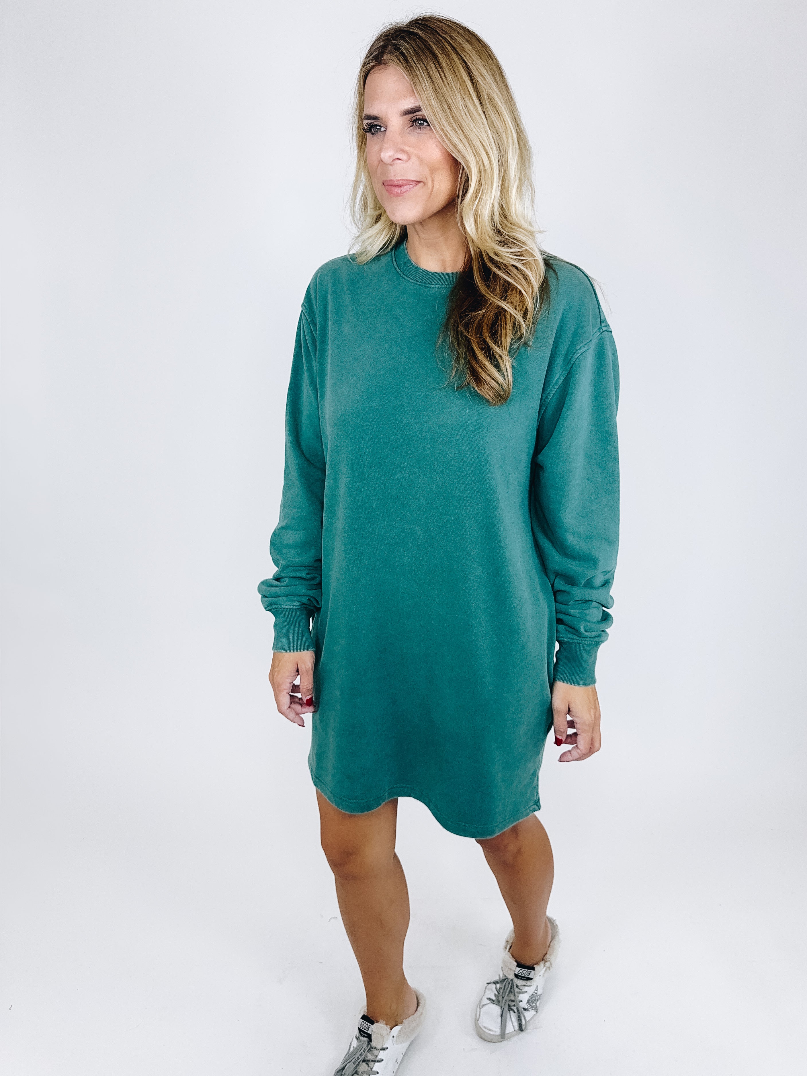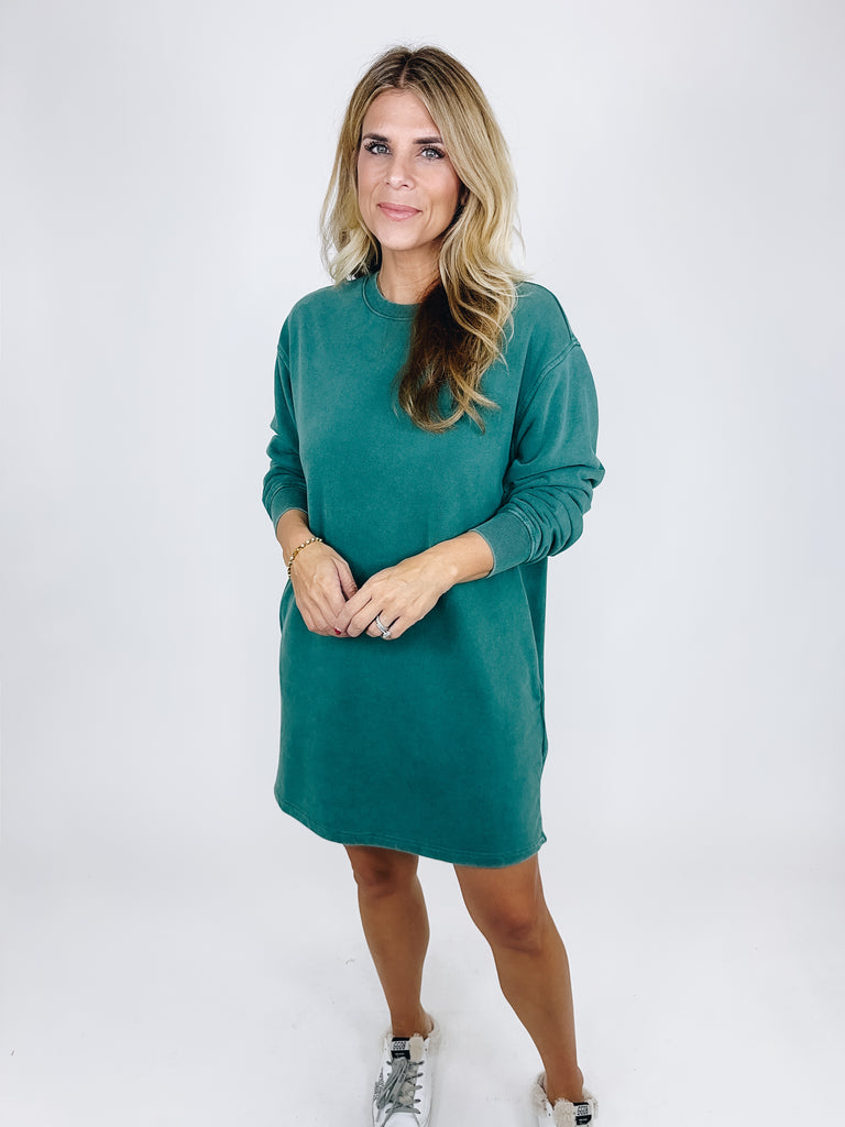 The Ezra Dress is your perfect everyday dress! This mineral wash heather forest green lightweight sweatshirt dress features a crew neckline, long drop sleeves, and a long mini length. Style with flats, sneakers or boots. Fits true to size.