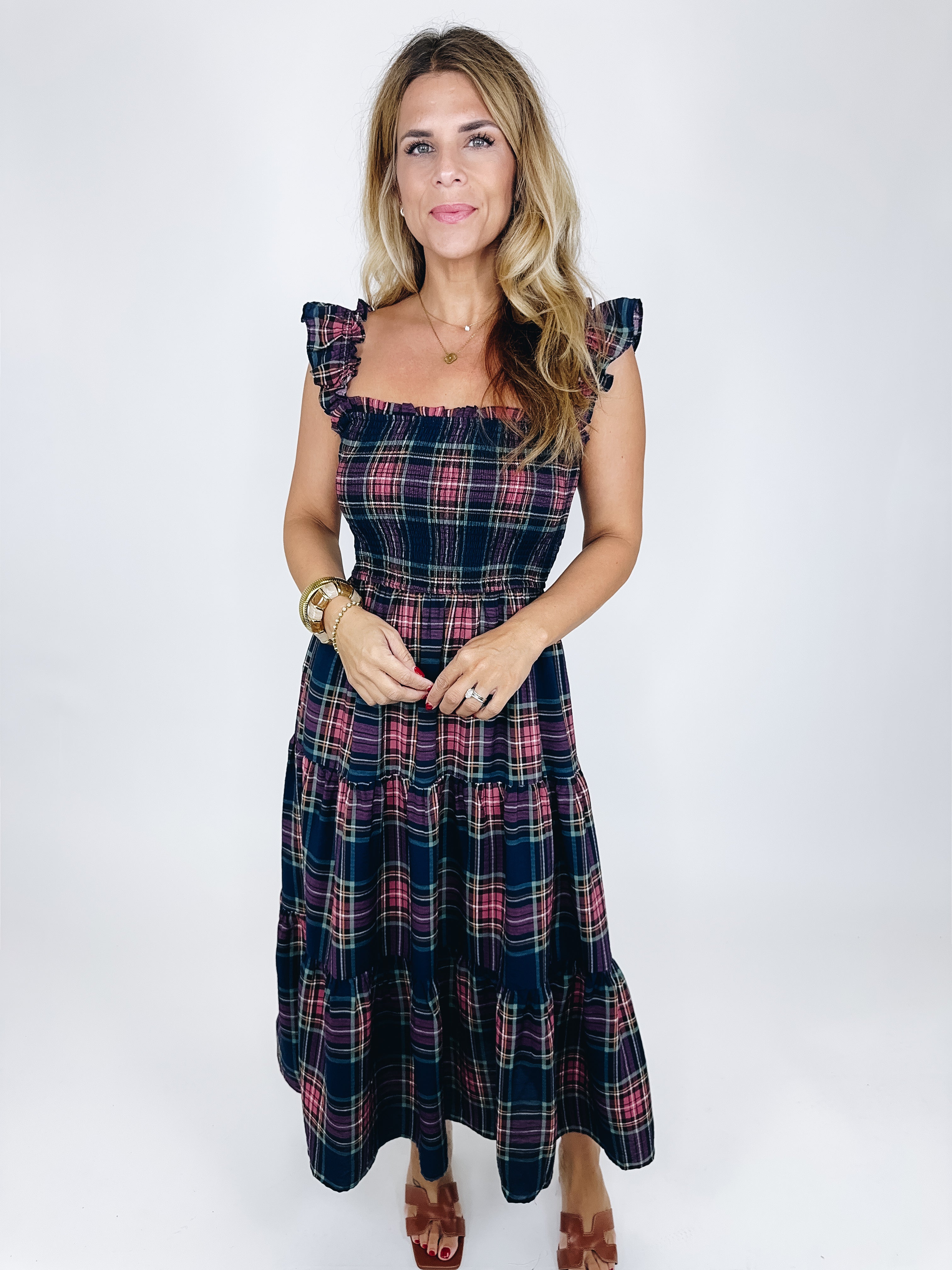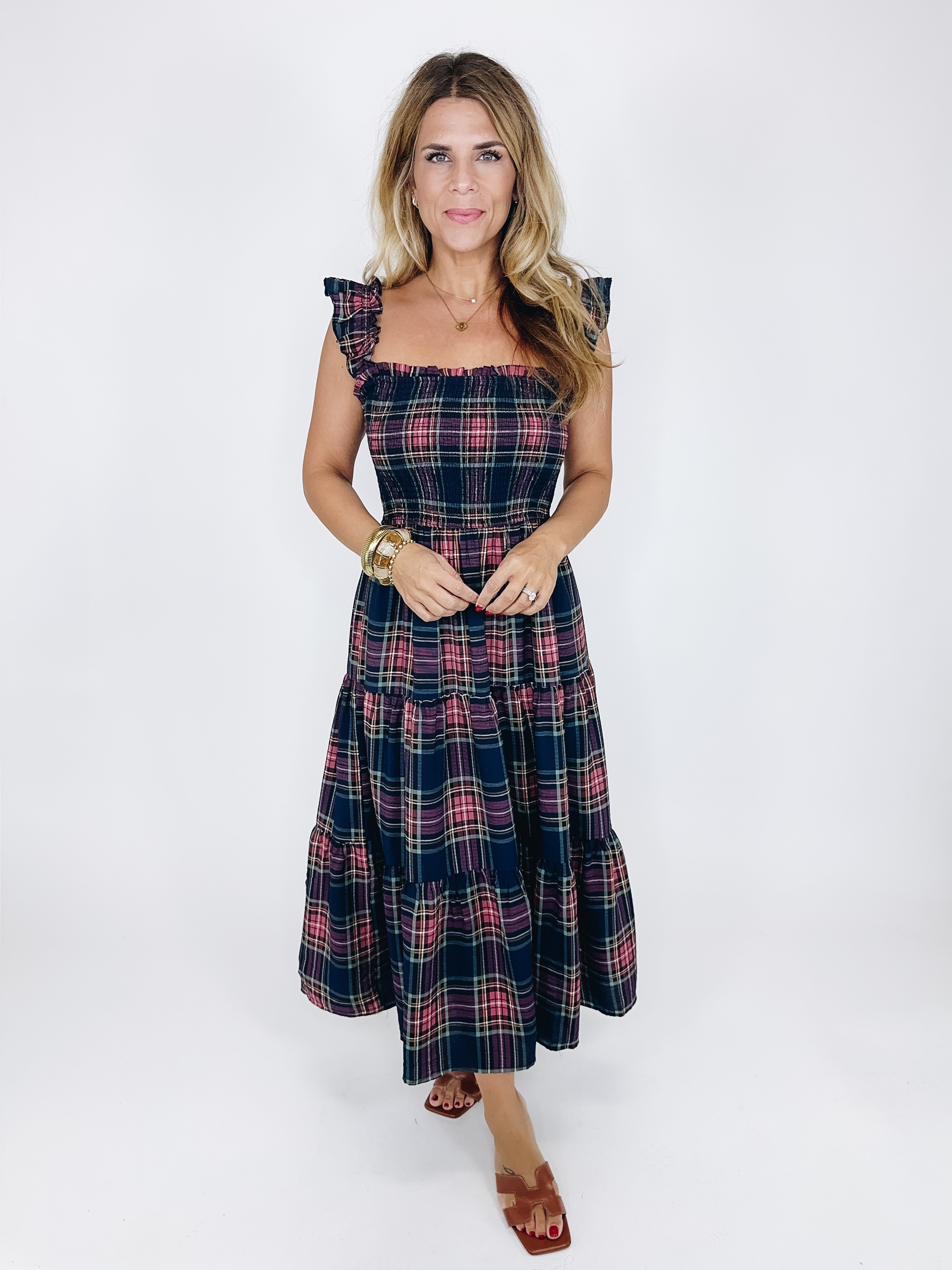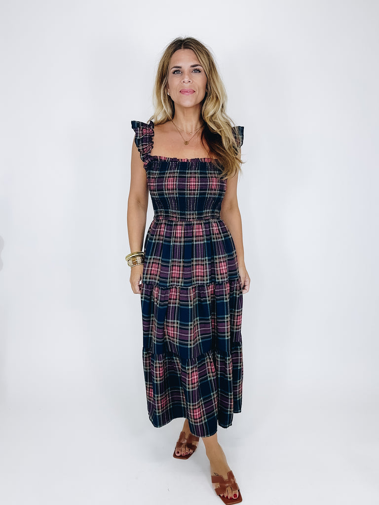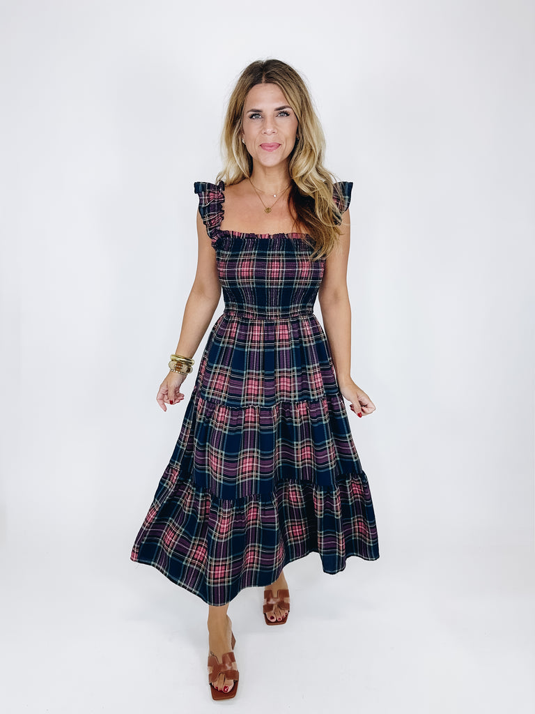 The Harper Dress is darling! This navy plaid midi dress features a smocked bodice, flutter sleeves and ruffle hem. Lined. Style with flat sandals, wedges and even sneakers! Dress up or down. Fits true to size.