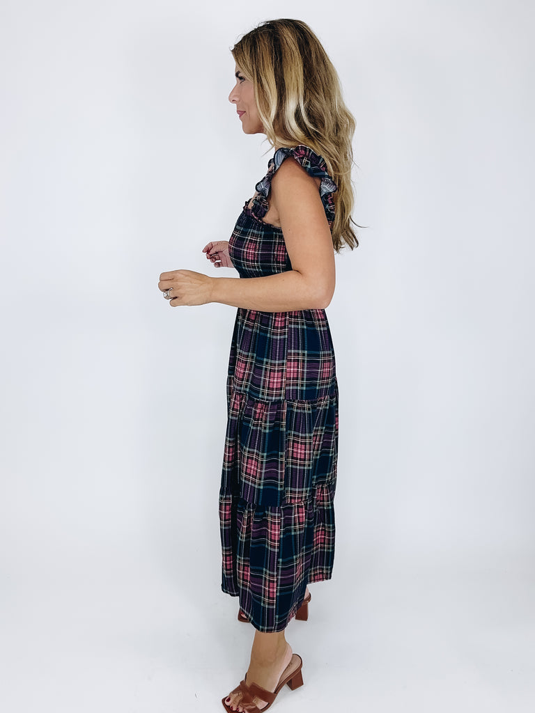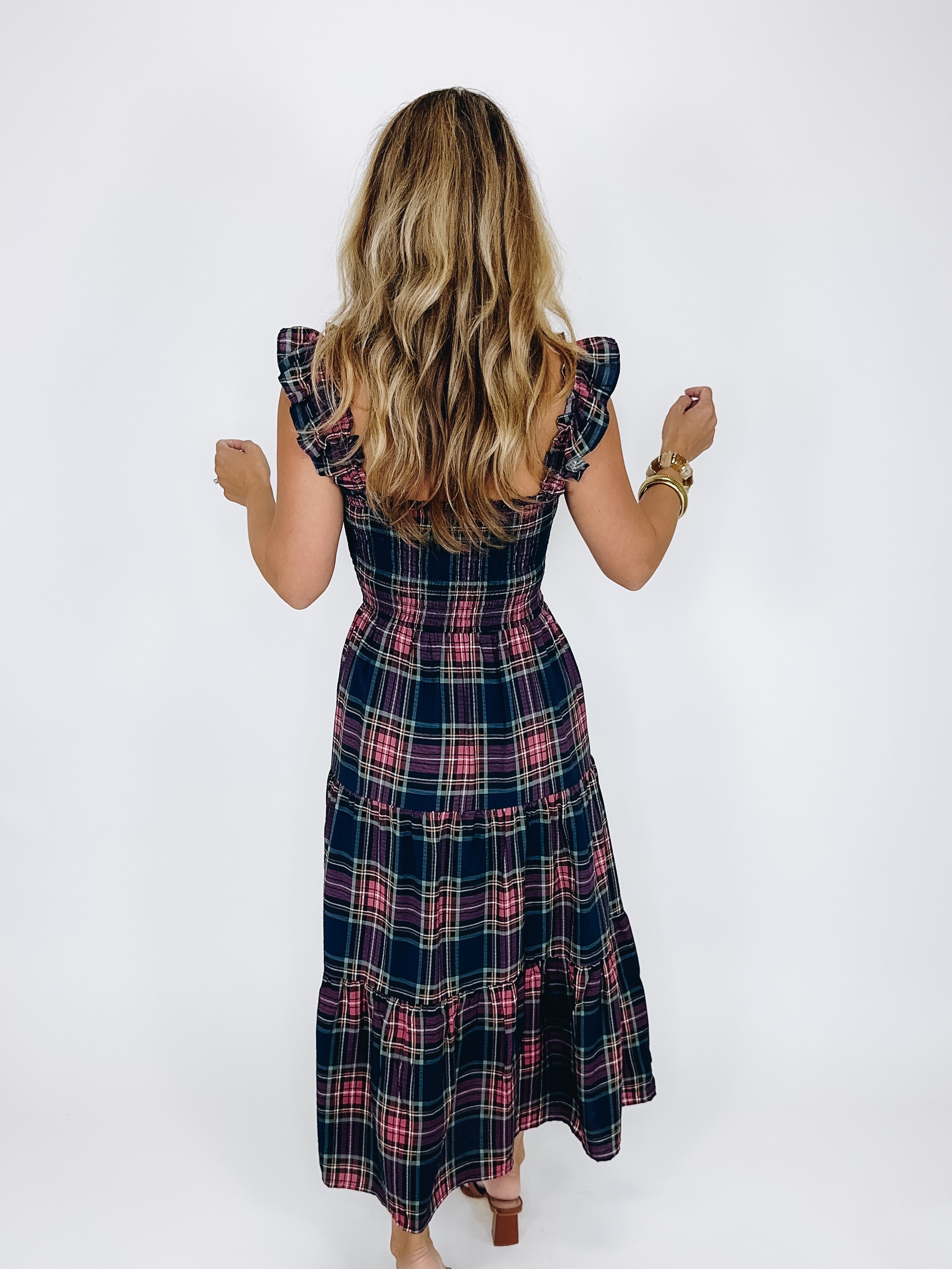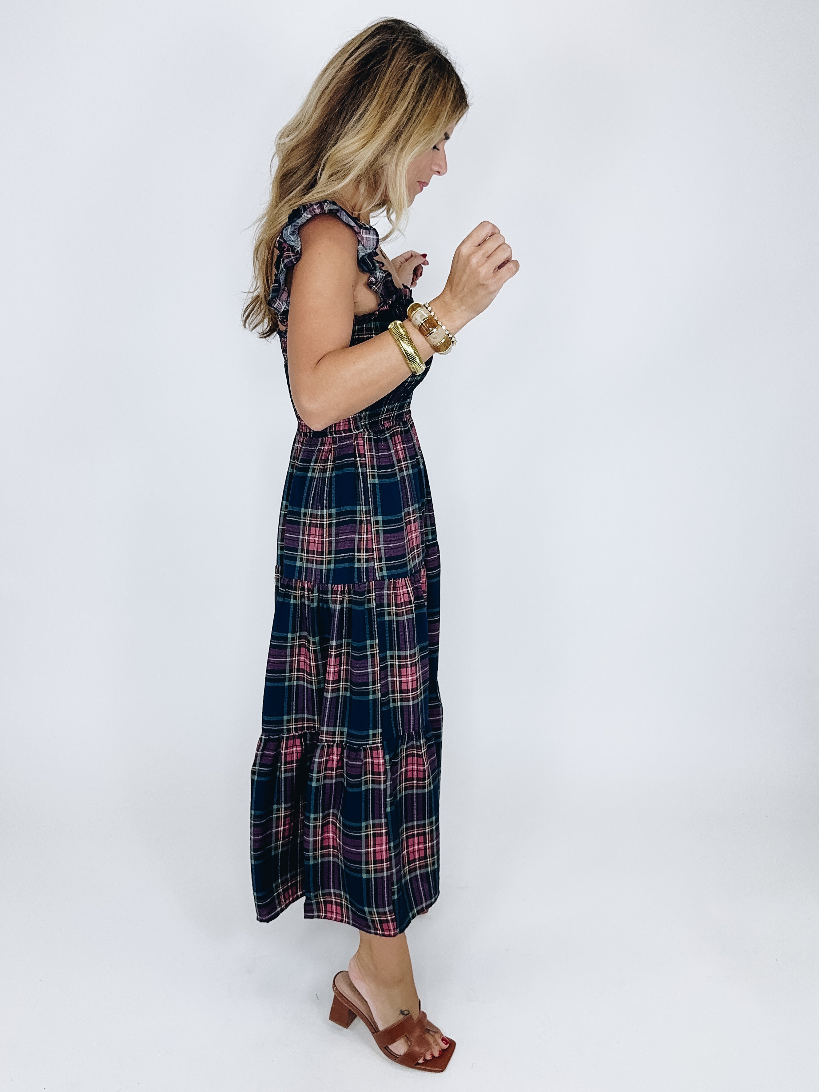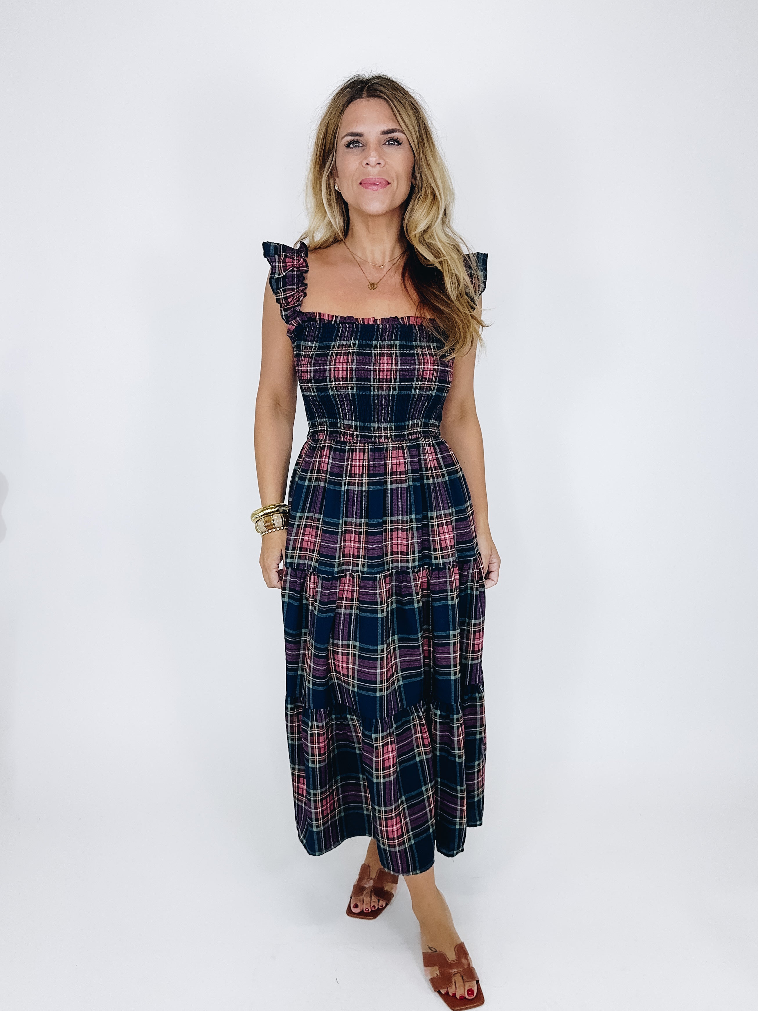 The Harper Dress is darling! This navy plaid midi dress features a smocked bodice, flutter sleeves and ruffle hem. Lined. Style with flat sandals, wedges and even sneakers! Dress up or down. Fits true to size.