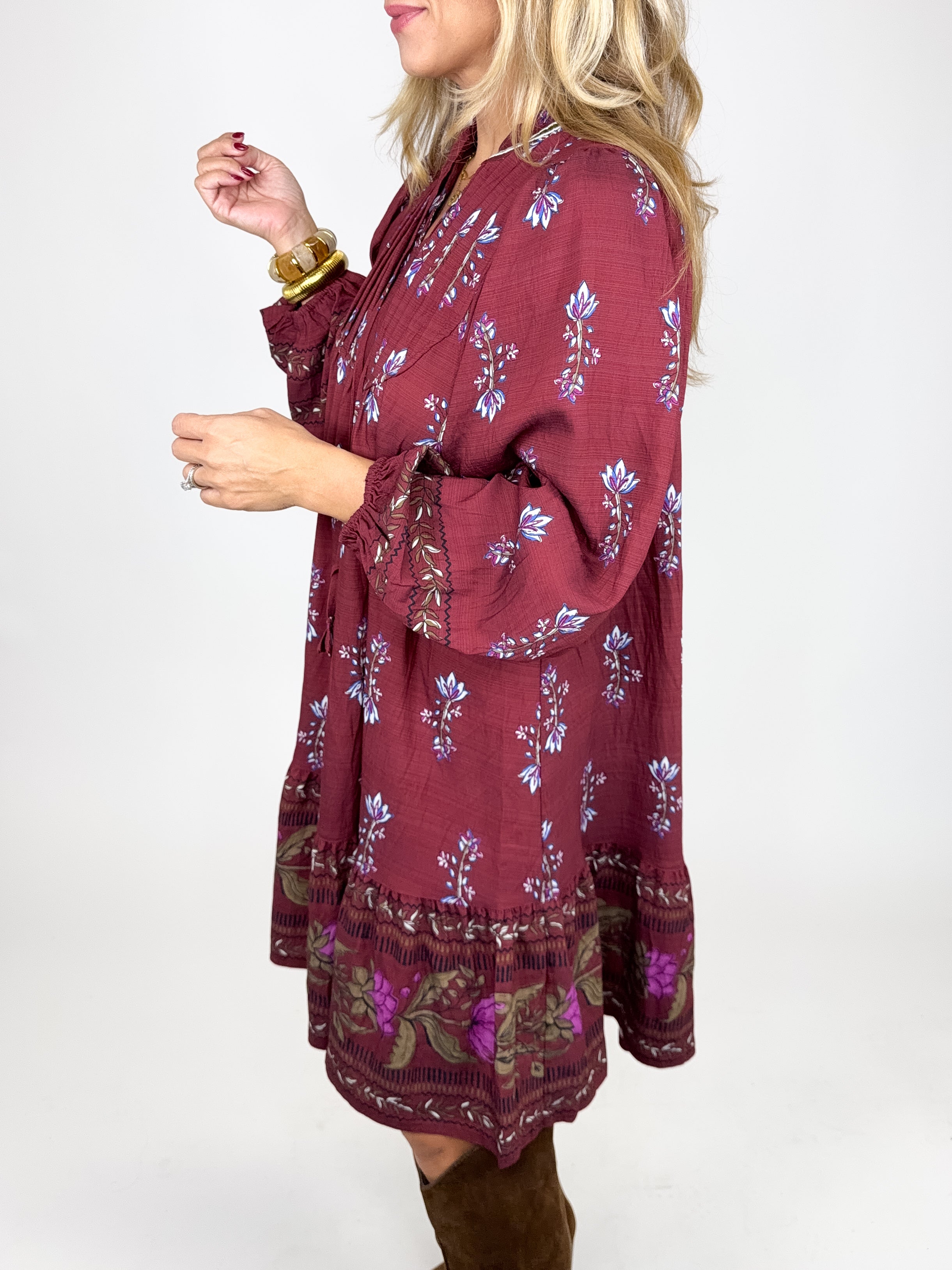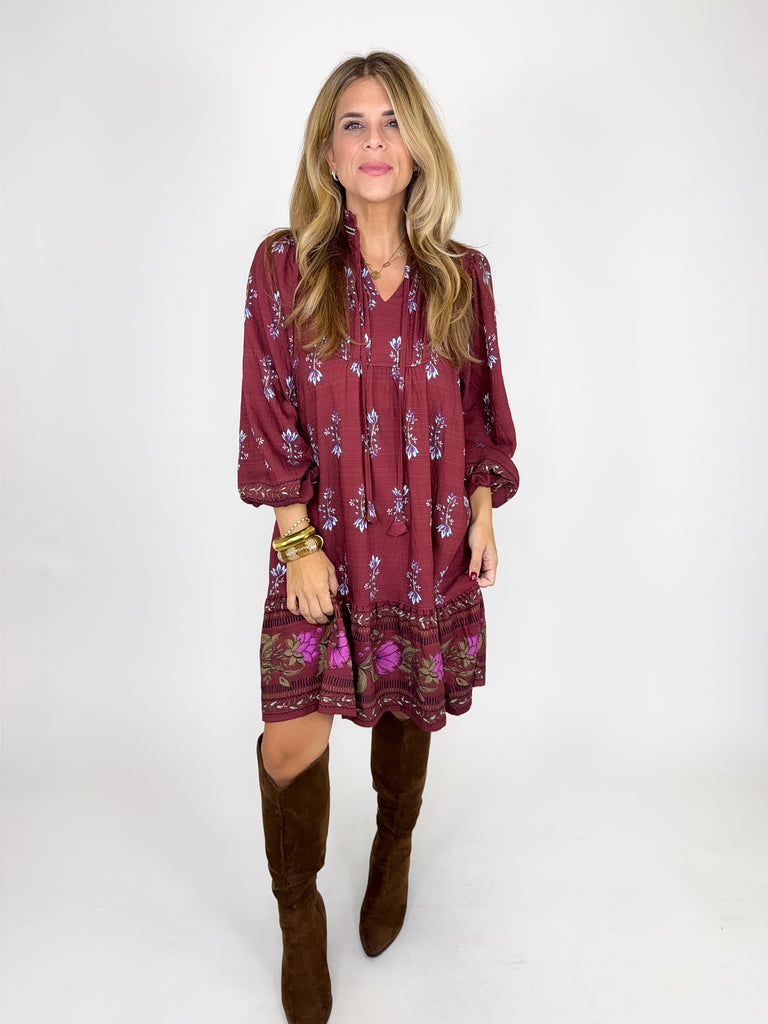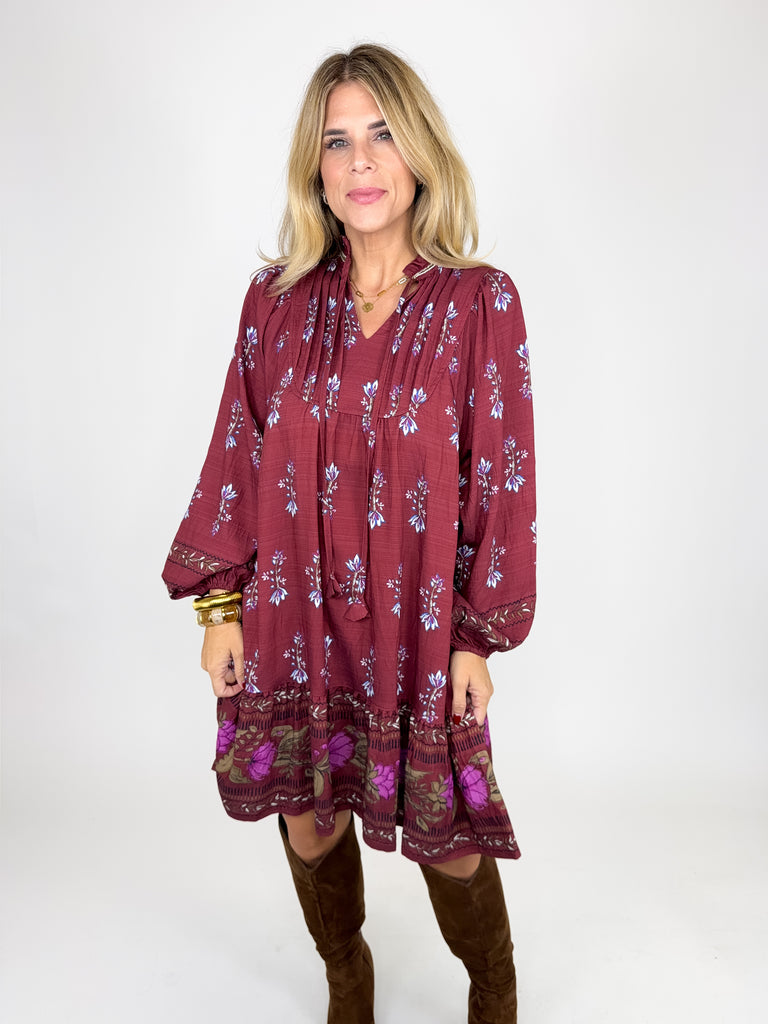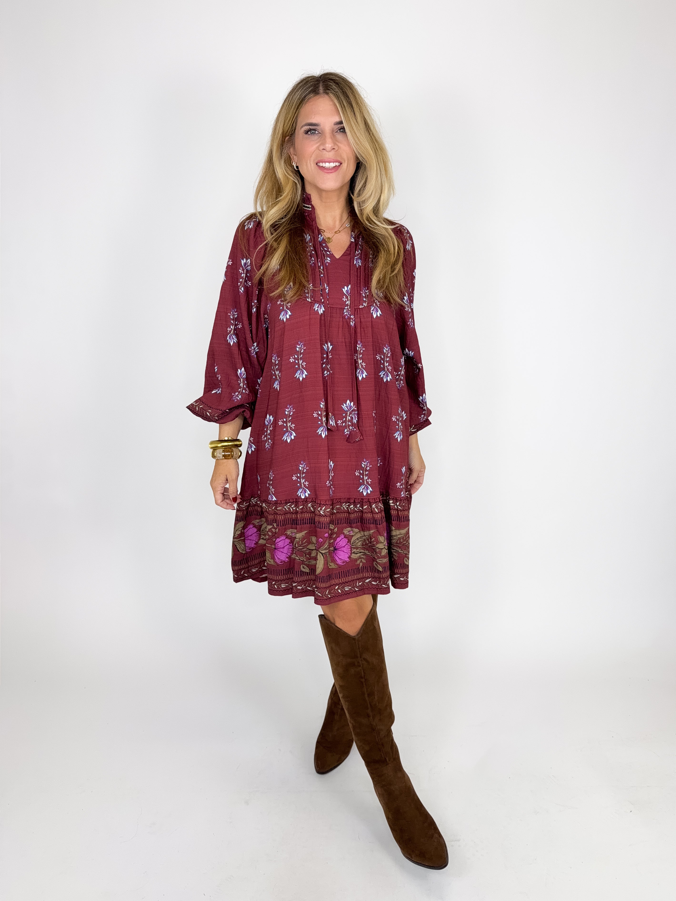 The Jessie Dress is a darling mini dress. This burgundy dress features a floral block print, pin tucked bodice, notched neck with tassel ties, long balloon sleeves and a flowy tier hem. Style with flats, heels, wedges, boots, sandals and even sneakers! Dress up or down. Fits true to size.