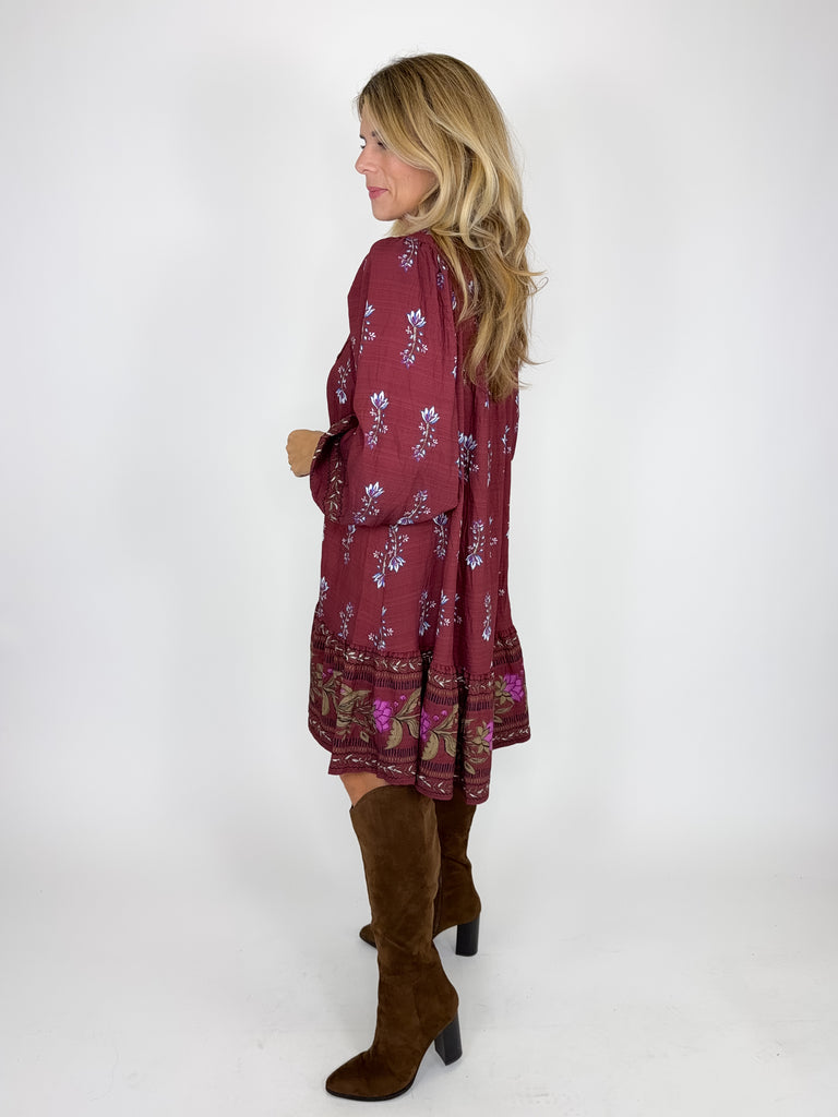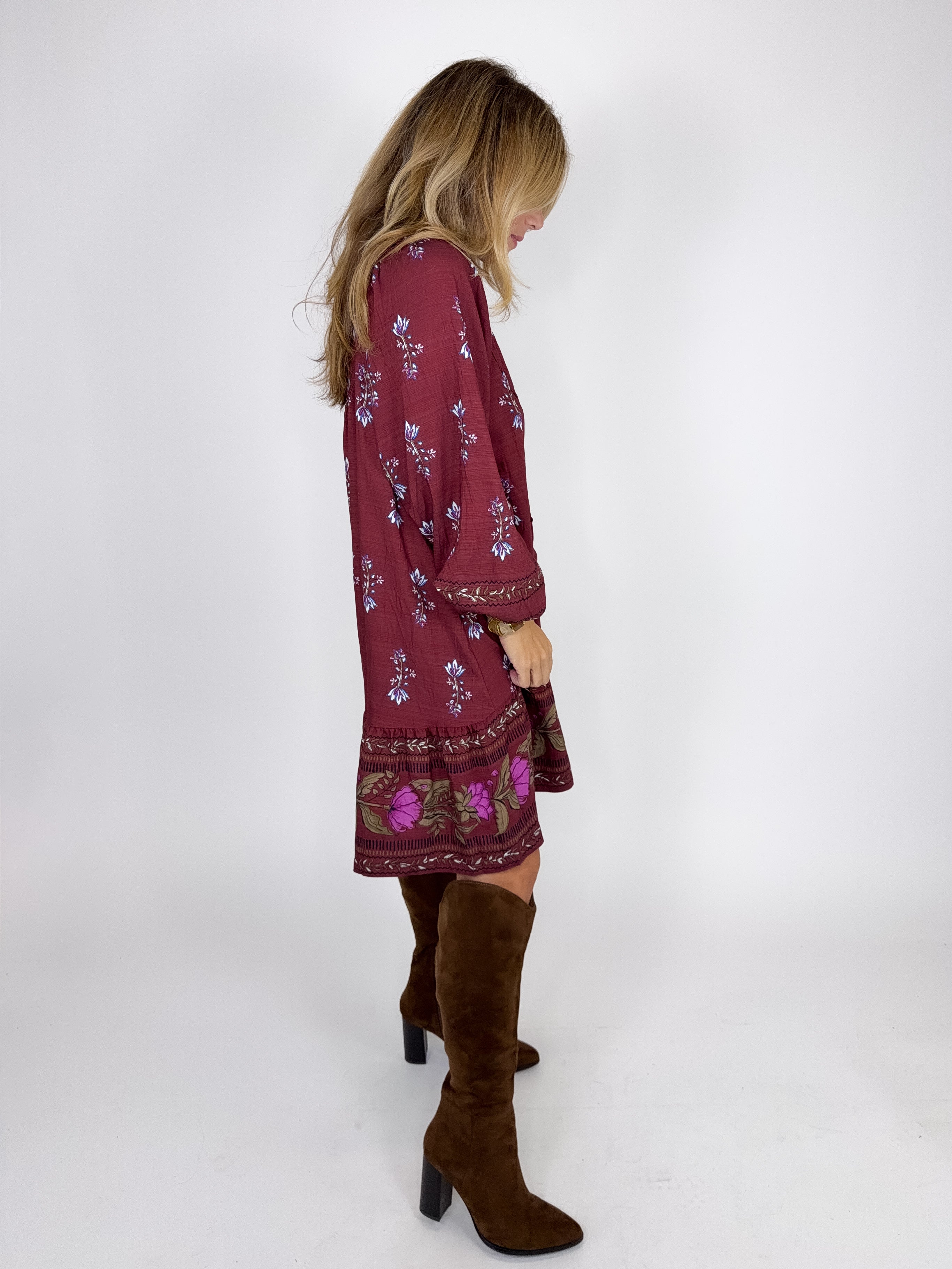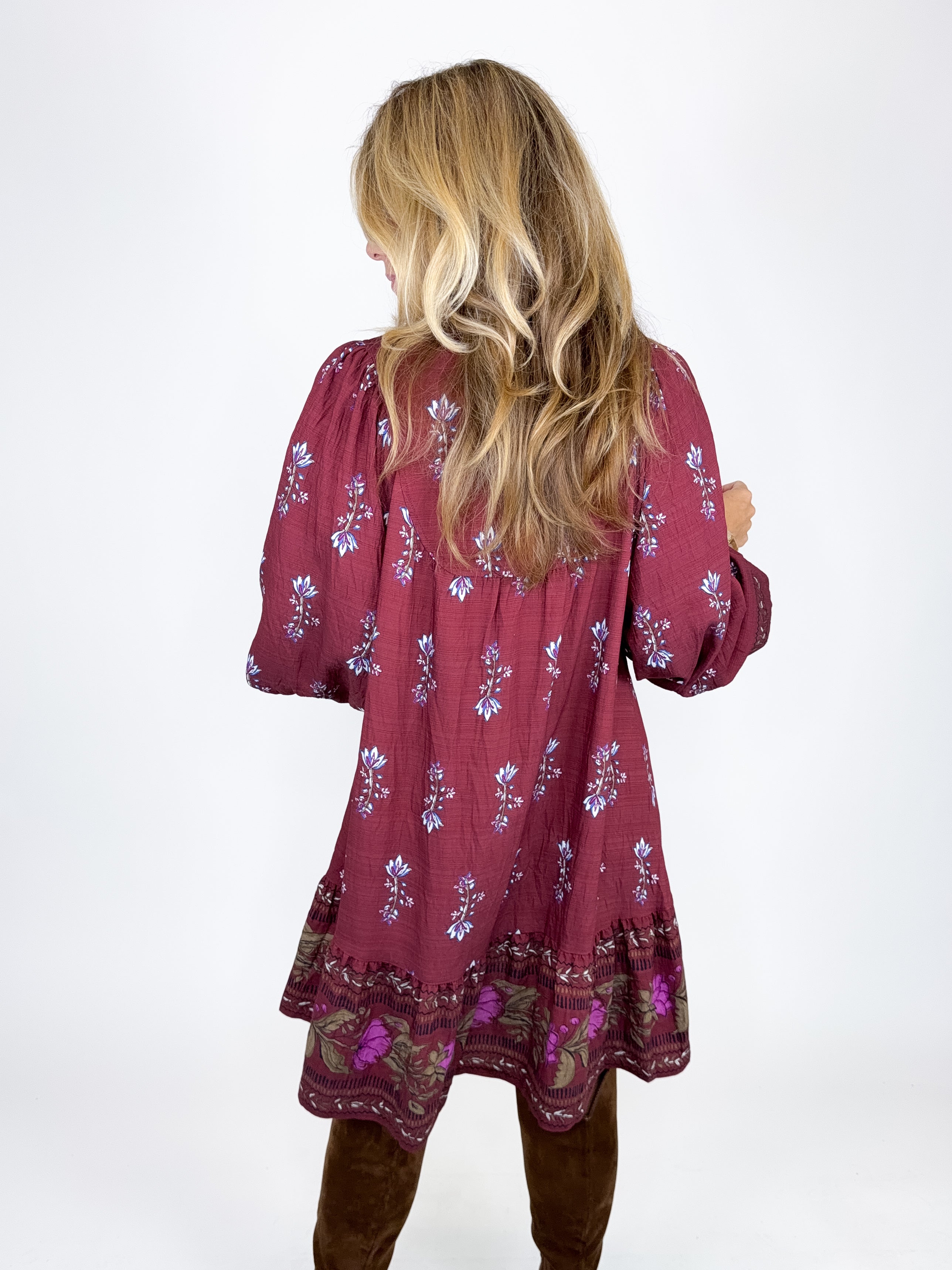 The Jessie Dress is a darling mini dress. This burgundy dress features a floral block print, pin tucked bodice, notched neck with tassel ties, long balloon sleeves and a flowy tier hem. Style with flats, heels, wedges, boots, sandals and even sneakers! Dress up or down. Fits true to size.