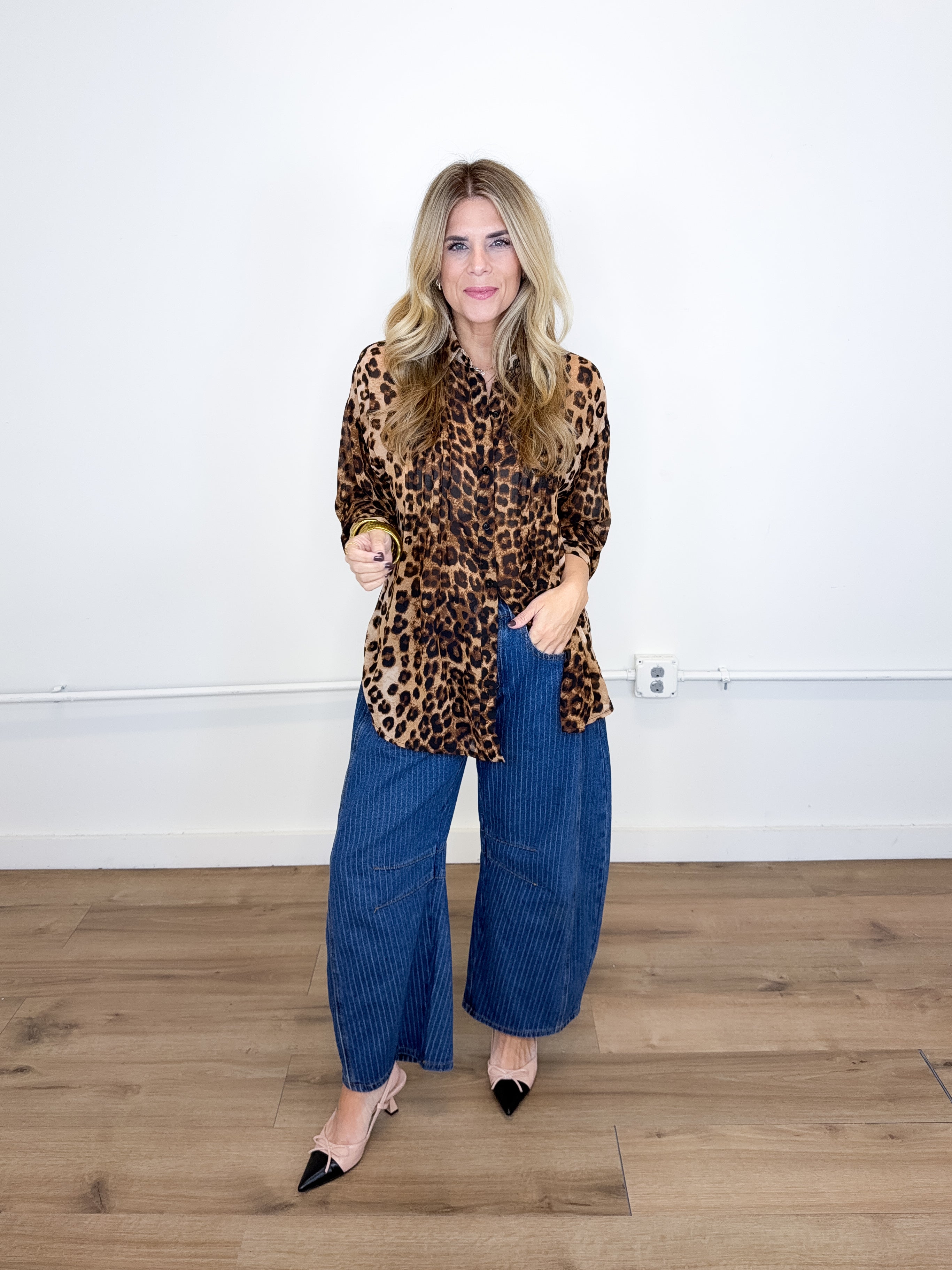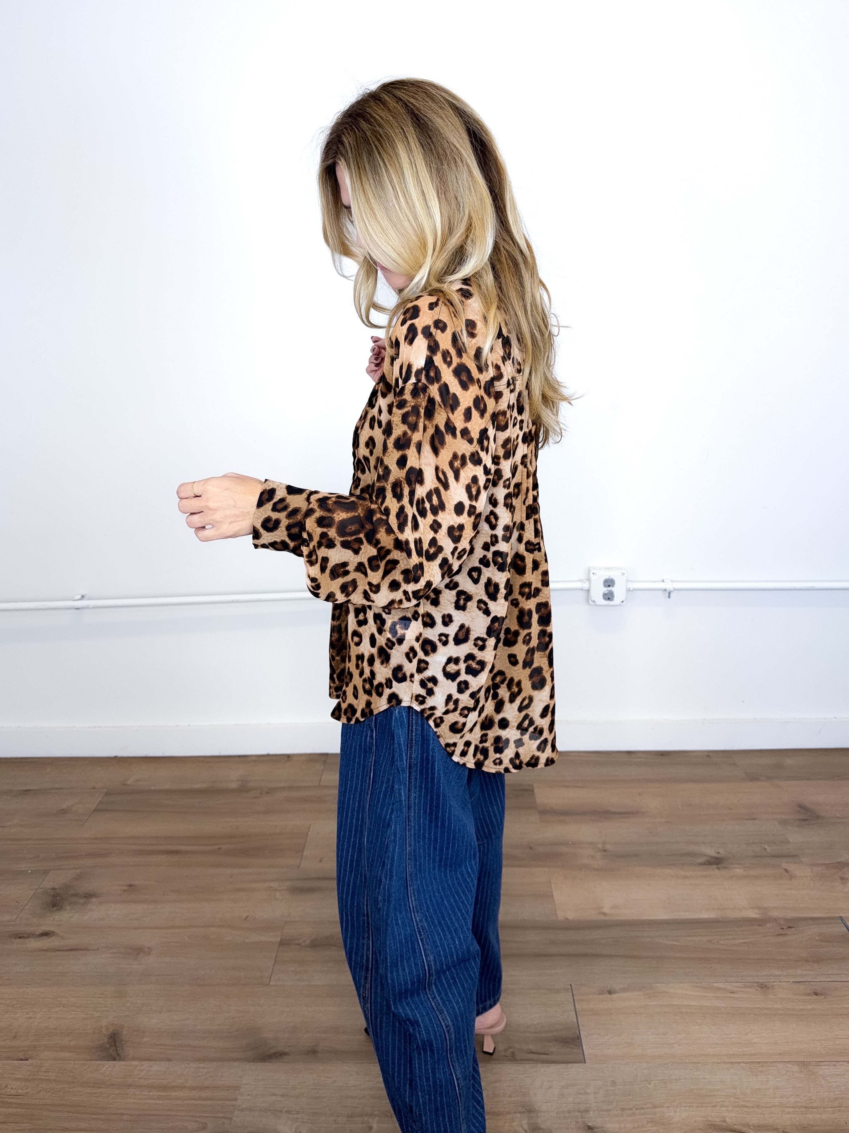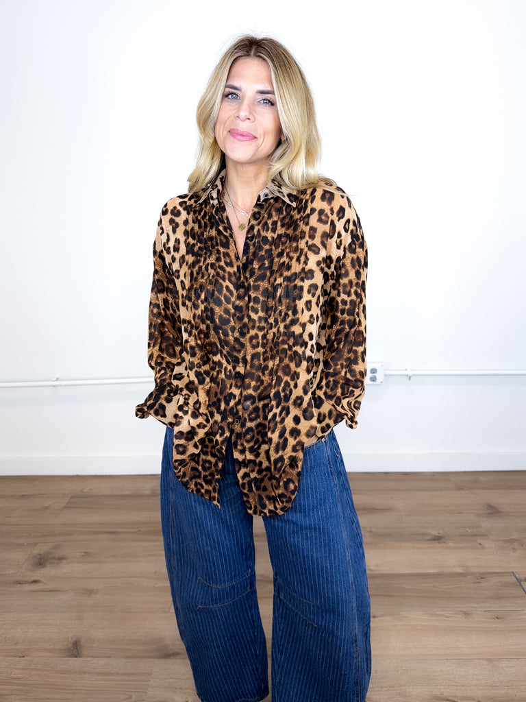 The Joey Top is the perfect top! This leopard print button up features a button front with a collar and pleated details on chest. Pairs well with everything from denim, flats, heels, dress pants, skirts and more!  Fits true to size.