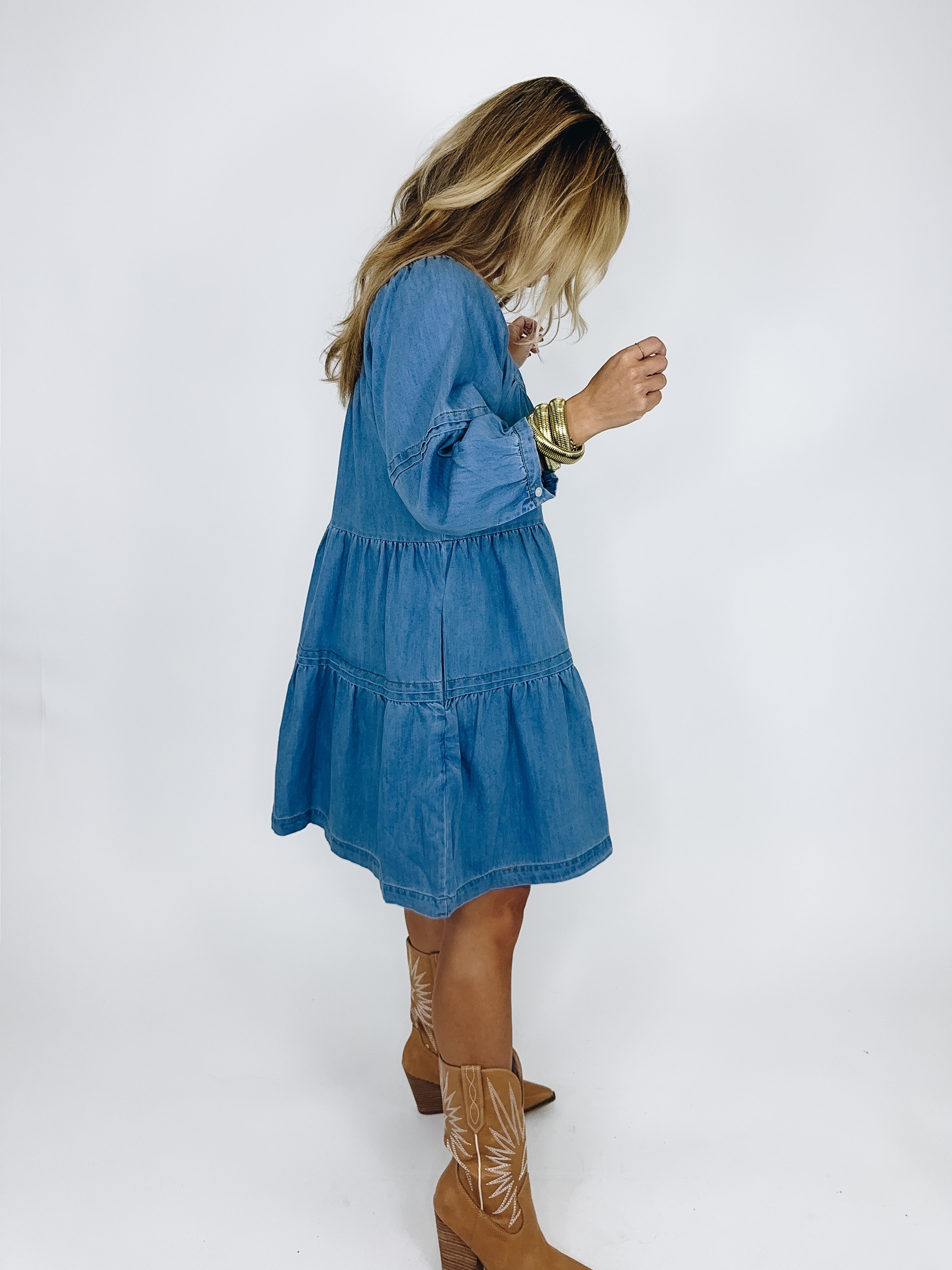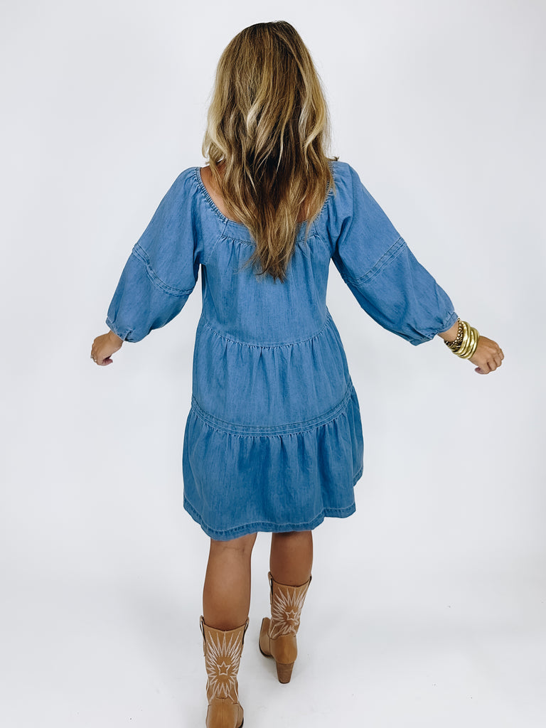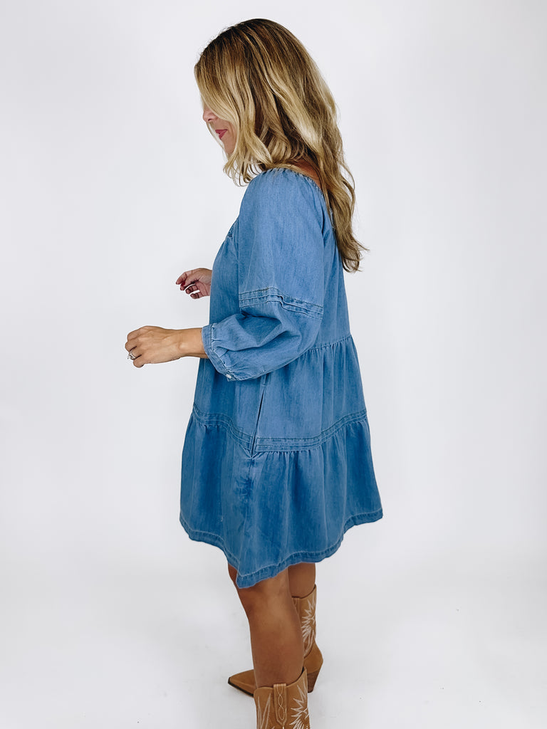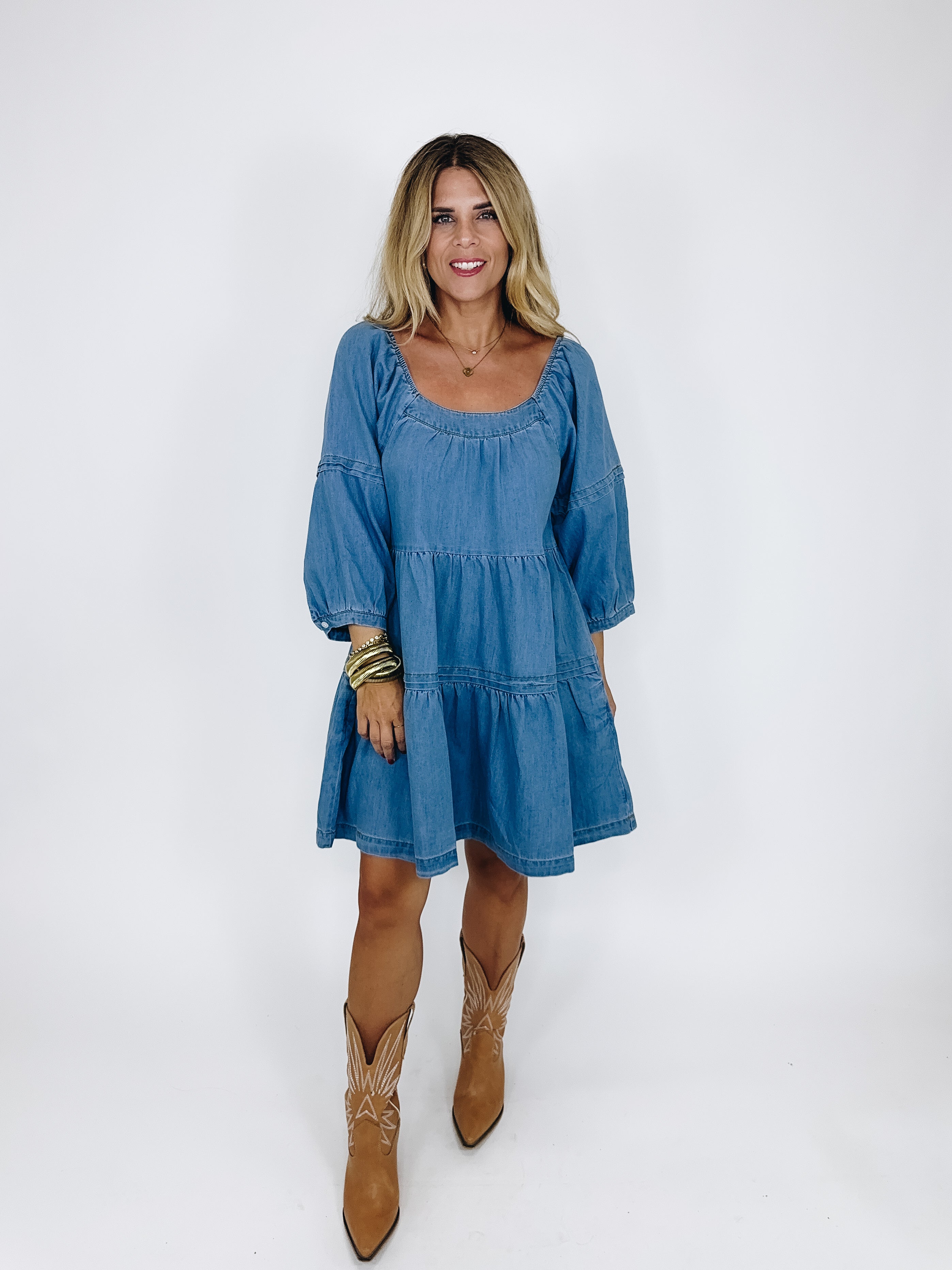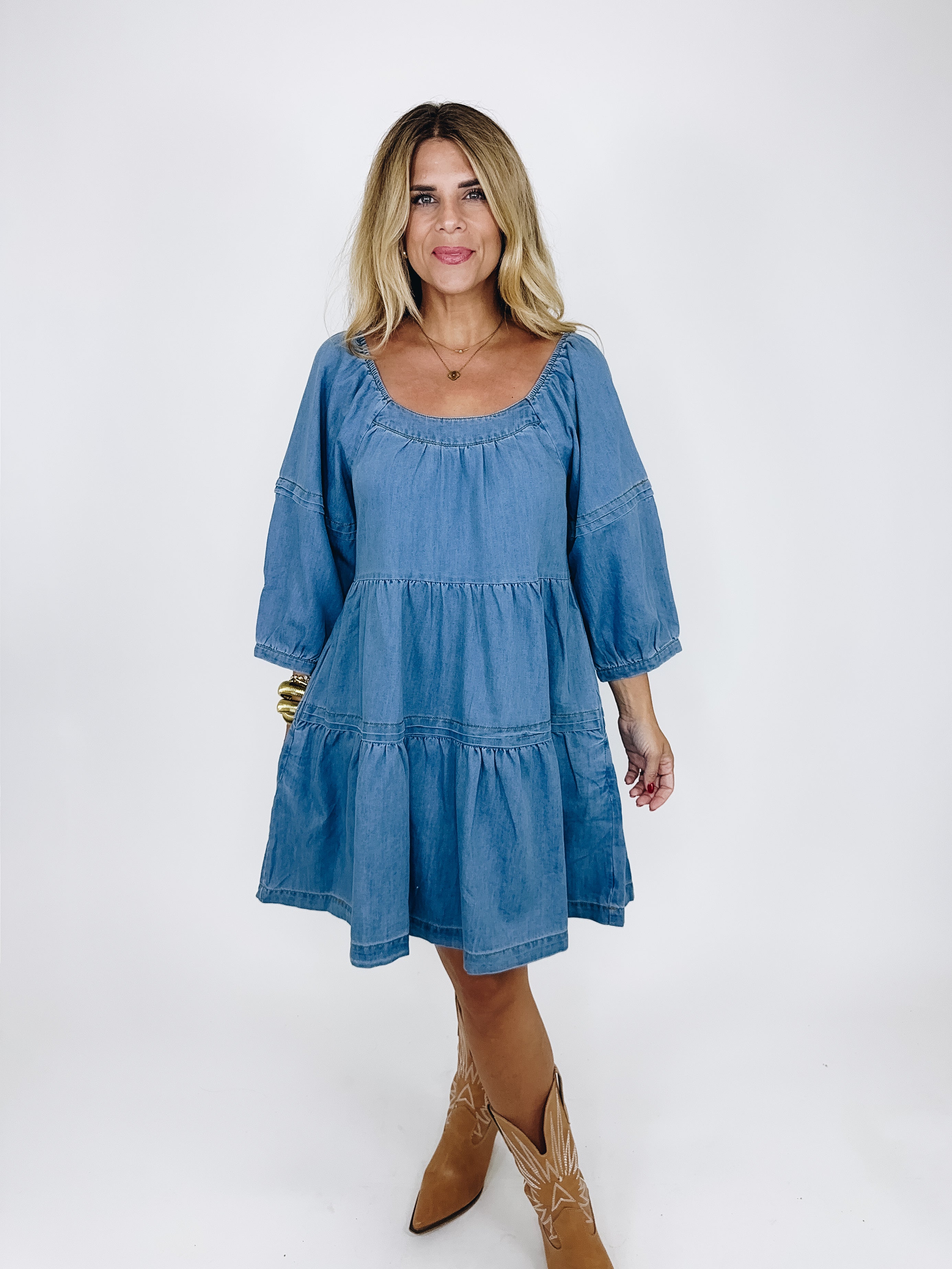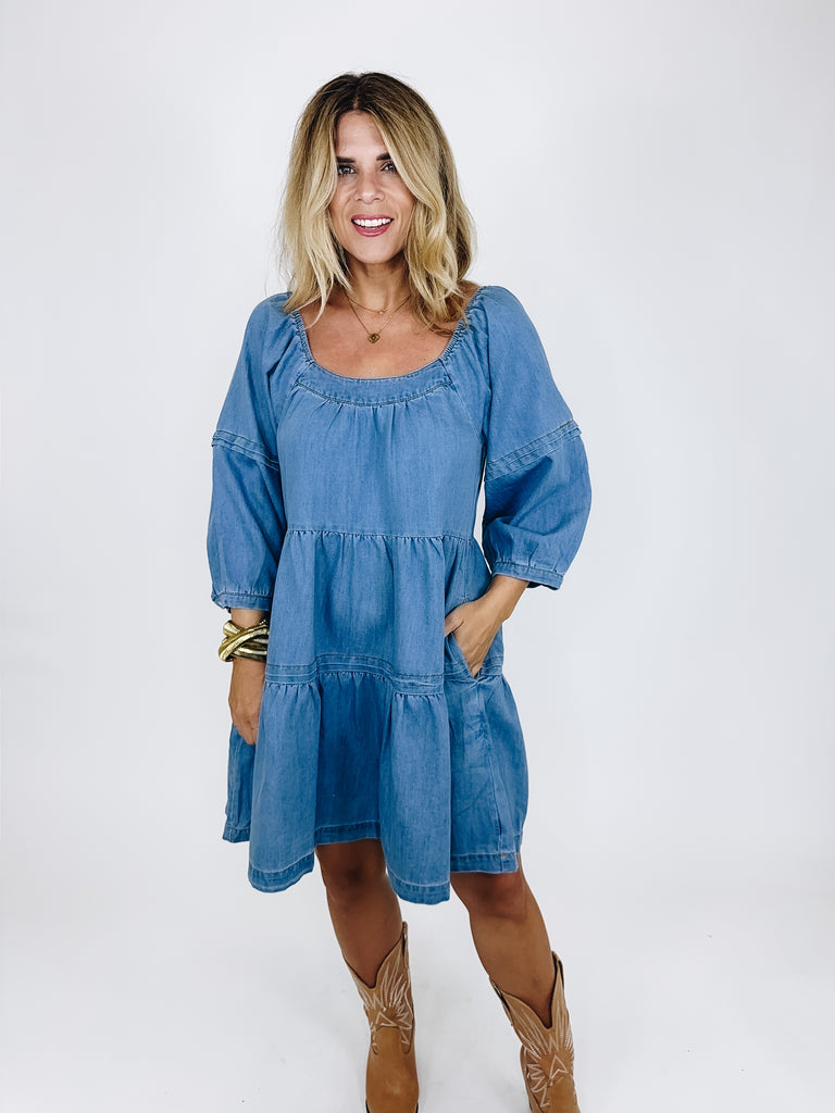 The Juniper Dress is darling! This medium wash denim dress features a square neckline, 3/4 length sleeves and a tiered skirt. Pockets. Style with flats, heels, sneakers or sandals. Fits true to size.