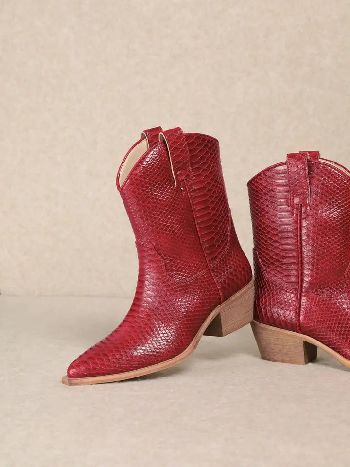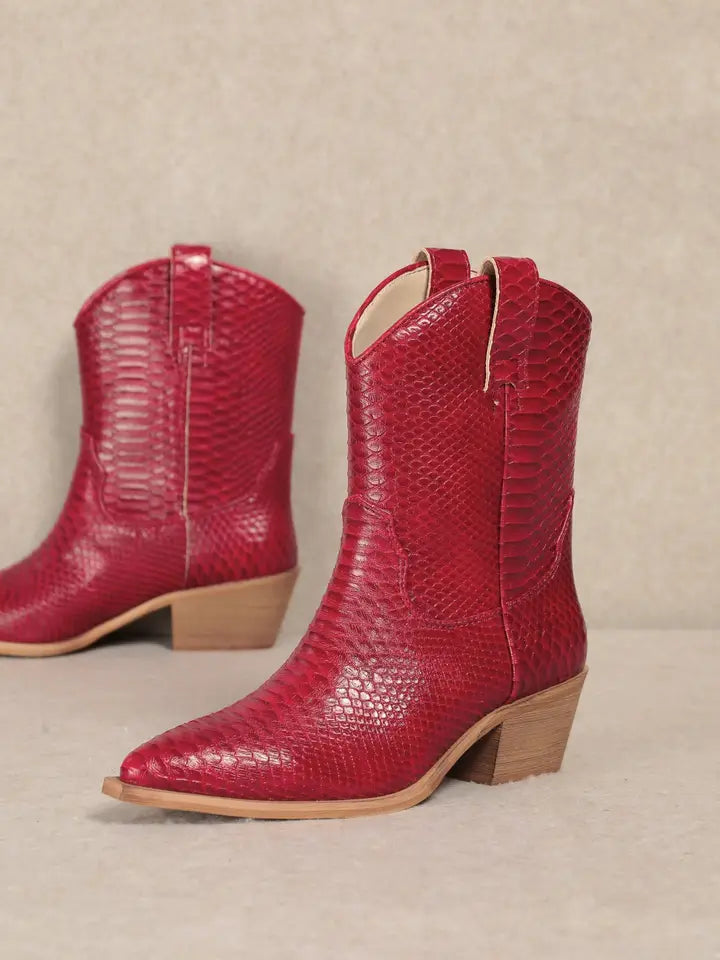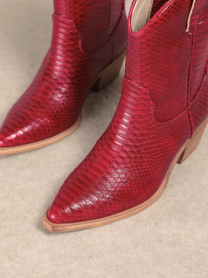 Our Karlie Booties in red are the perfect Fall boot to add to your collection! These western style boots feature a slip on style and python leather details. Pair them with everything from jeans to dresses to skirts to shorts. 2" heel. Padded Insole Sole. Fit true to size.