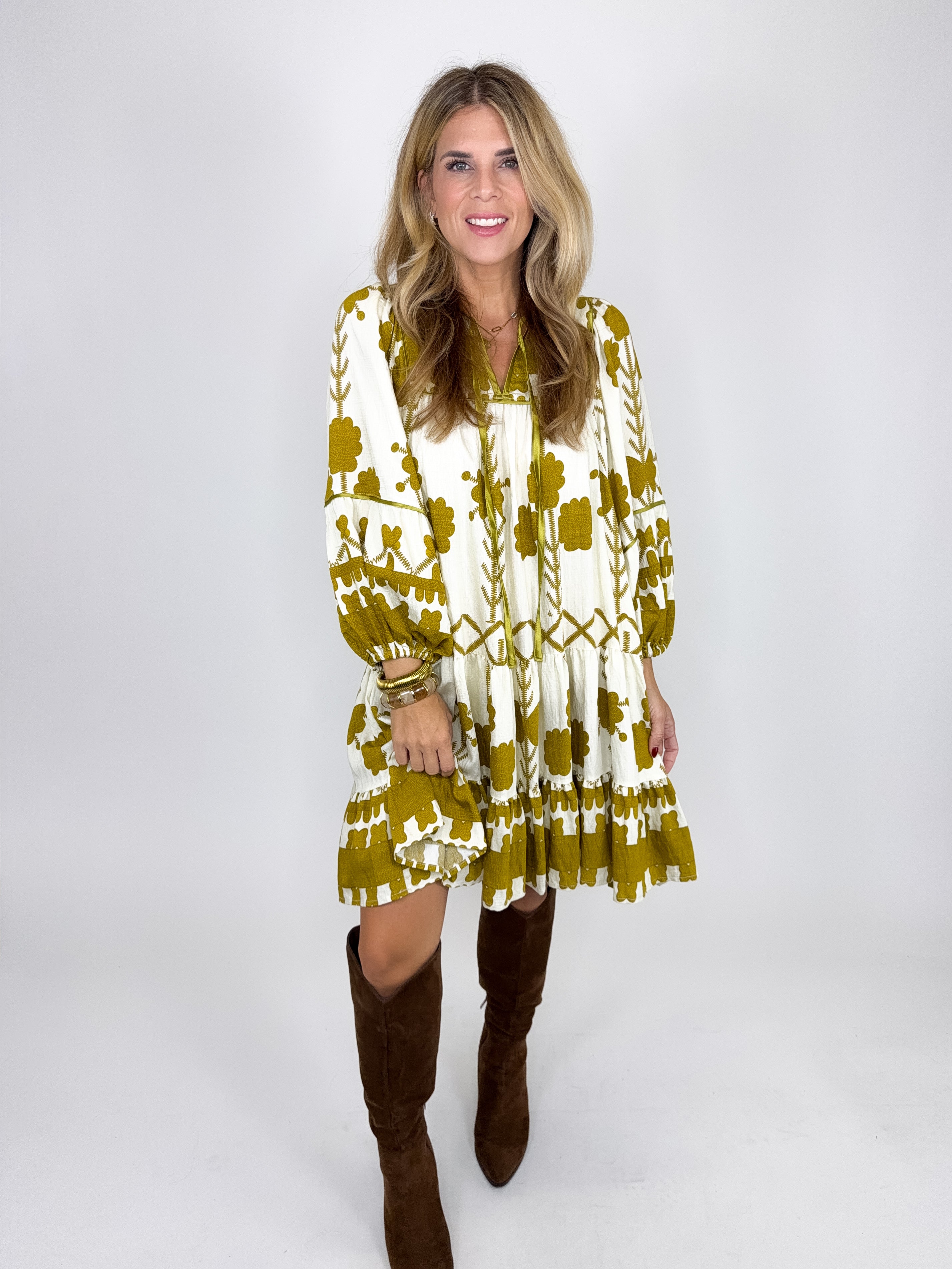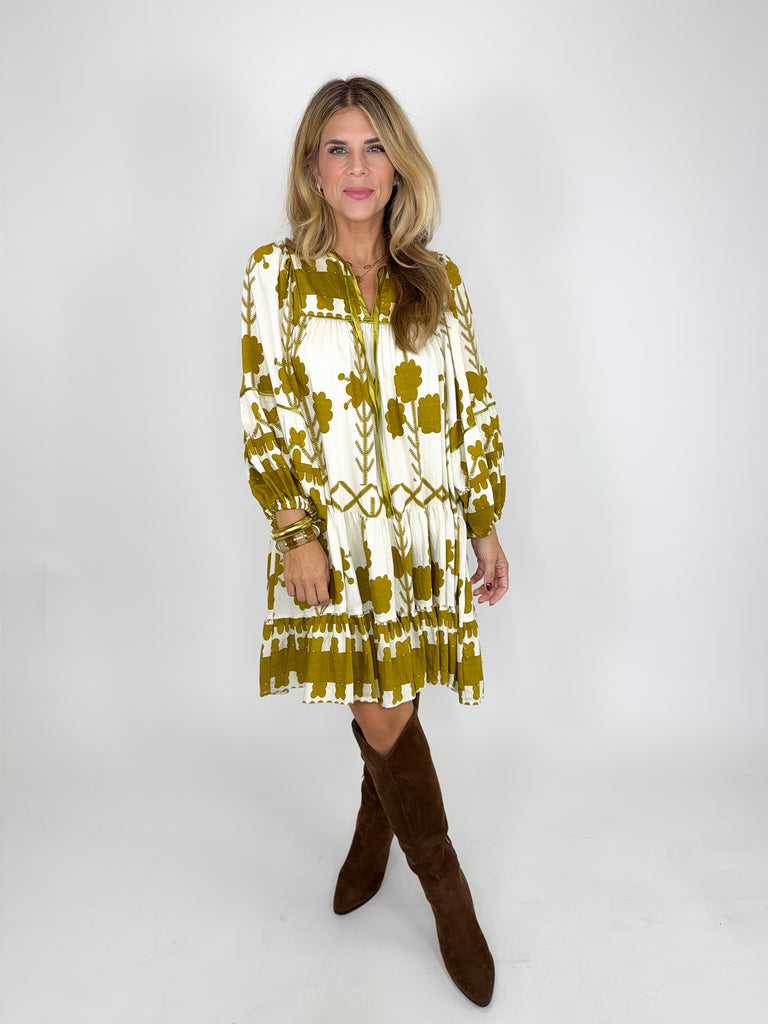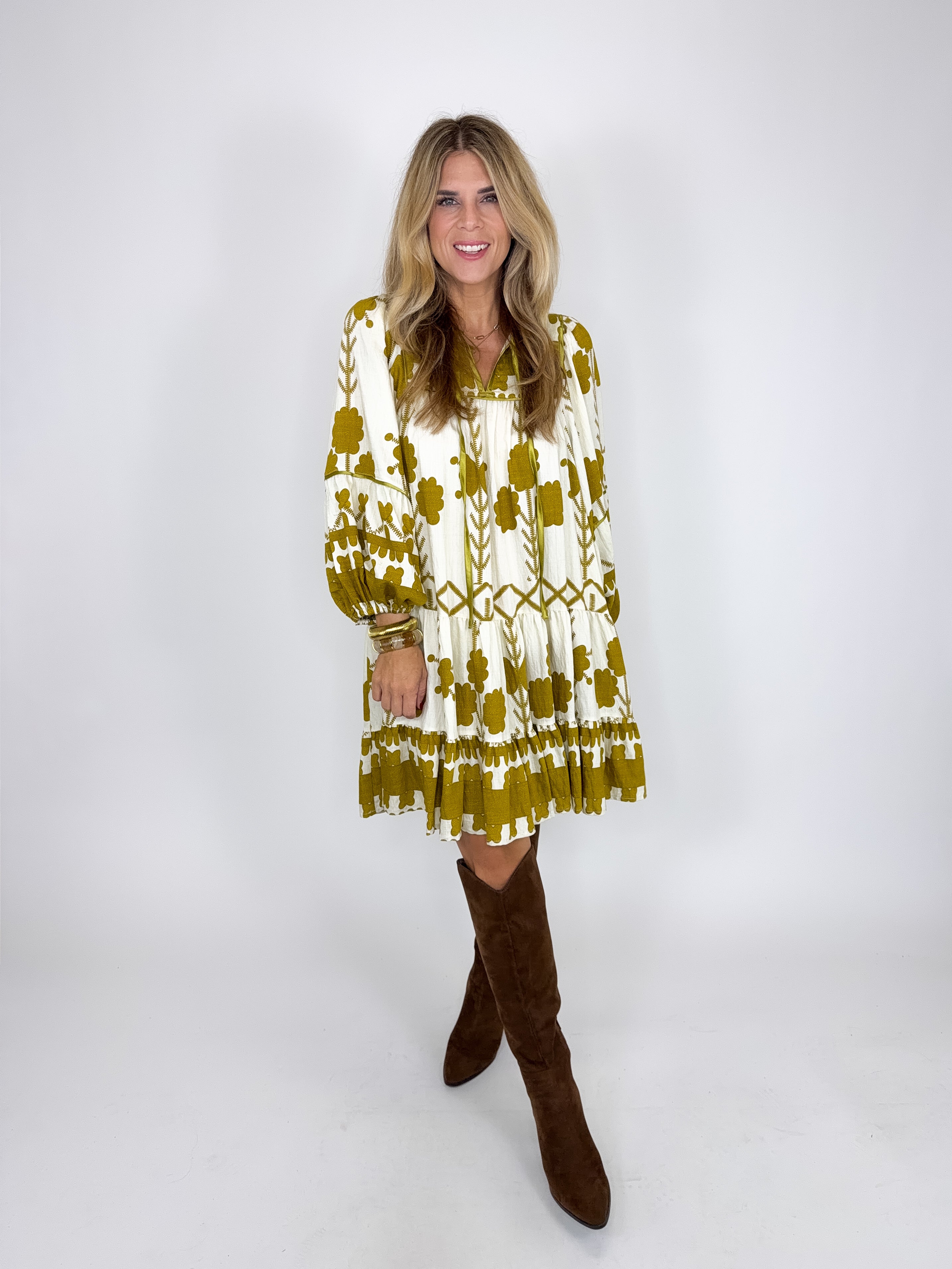 The Kennedy Dress is a perfect easy to wear dress. This mustard boho print mini dress features a notched neckline with a tie, long balloon sleeves and a tiered hem. Style with flats, wedges, boots, heels and sneakers. Fits true to size.