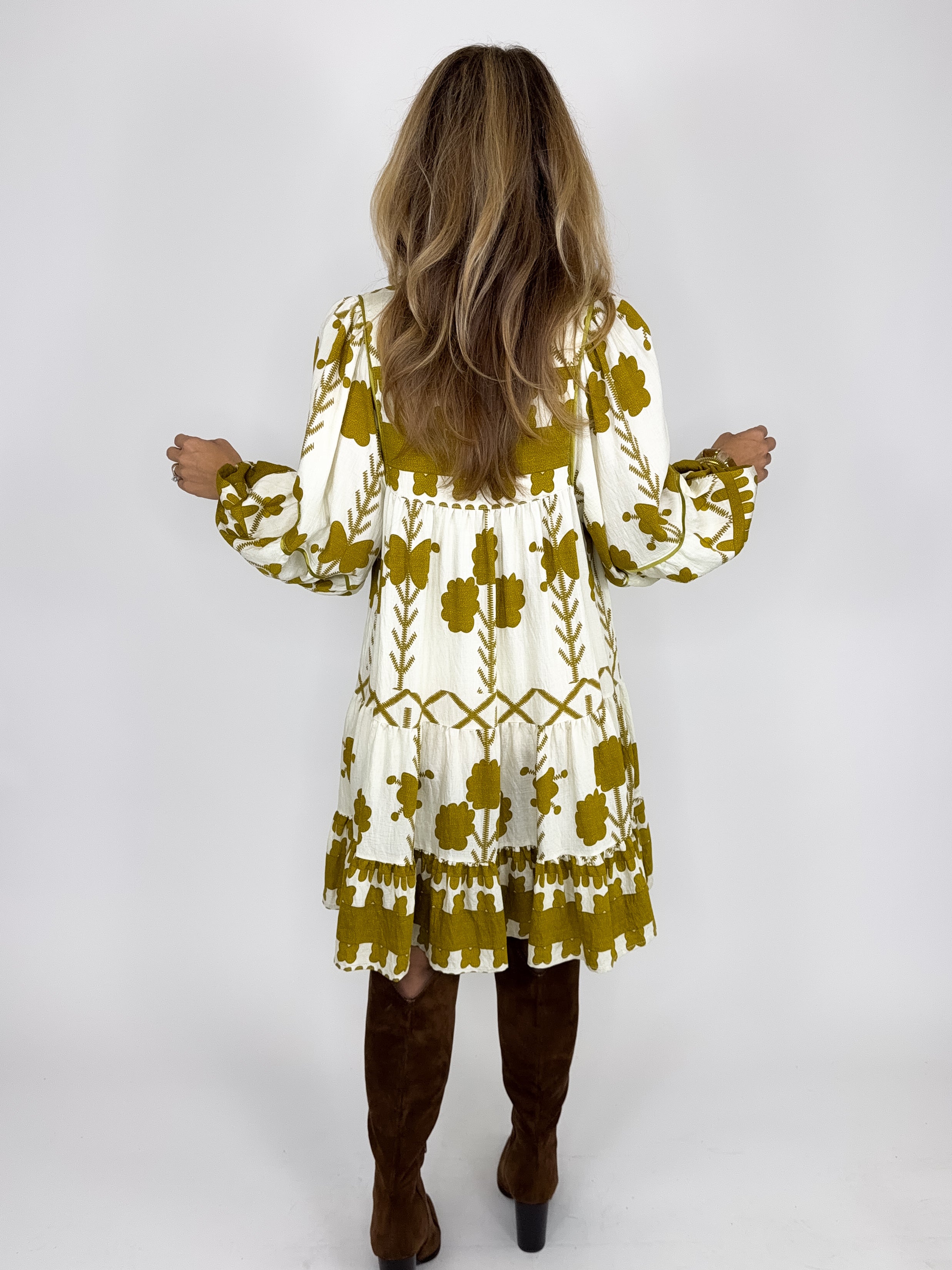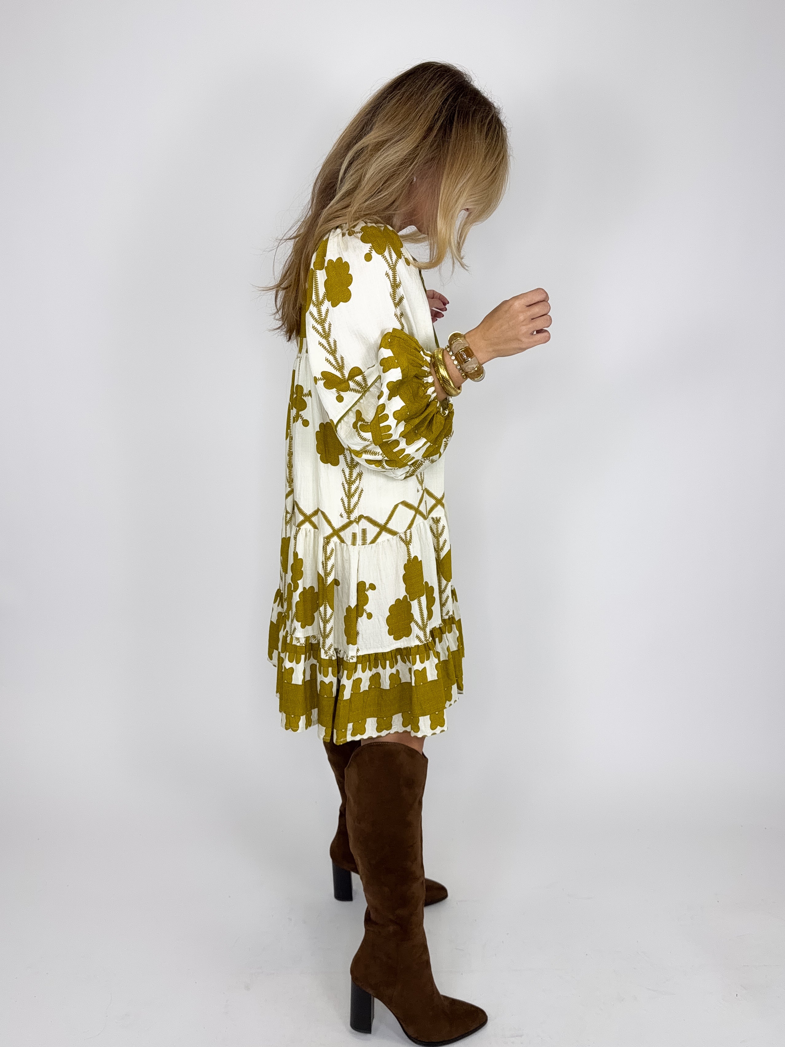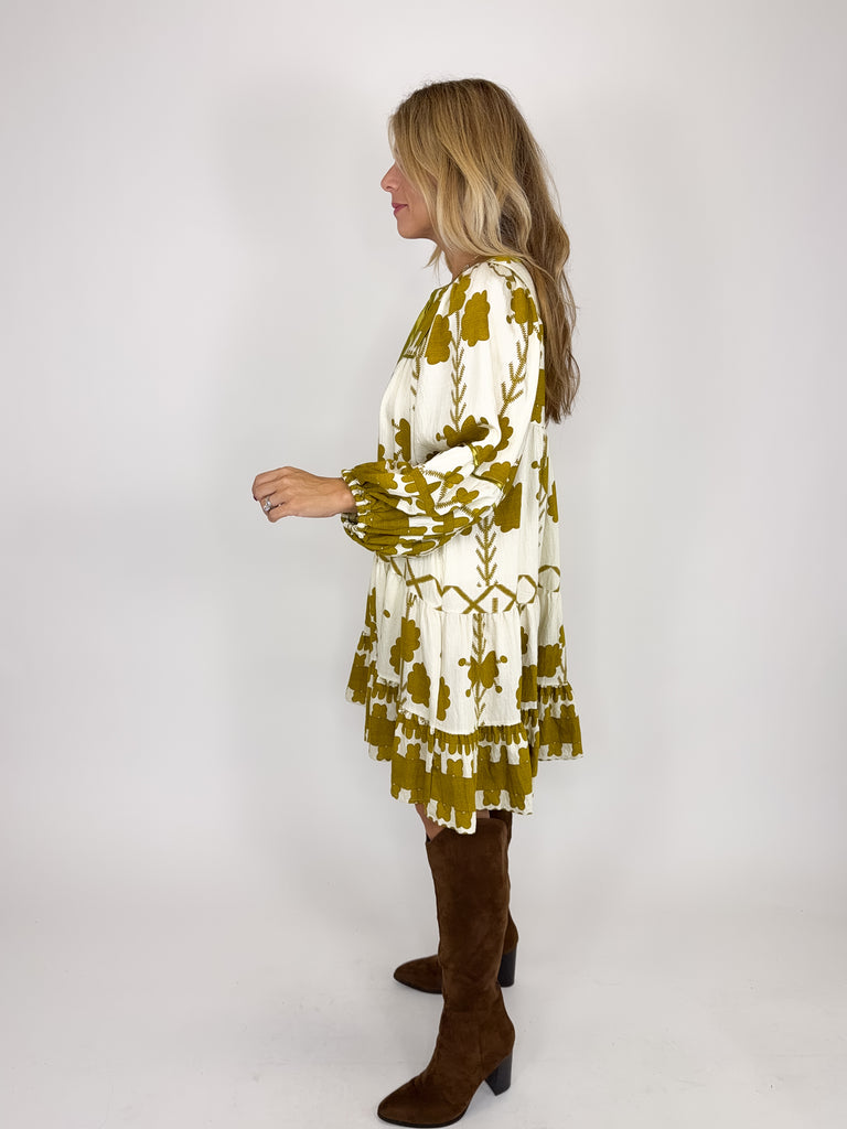 The Kennedy Dress is a perfect easy to wear dress. This mustard boho print mini dress features a notched neckline with a tie, long balloon sleeves and a tiered hem. Style with flats, wedges, boots, heels and sneakers. Fits true to size.