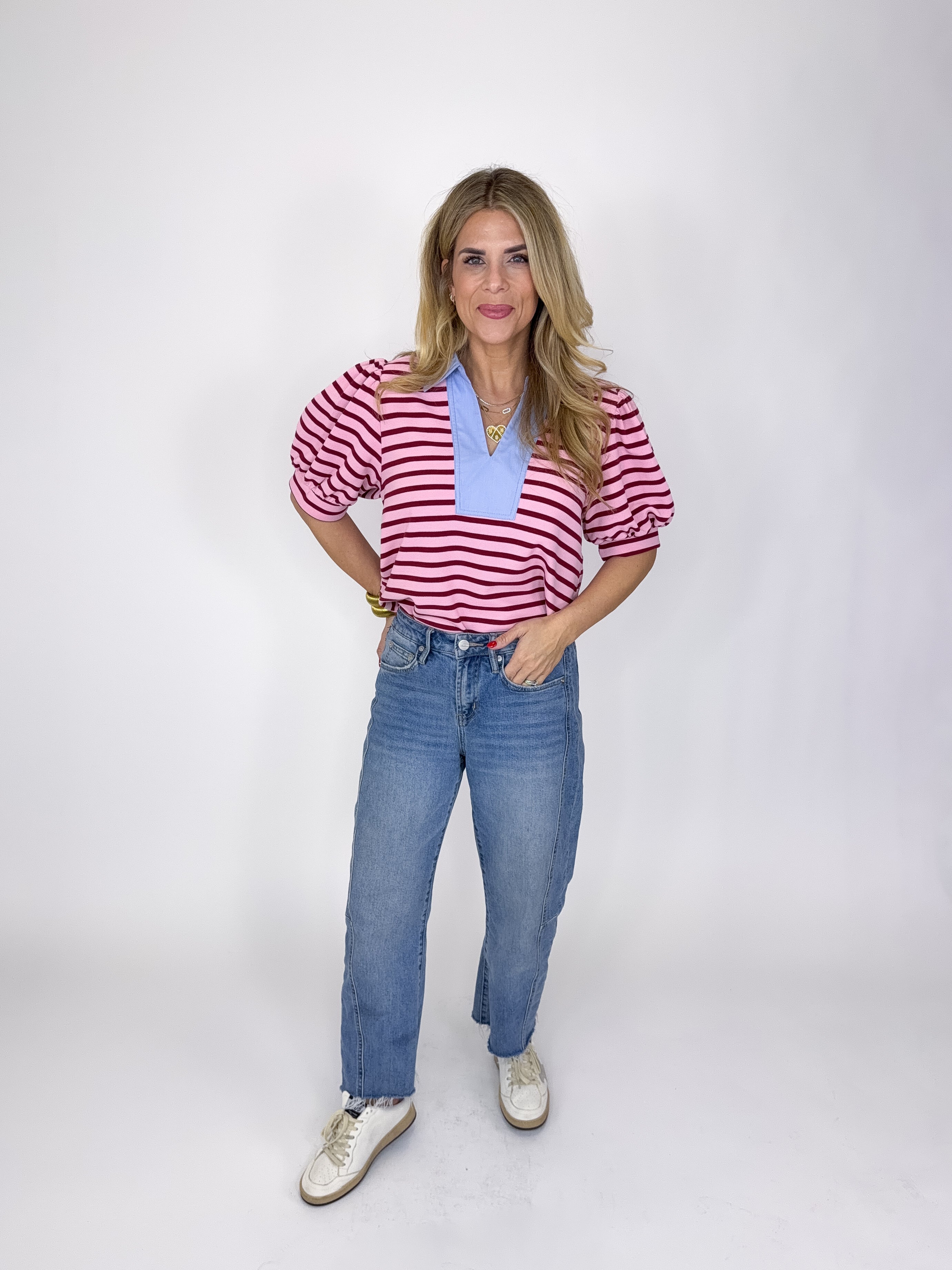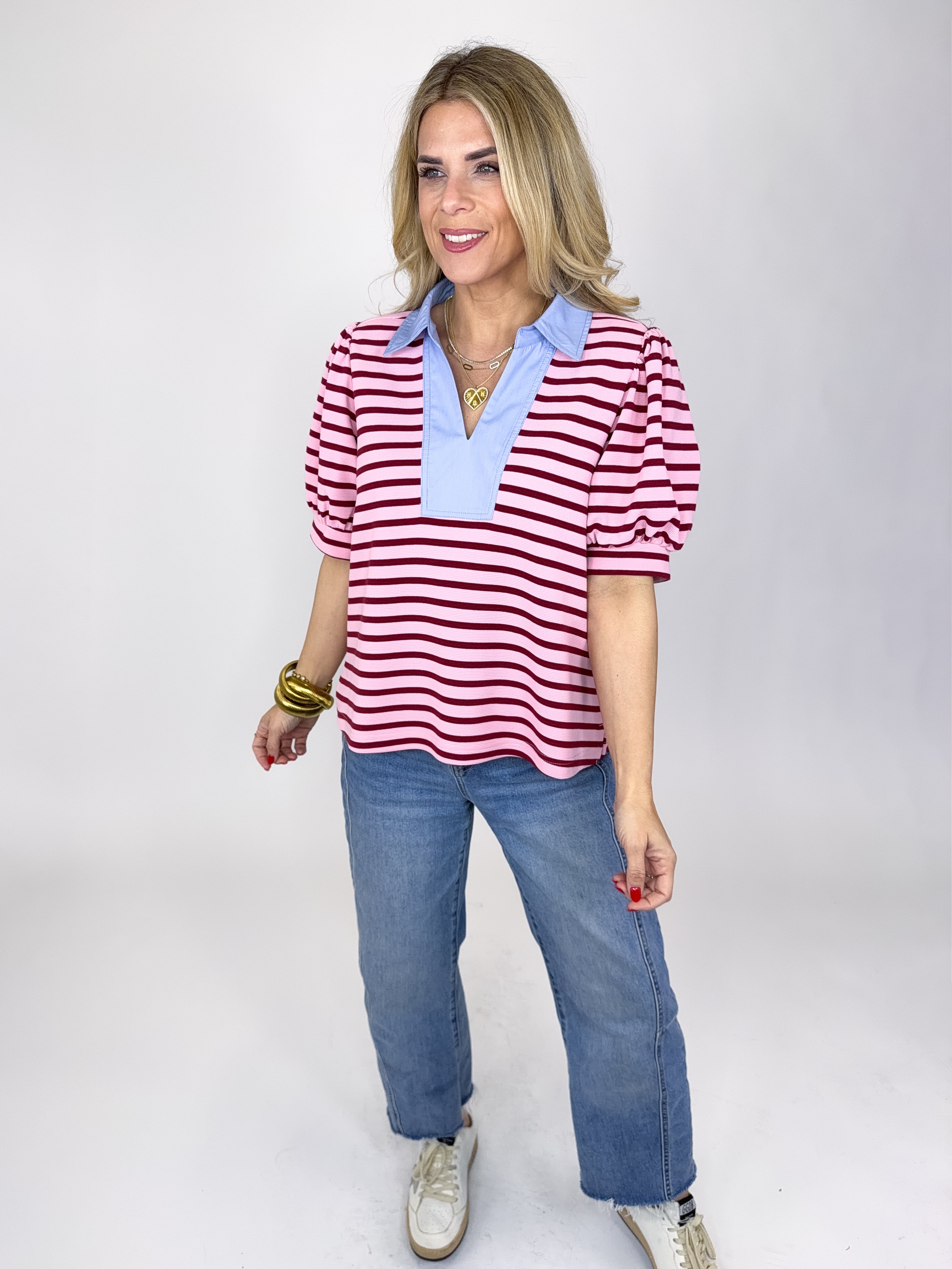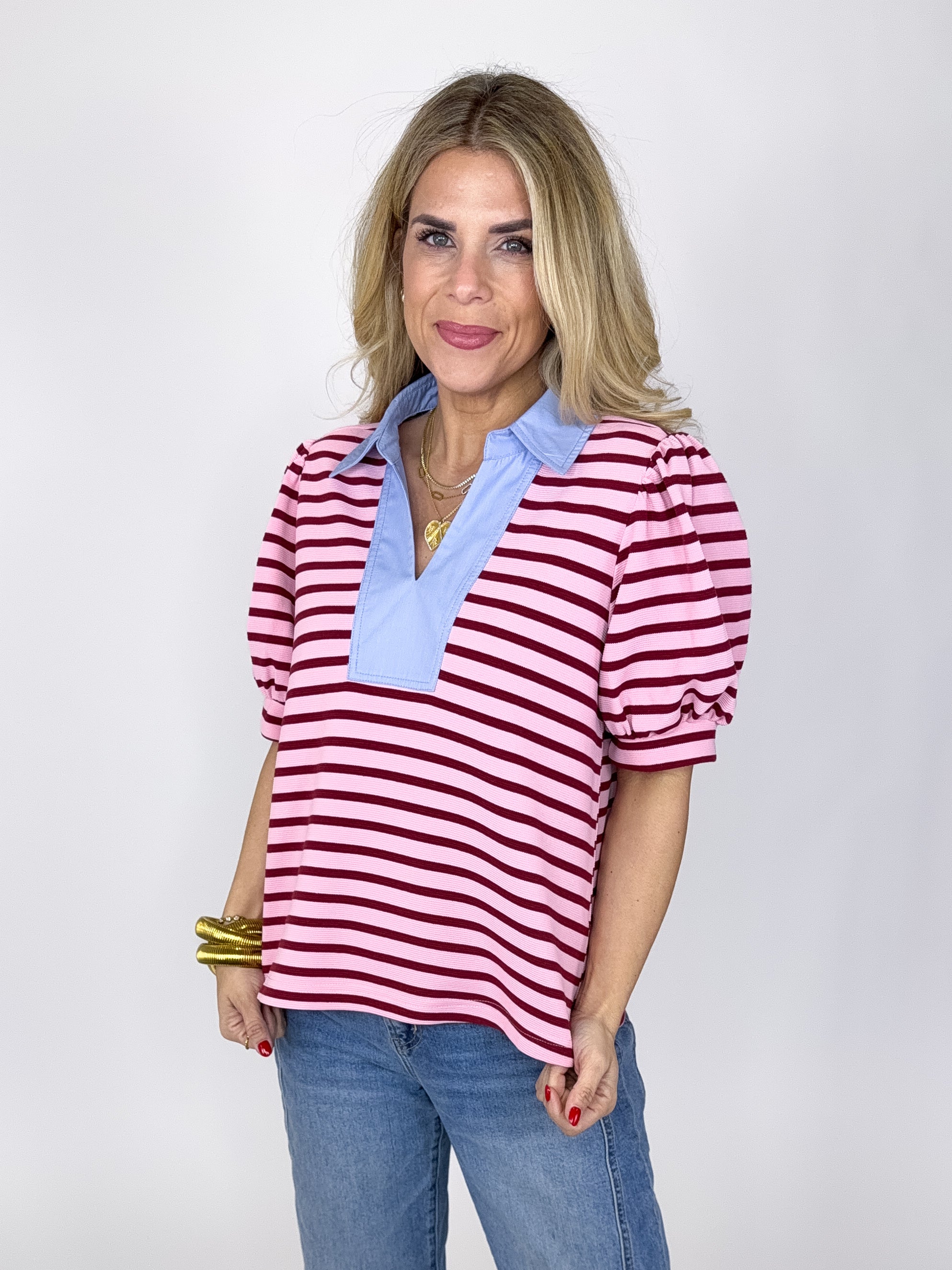 The Knox Top is an absolute must in every closet! This pink stripe textured knit top features a light blue v-neck with a collar, short puff sleeves and great length Pairs well with everything from denim, flats, heels, skirts, sneakers, shorts and more!