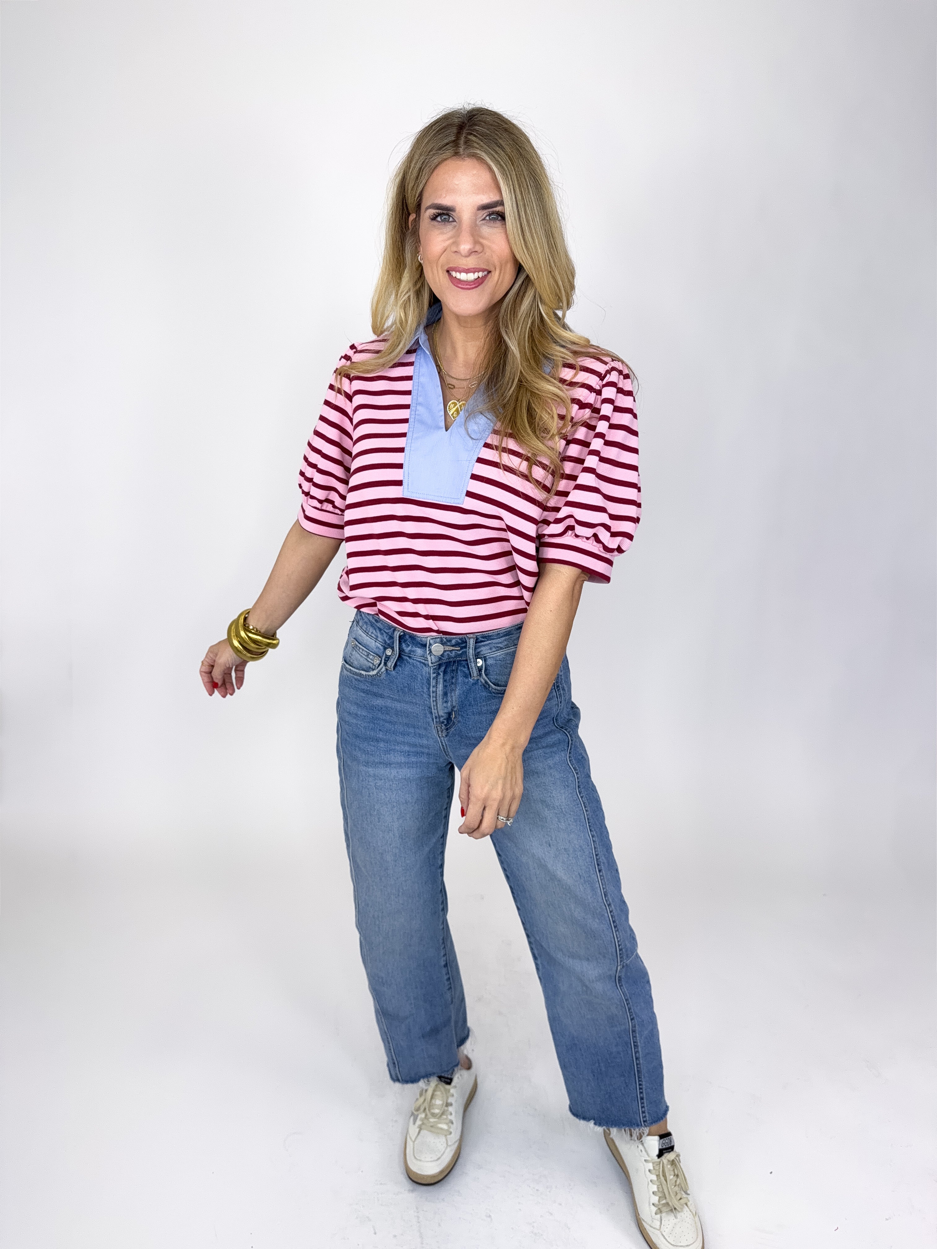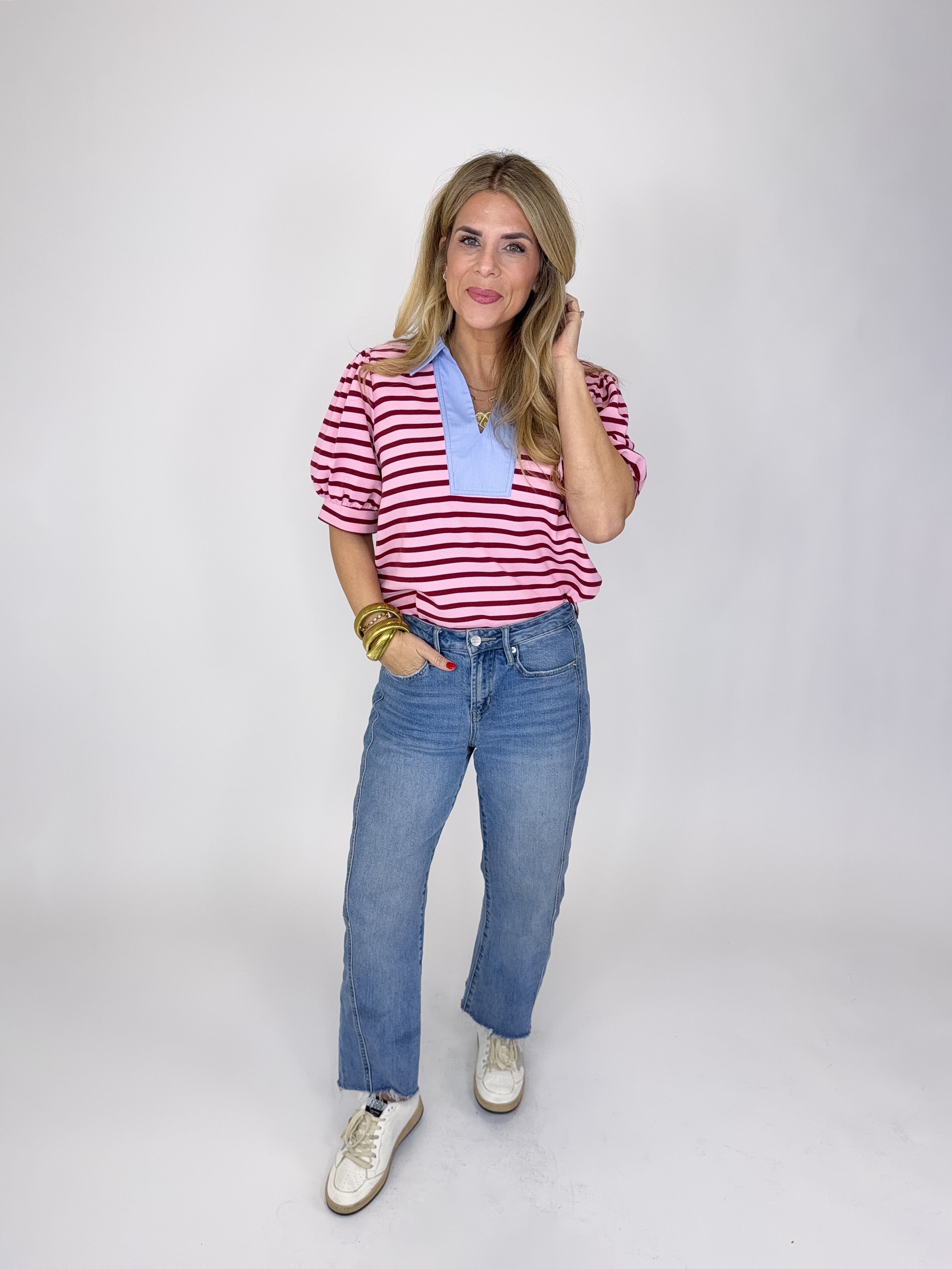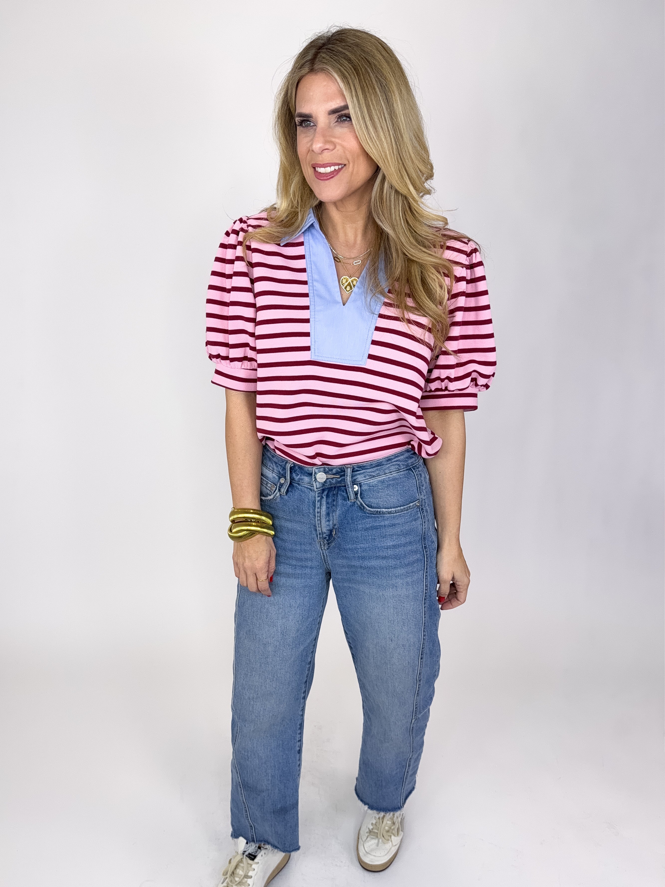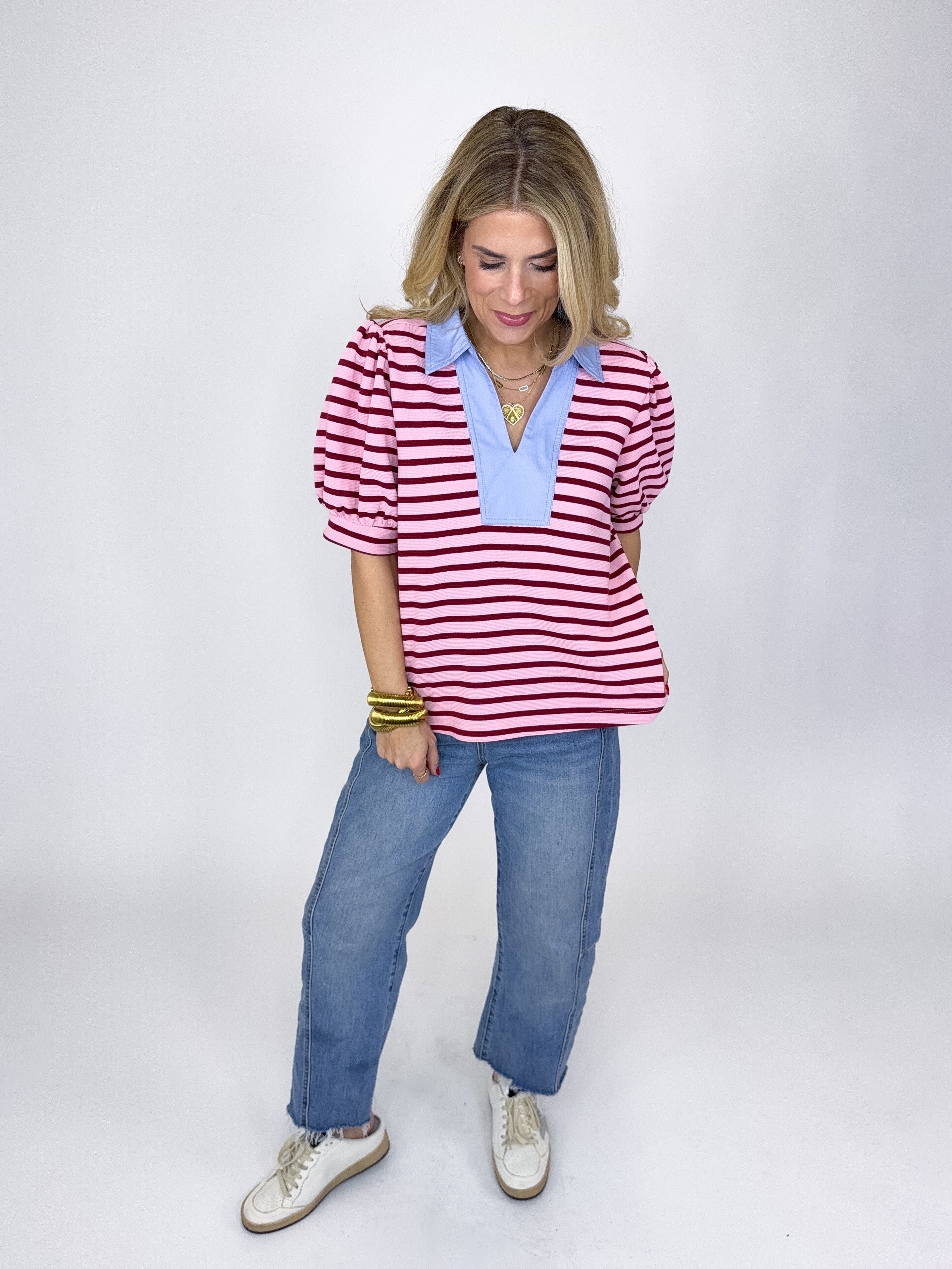 The Knox Top is an absolute must in every closet! This pink stripe textured knit top features a light blue v-neck with a collar, short puff sleeves and great length Pairs well with everything from denim, flats, heels, skirts, sneakers, shorts and more!